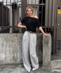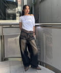 ・デニムパンツにレイヤードで巻ベルトを巻いて、トレンド満載コーデに。