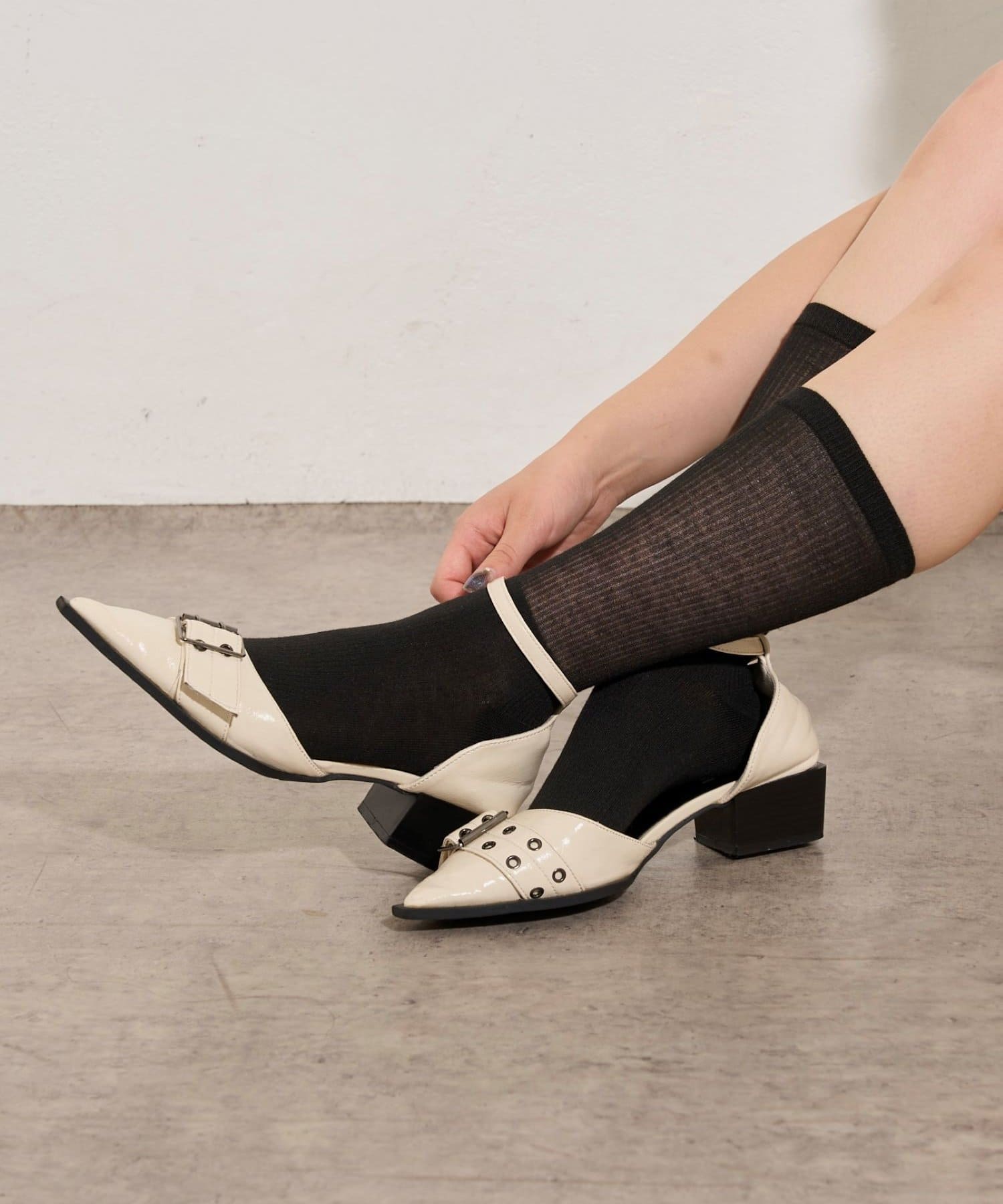 ・ほどよいシアー感が大人っぽい印象になるリブソックス。