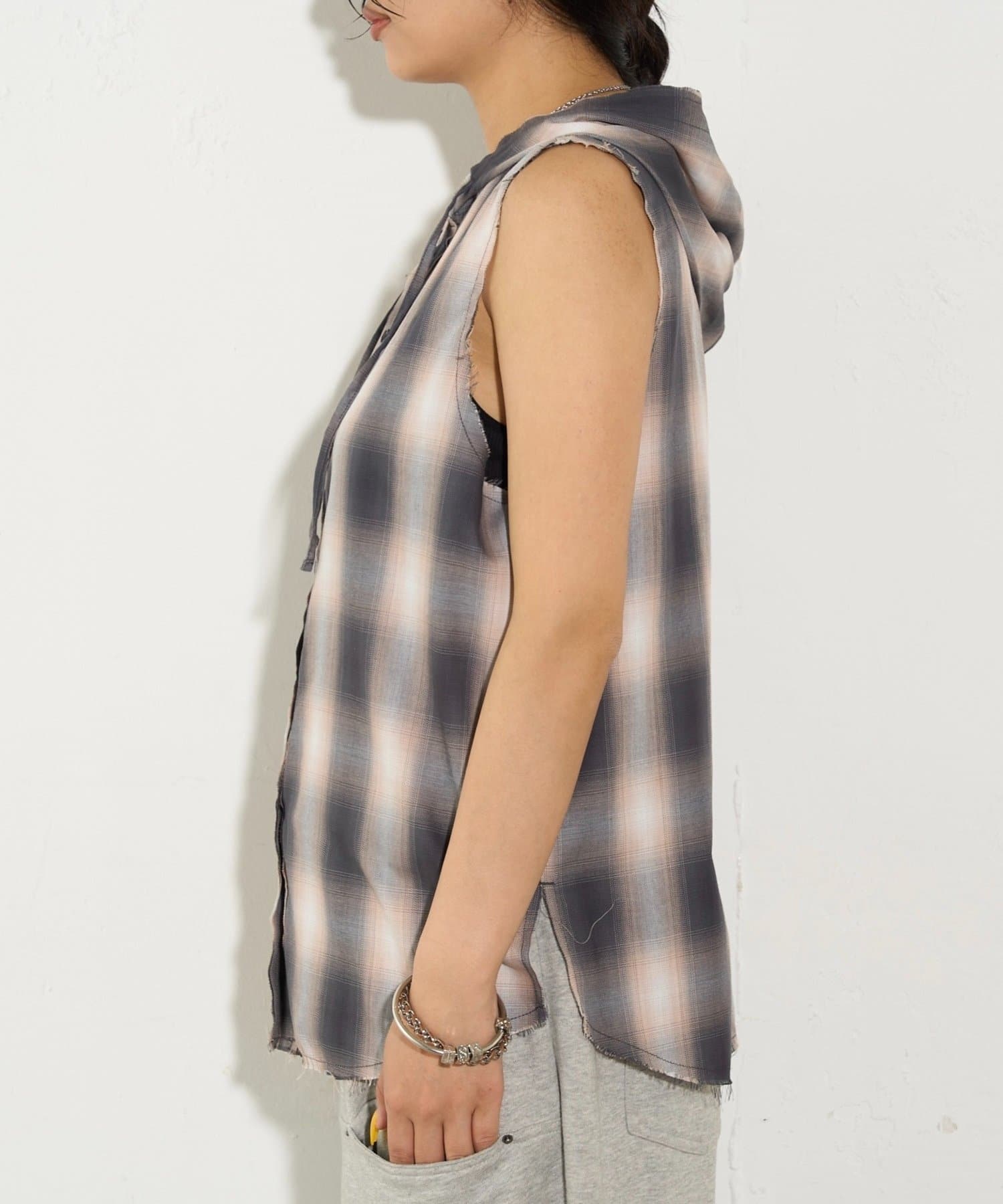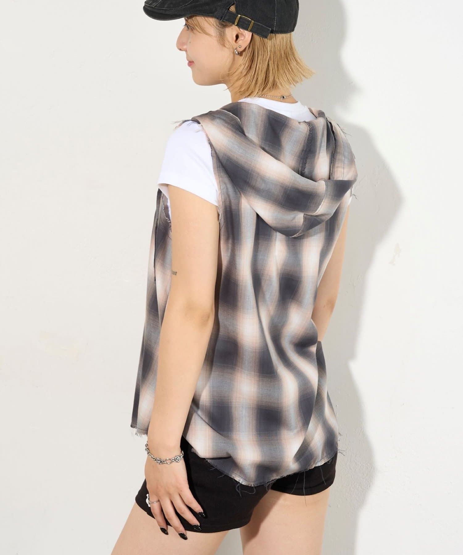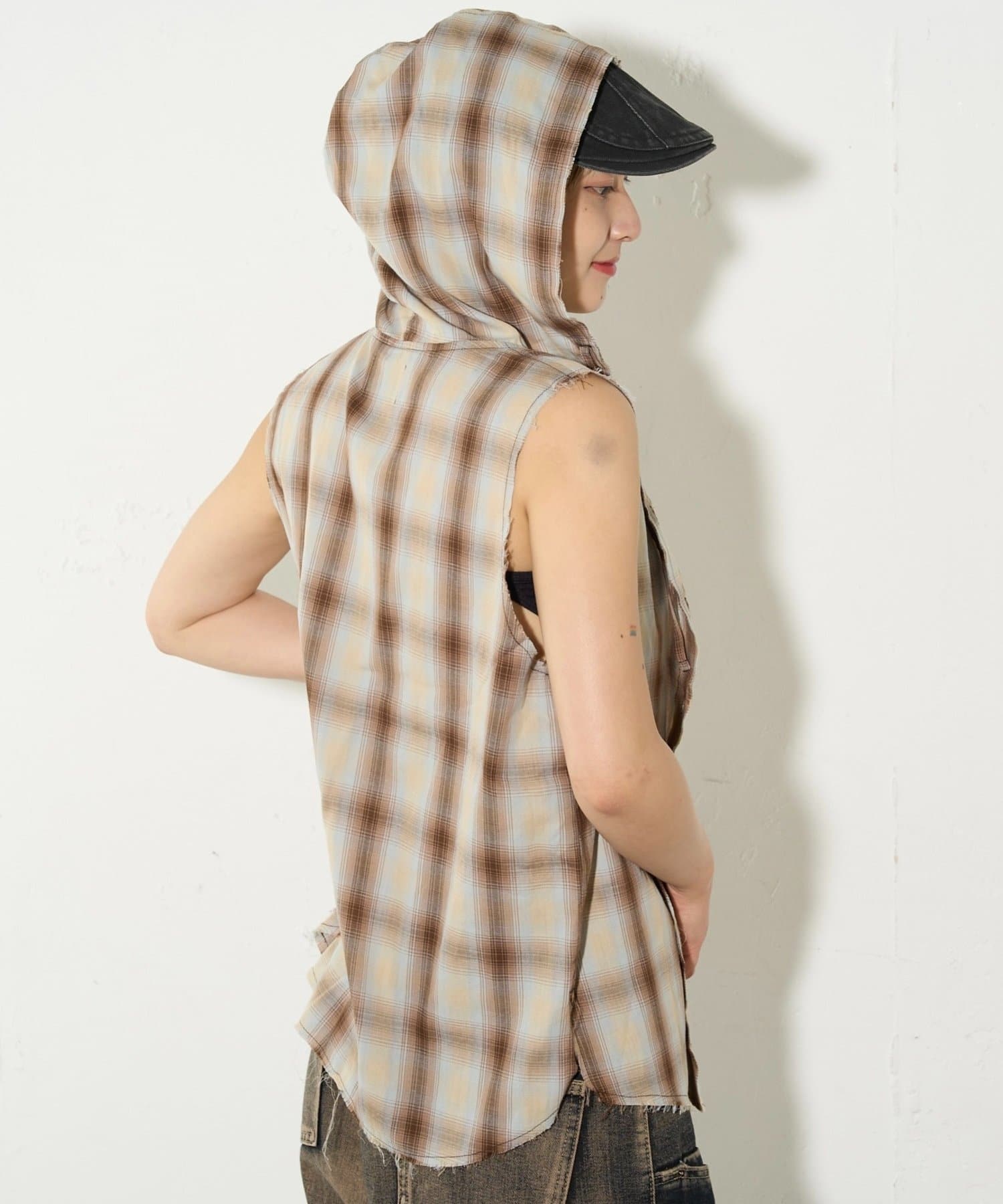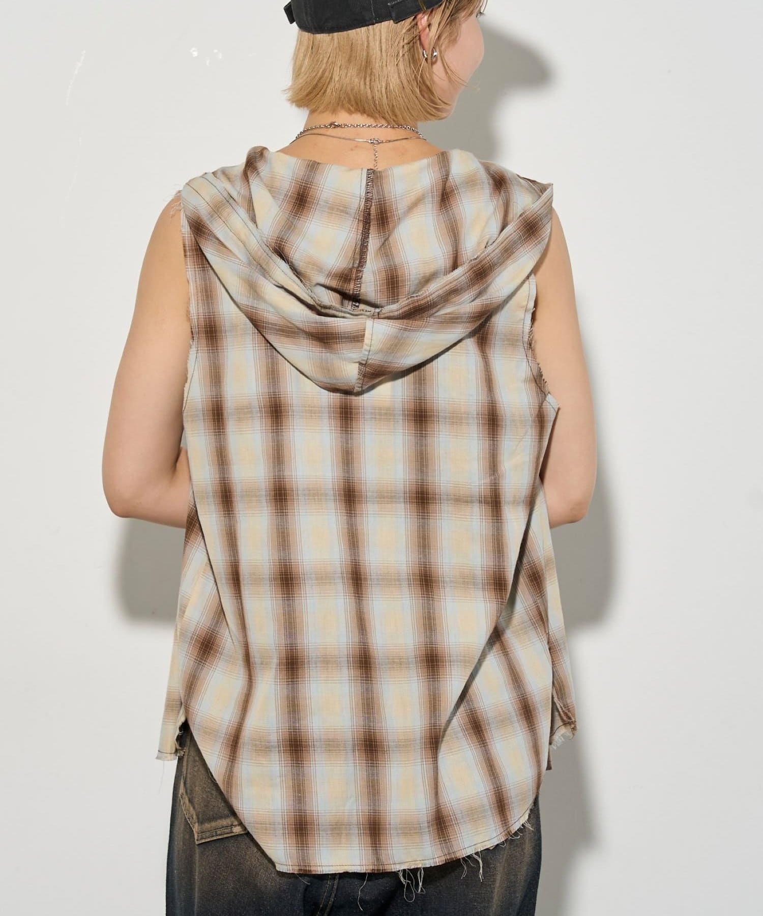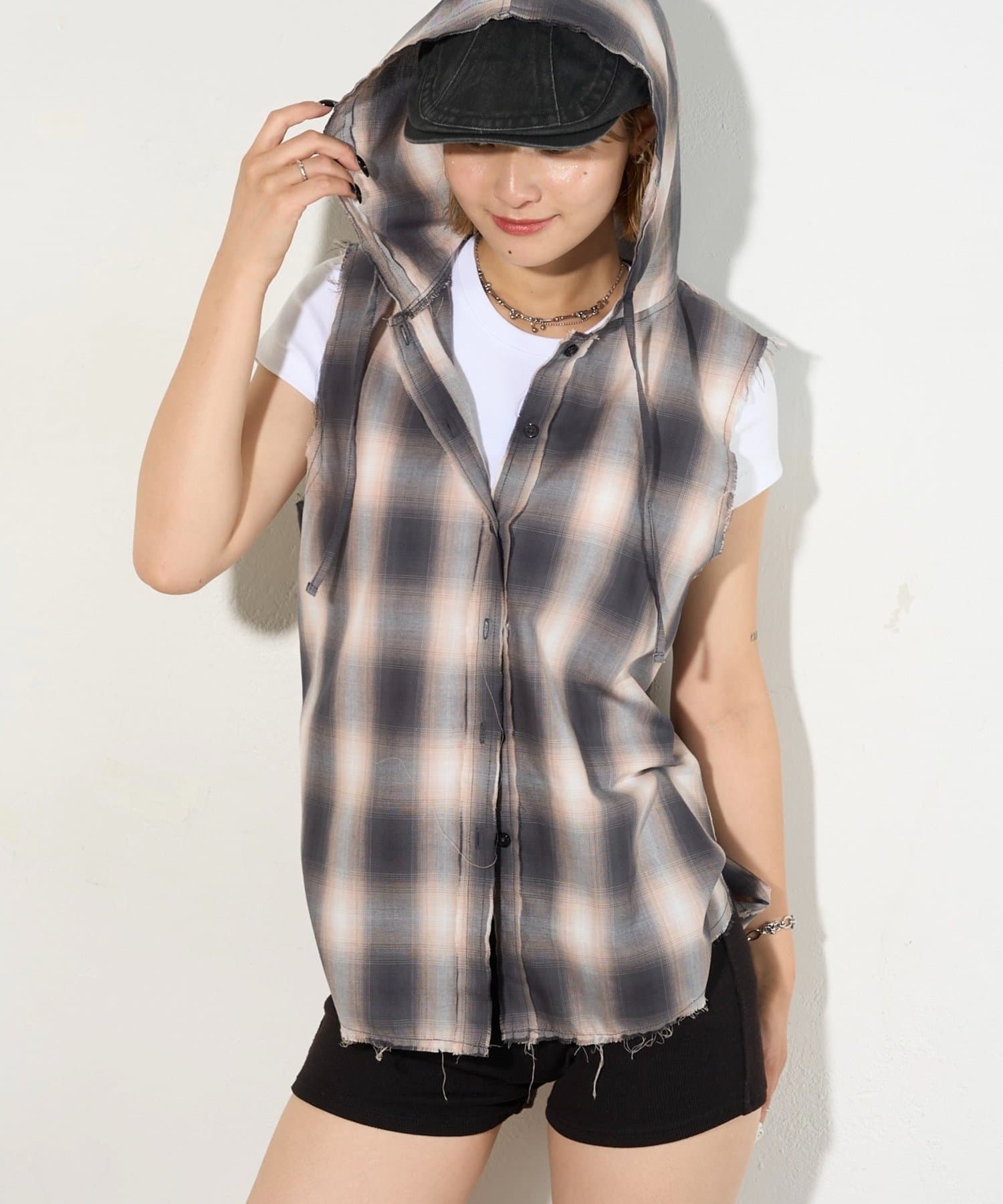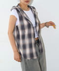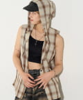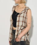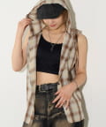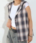 ・フード付きのチェックシャツがノースリーブになったデザイン。