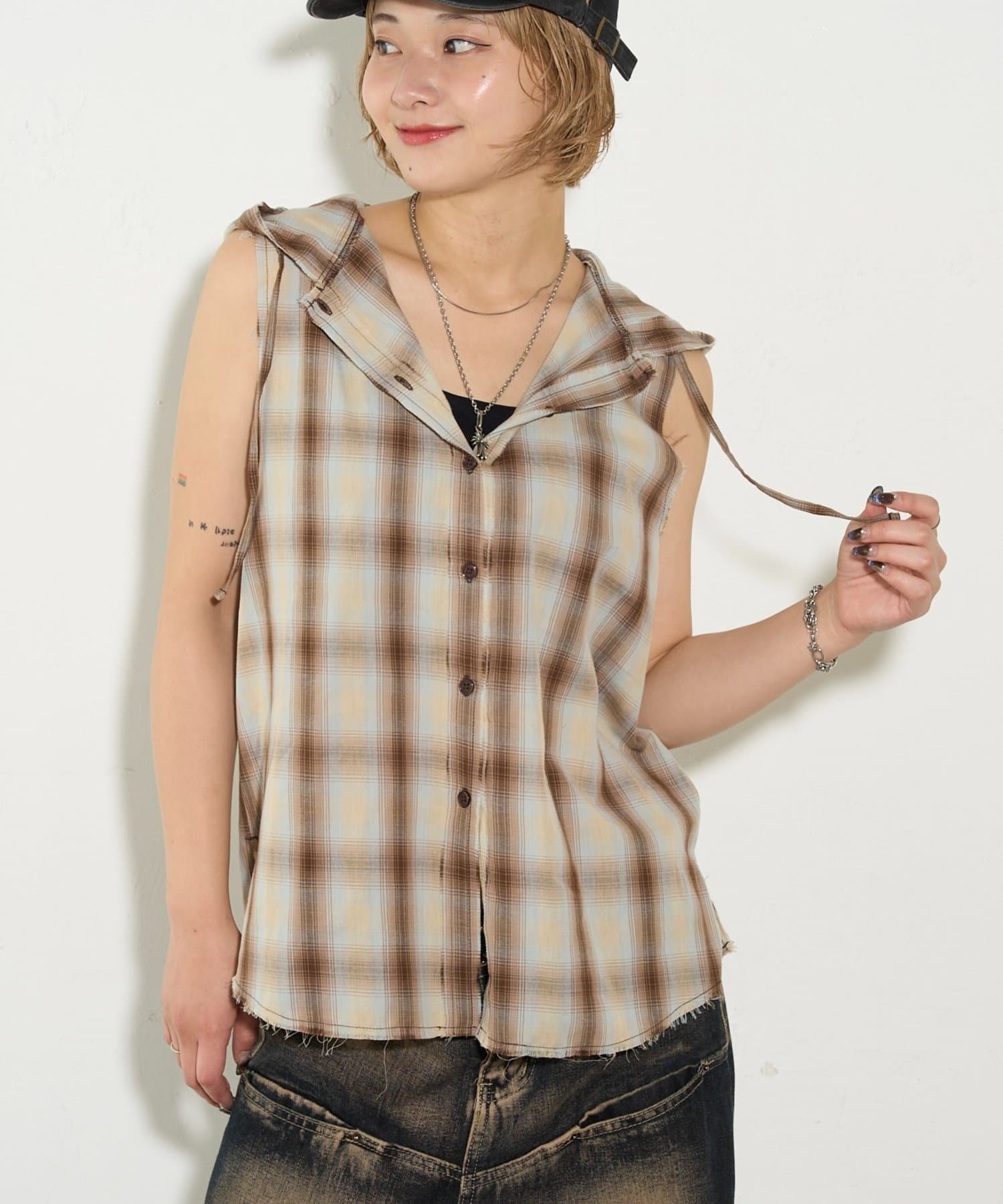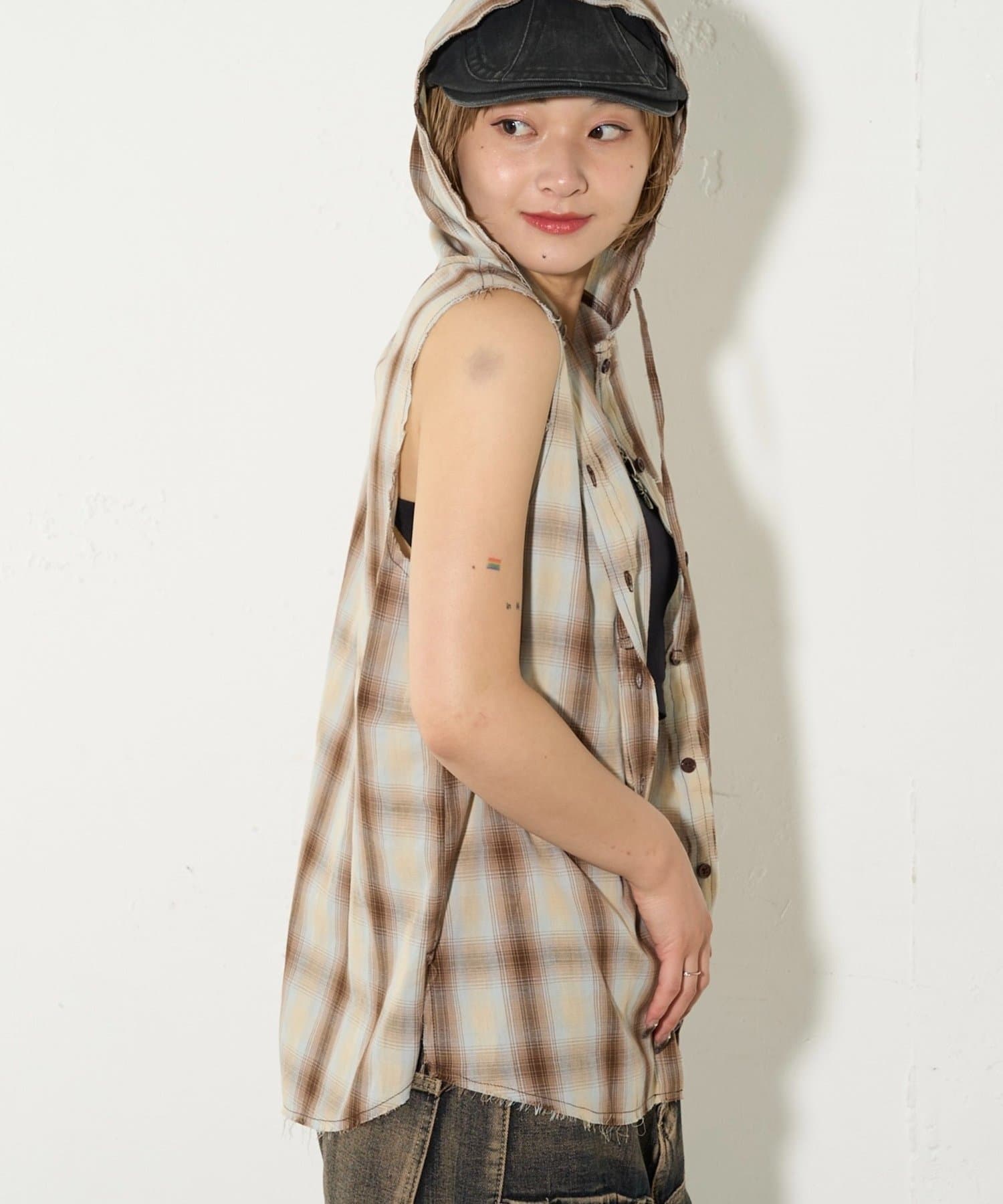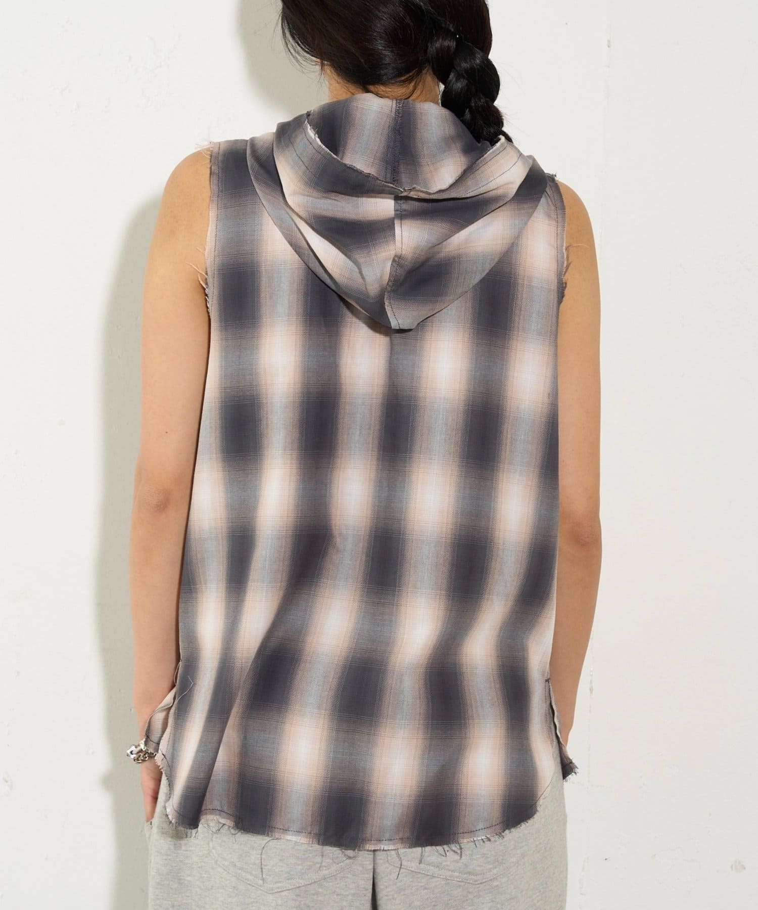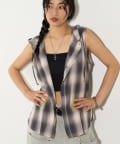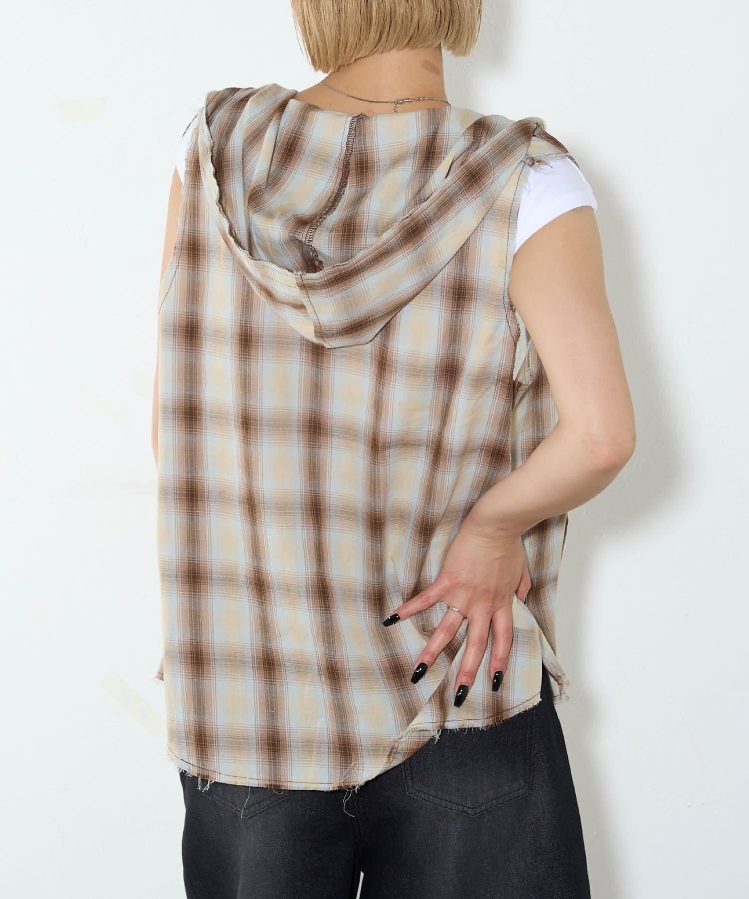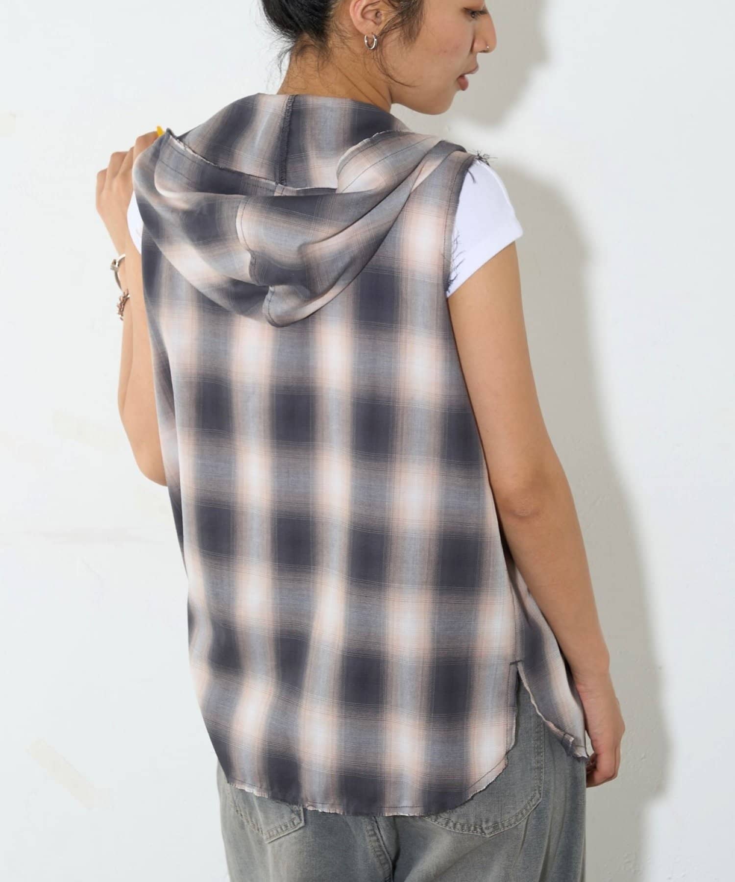 ・フード付きのチェックシャツがノースリーブになったデザイン。