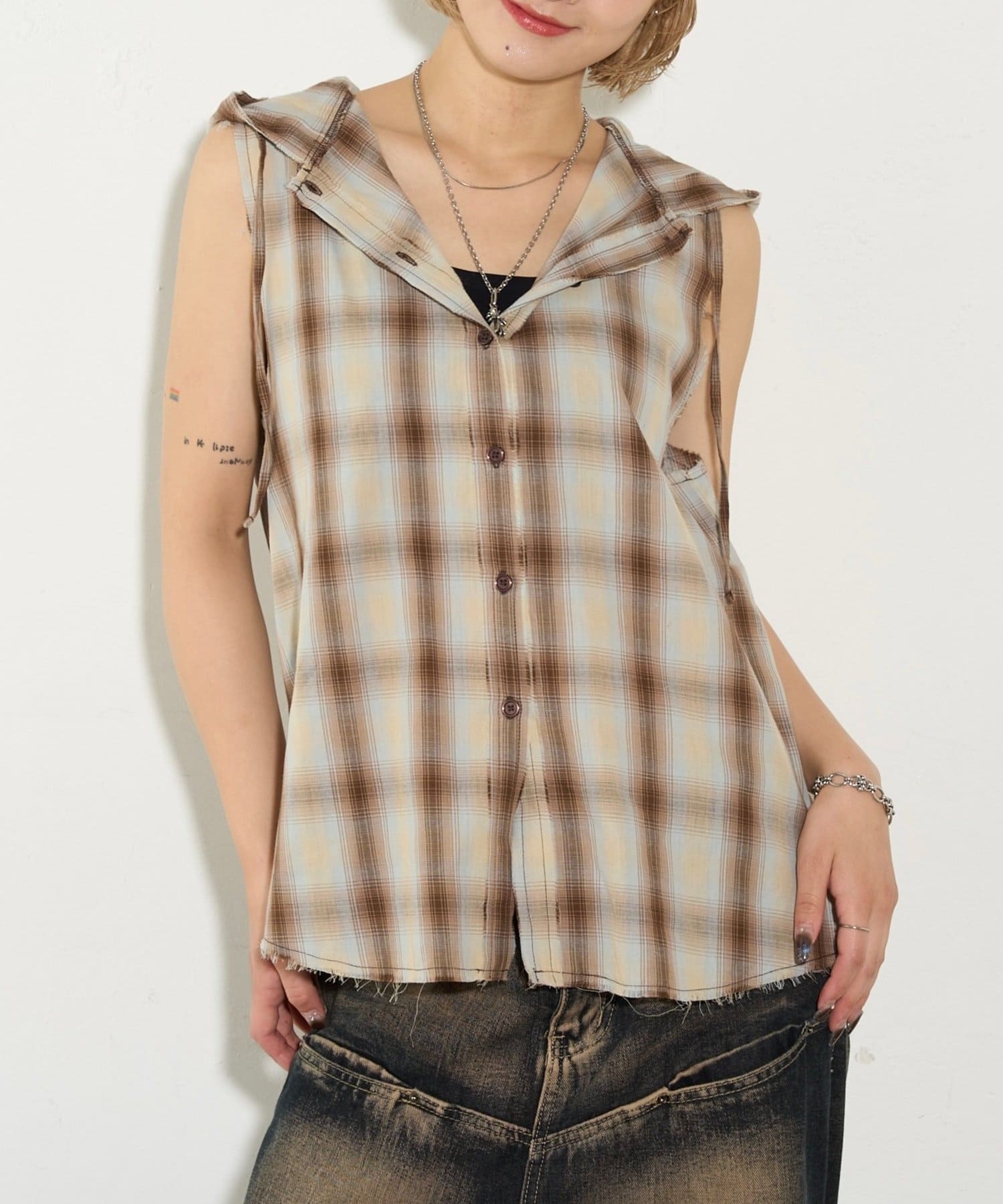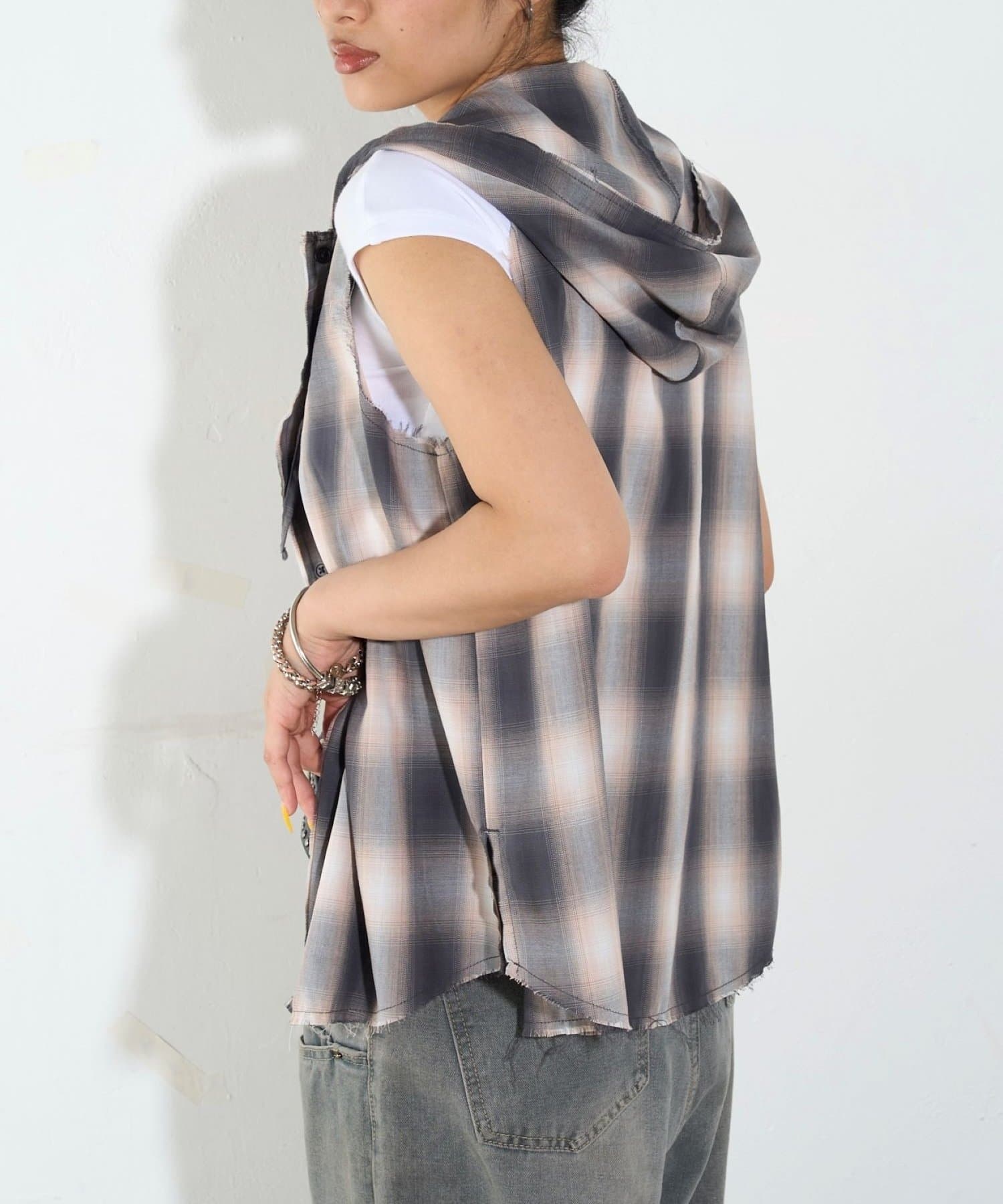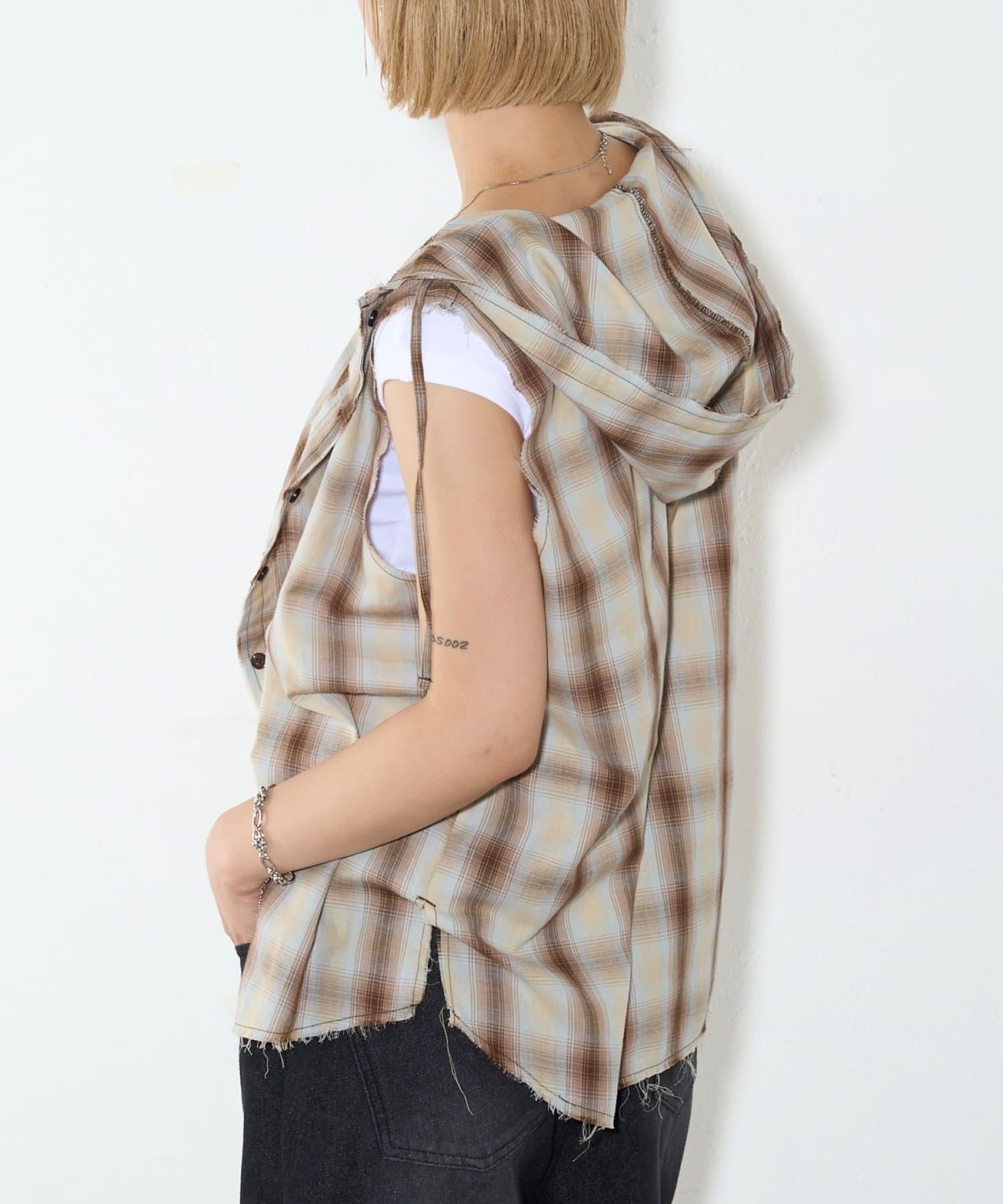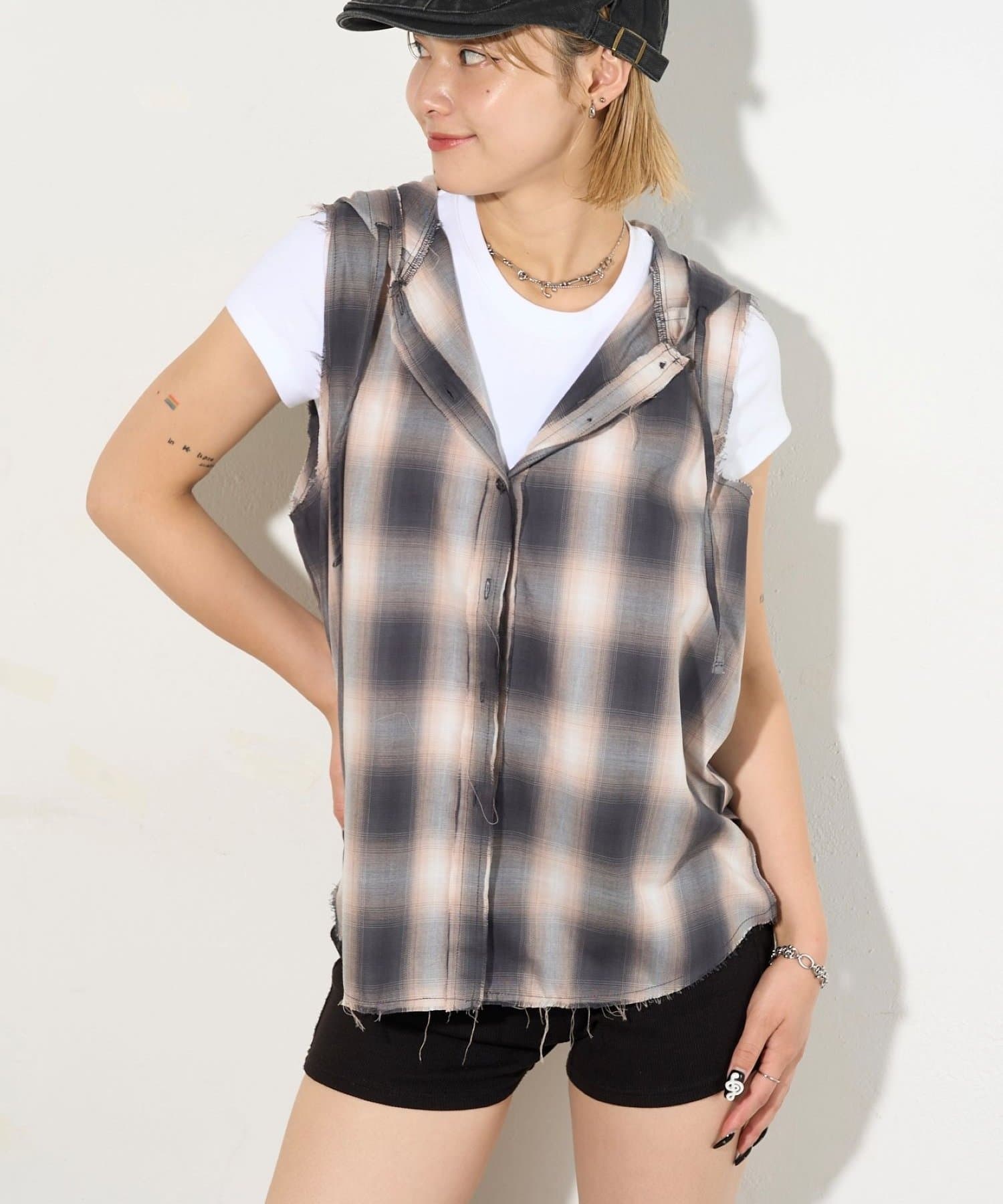 ・フード付きのチェックシャツがノースリーブになったデザイン。