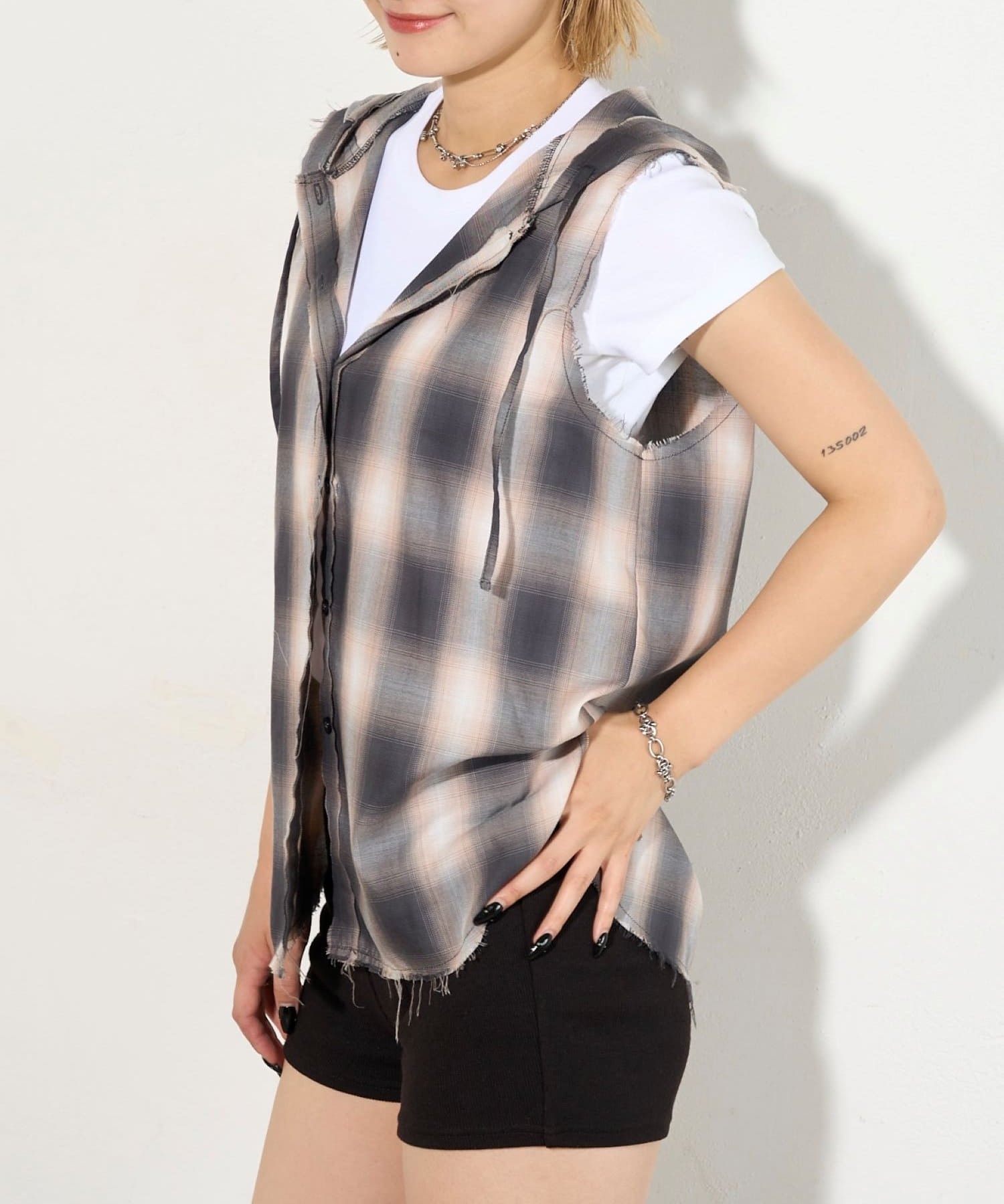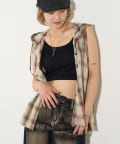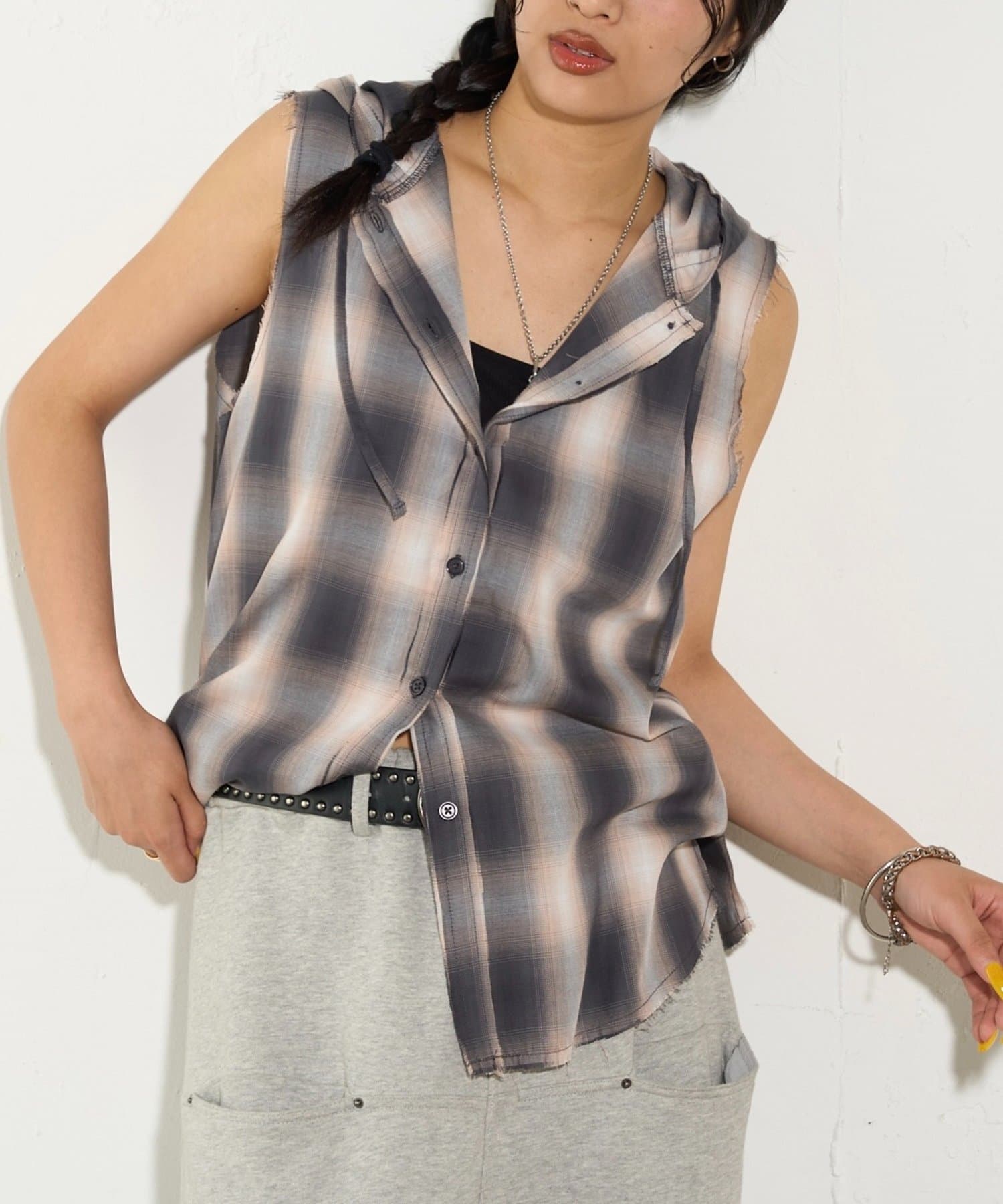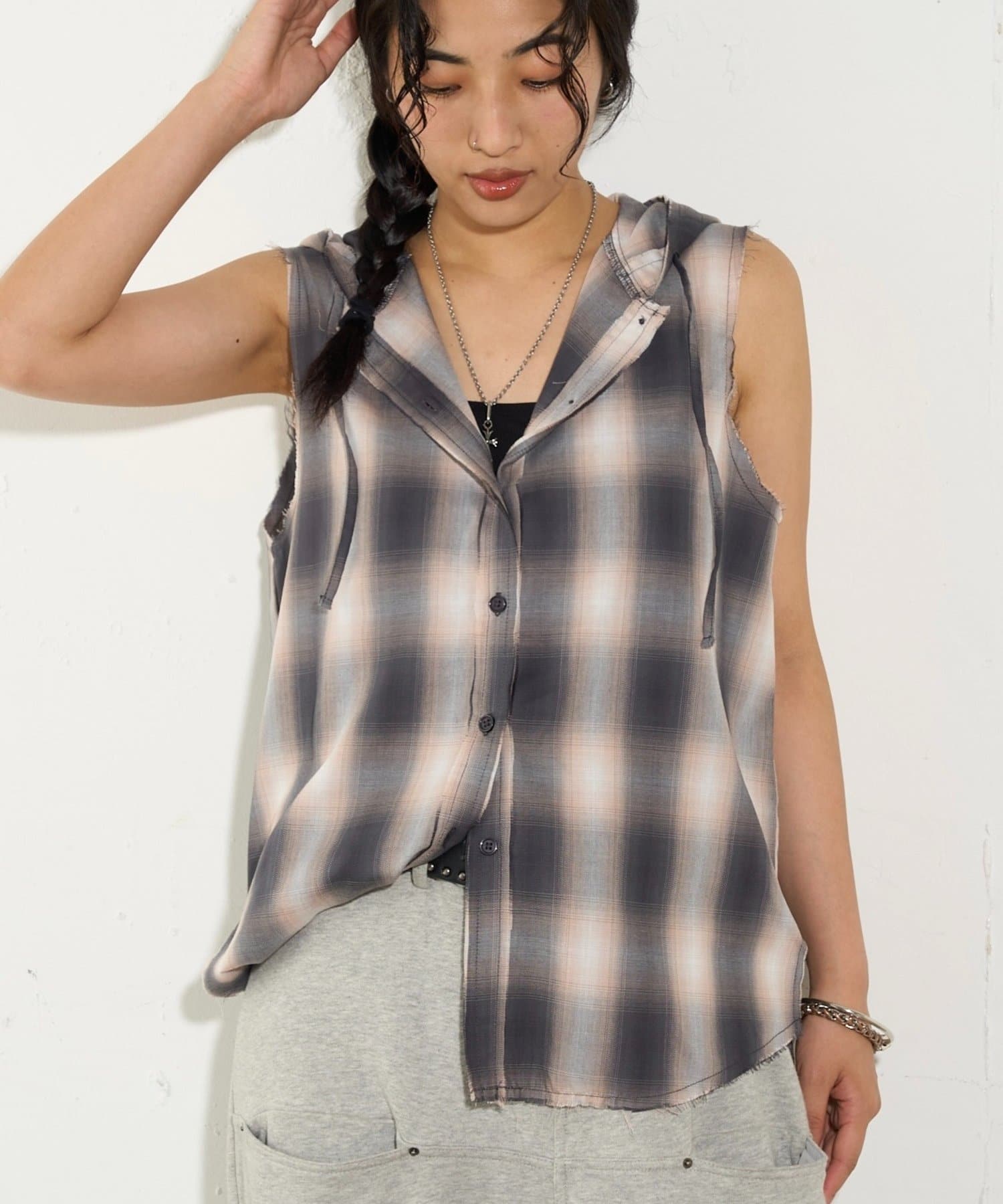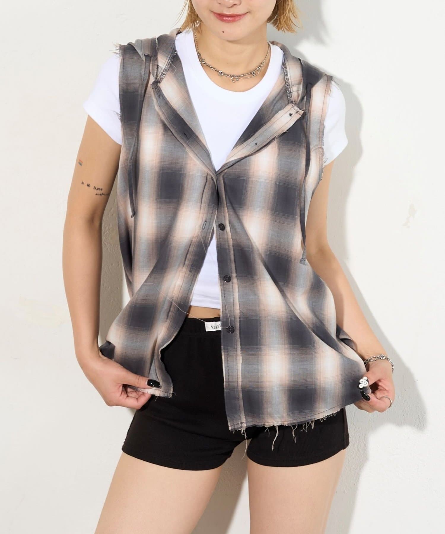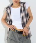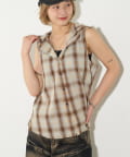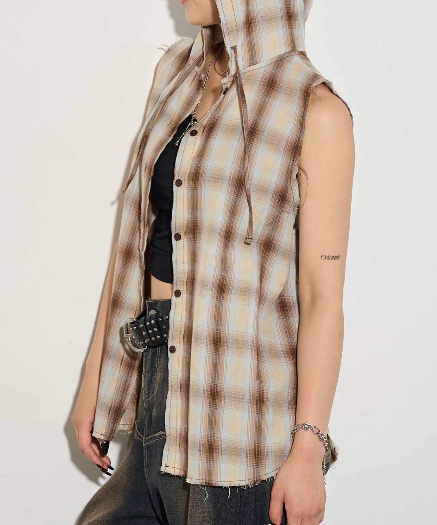 ・フード付きのチェックシャツがノースリーブになったデザイン。