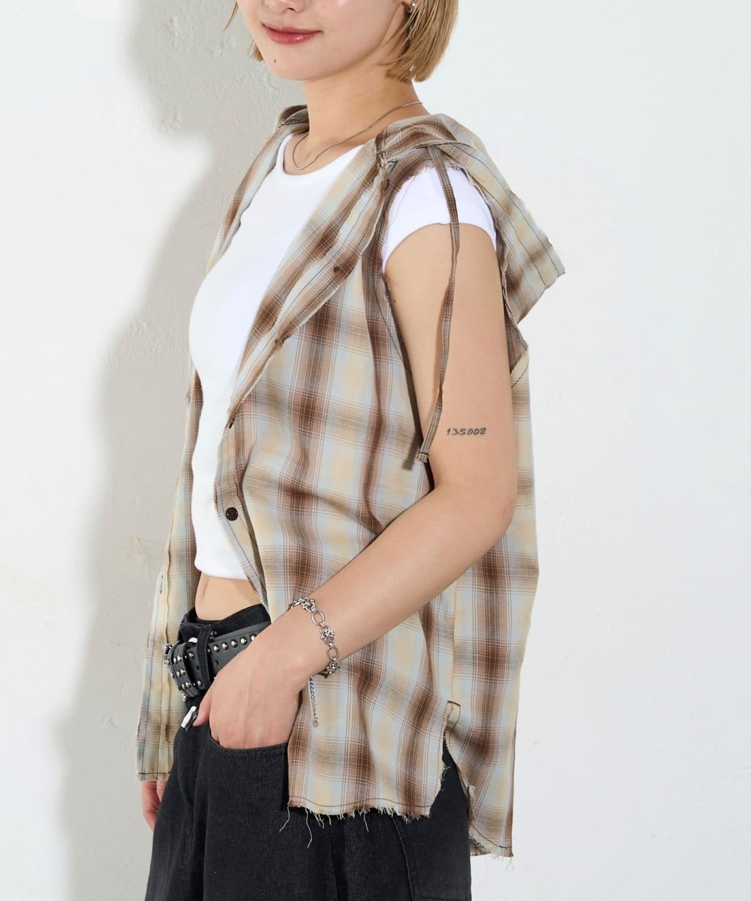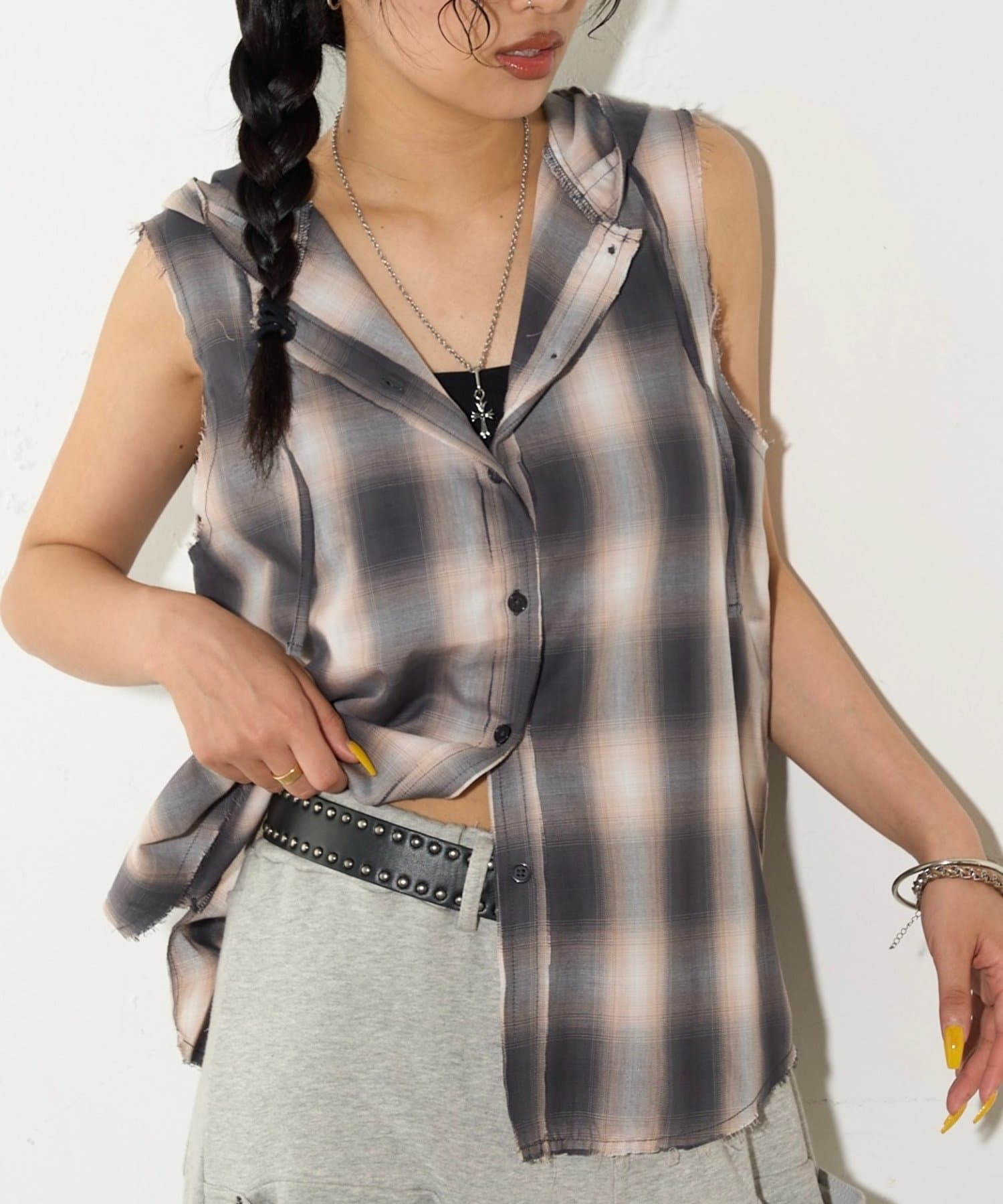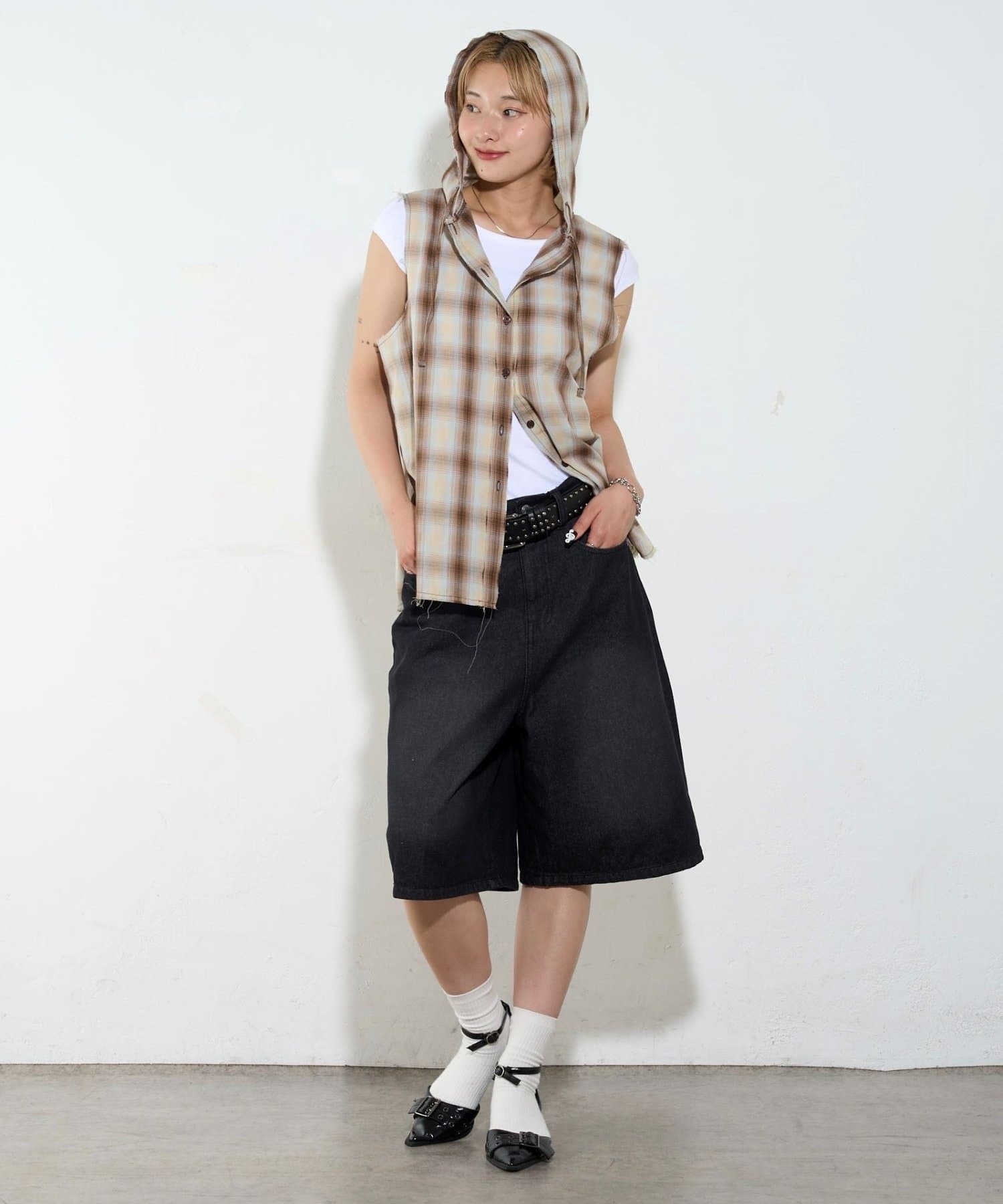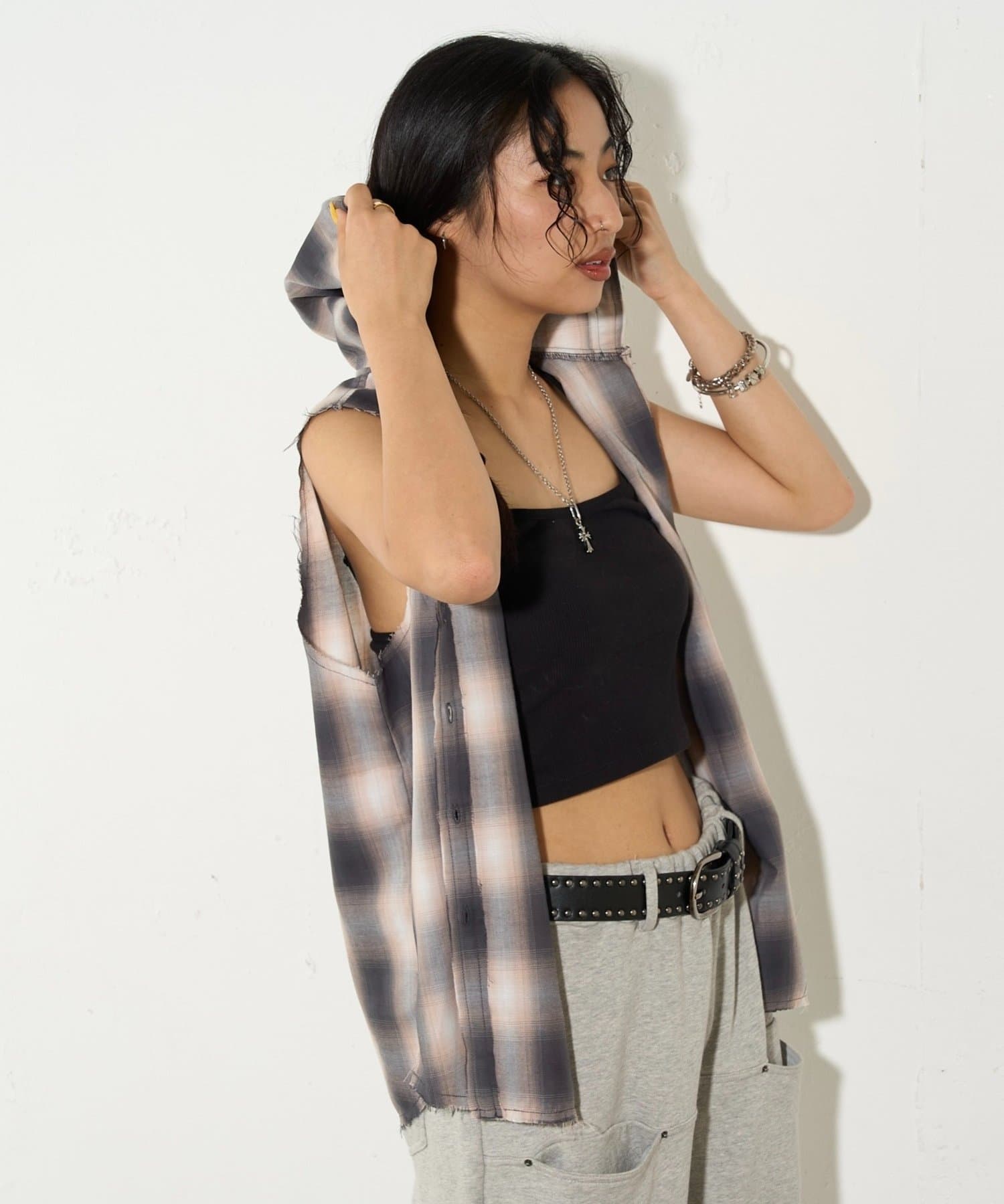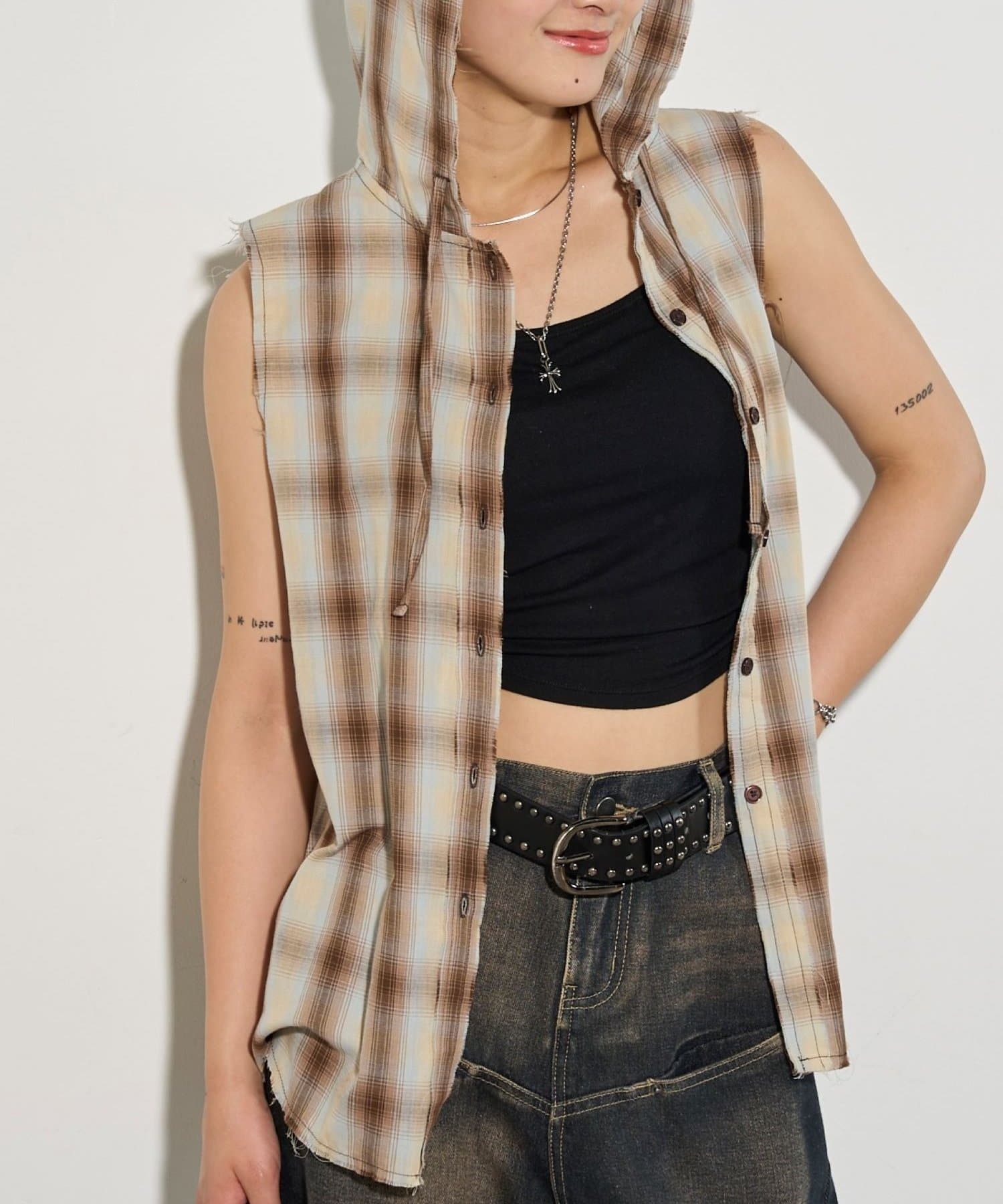 ・フード付きのチェックシャツがノースリーブになったデザイン。