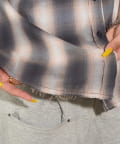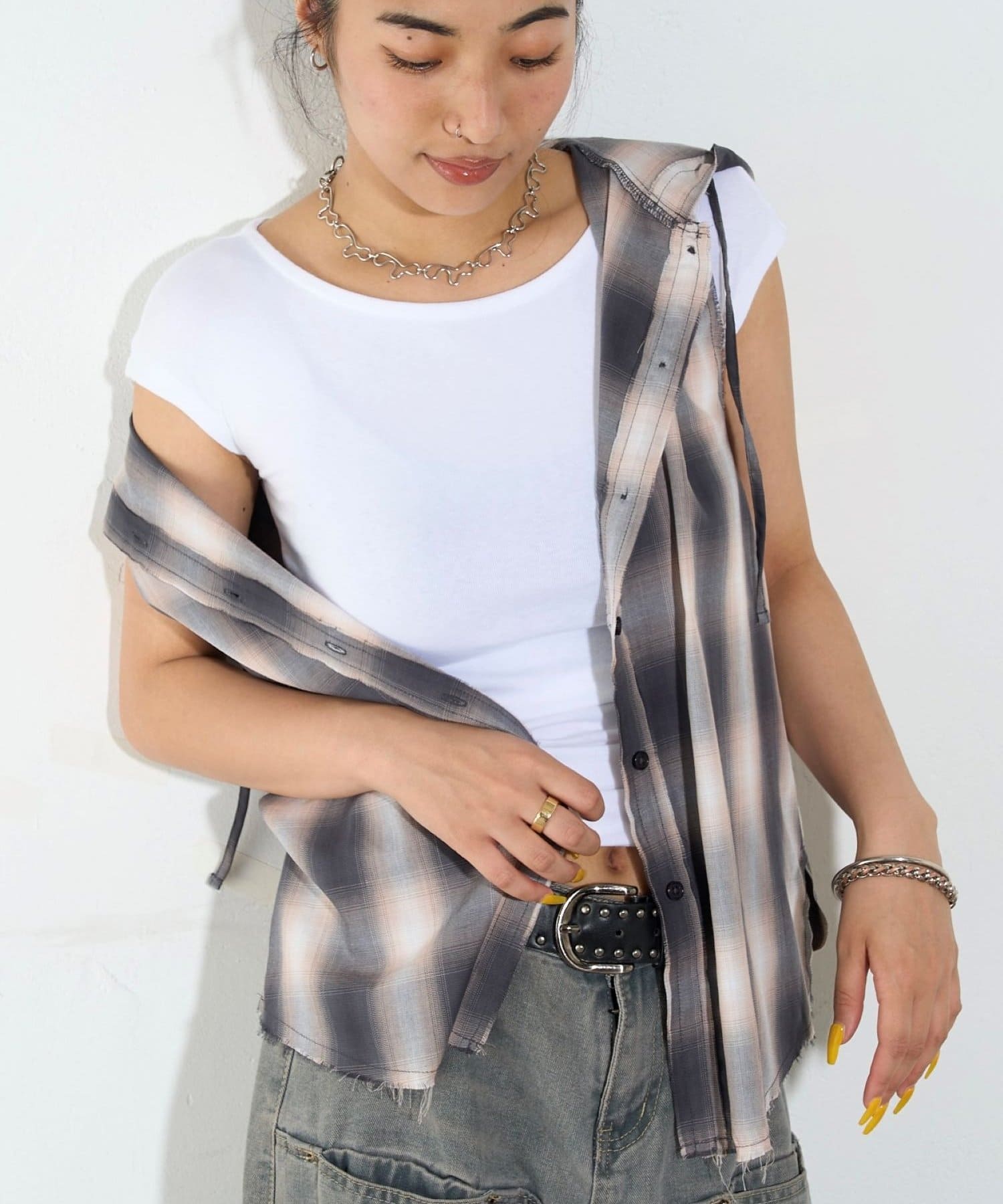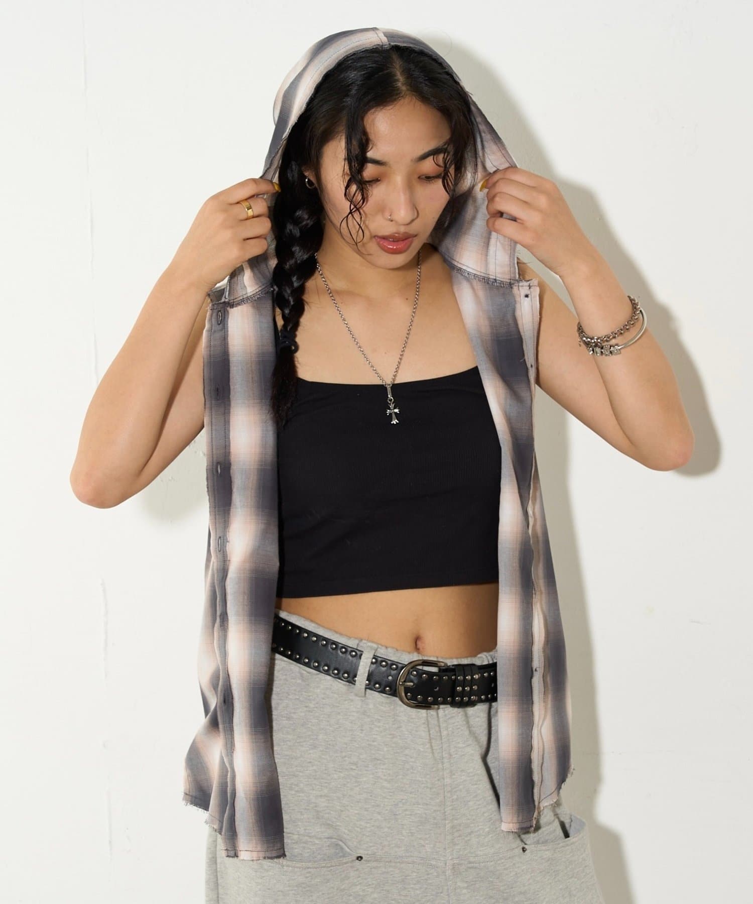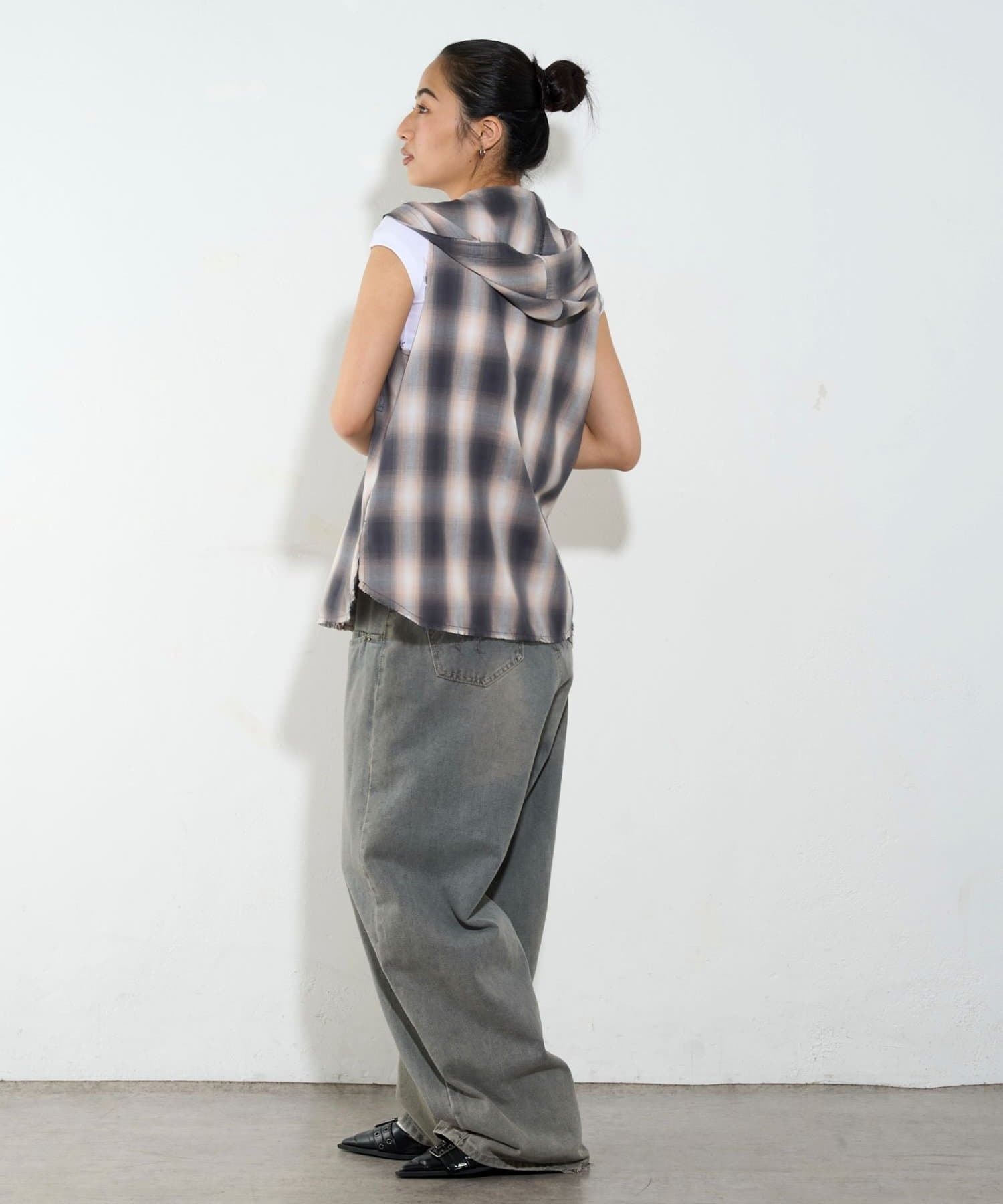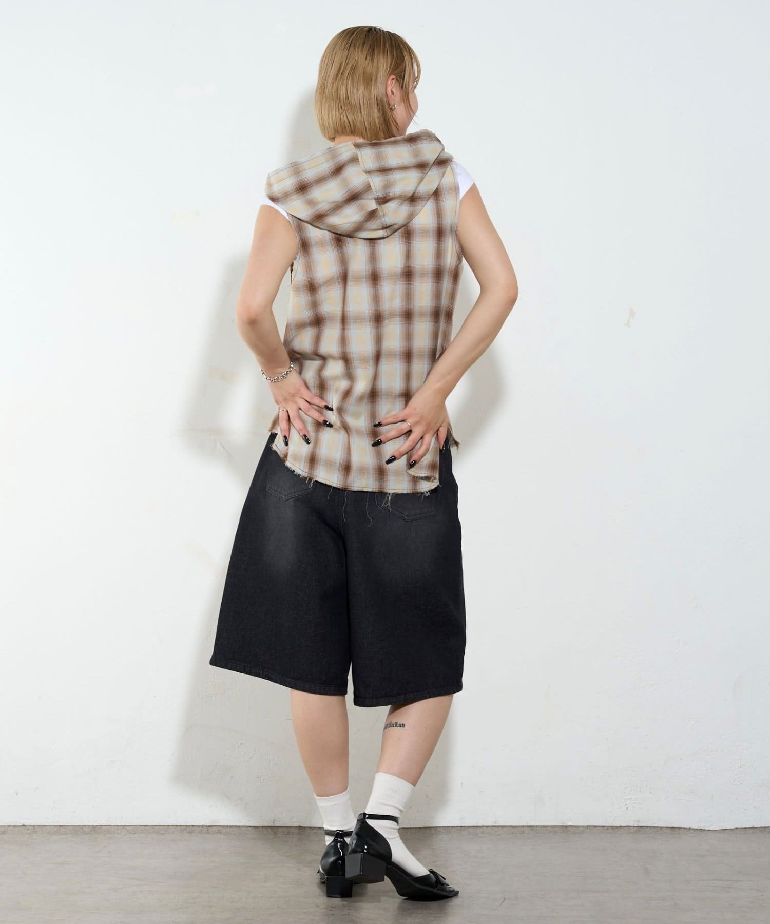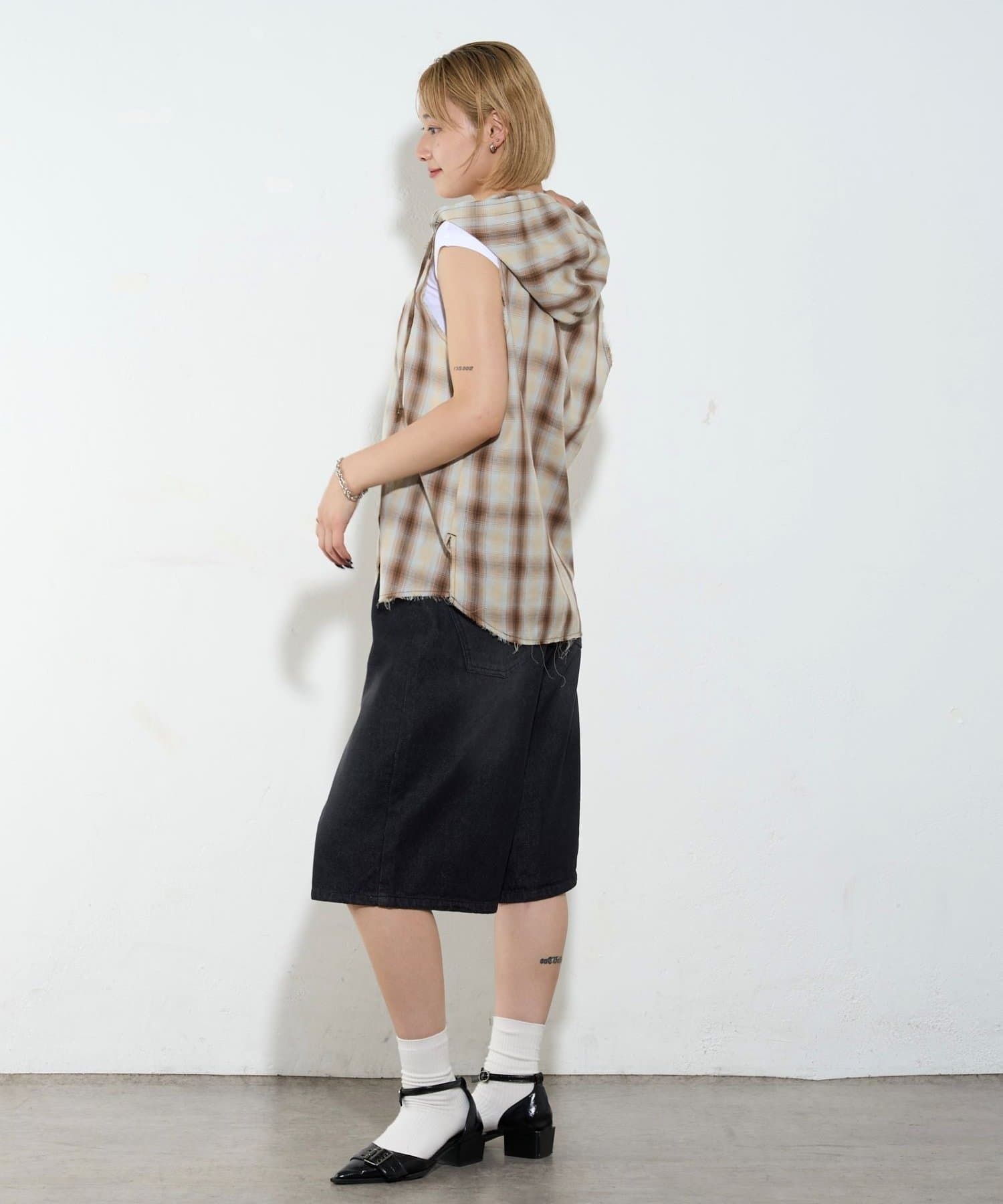 ・フード付きのチェックシャツがノースリーブになったデザイン。