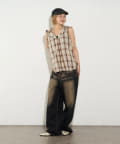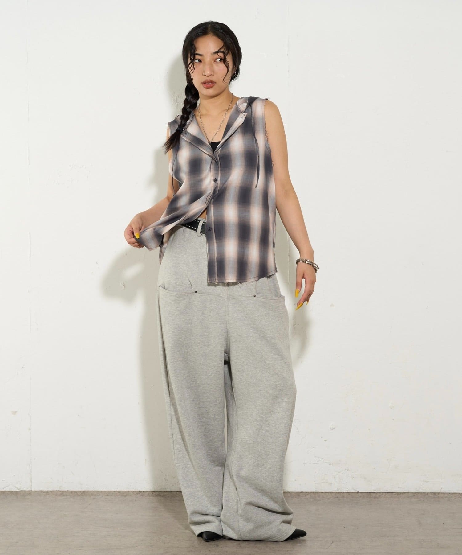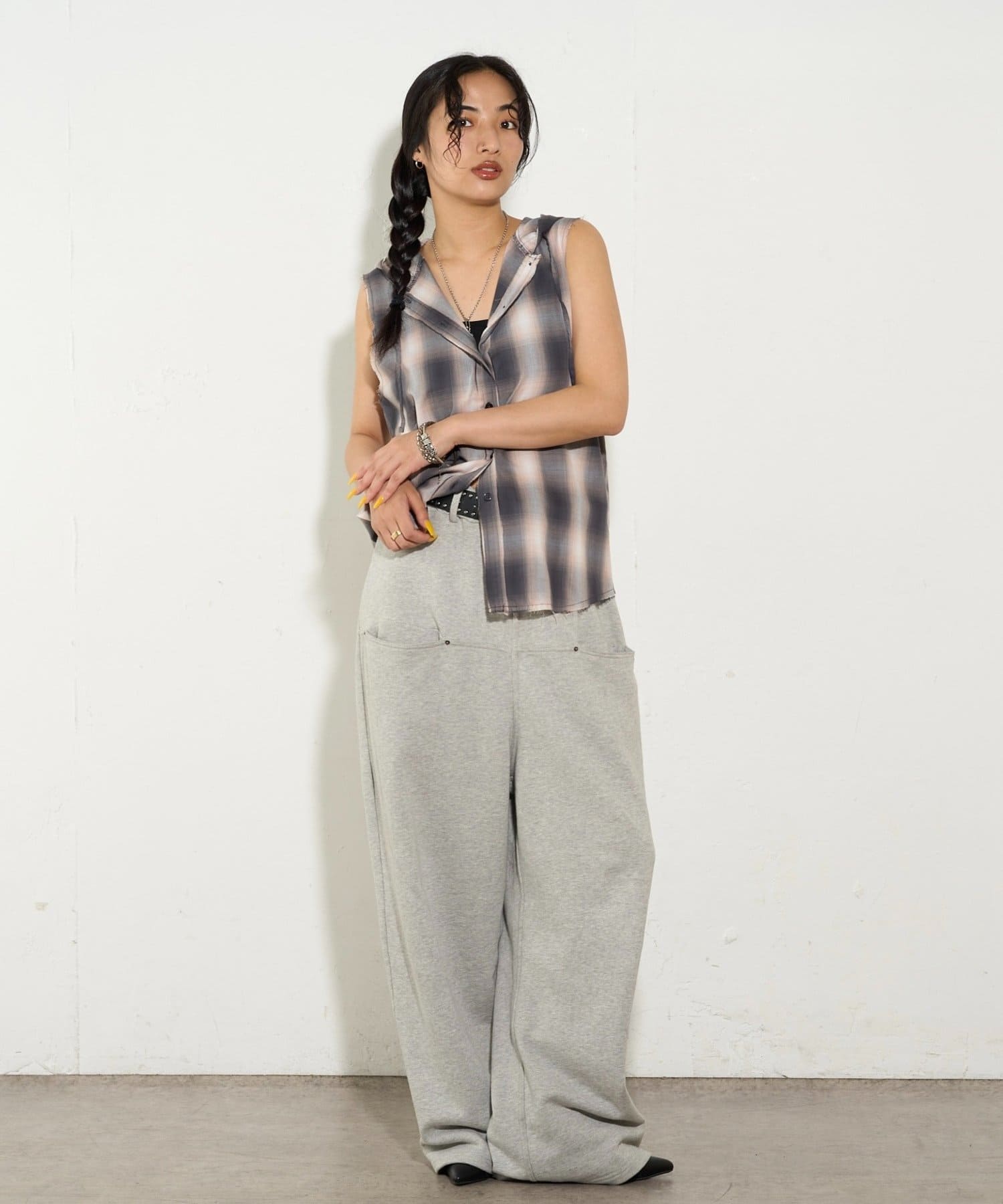 →スウェットとチェック柄の相性が抜群で、またノースリーブになっていることで暑い時期にもさらっと着て頂けます。