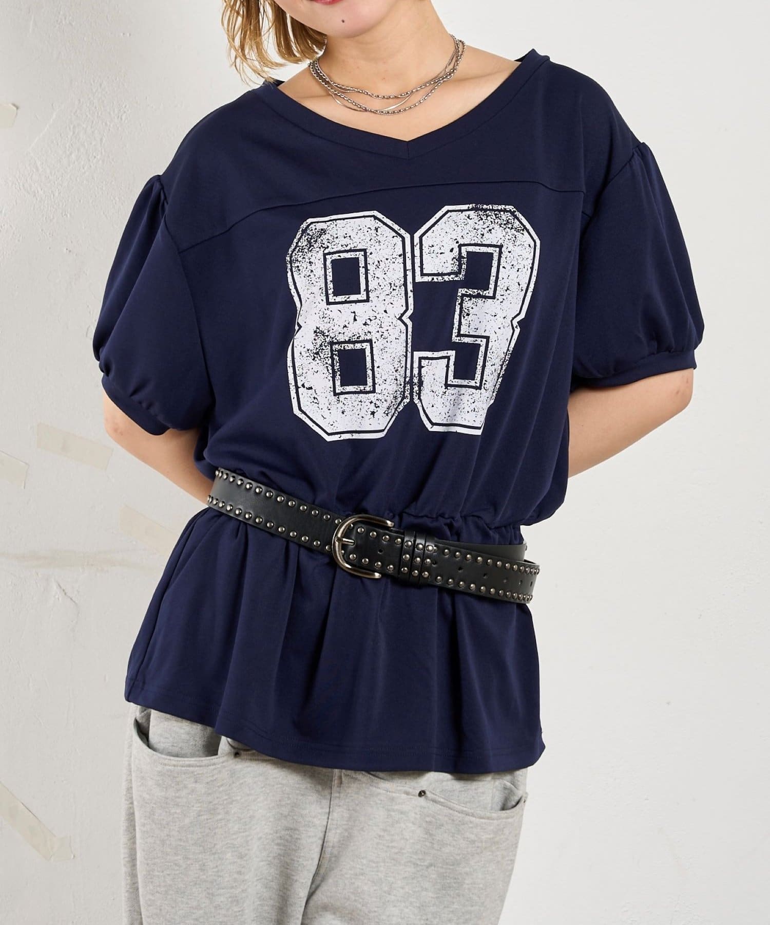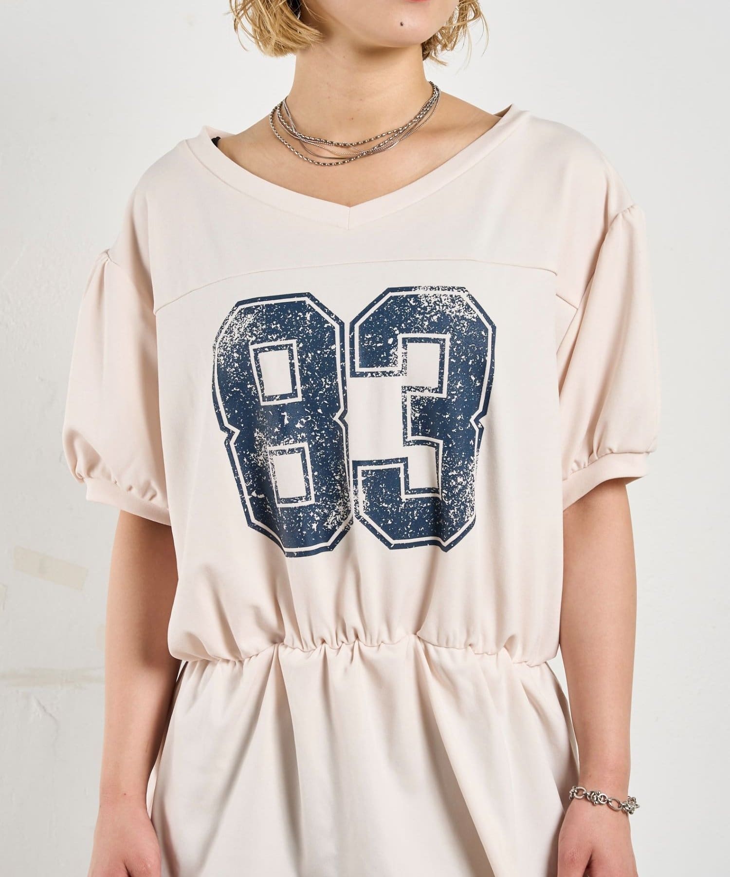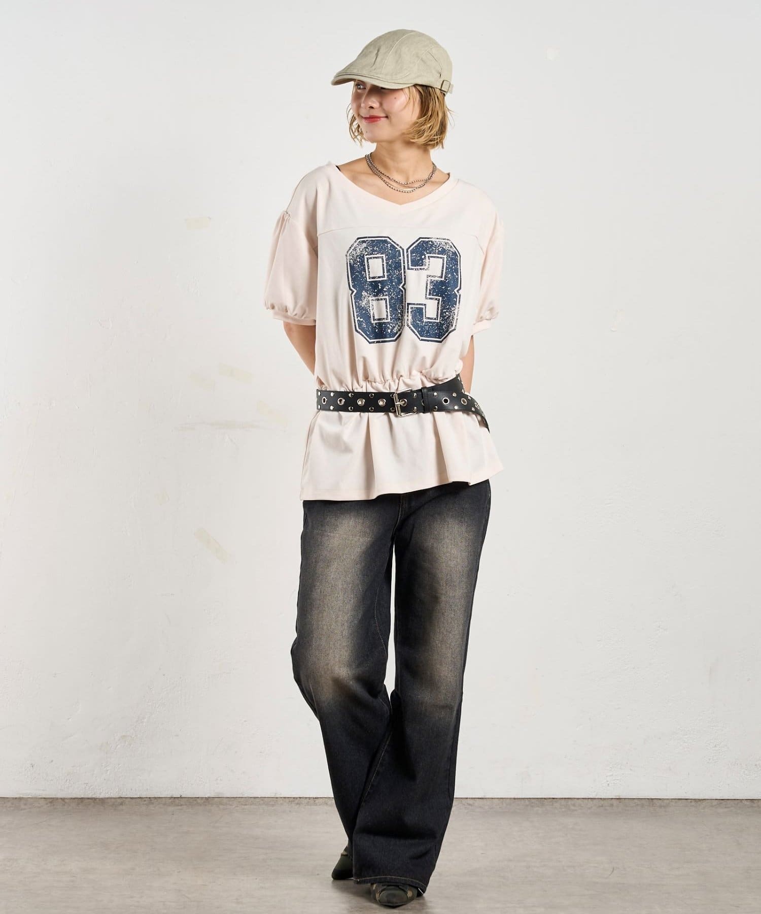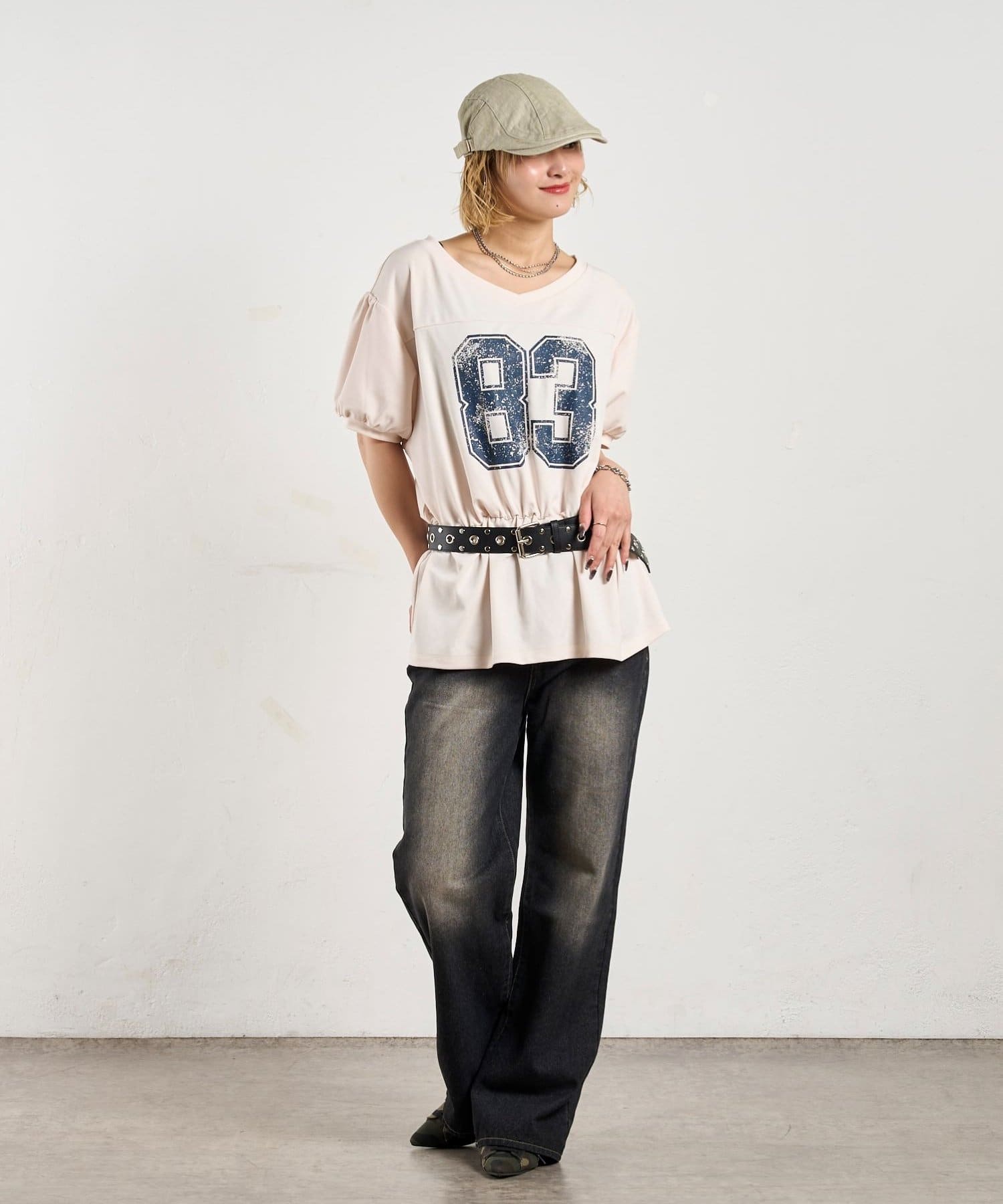 ウエストマークされたシルエットがポイントのナンバリングTEE。