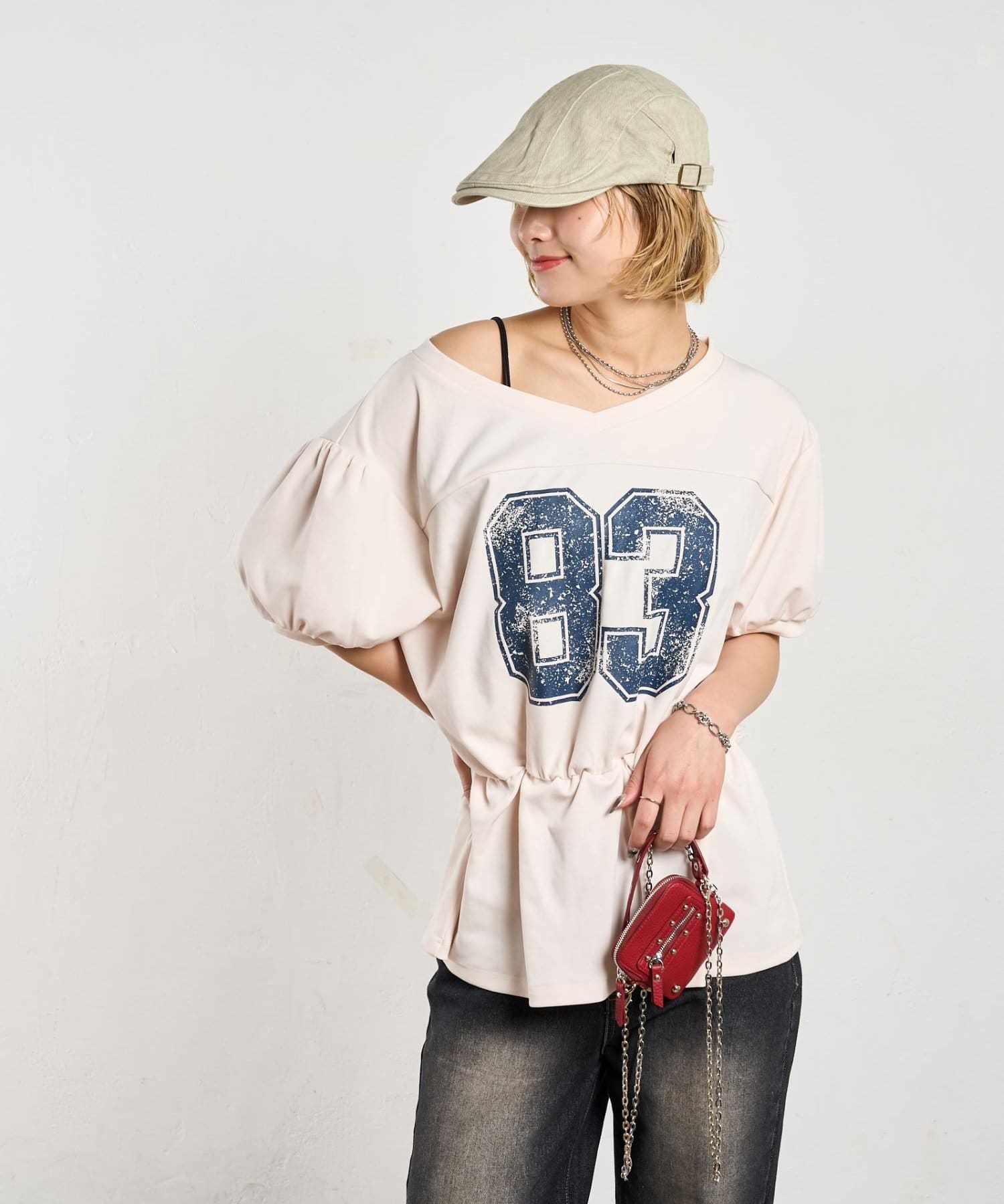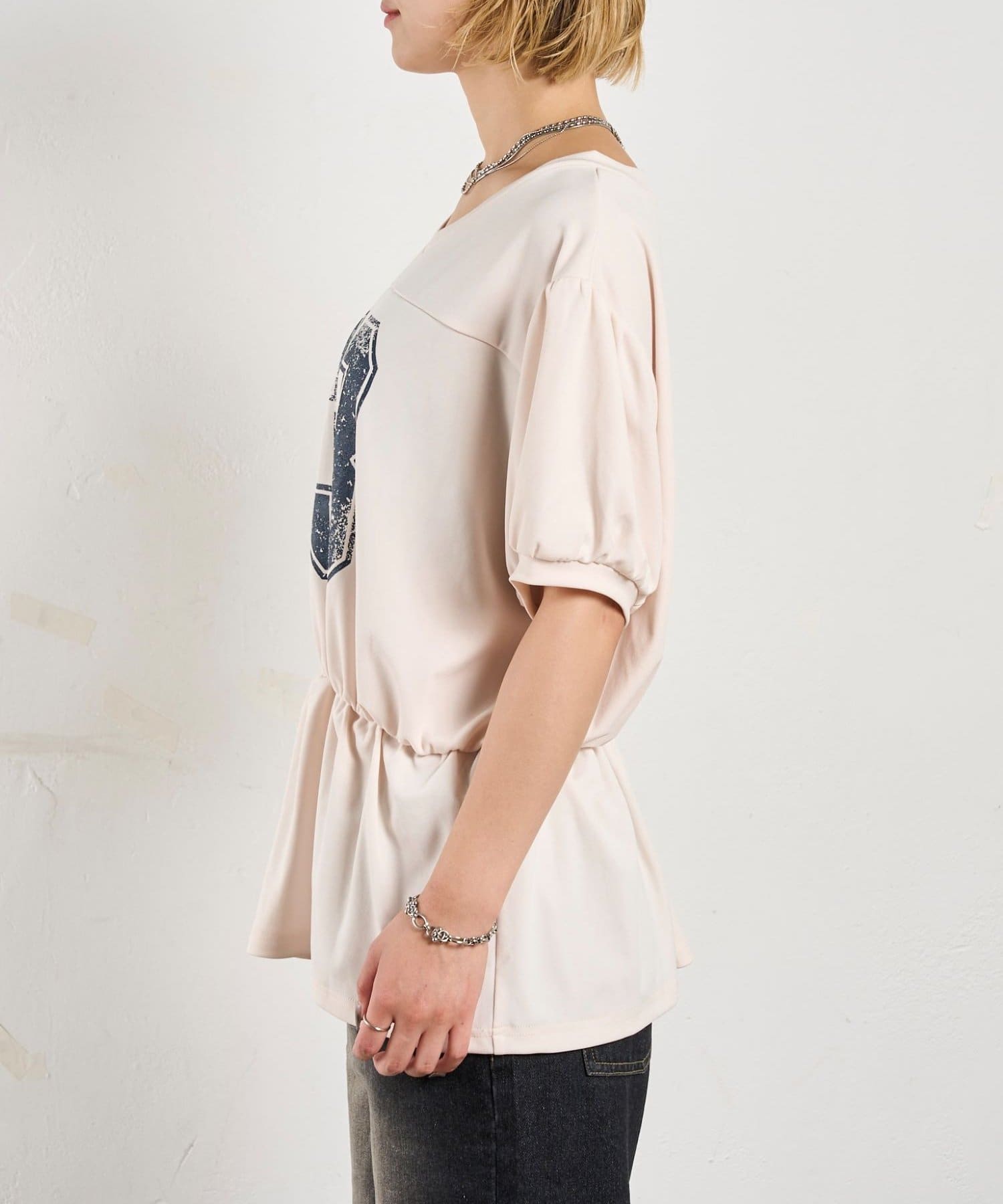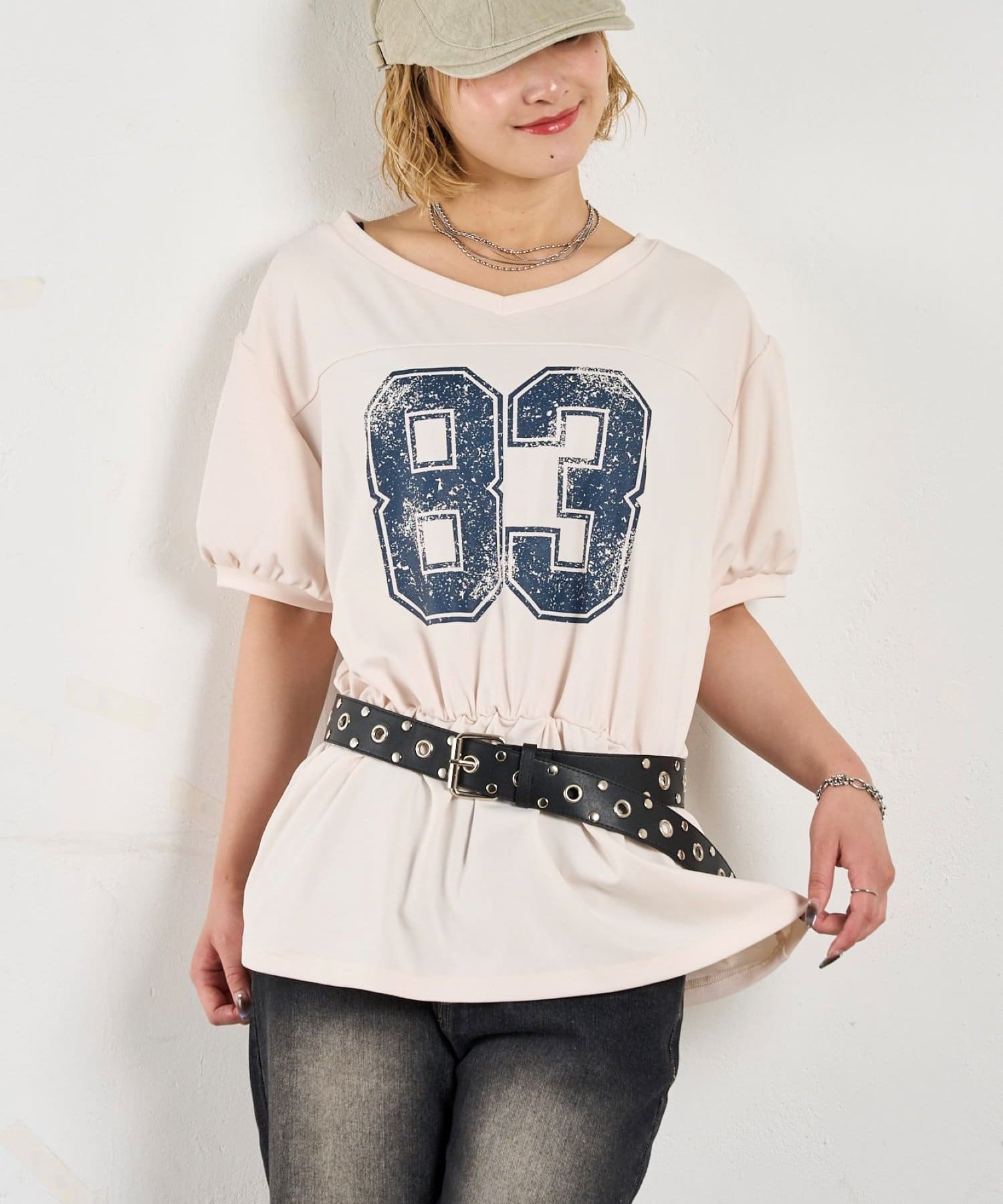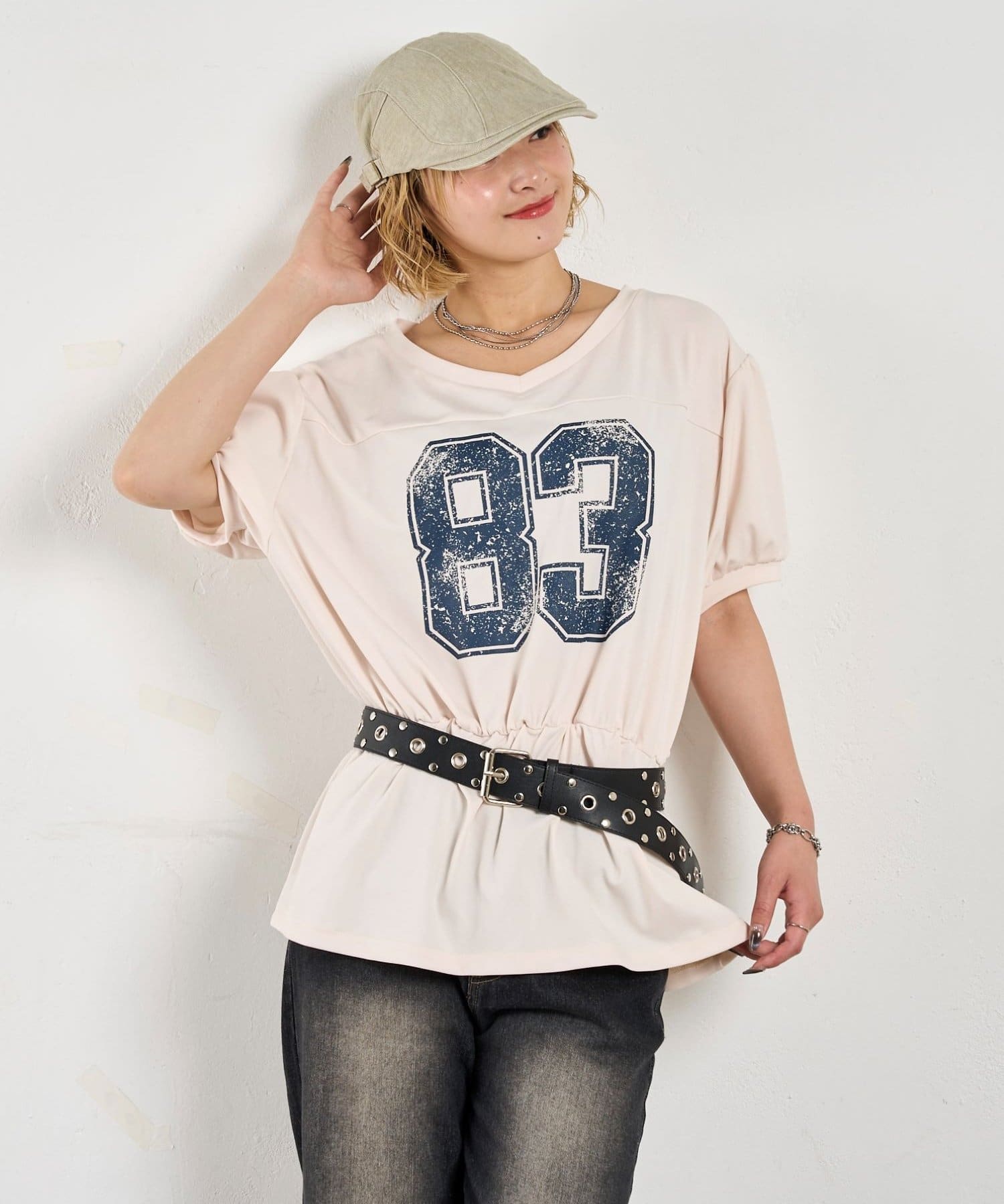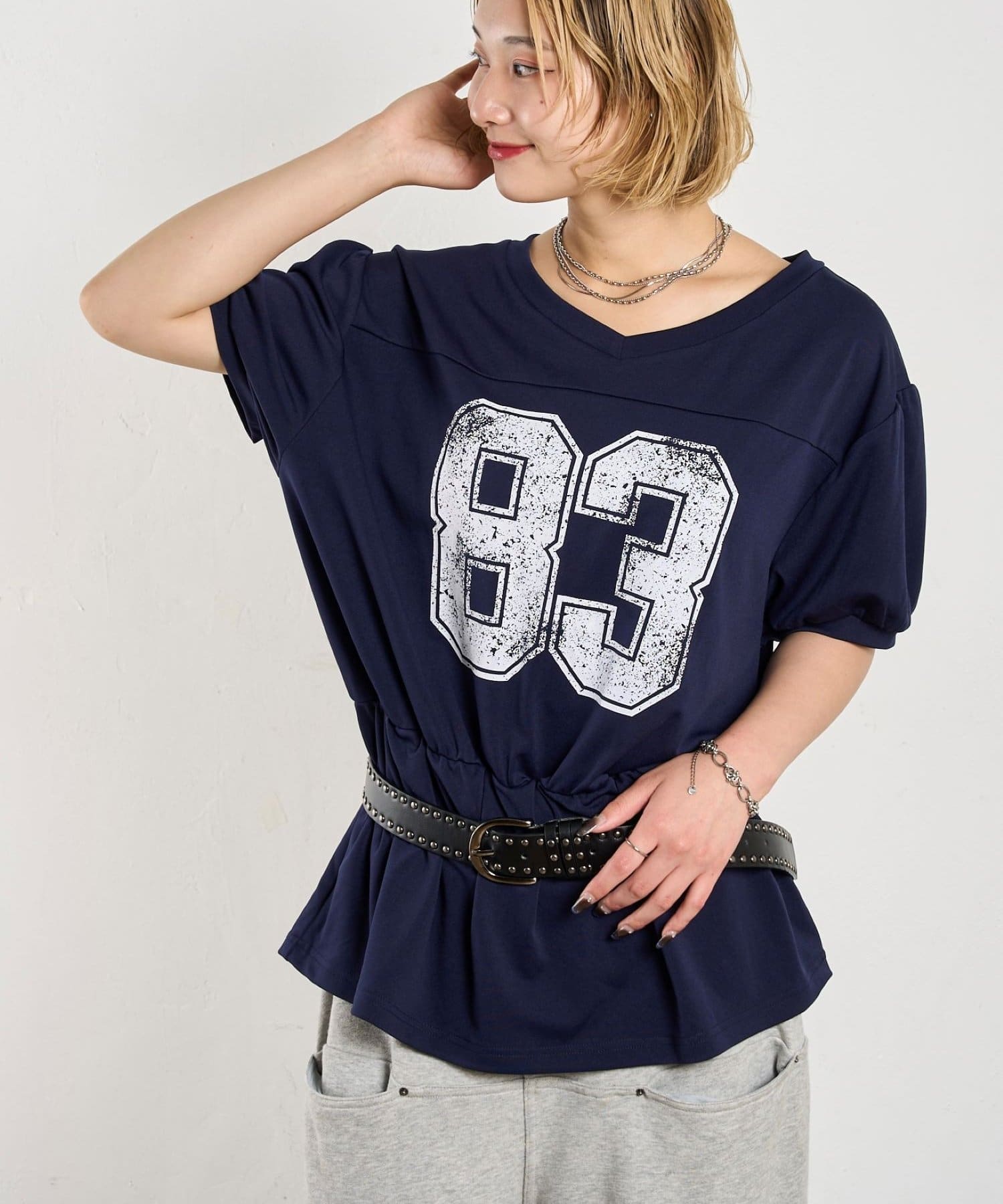 ウエストマークされたシルエットがポイントのナンバリングTEE。