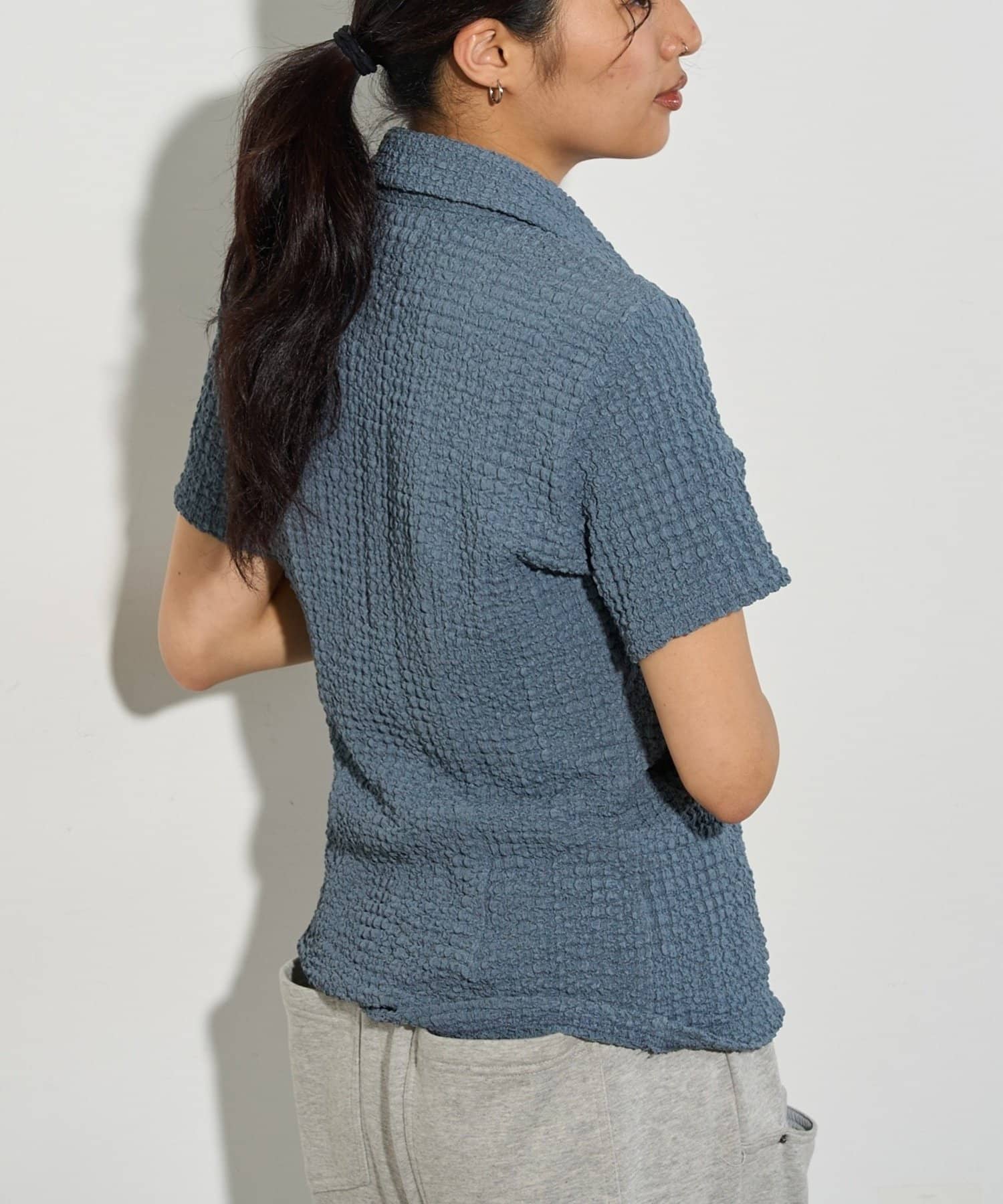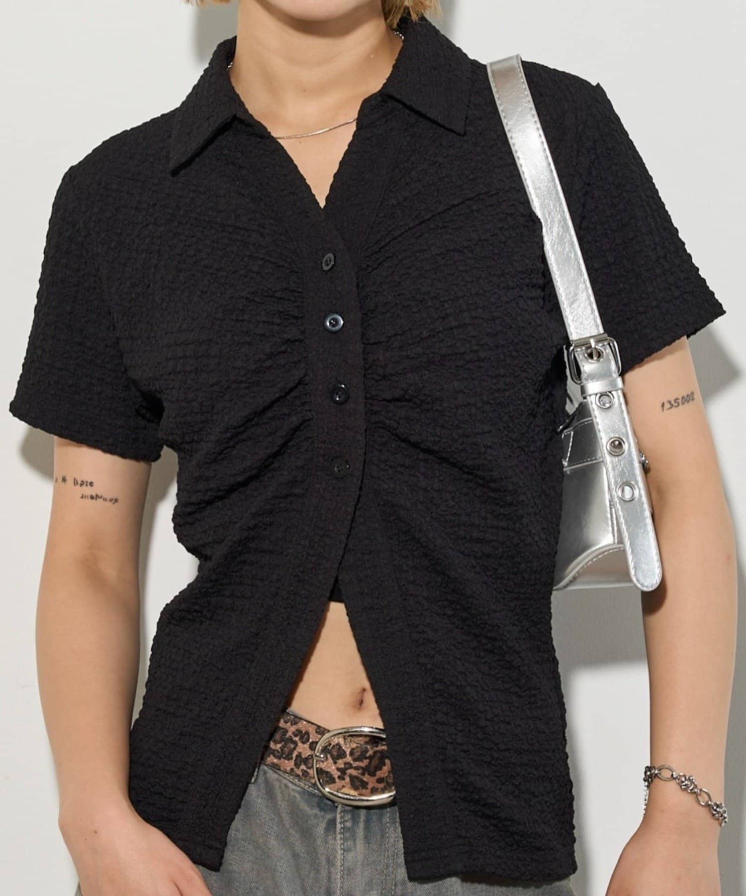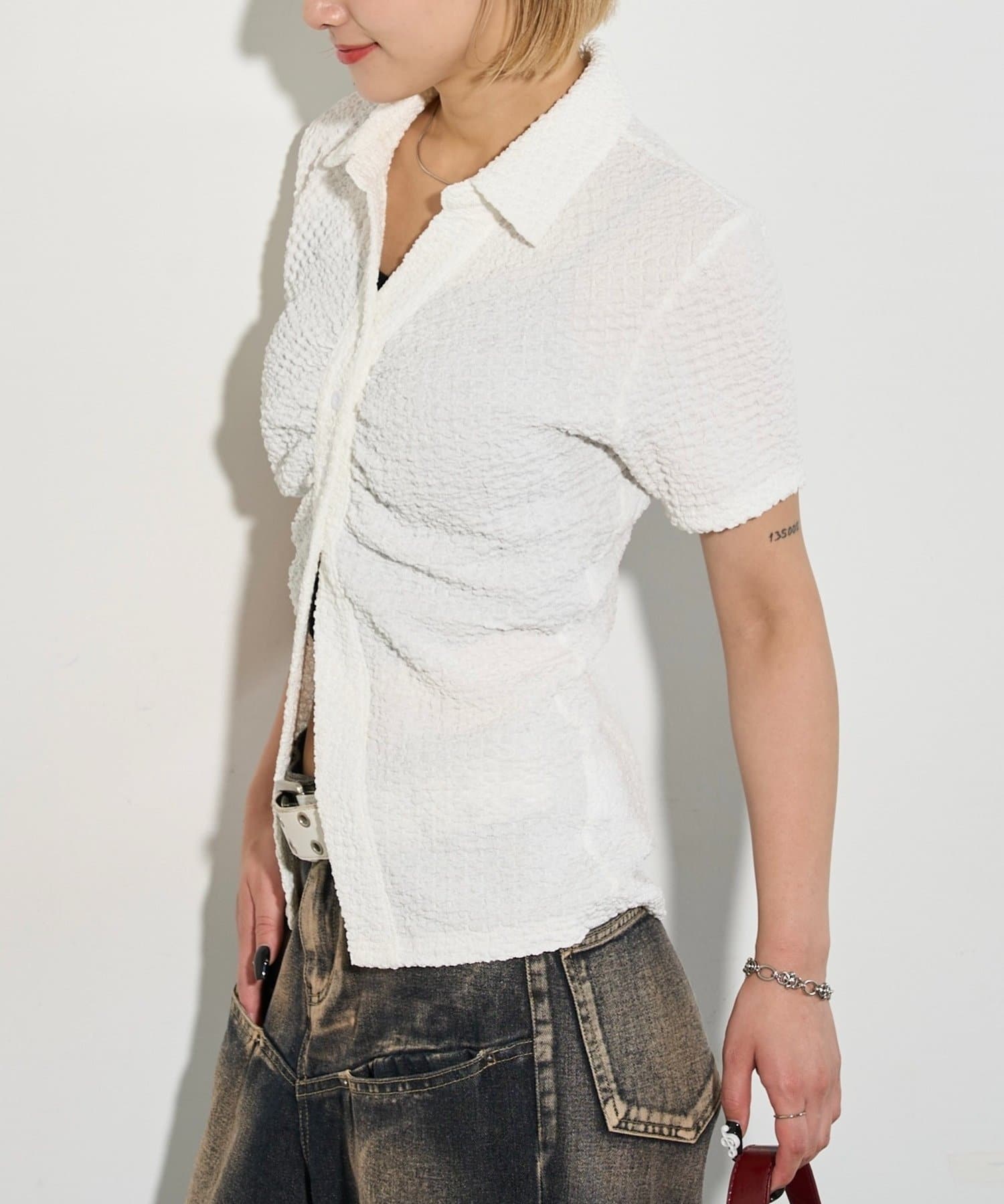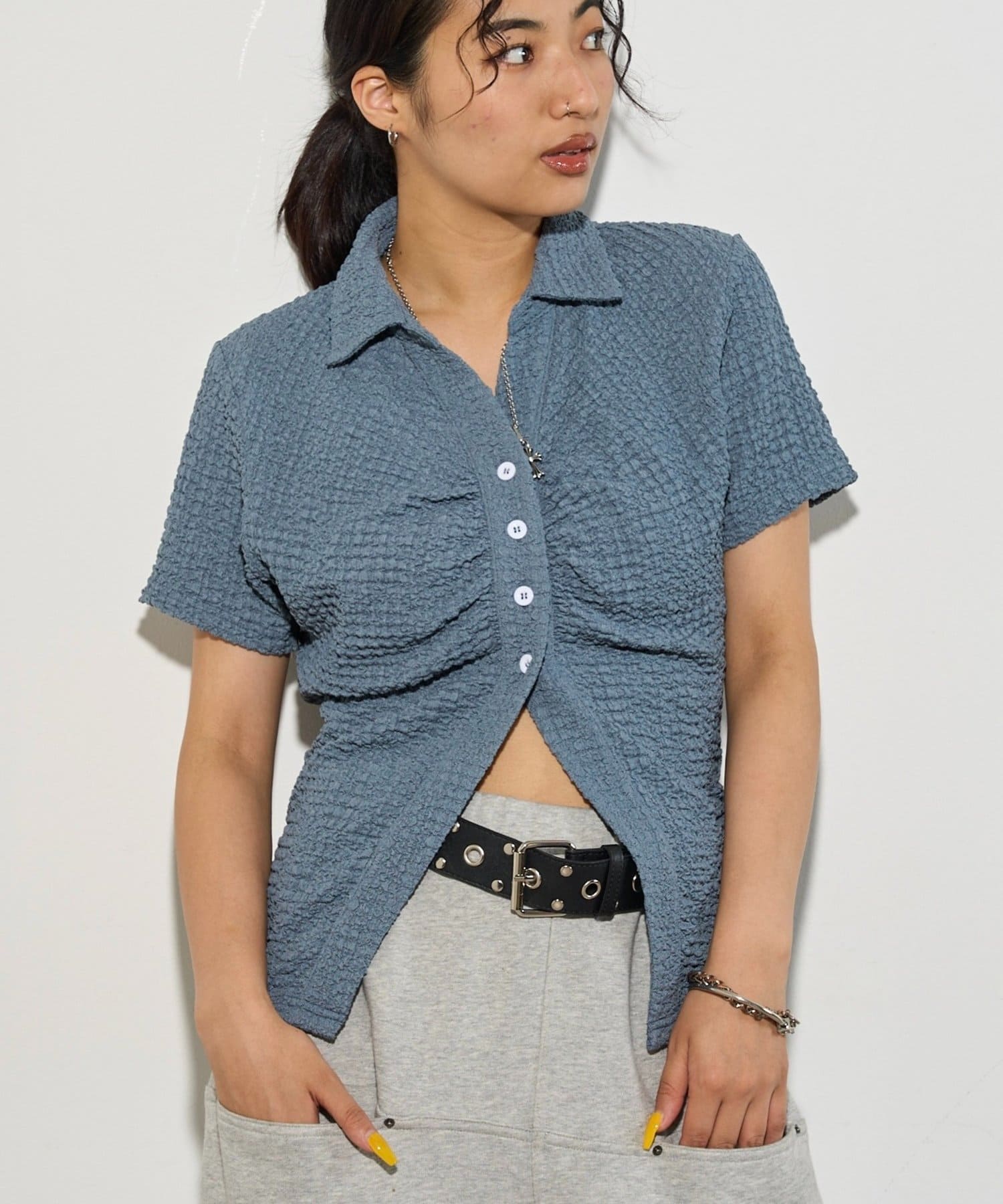 ポコポコ生地と胸元のギャザーがポイントの半袖シャツ。