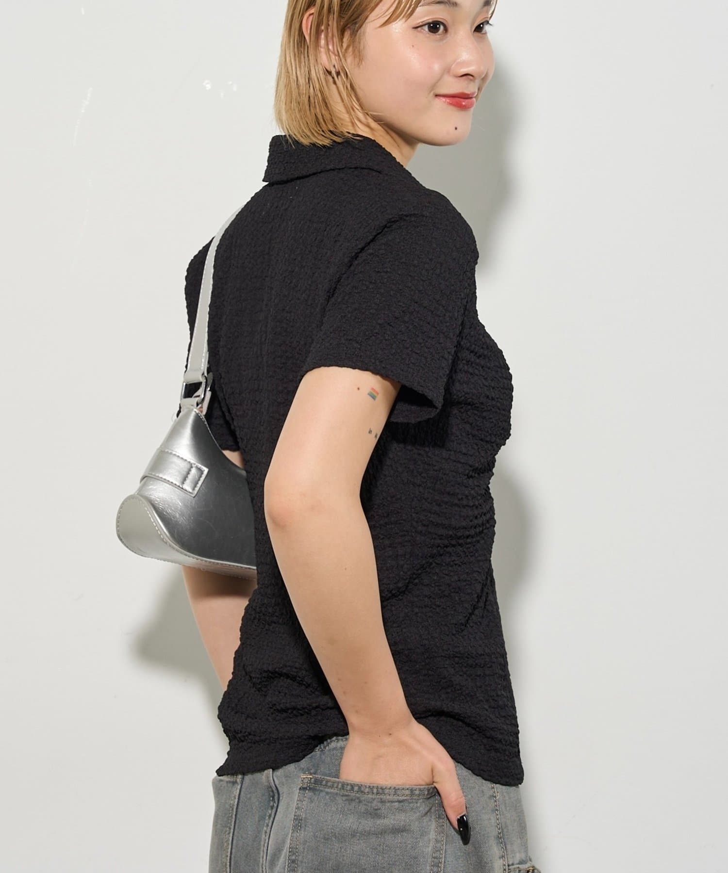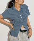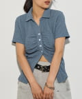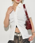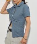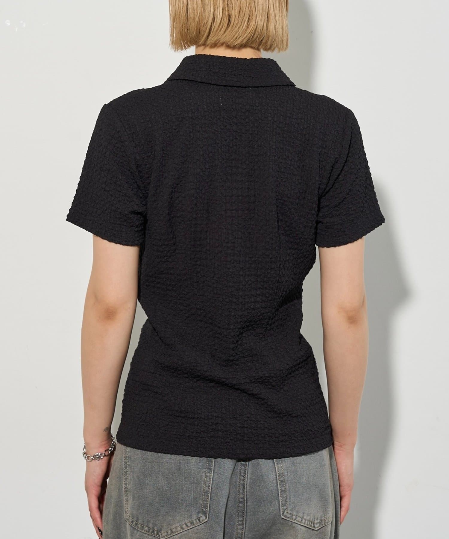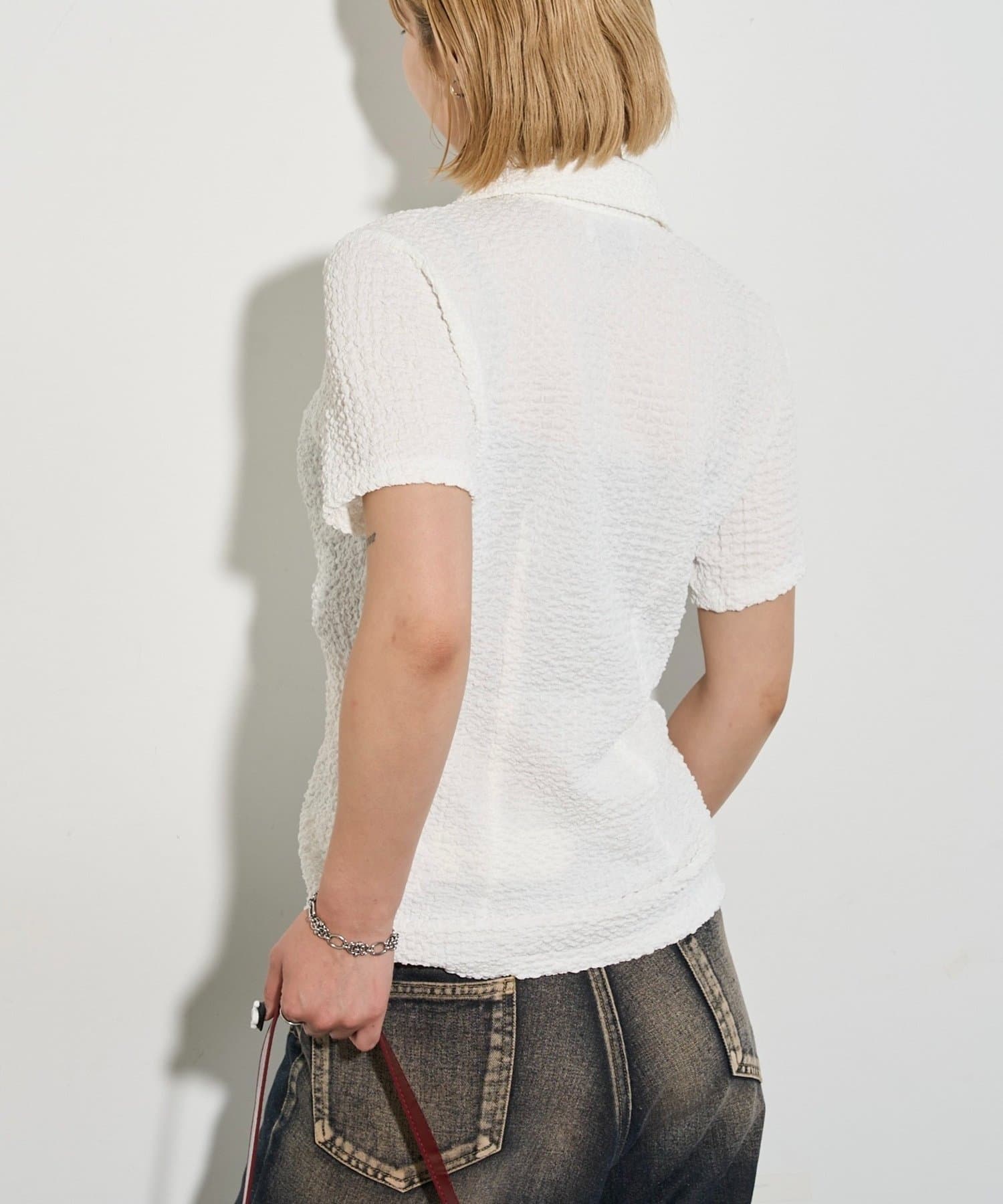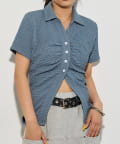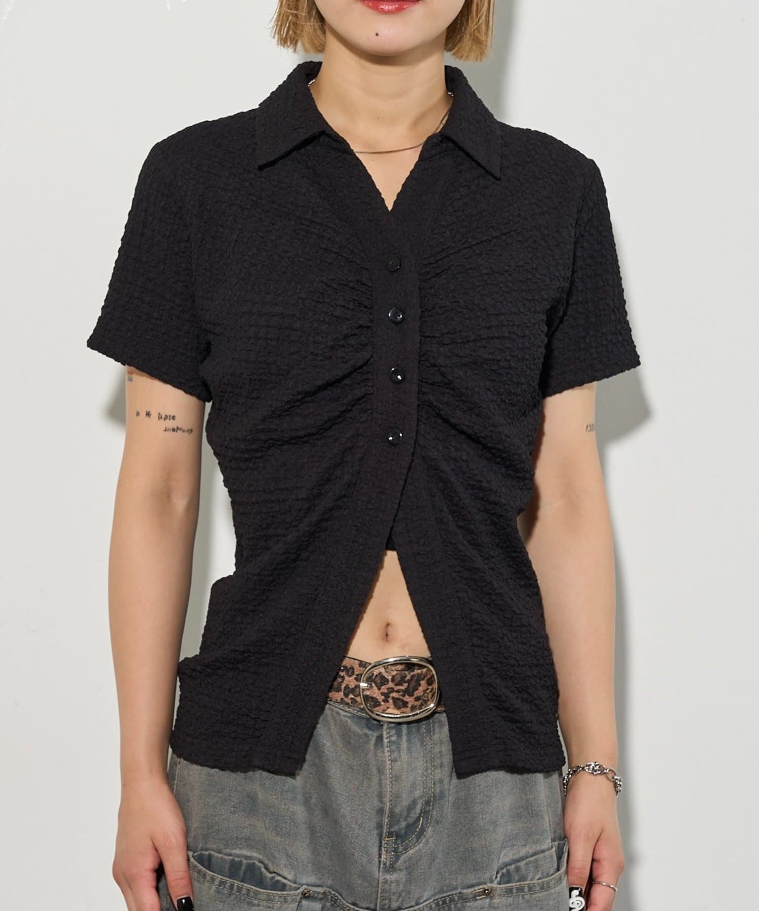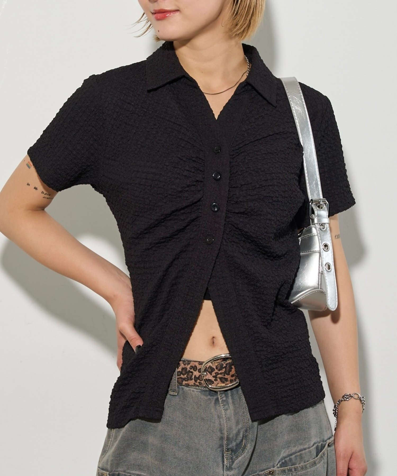 ポコポコ生地と胸元のギャザーがポイントの半袖シャツ。