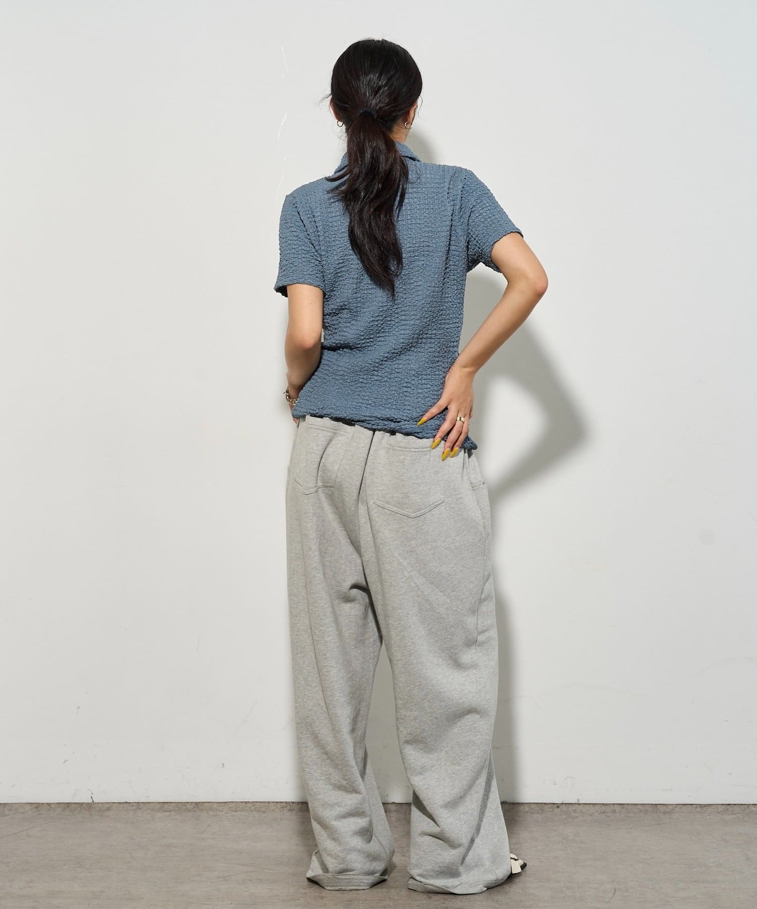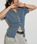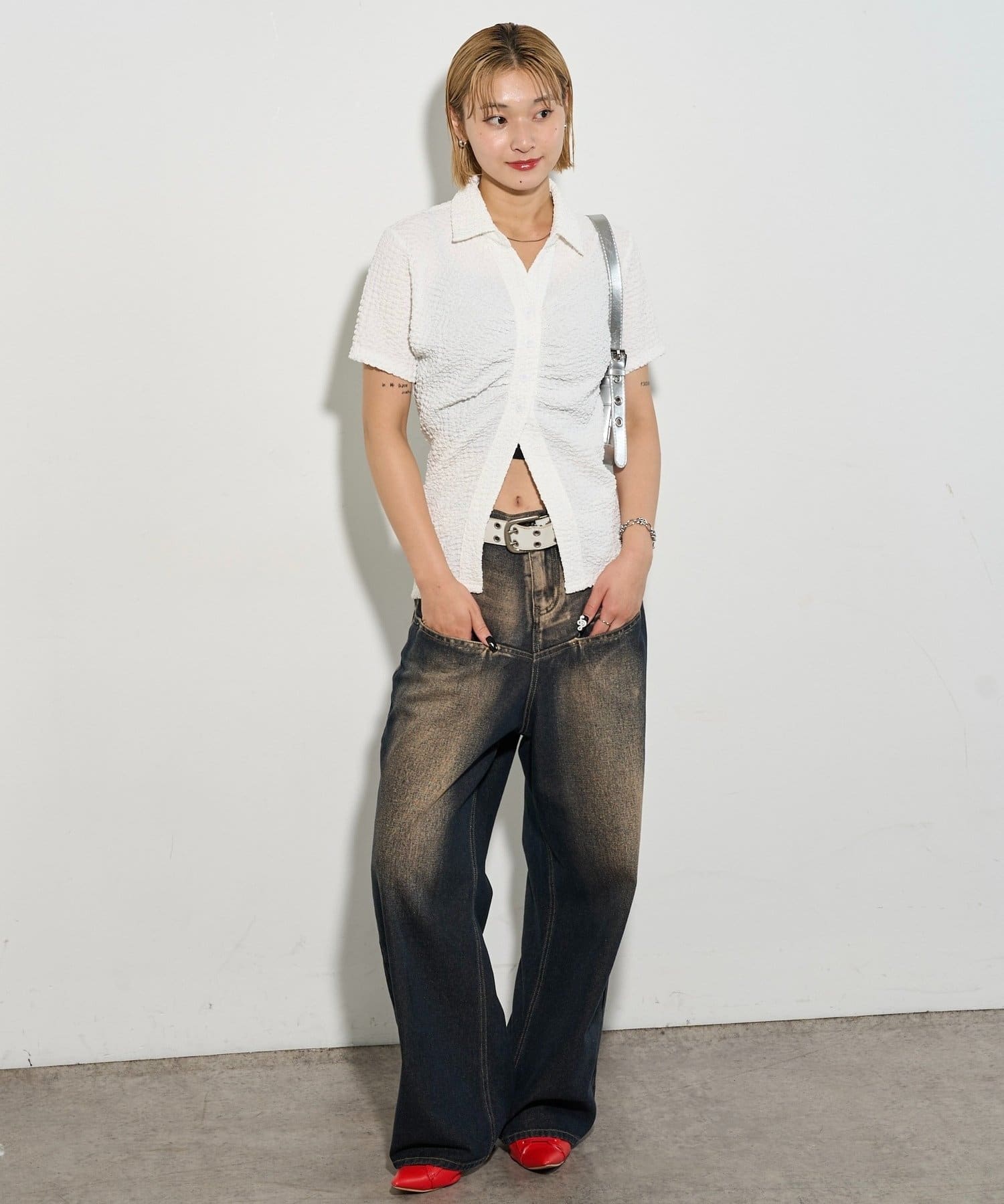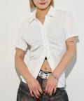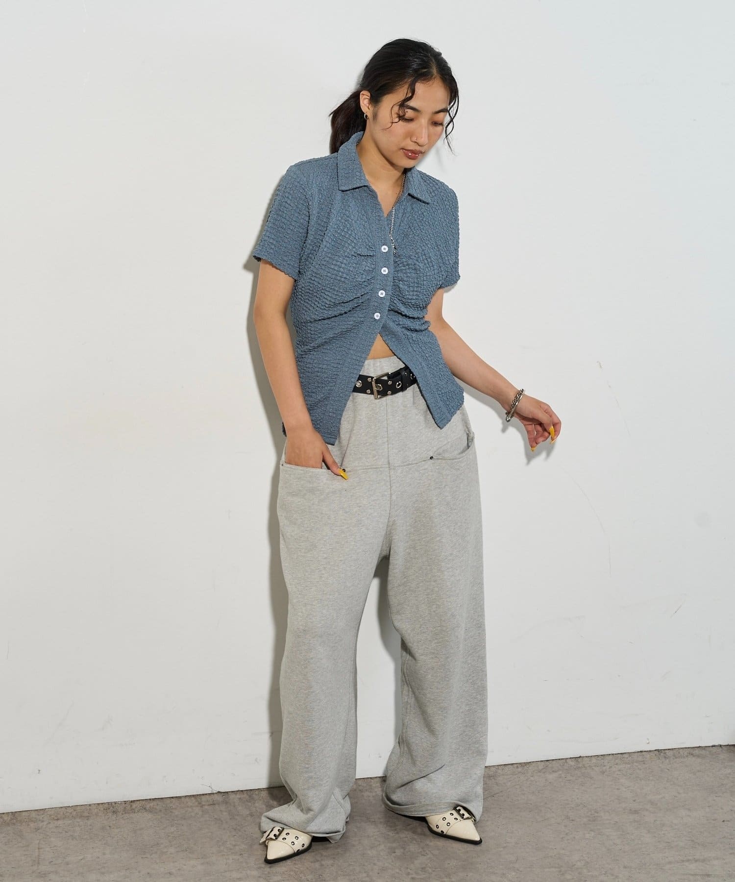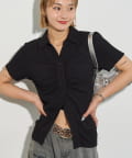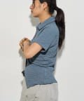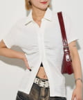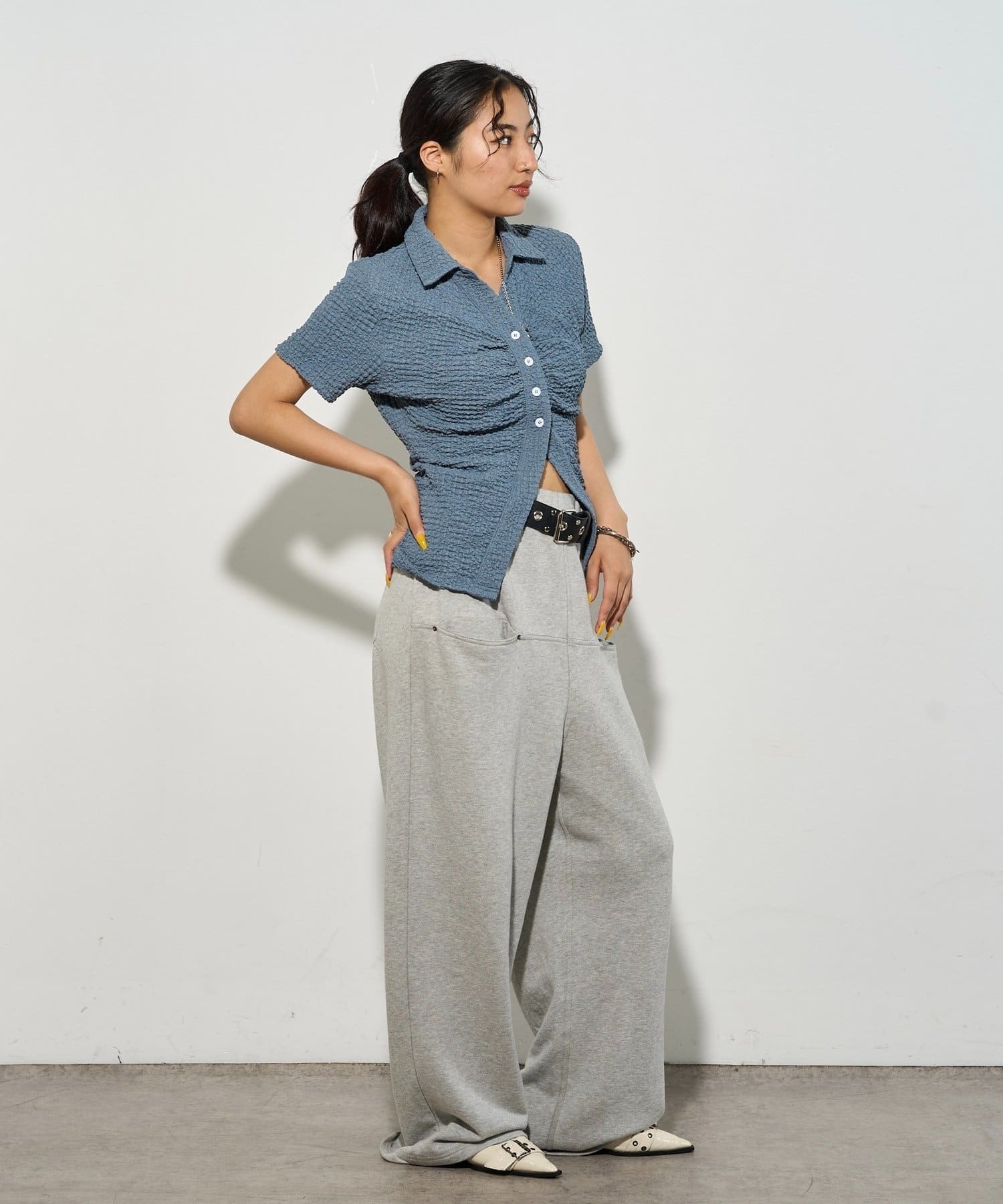 ポコポコ生地と胸元のギャザーがポイントの半袖シャツ。