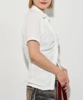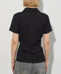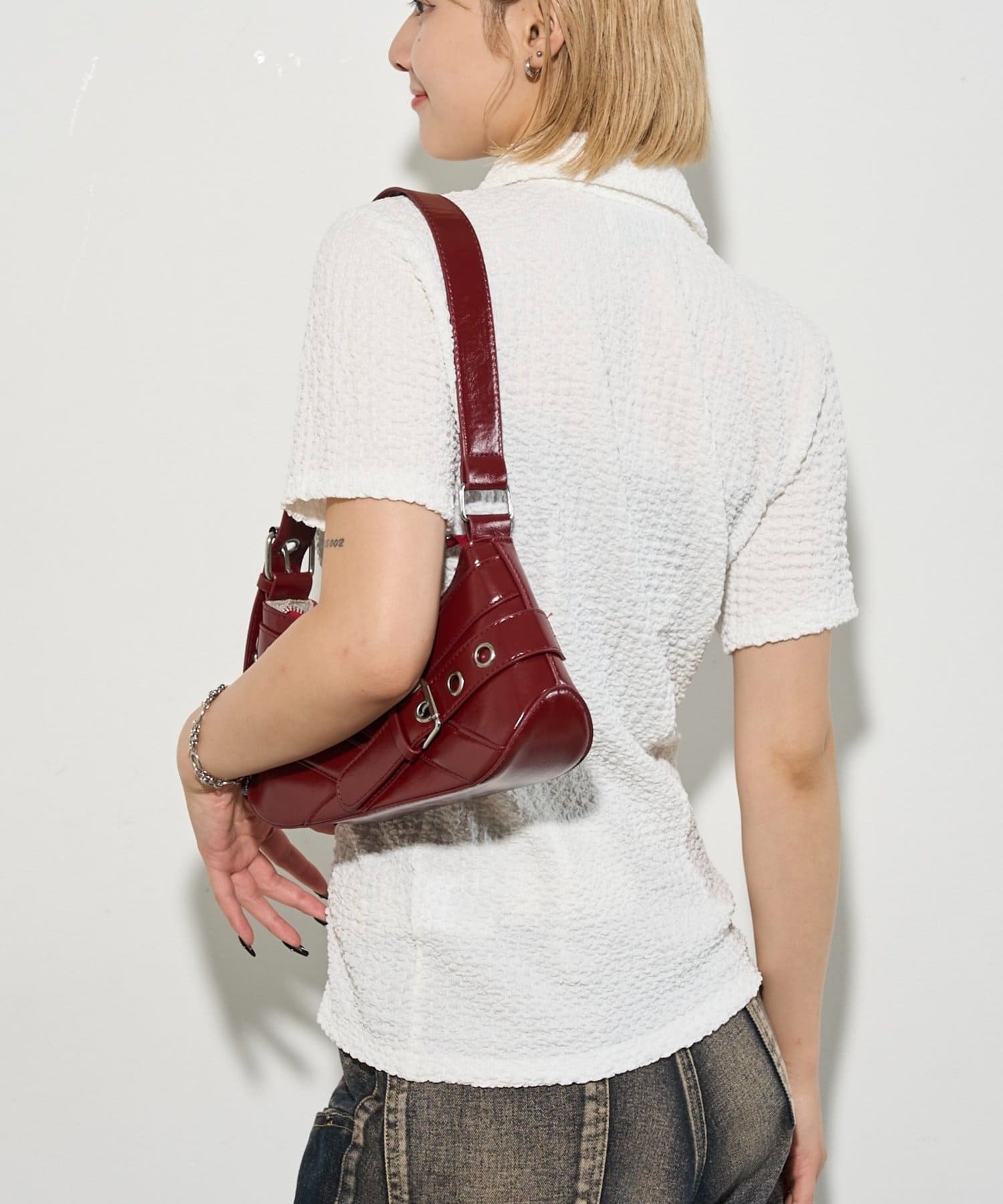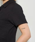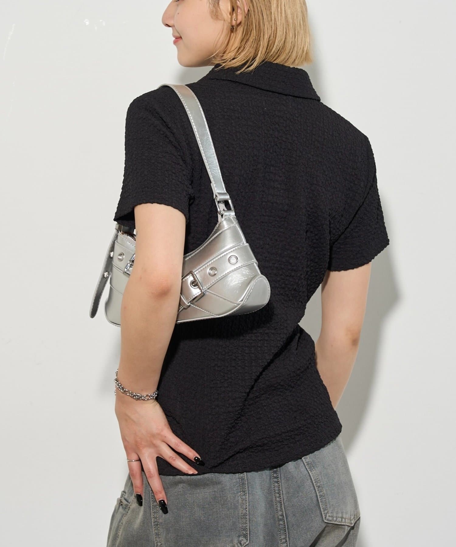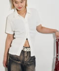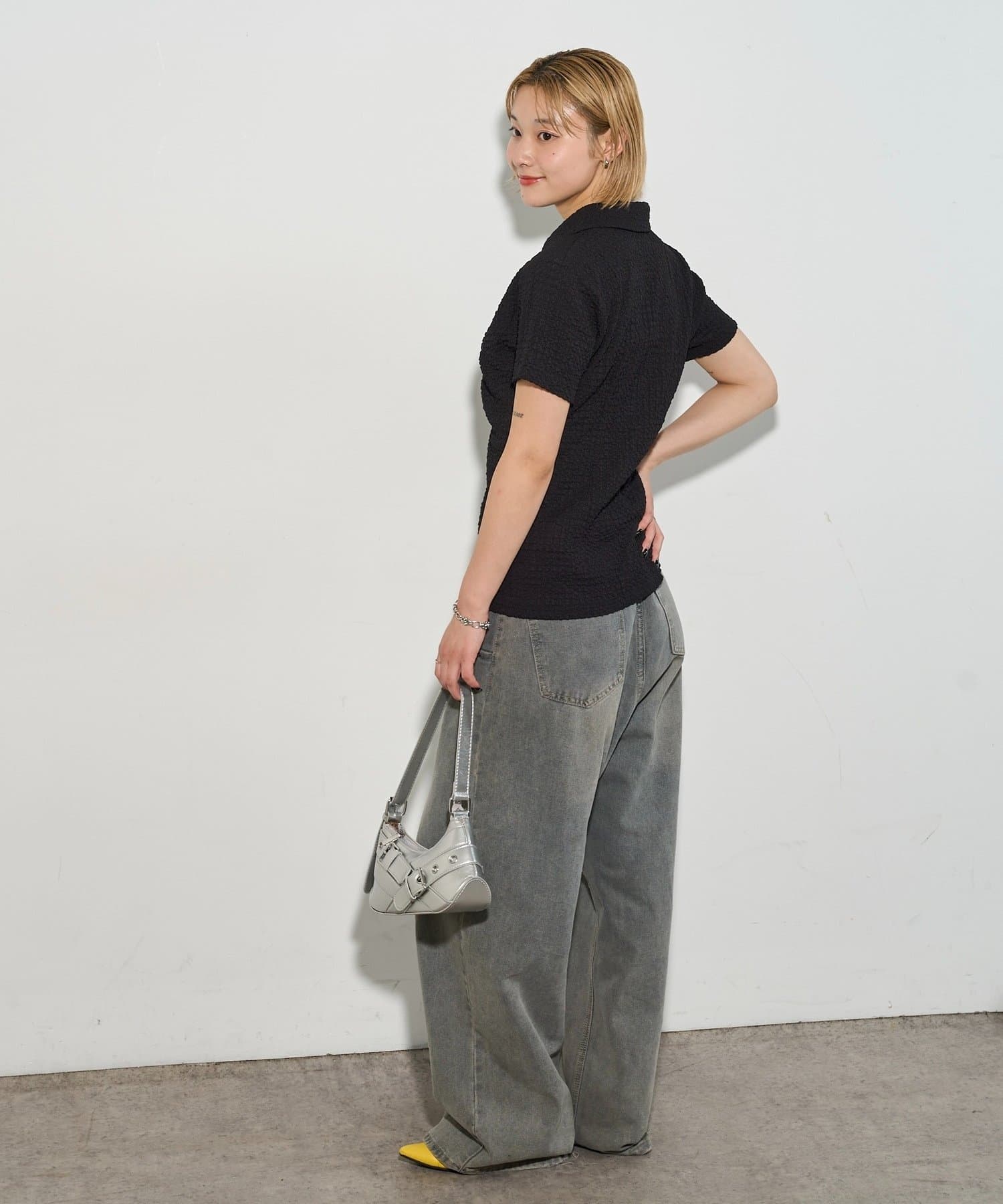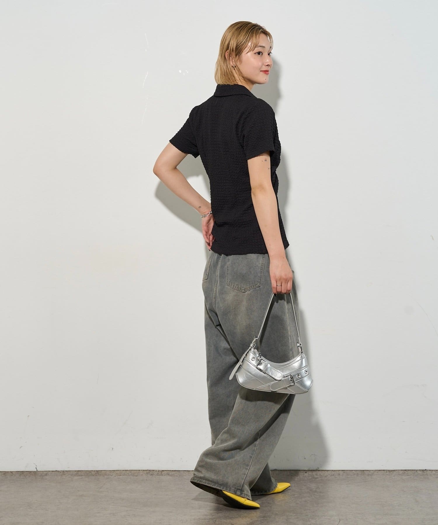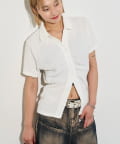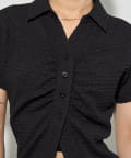 ポコポコ生地と胸元のギャザーがポイントの半袖シャツ。