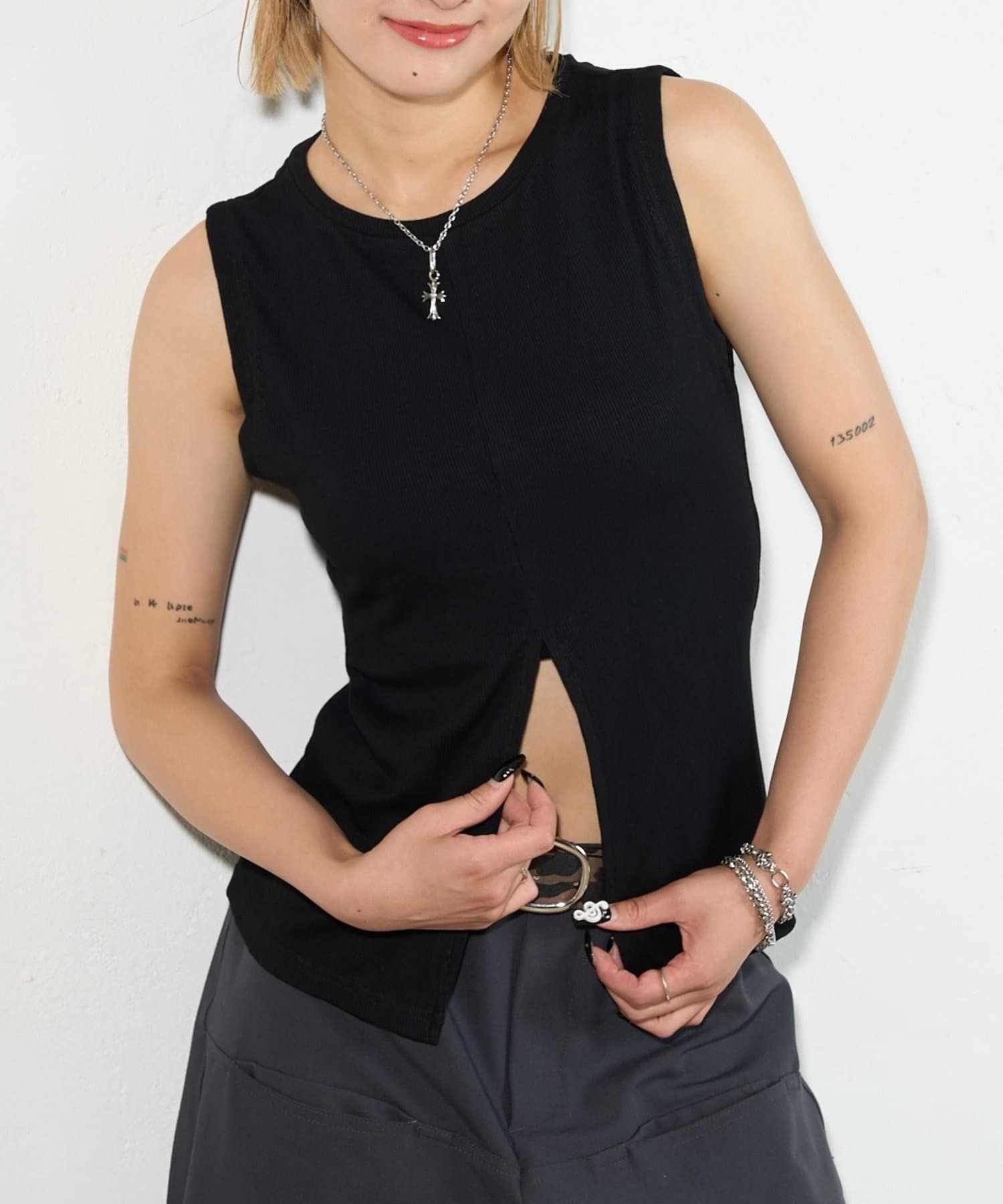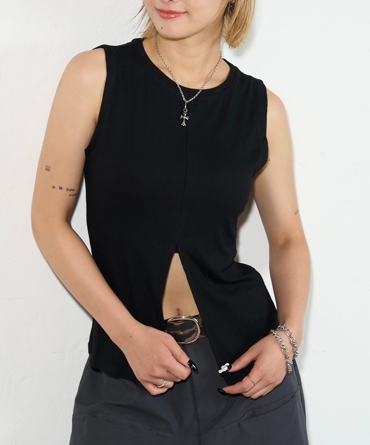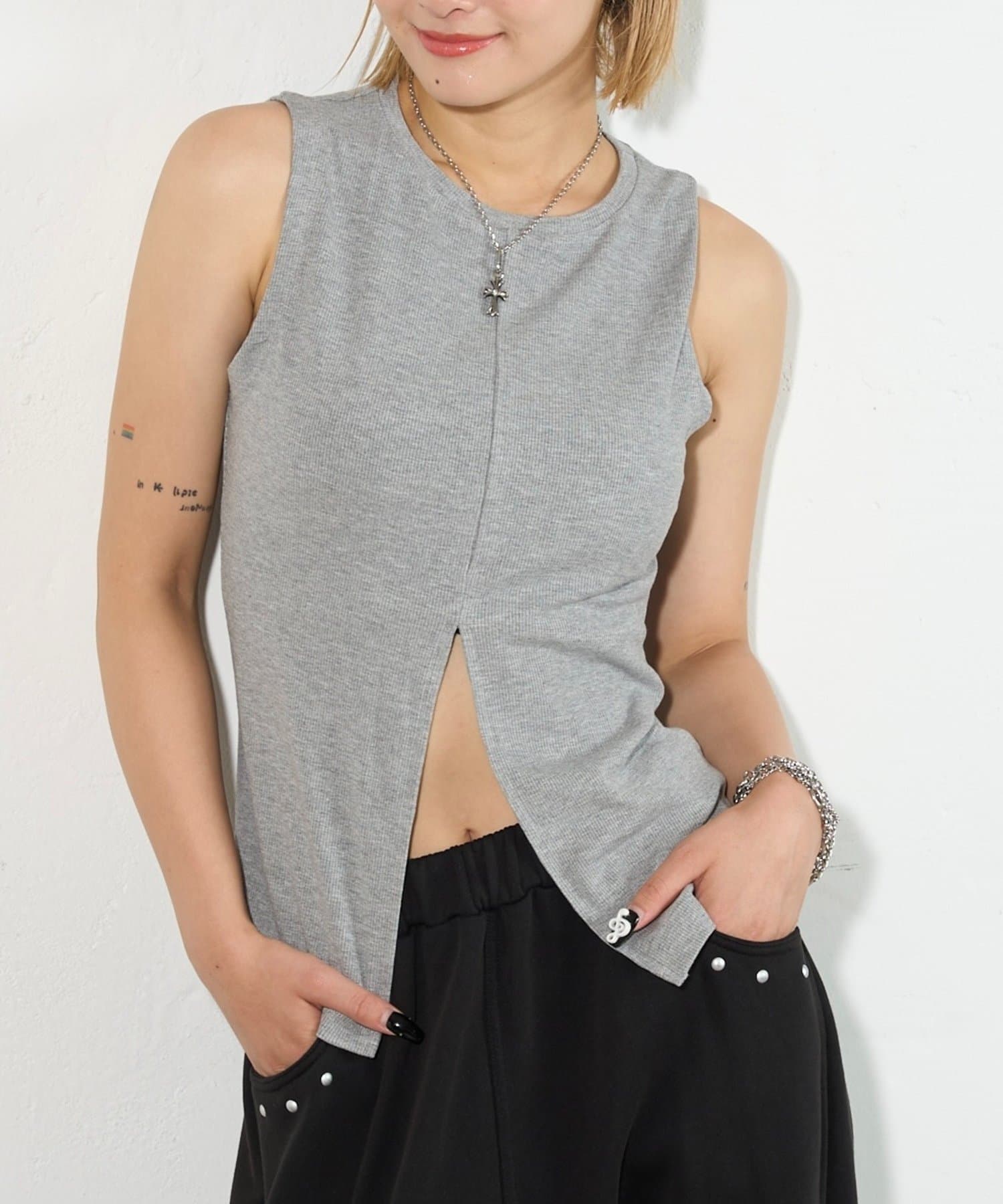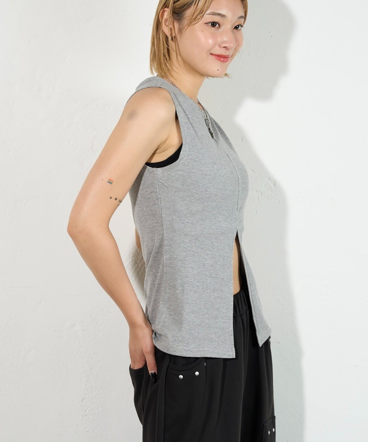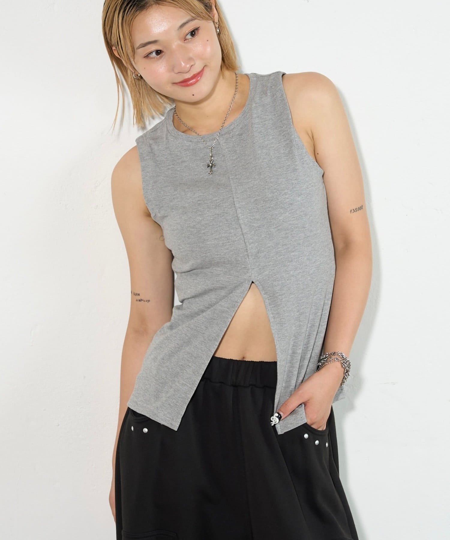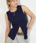 ・定番のリブ素材にトレンドのスリットデザインをプラスした、着回し力抜群のノースリーブトップス。
