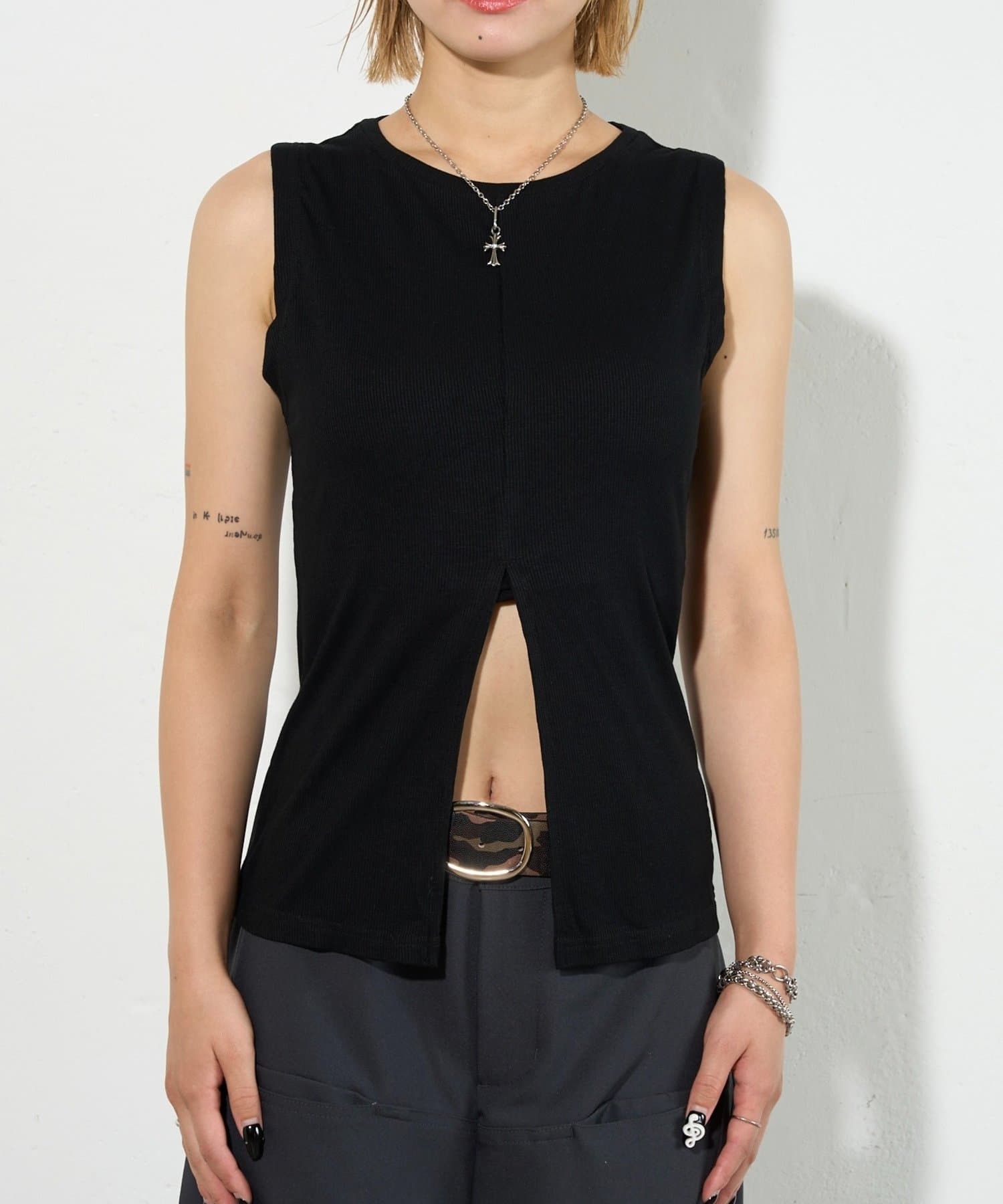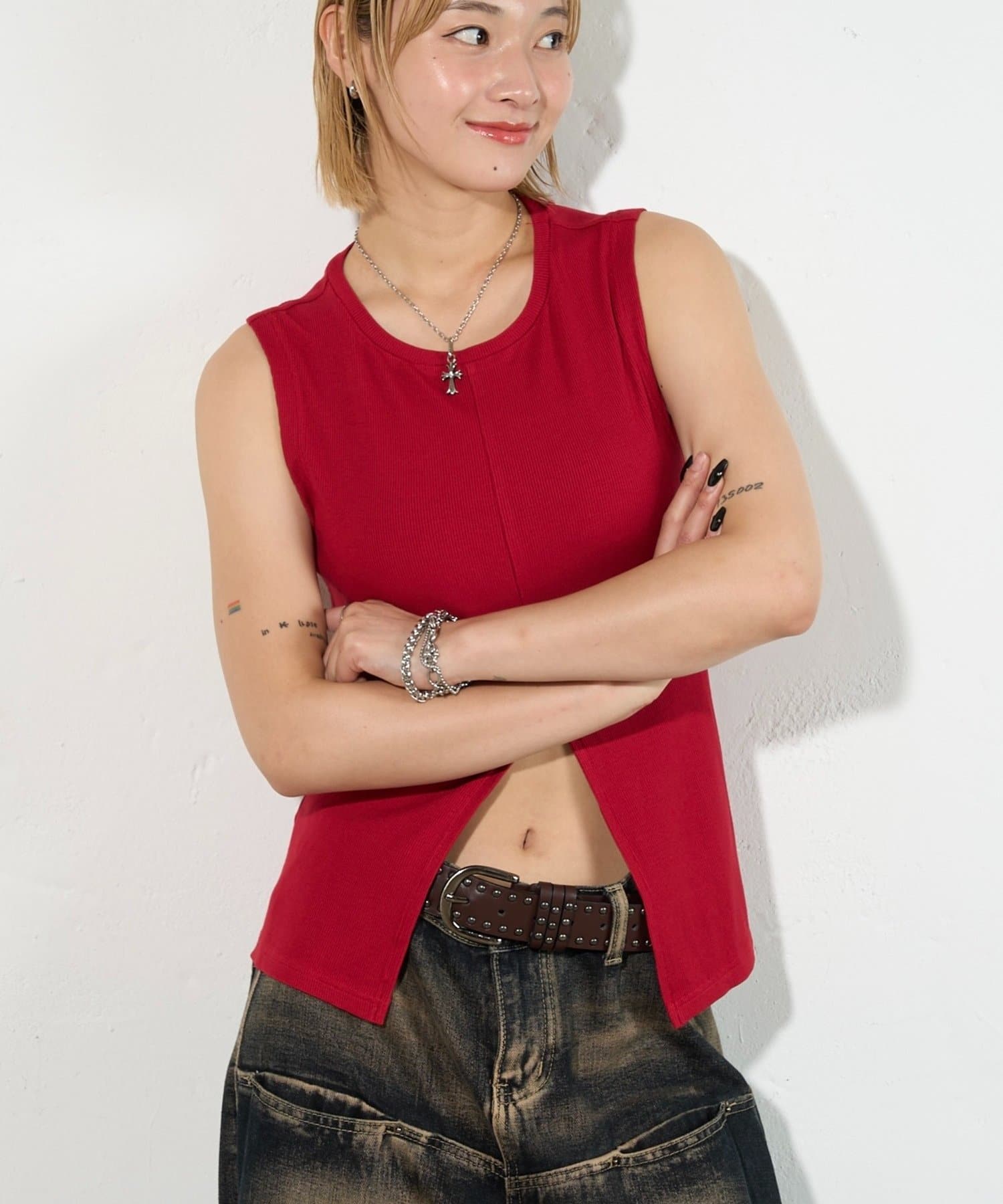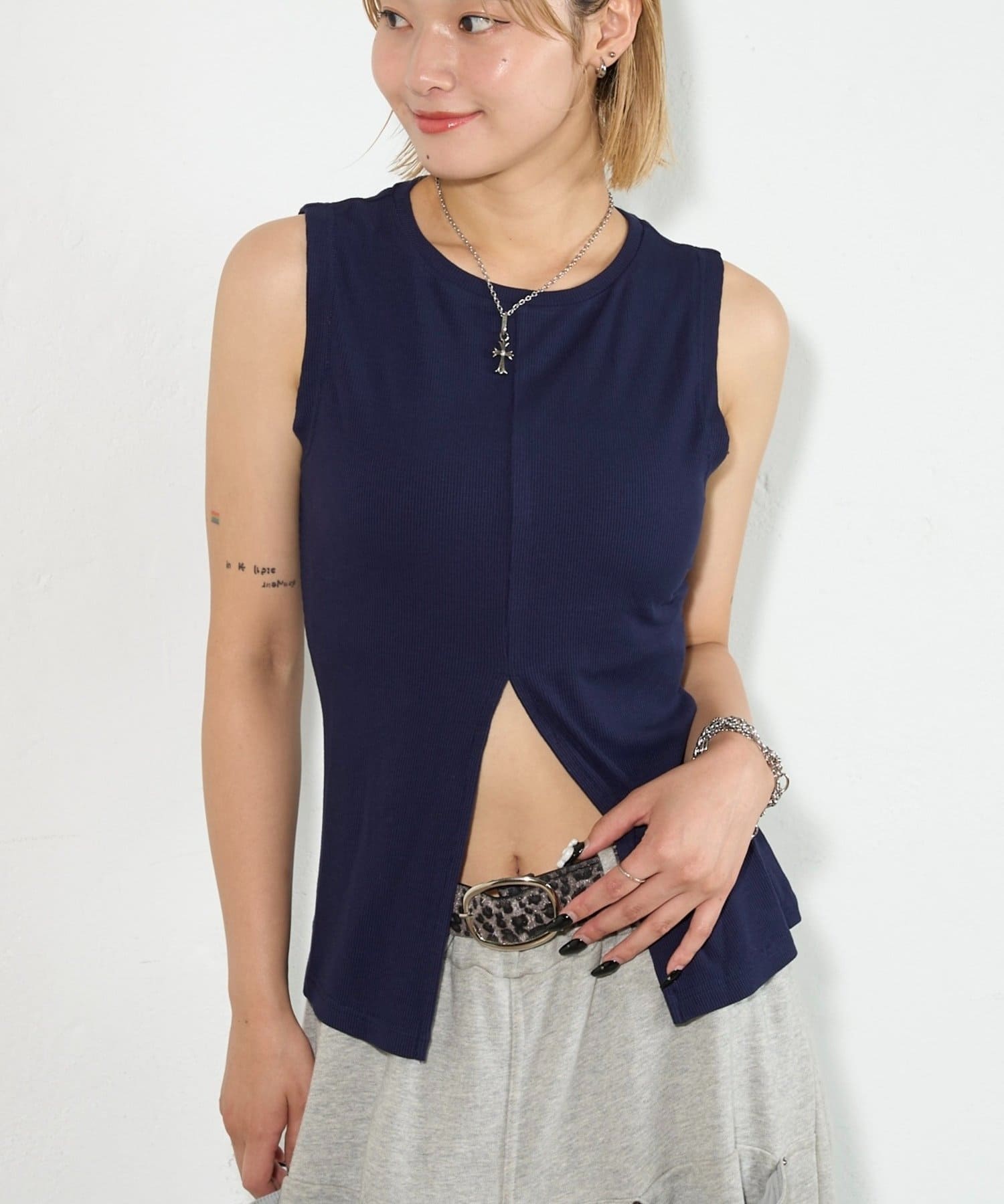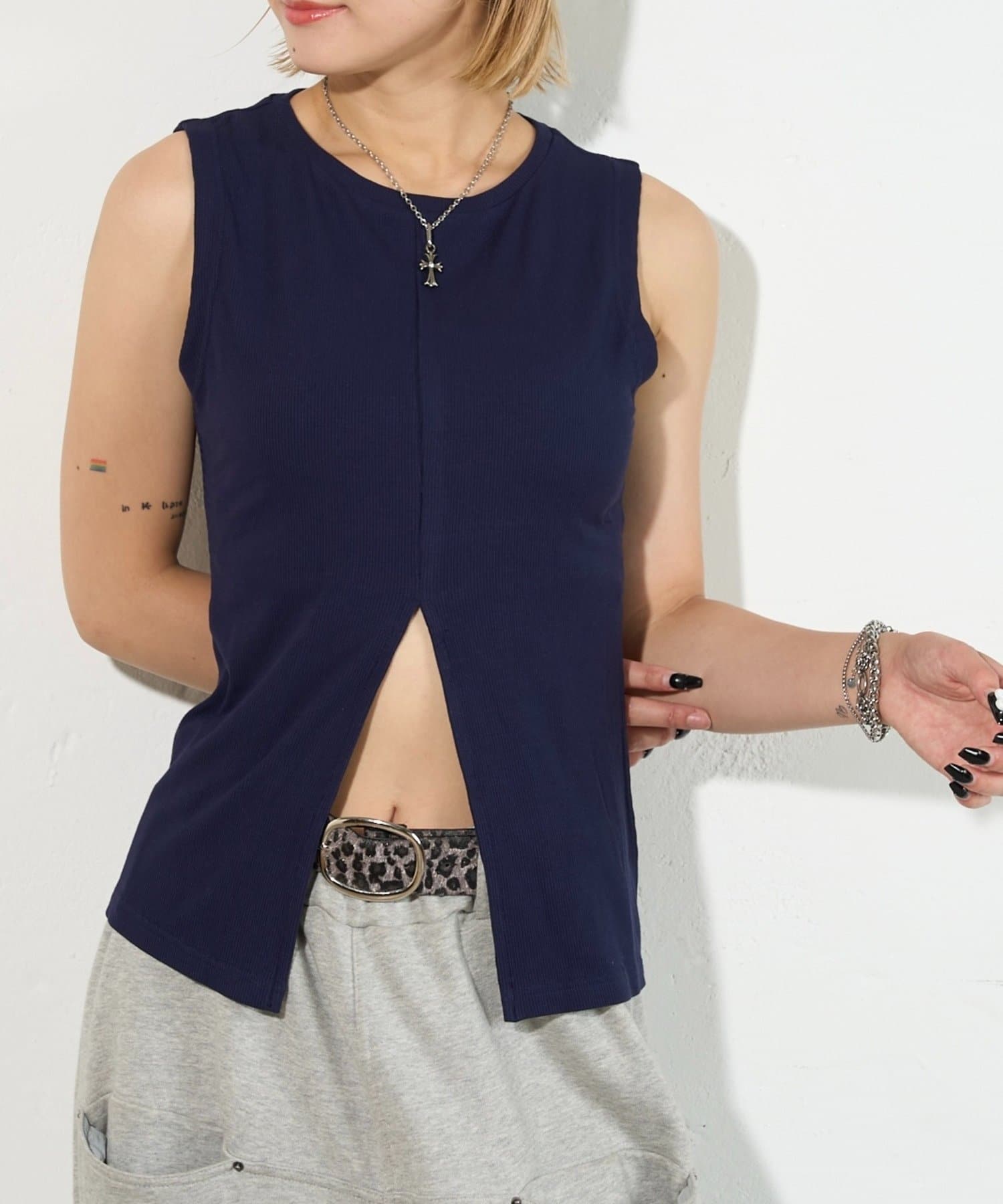 ・定番のリブ素材にトレンドのスリットデザインをプラスした、着回し力抜群のノースリーブトップス。