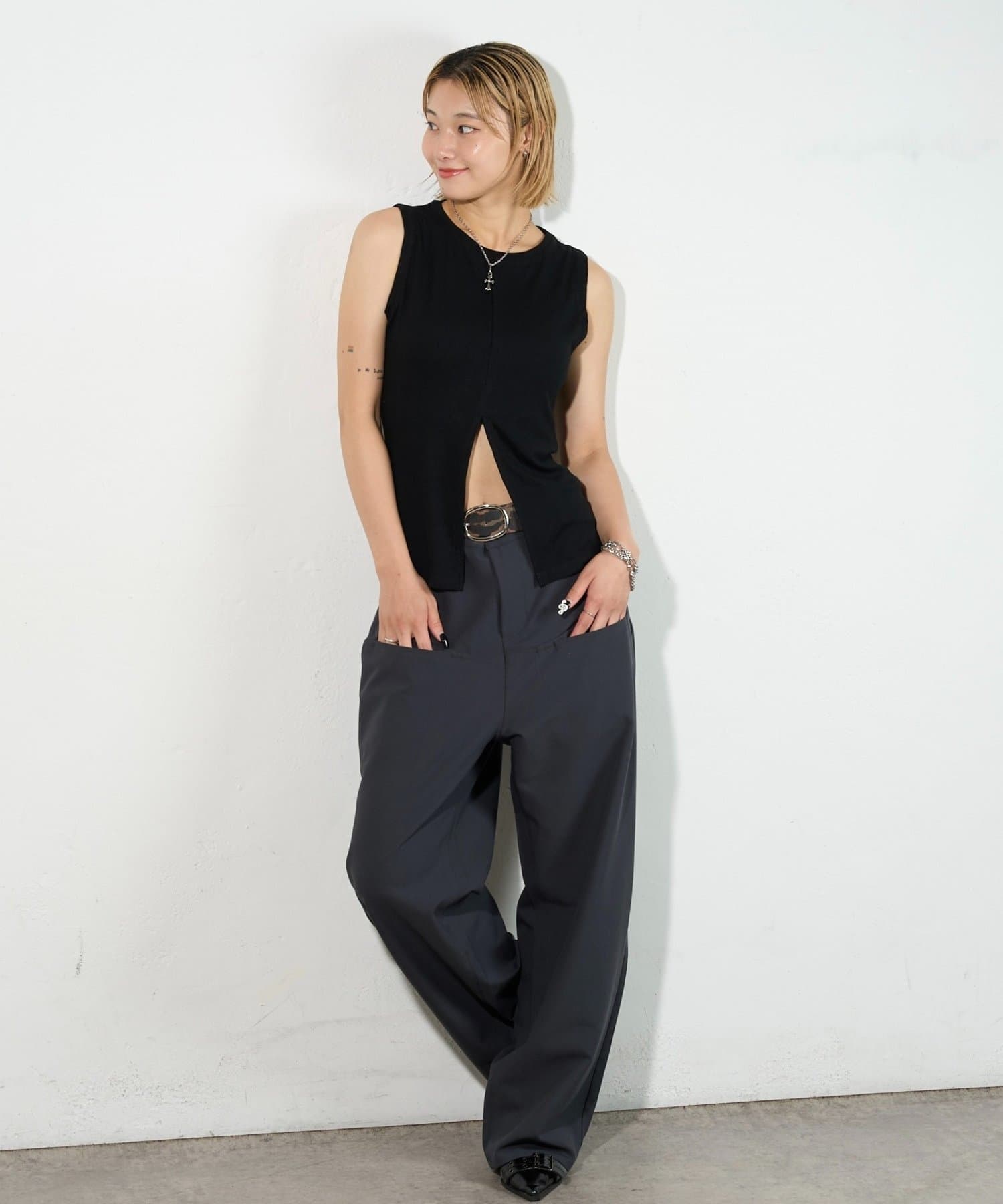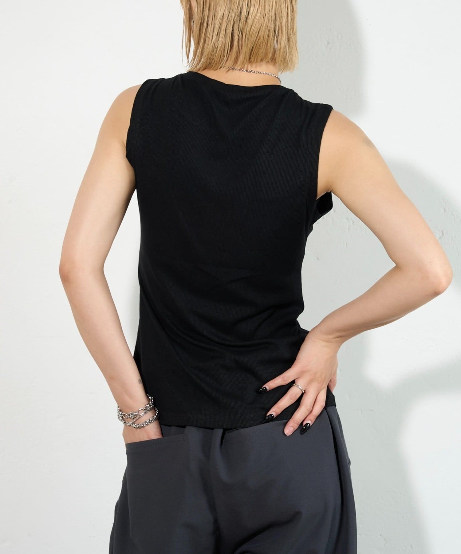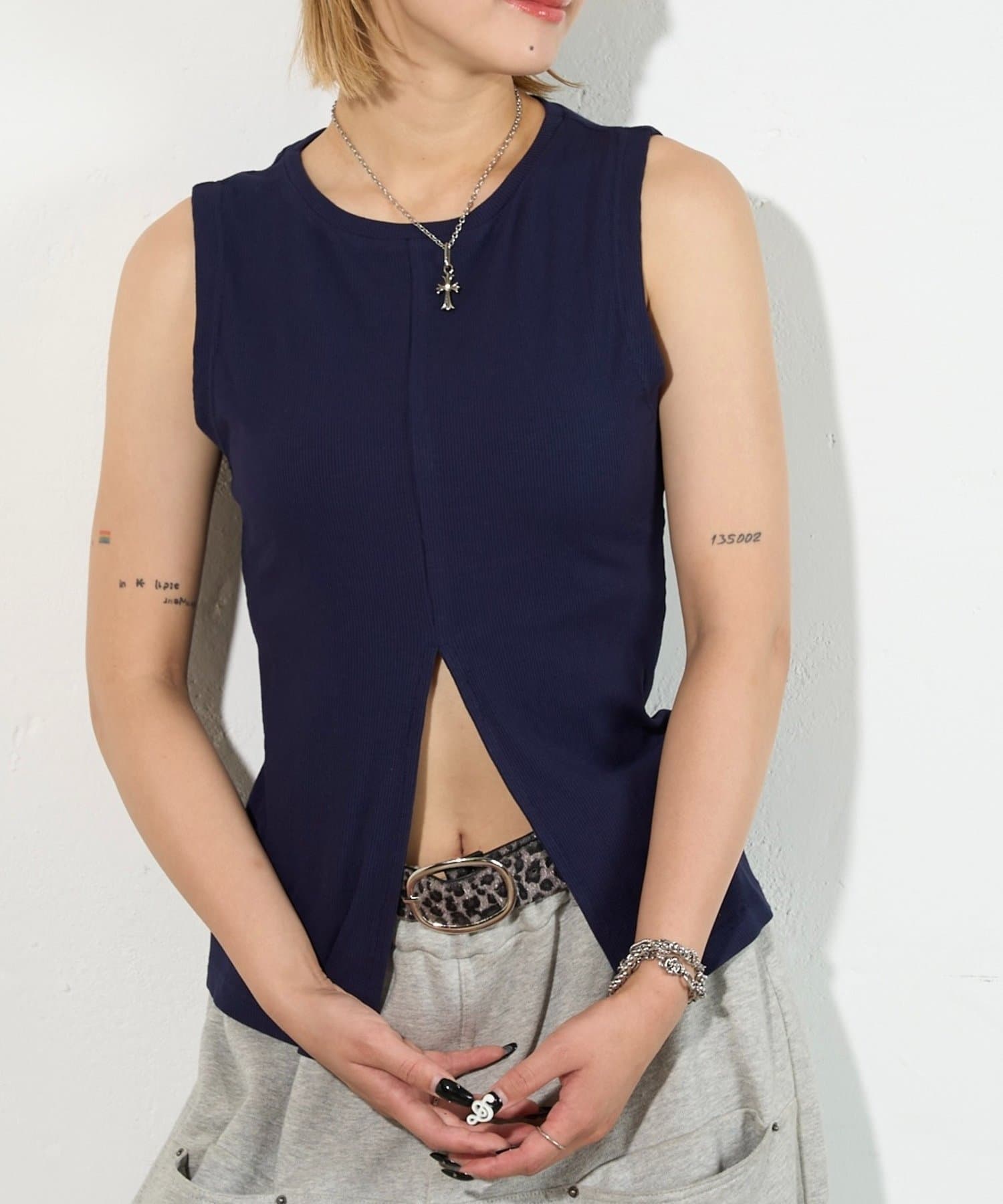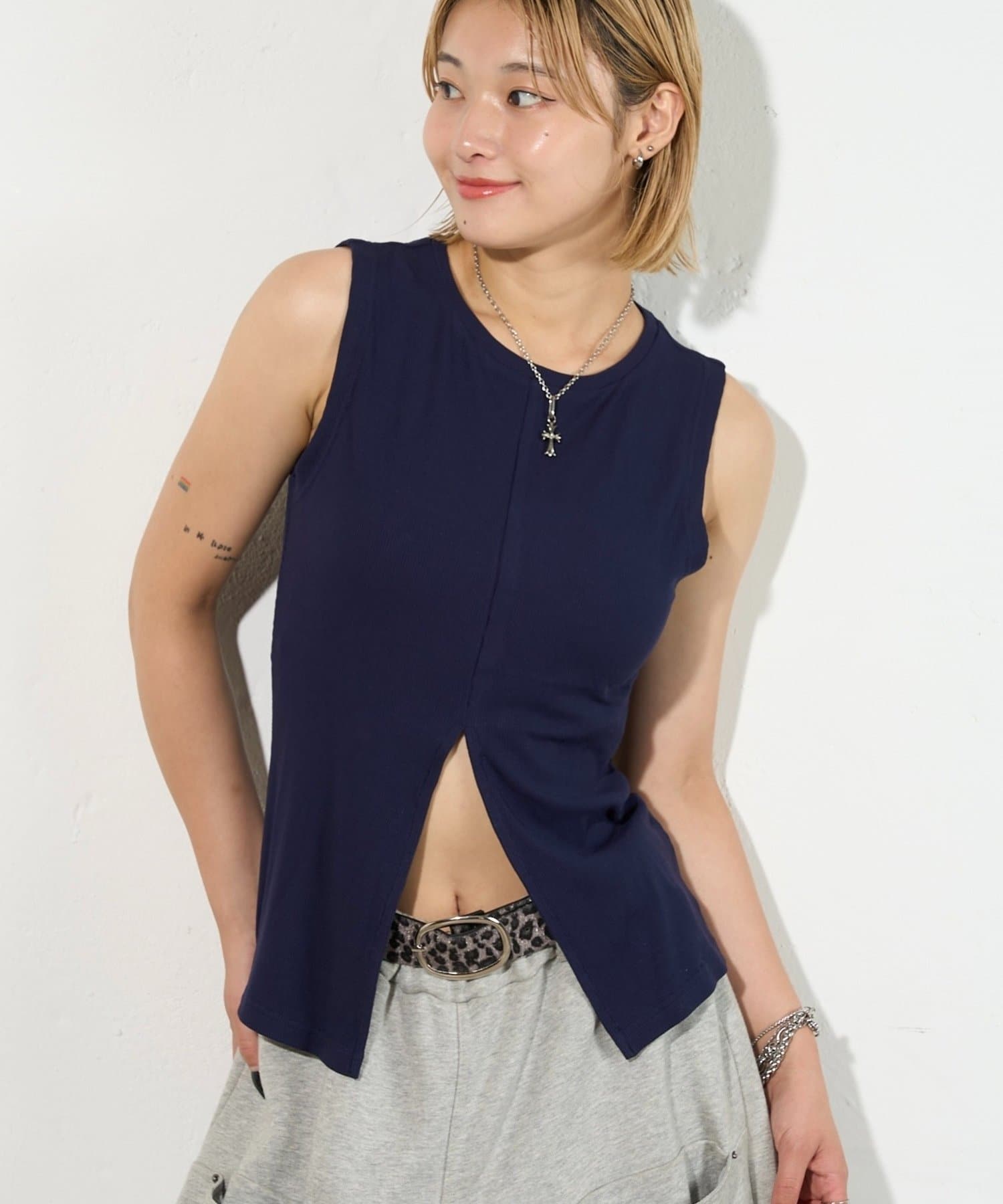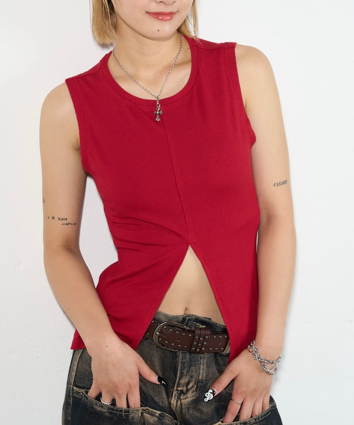 ・定番のリブ素材にトレンドのスリットデザインをプラスした、着回し力抜群のノースリーブトップス。