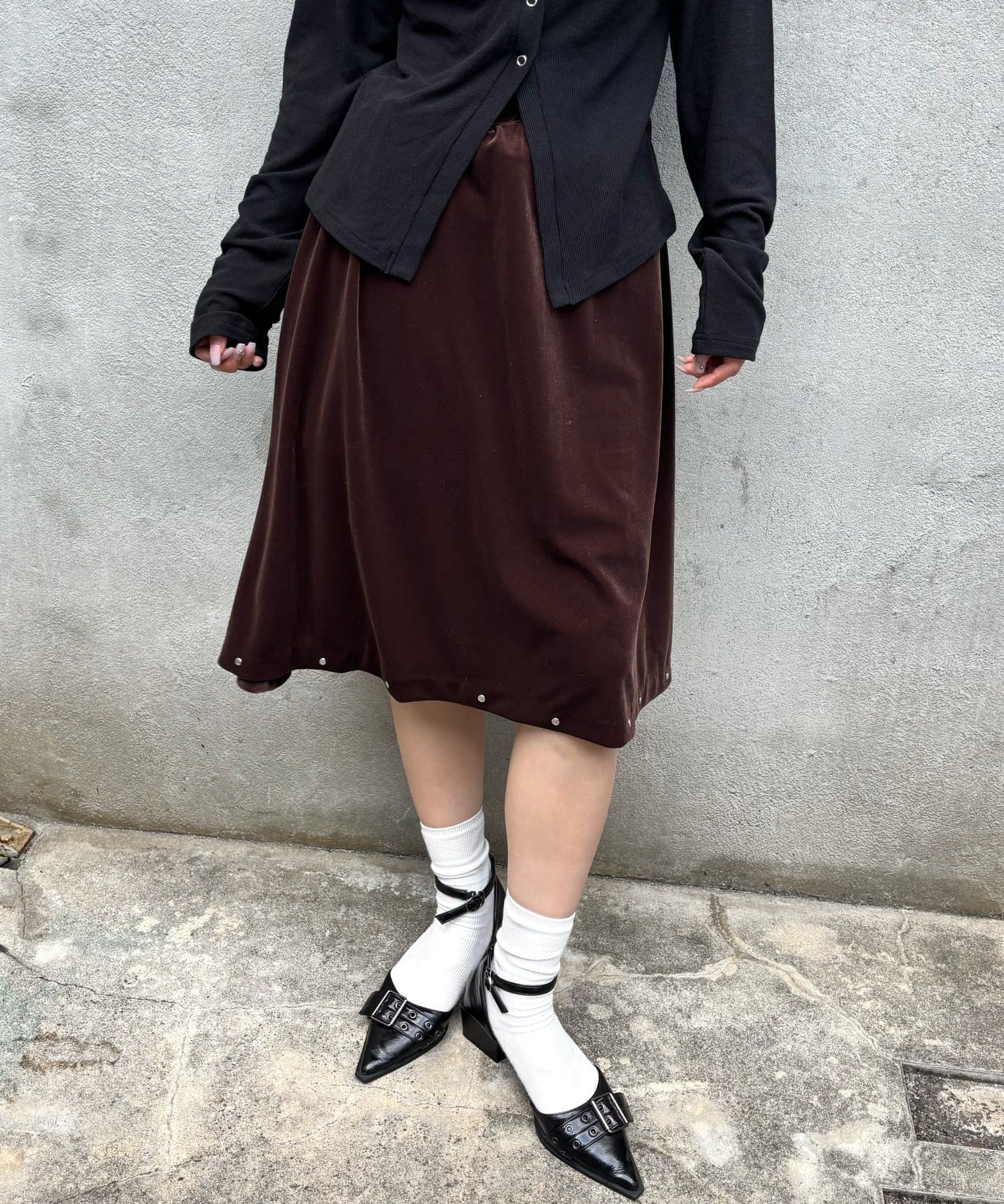 上品な光沢とさりげないスタッズが魅力。大人のためのベロアスカート