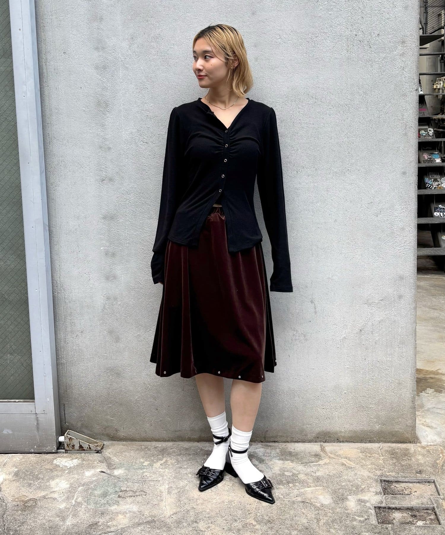 ・なめらかで上品な光沢を放つベロア素材を使用したミドルスカート。