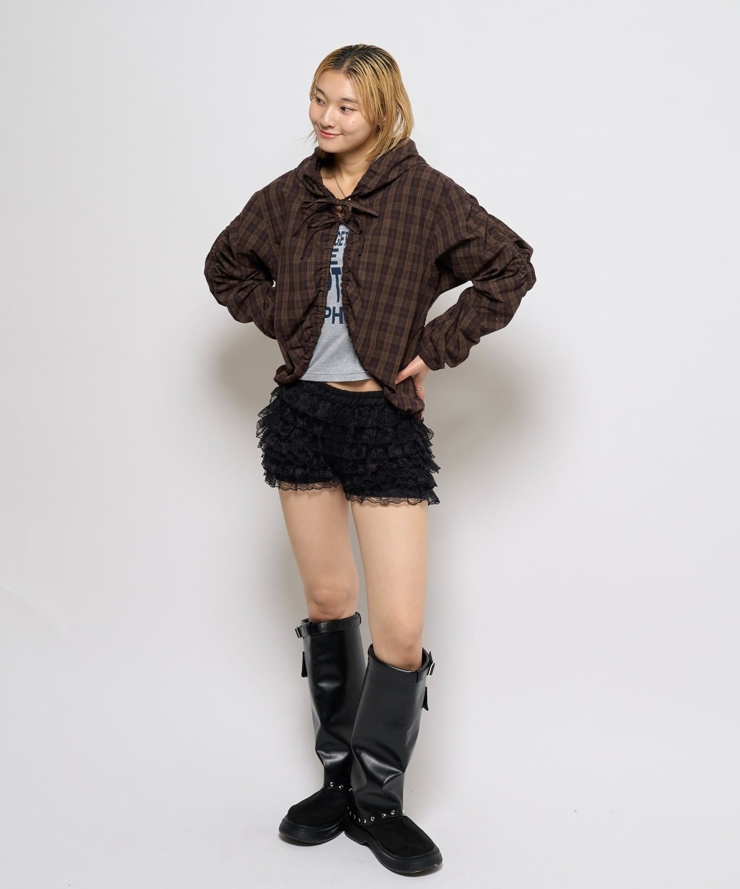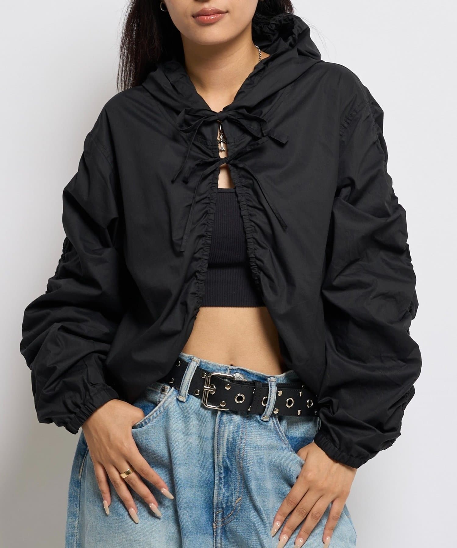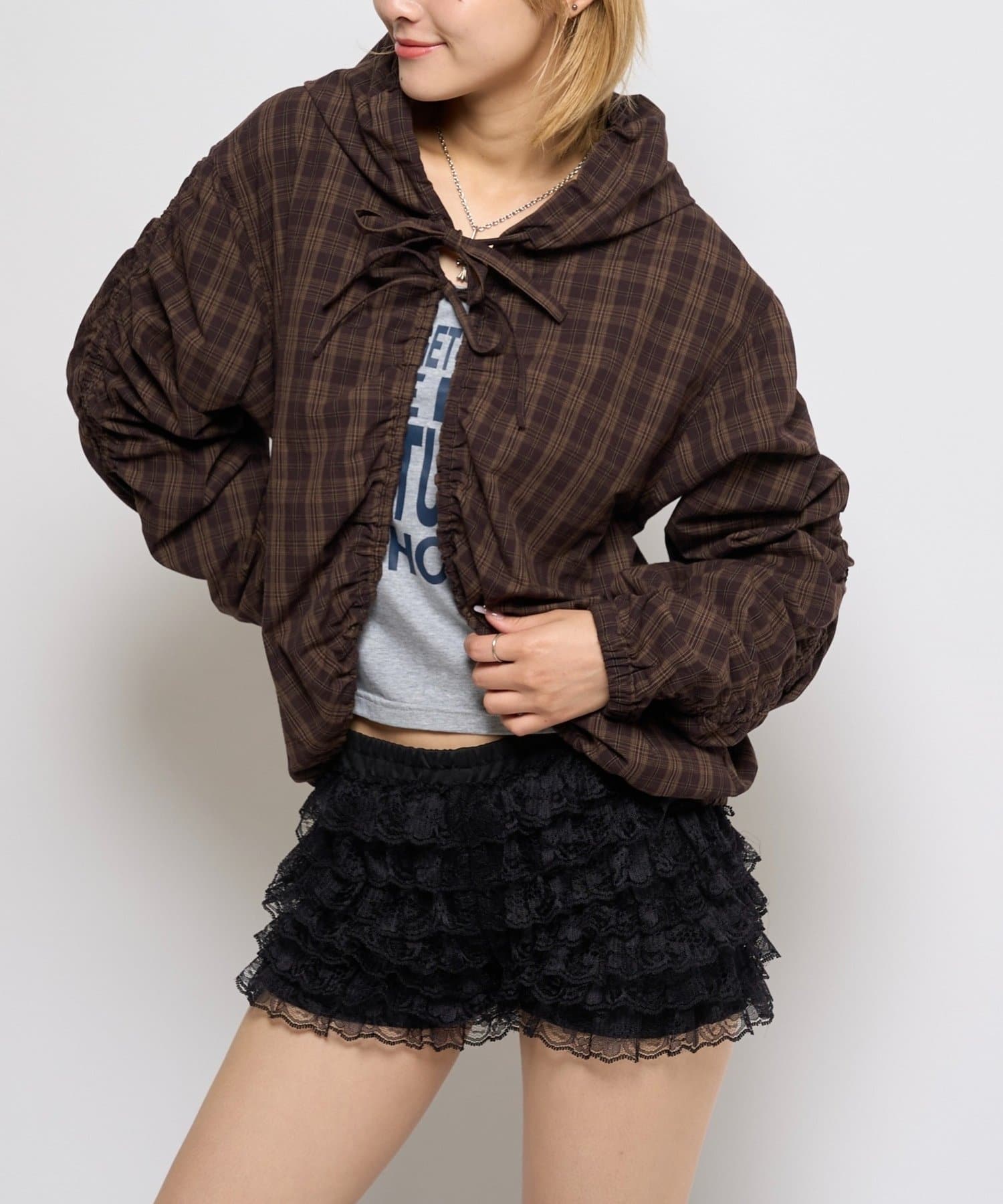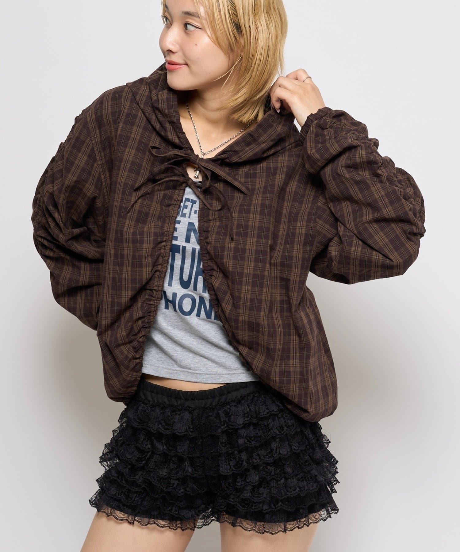 カジュアルにもキレイめにも着れる!ギャザーがポイントのフードシャツブルゾン