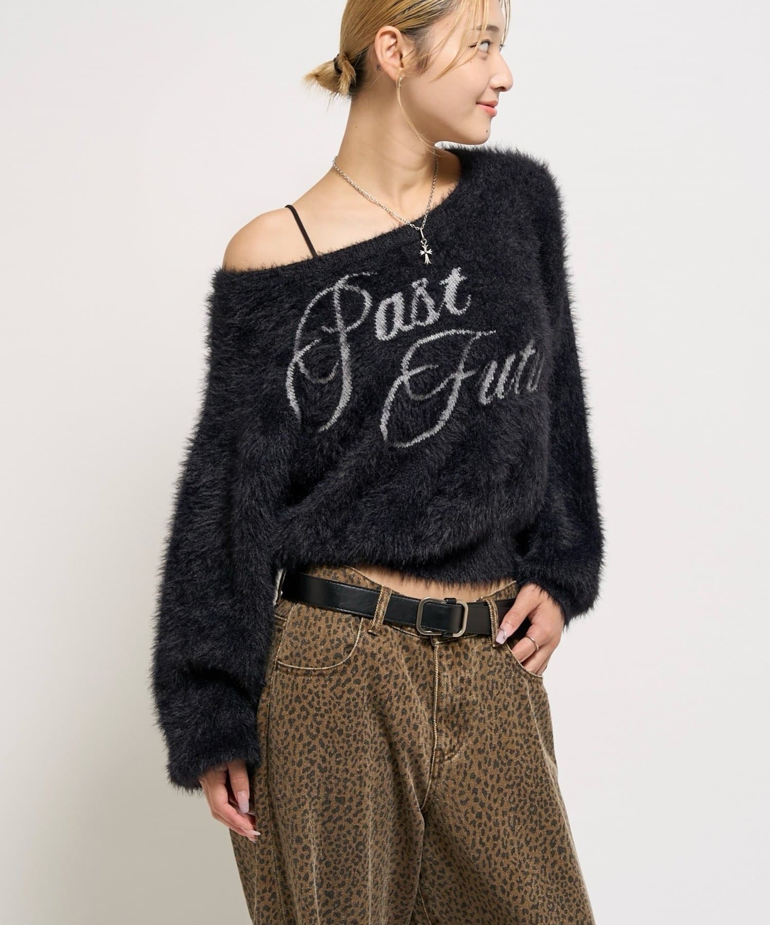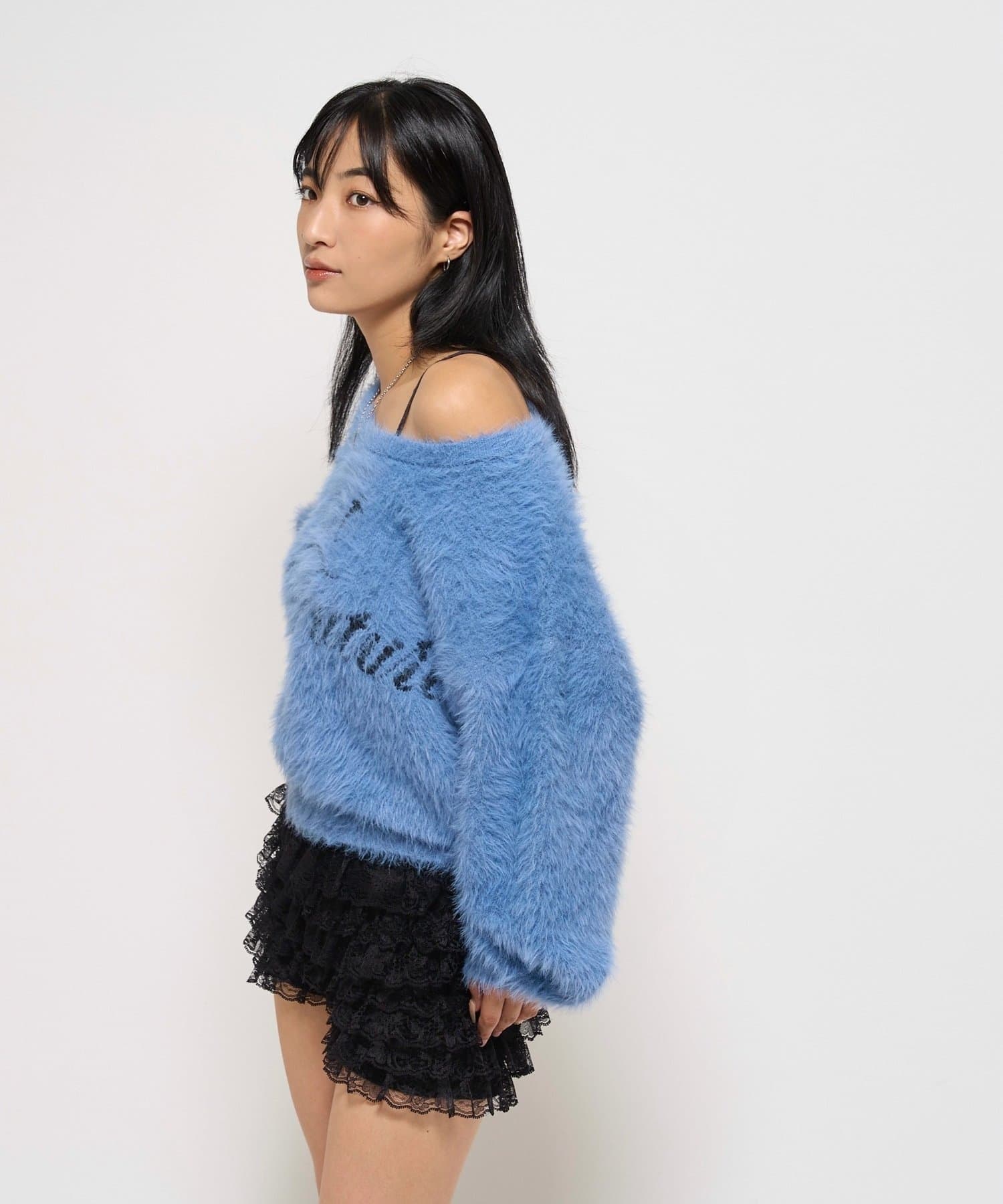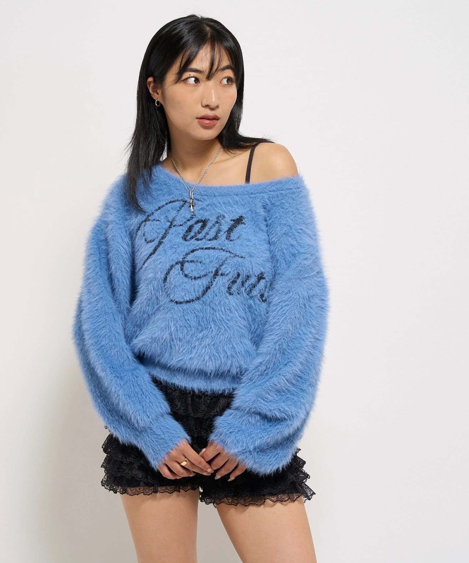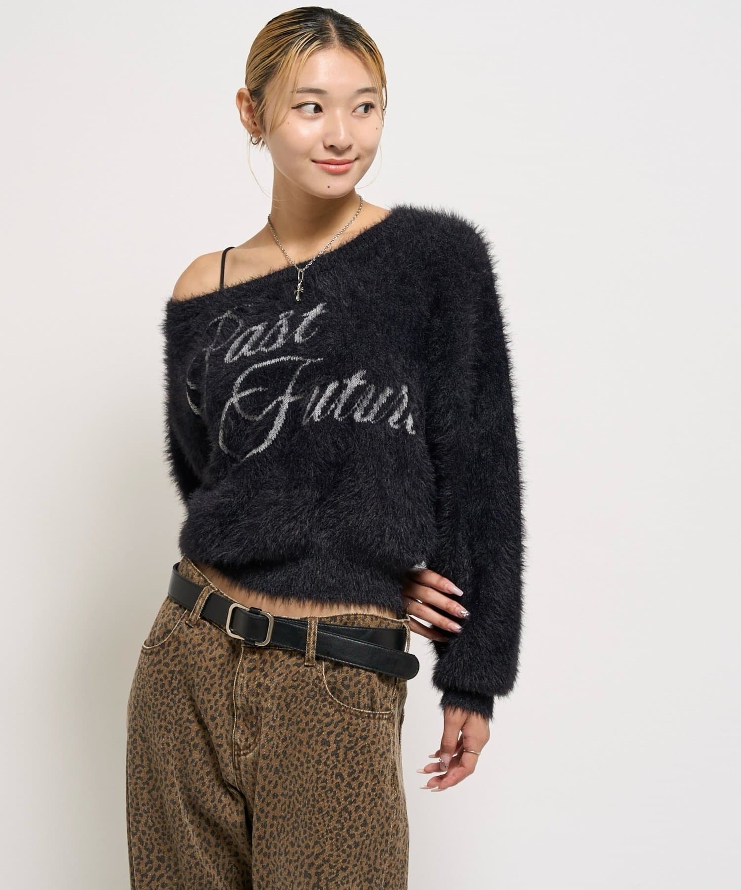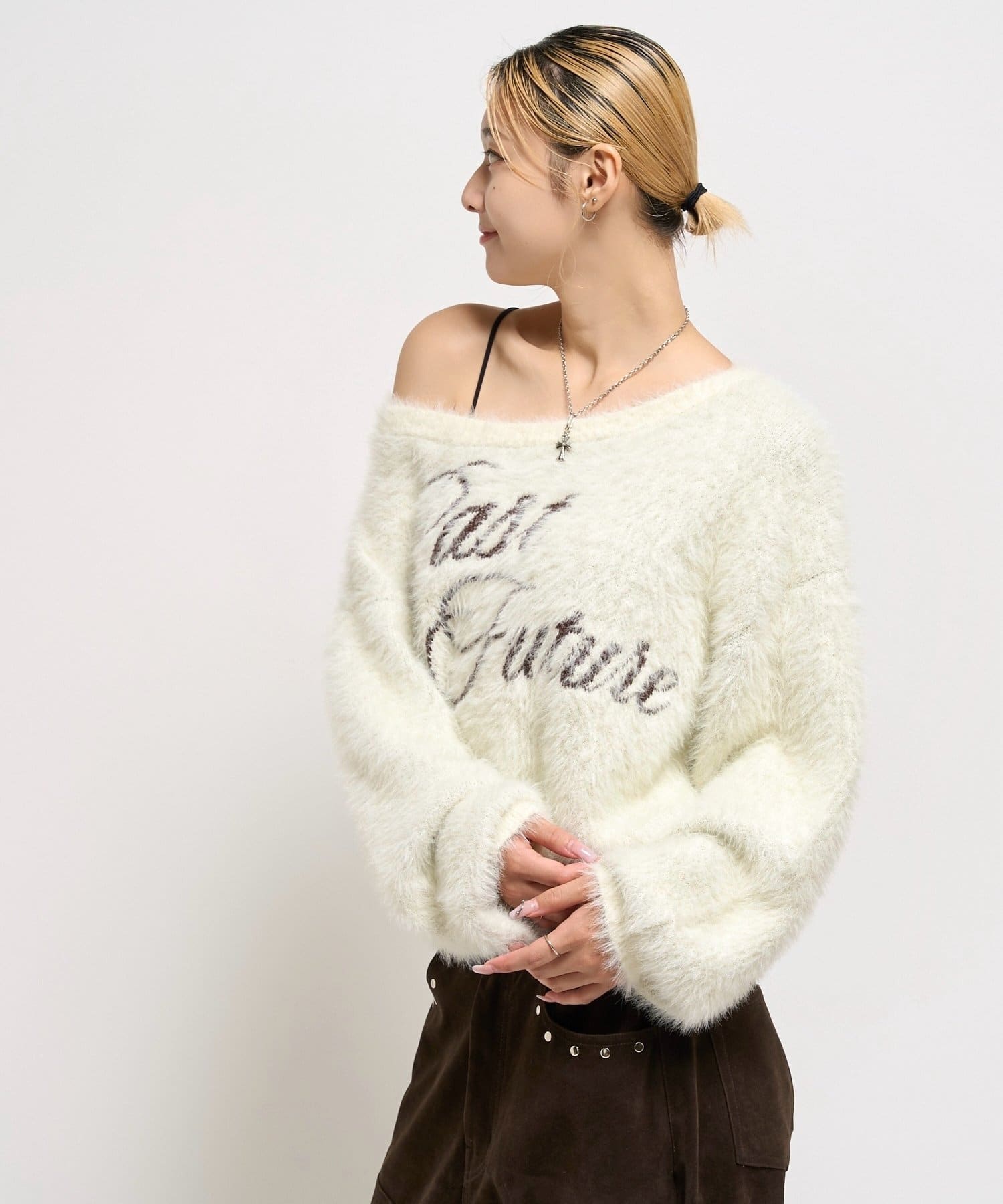 ふわふわシャギーが可愛い!秋冬活躍間違いなしの ロゴオフショルニット。