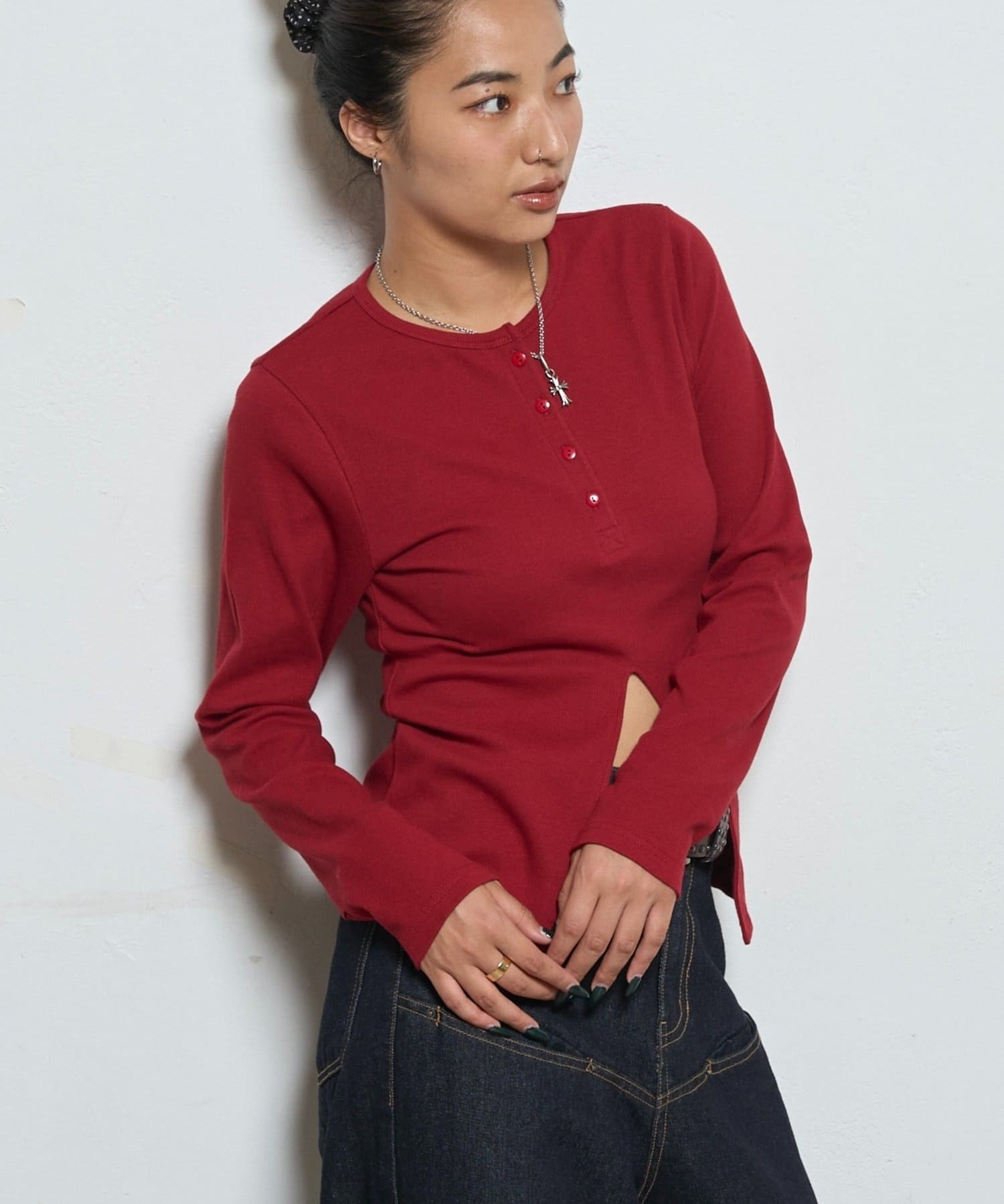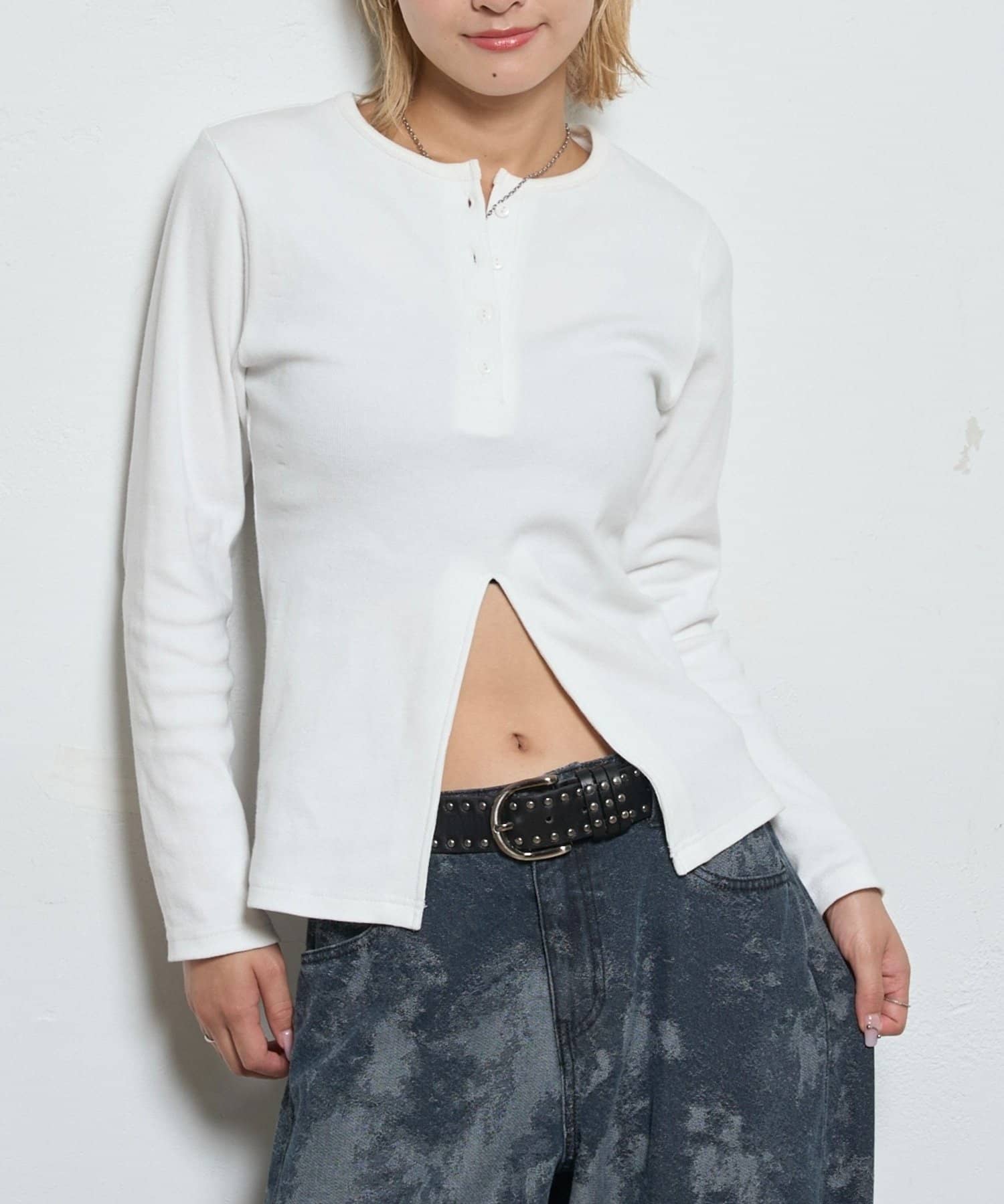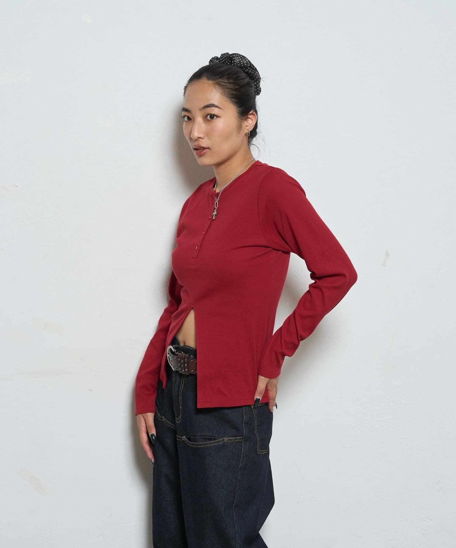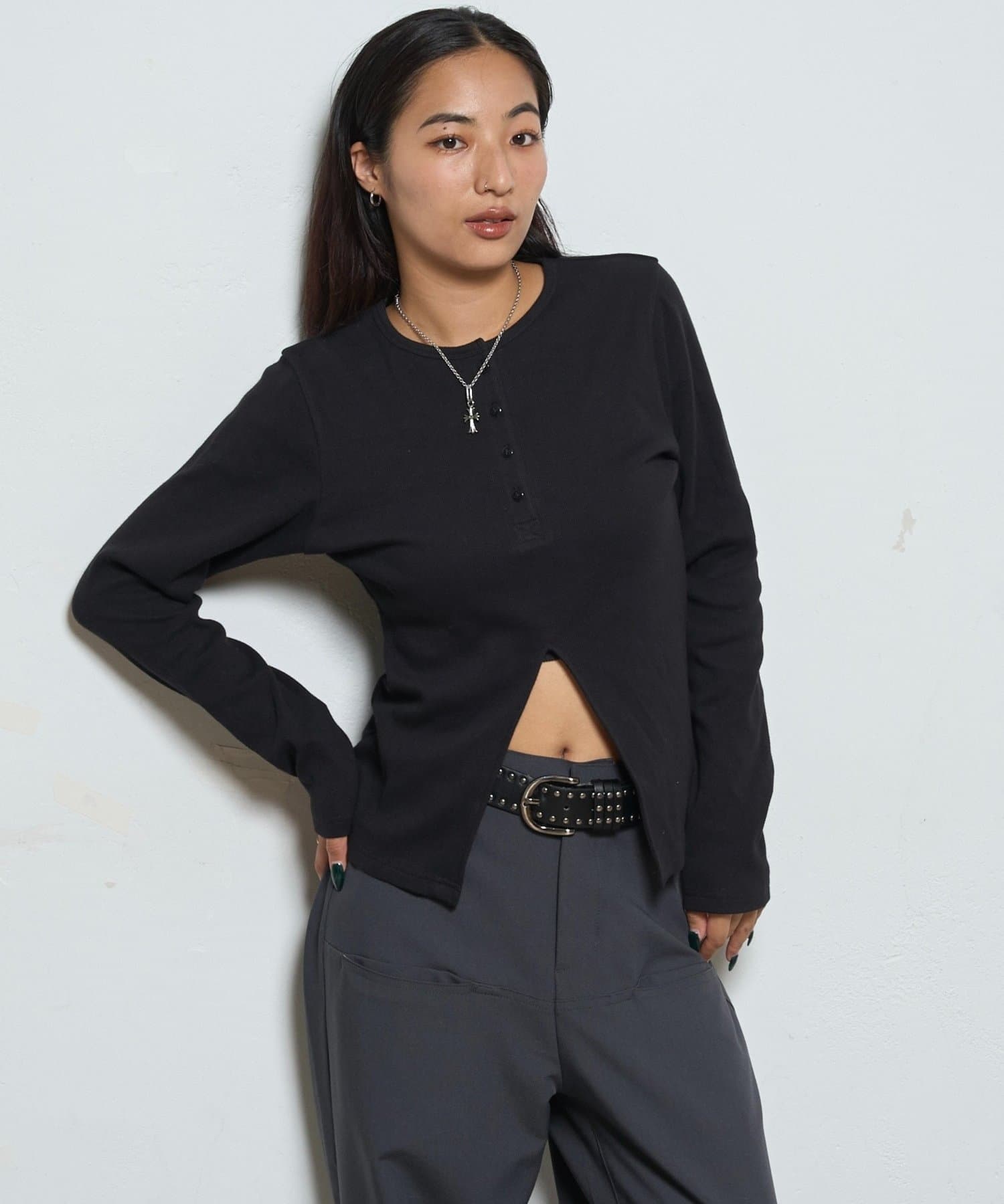 カジュアルながらも女性らしい着こなしが出来るスリットヘンリートップス。