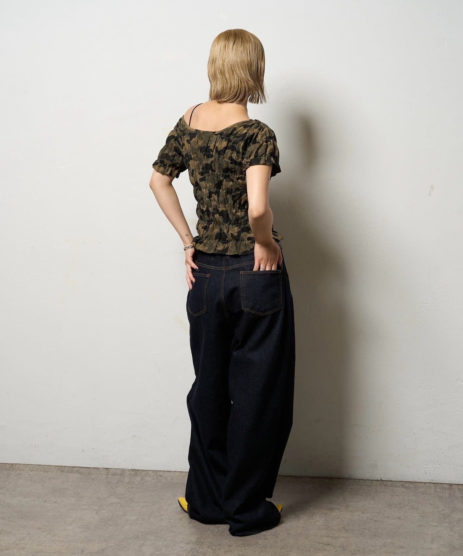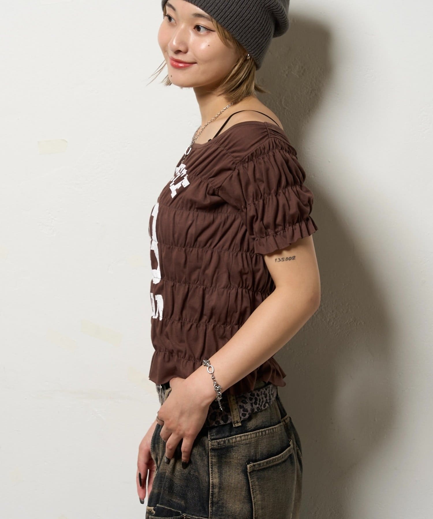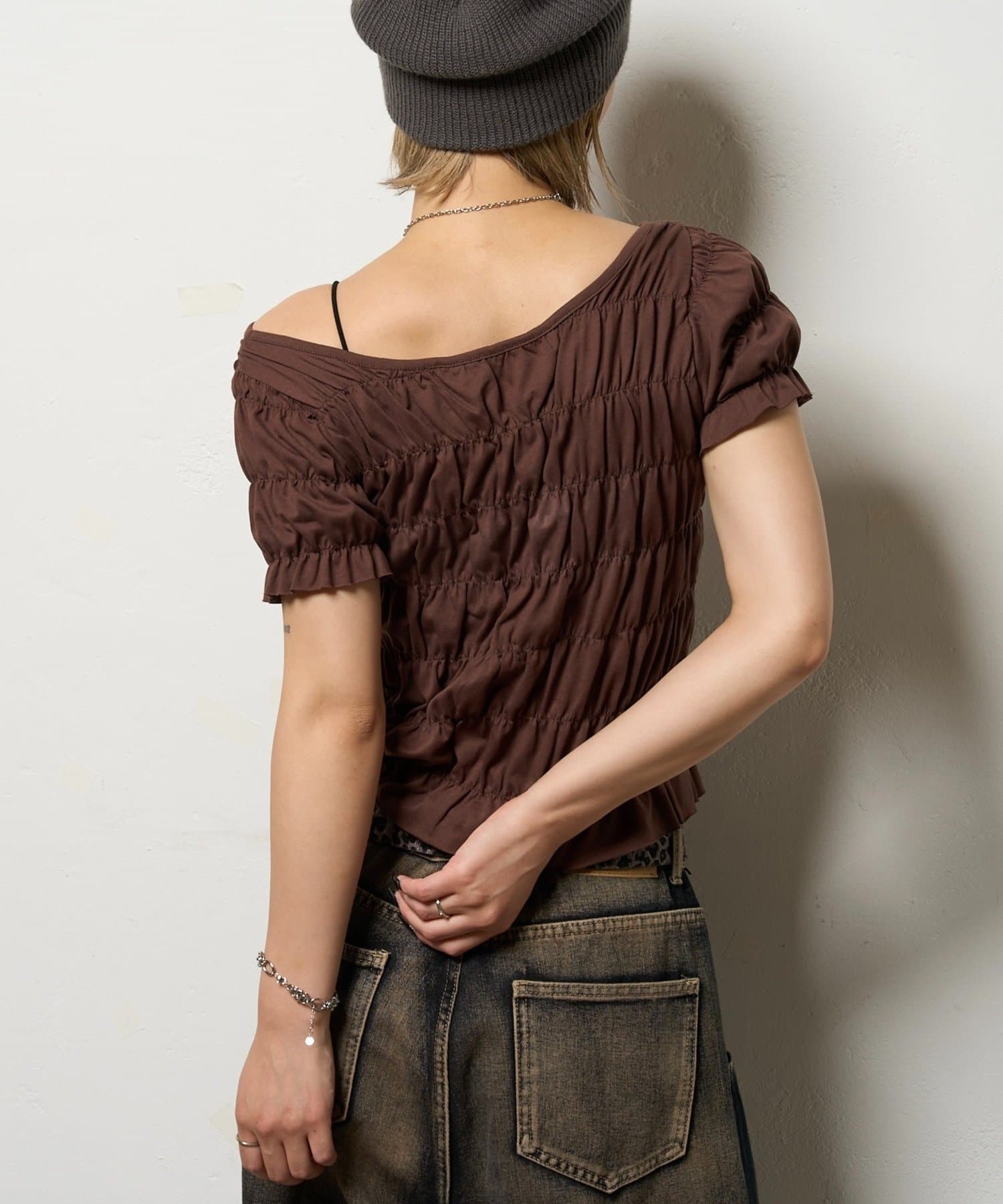 ・トレンド感のあるシャーリングが、コーディネートのアクセントに。