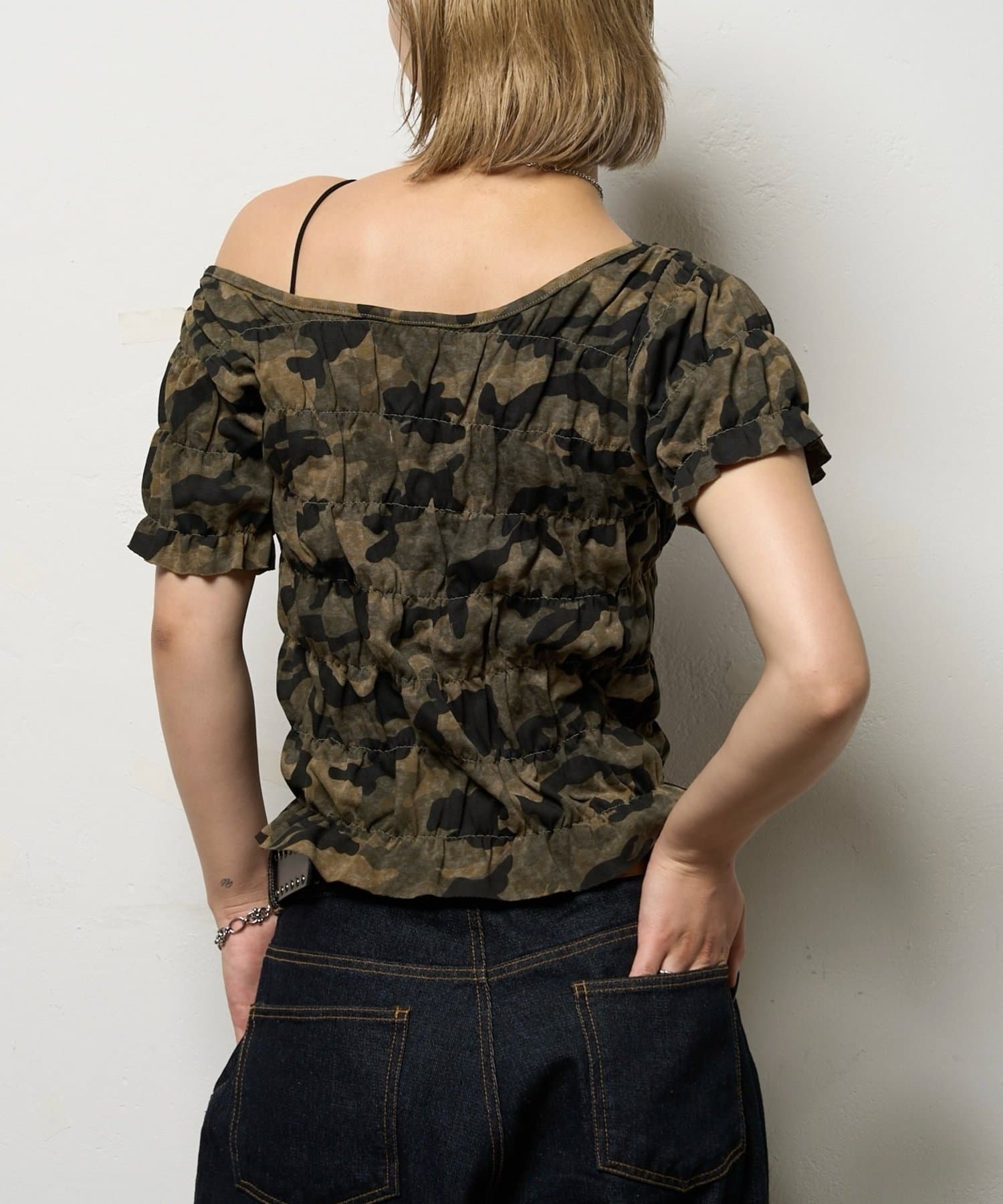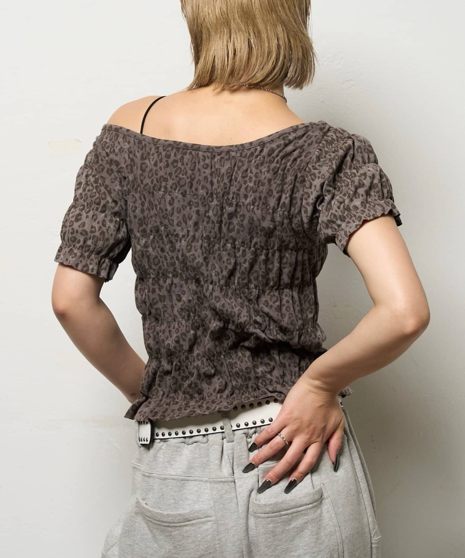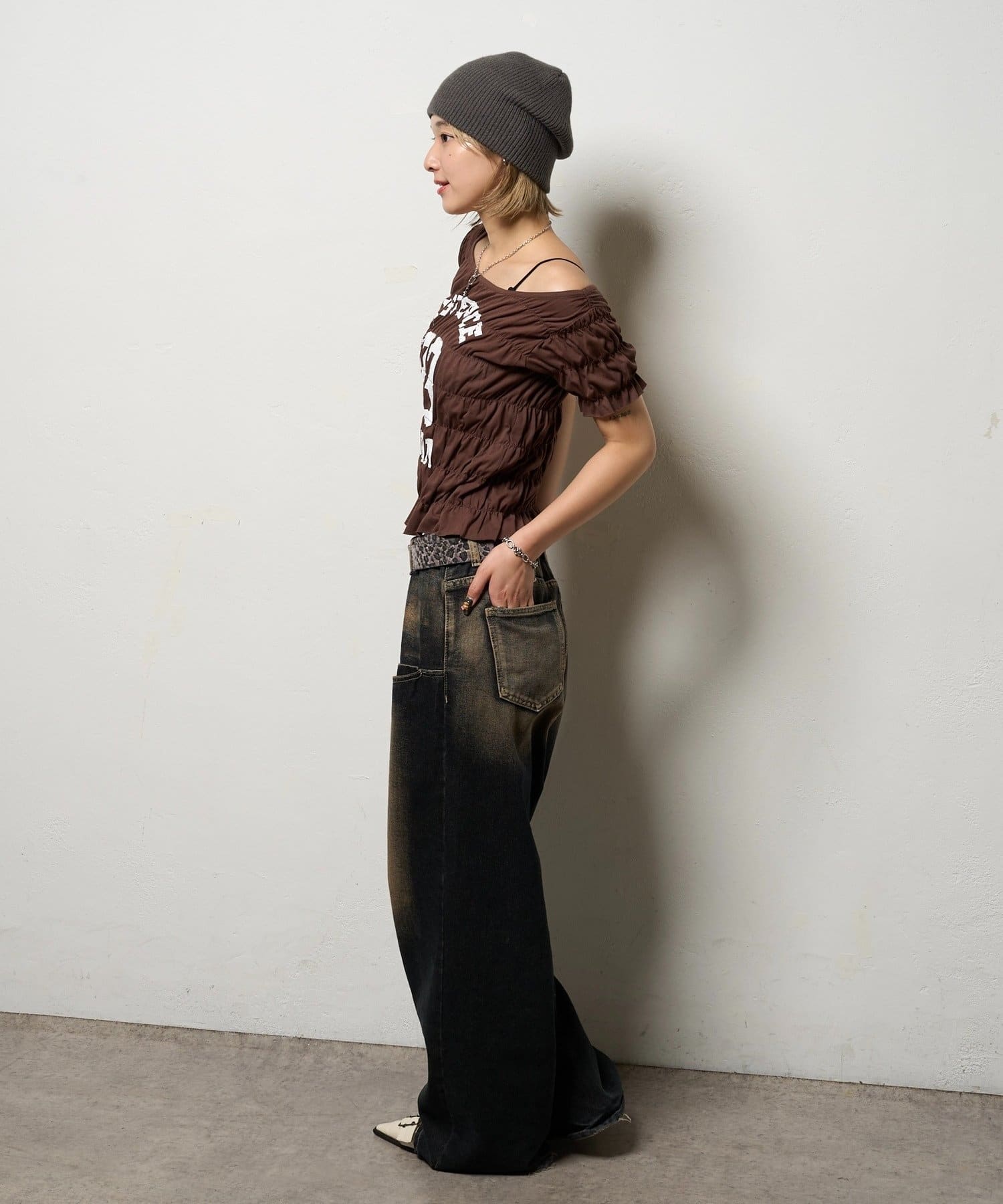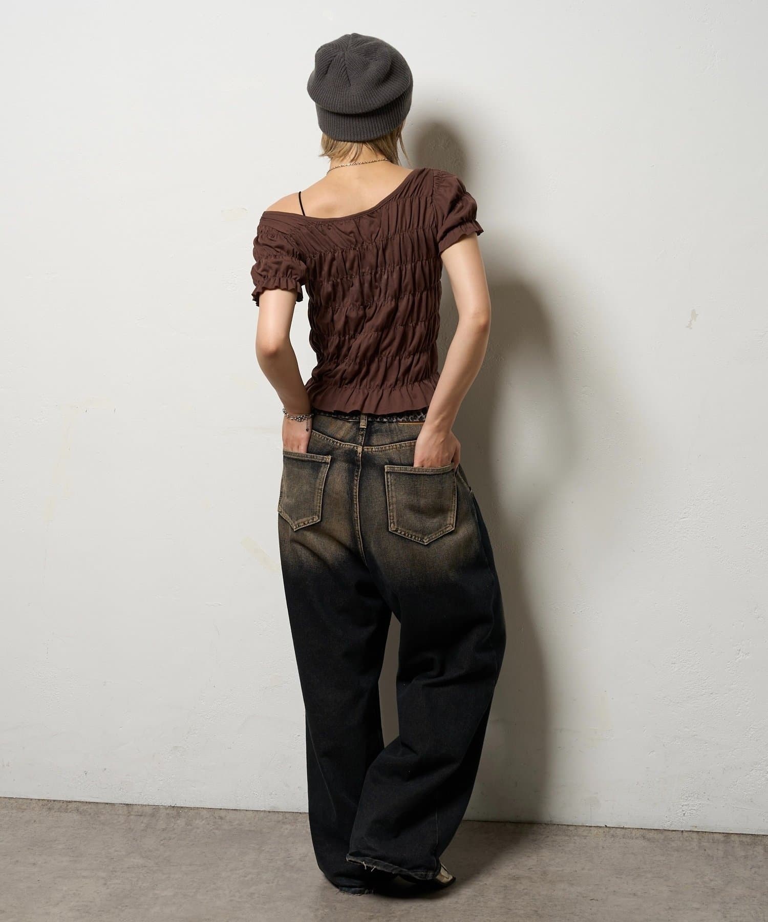 ・トレンド感のあるシャーリングが、コーディネートのアクセントに。