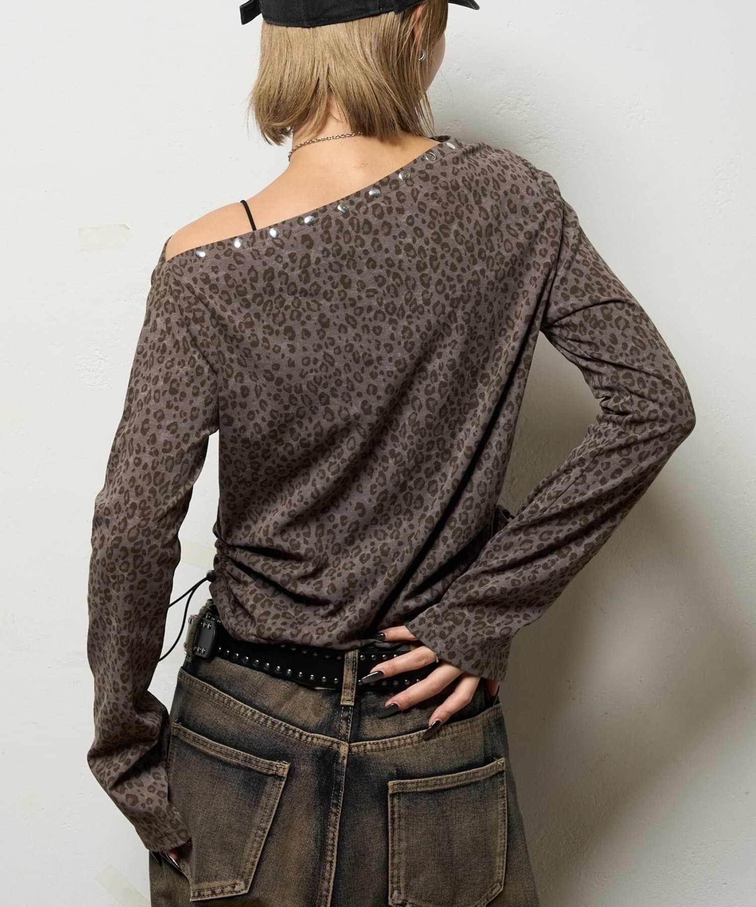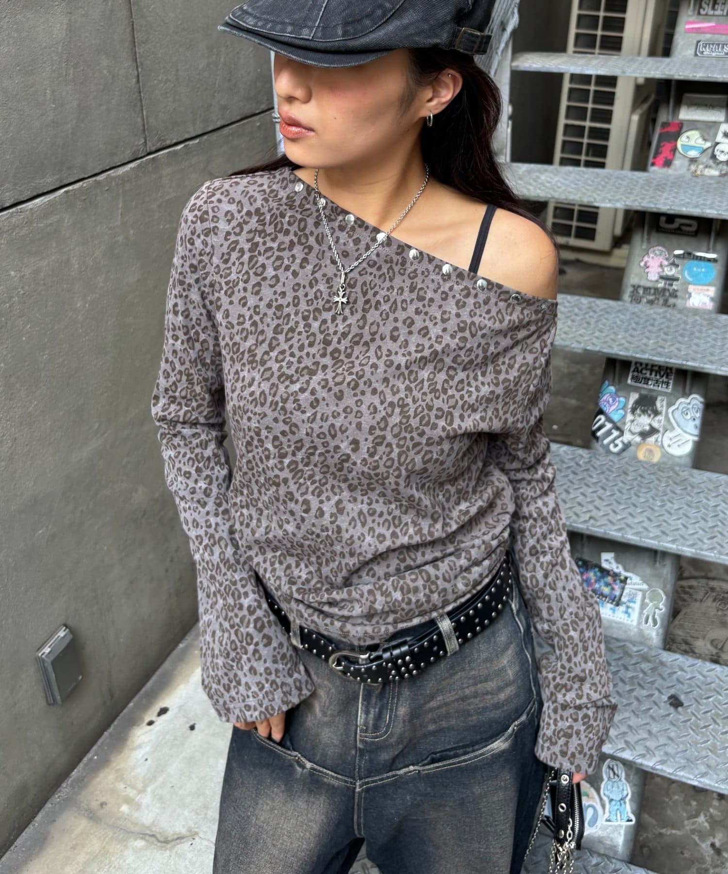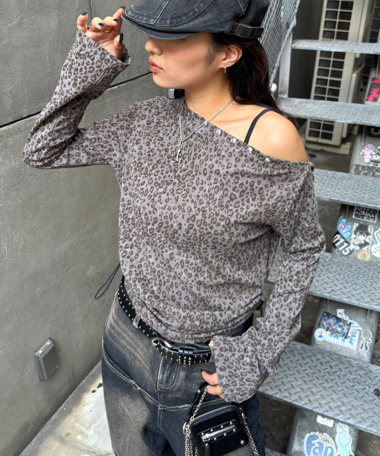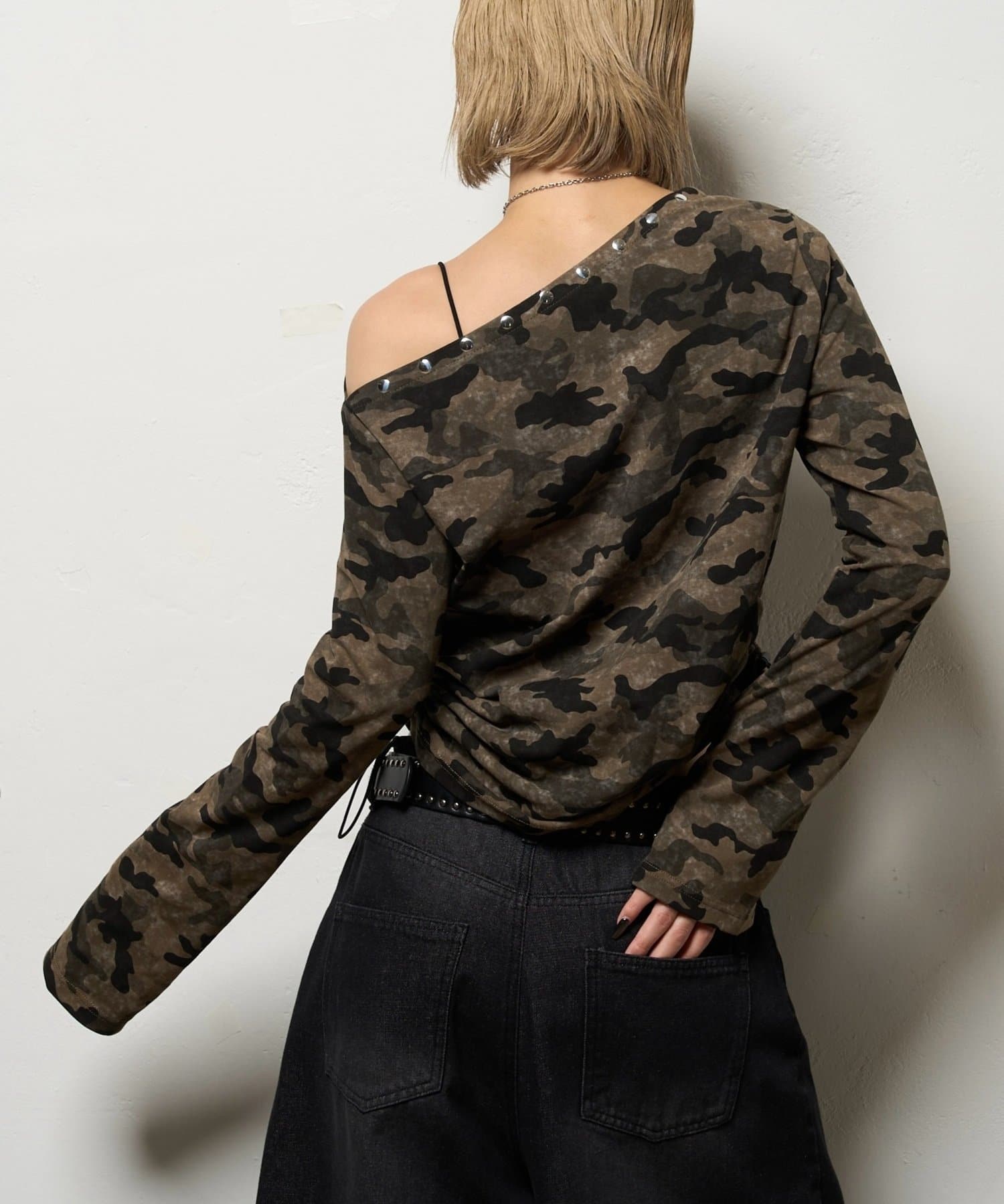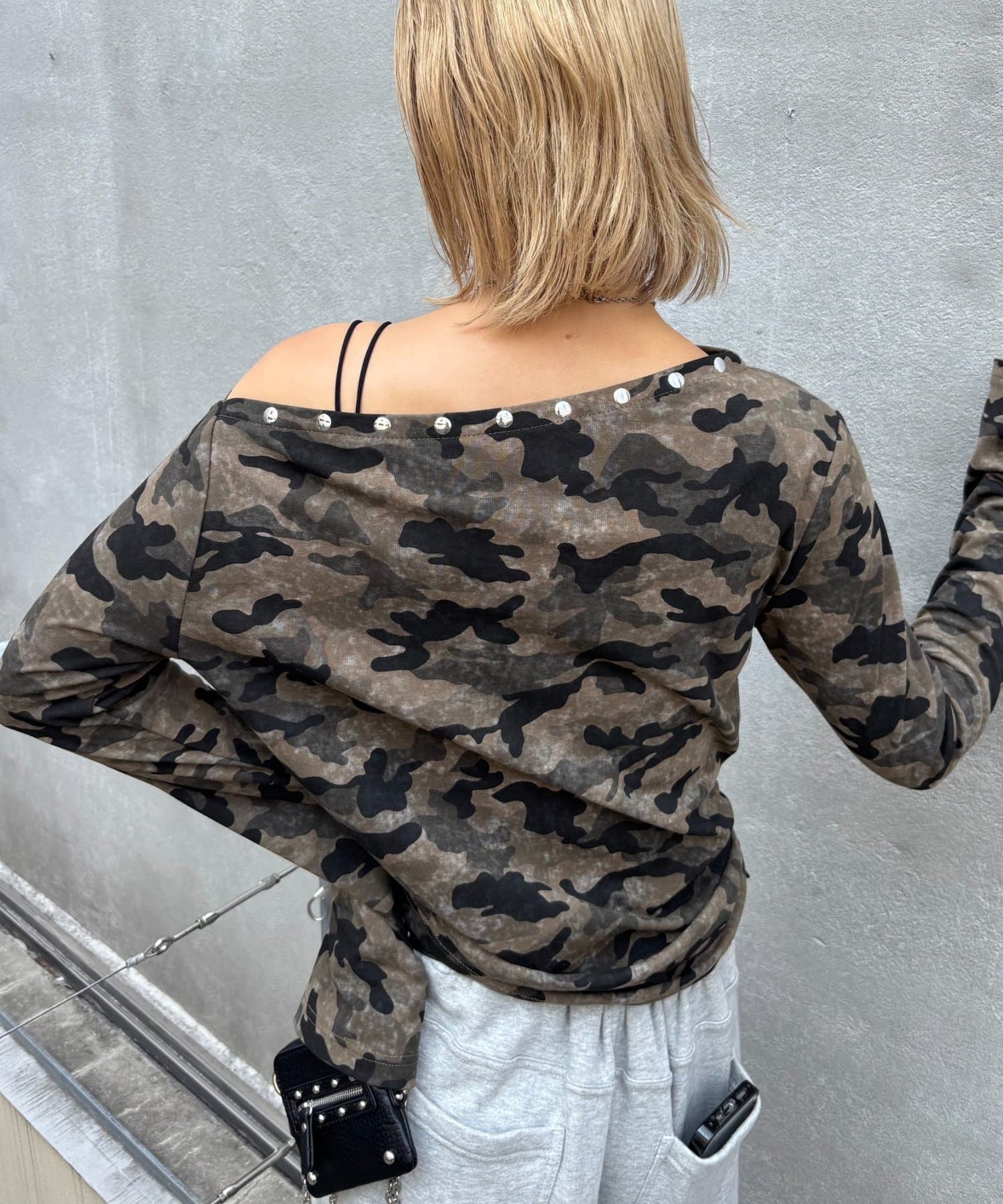 カモ柄(迷彩)、ヒョウ柄(レオパード)とトレンド感満載のスタッズワンショルトップス。
