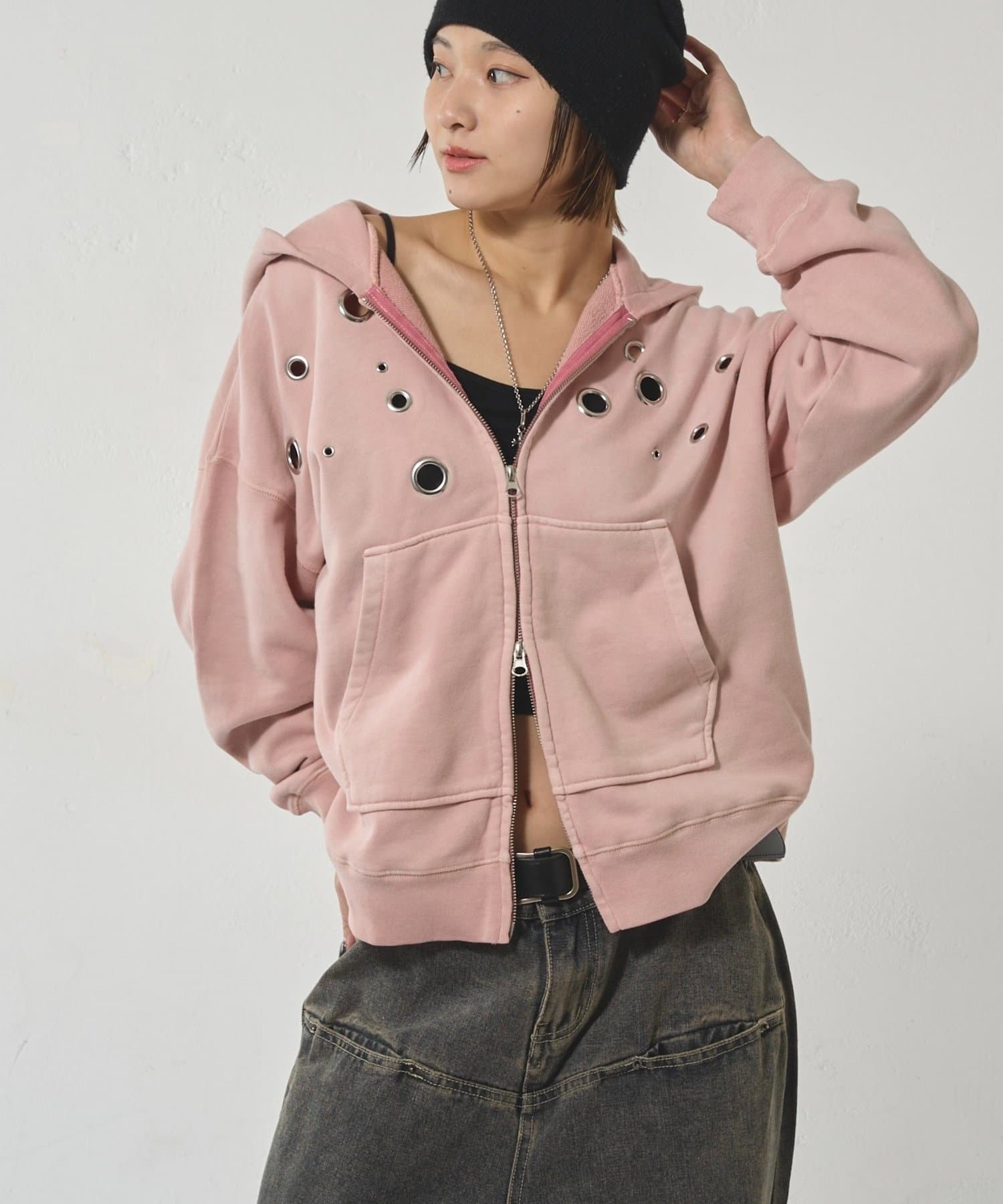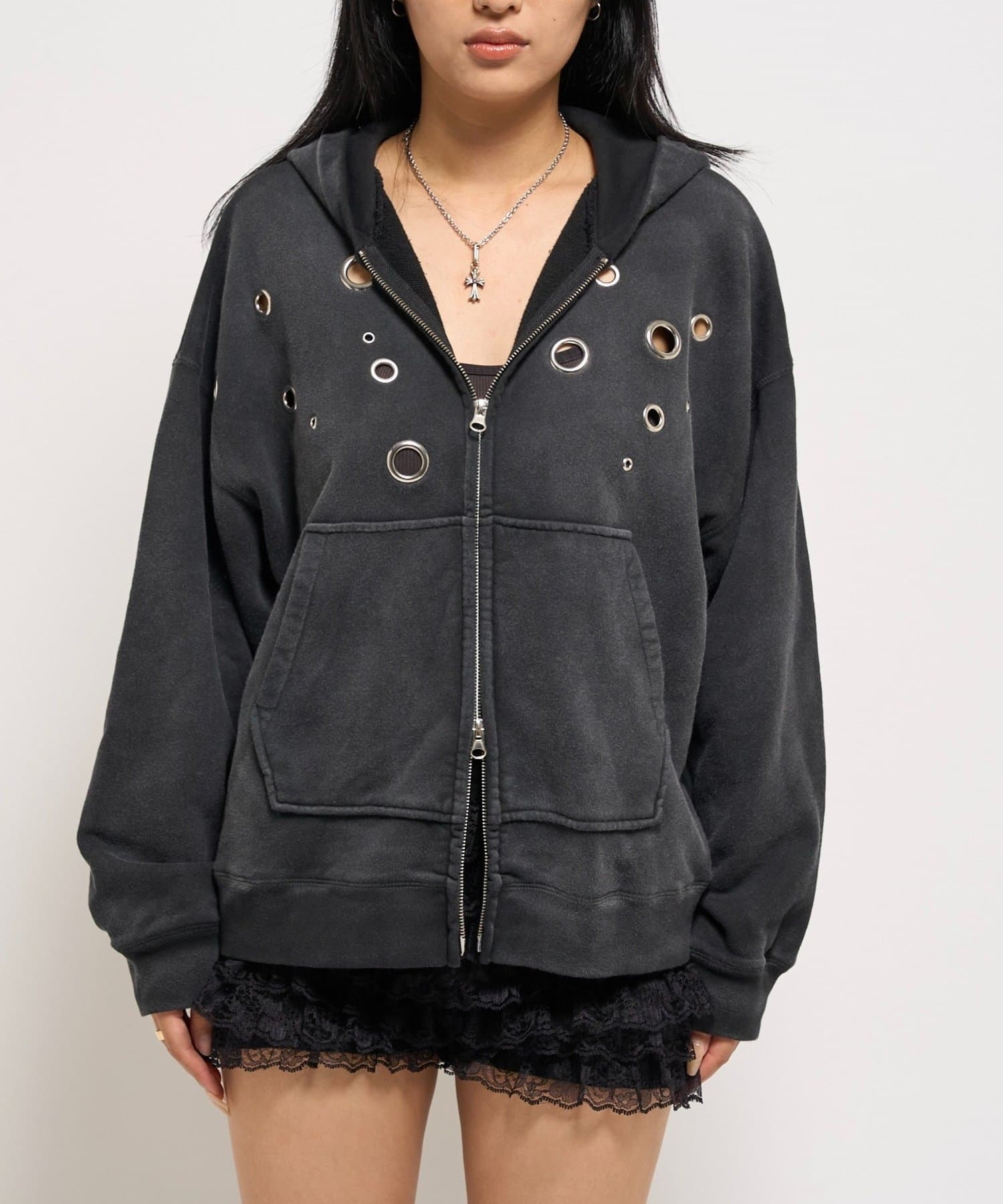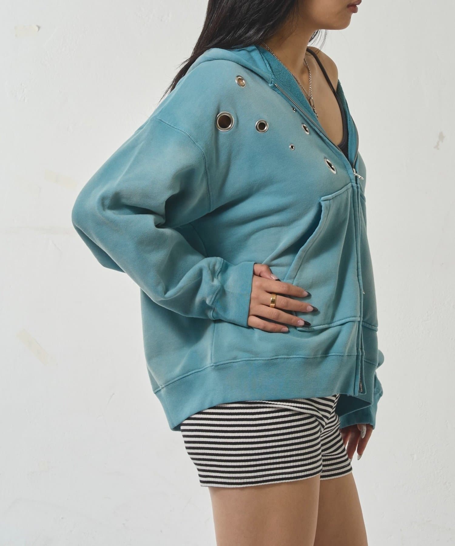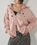 ・フロントに散りばめられたハトメが特徴的なジップパーカー。