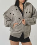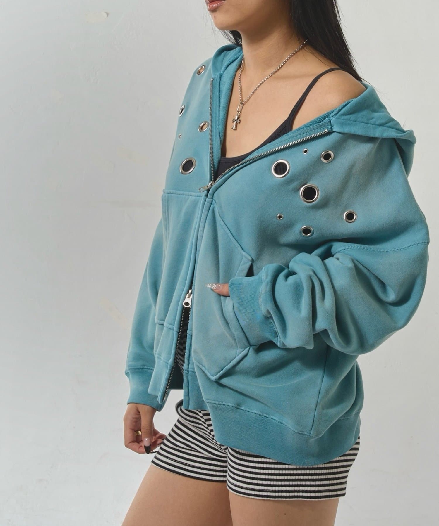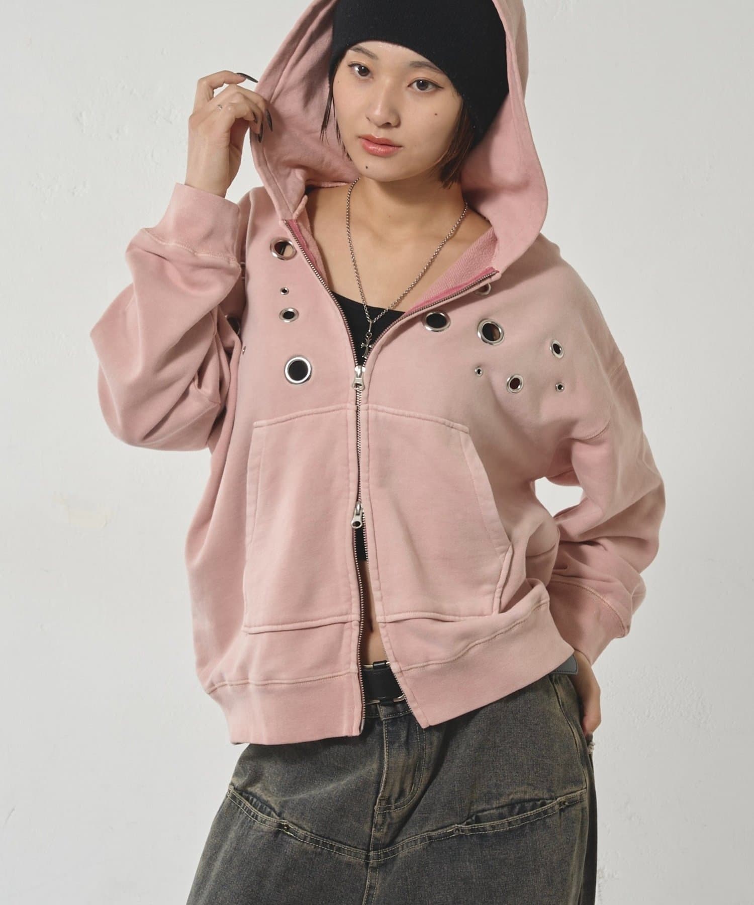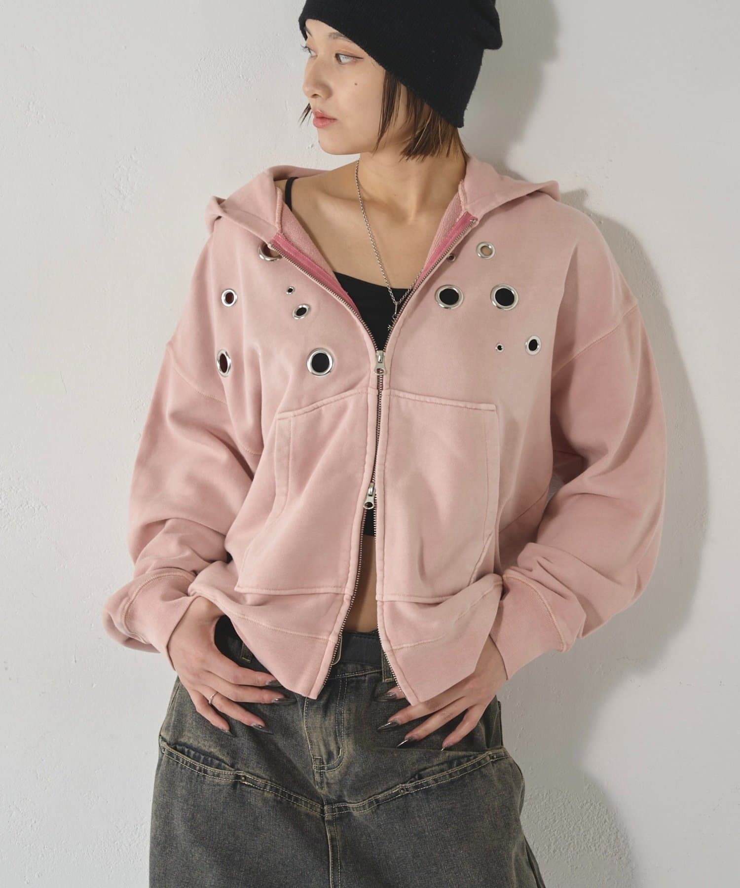 ・フロントに散りばめられたハトメが特徴的なジップパーカー。