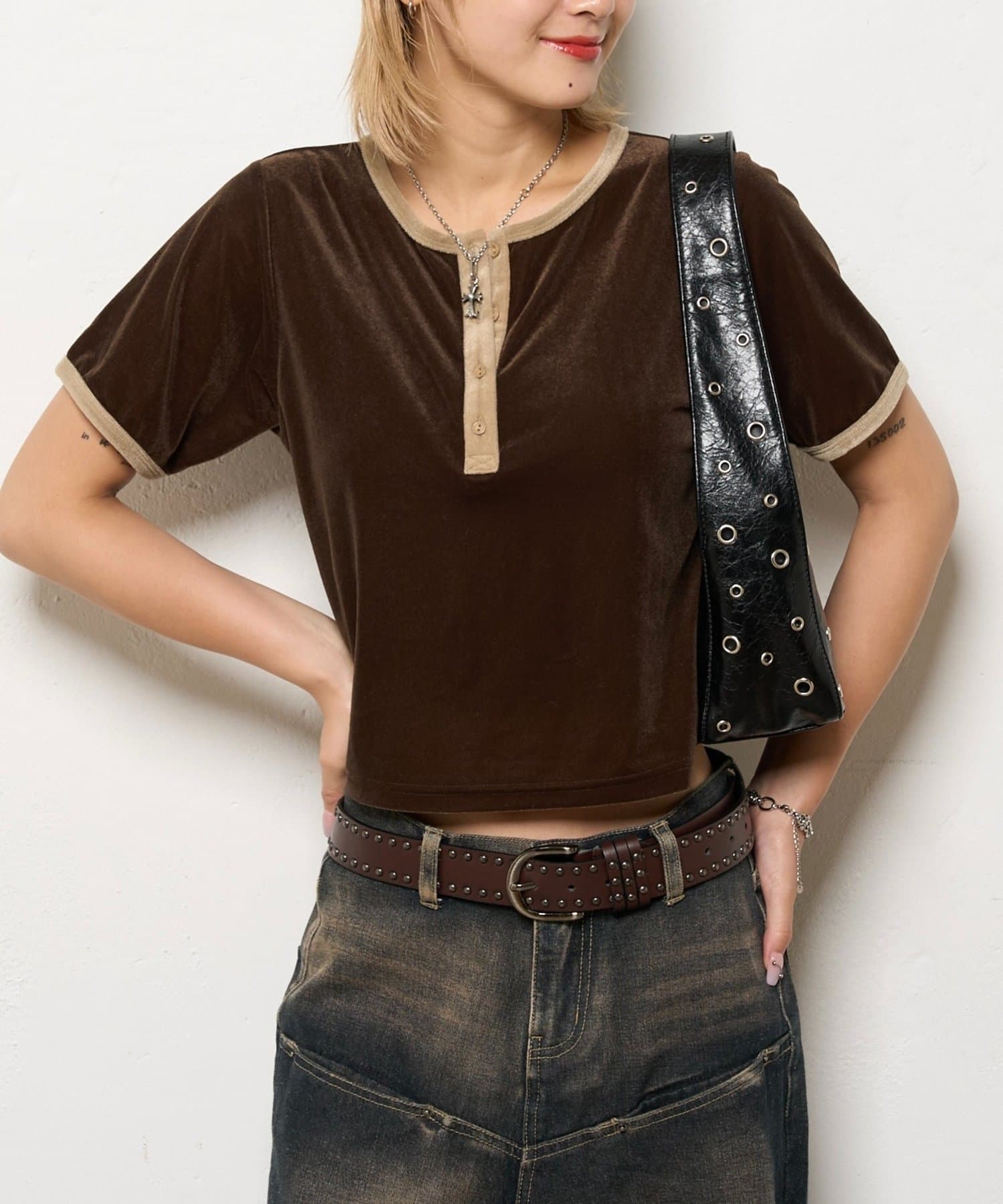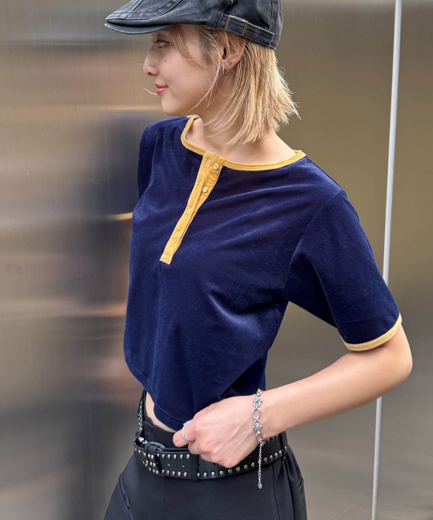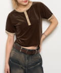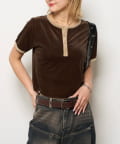 滑らかなベロア素材が上品な印象のヘンリーネックトップス
