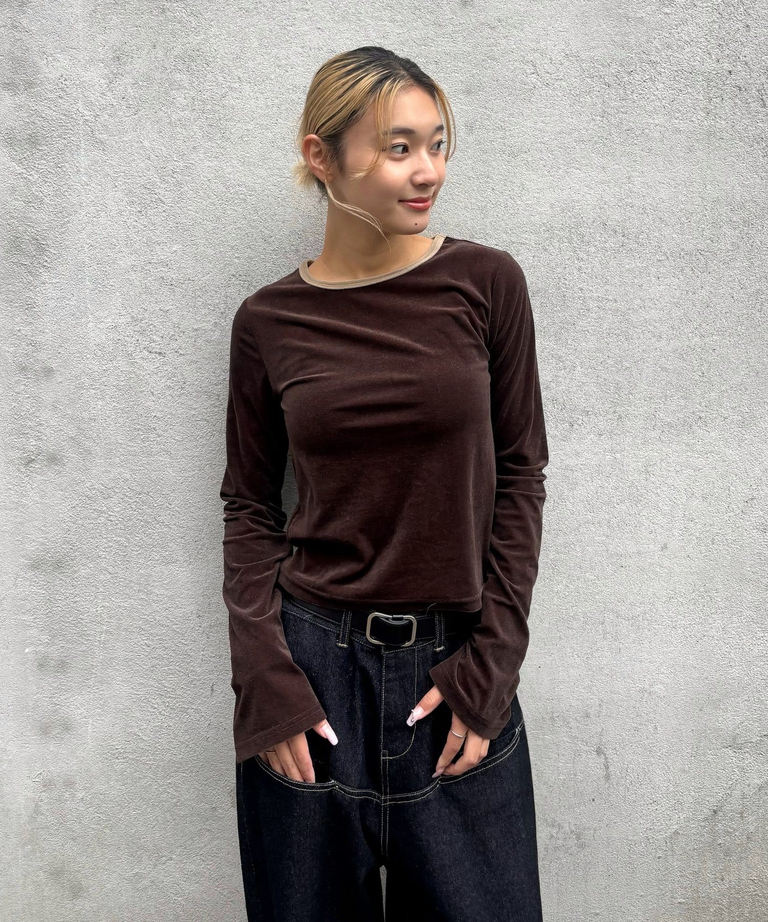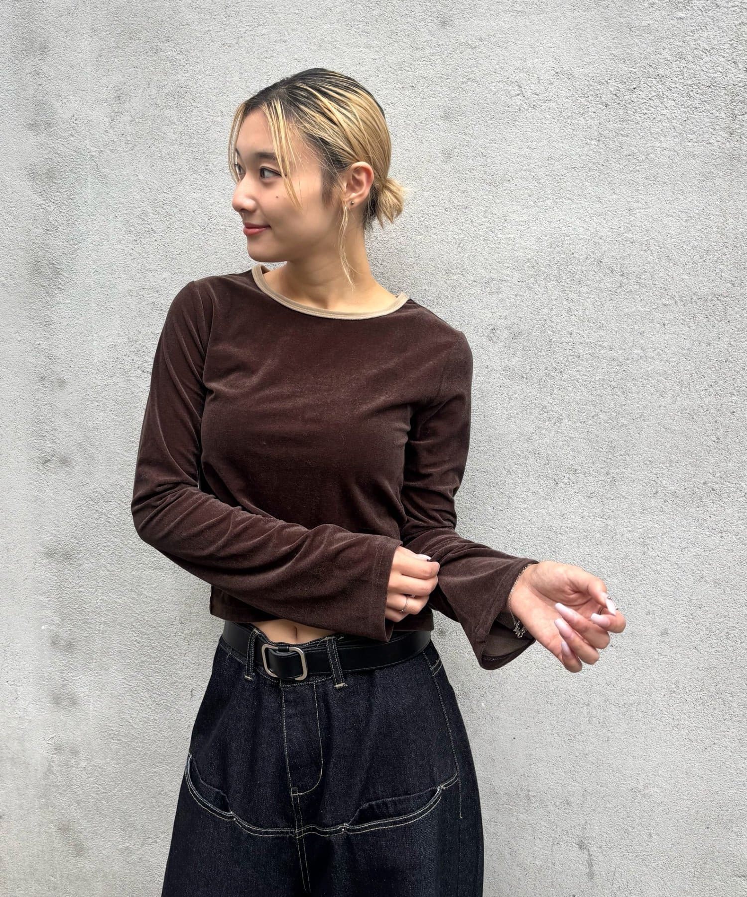 上品な光沢感が魅力のベロア素材を使用した、リンガートップス