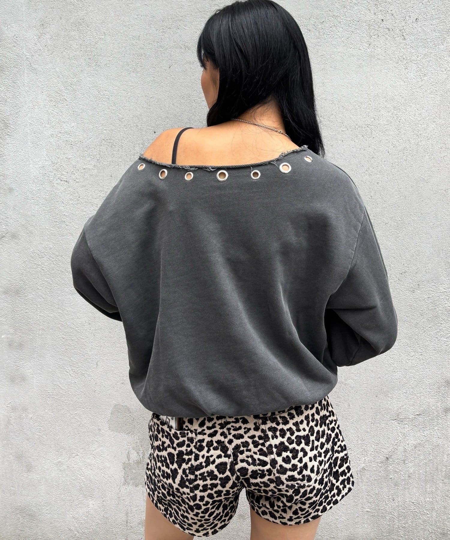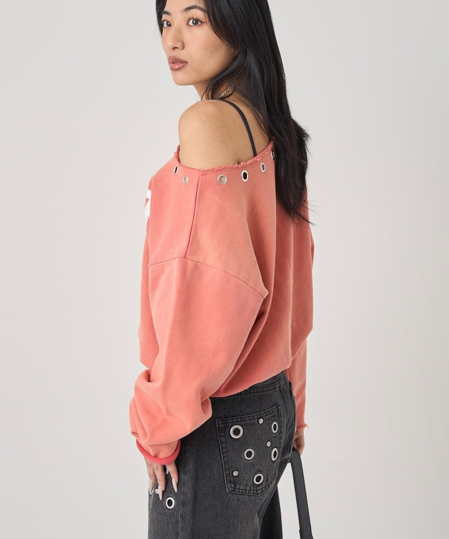 ・首元にあしらわれたハトメと、切りっぱなし加工がさりげなくエッジをプラス。