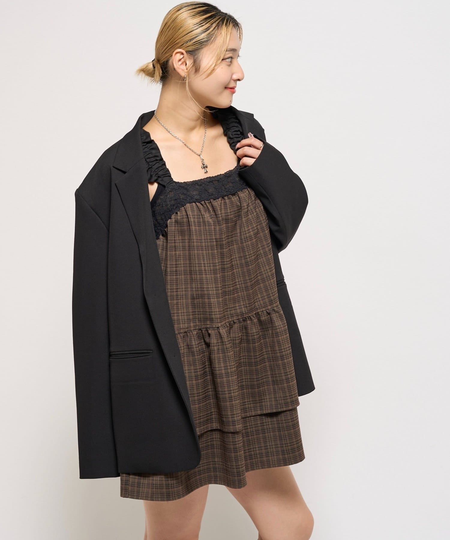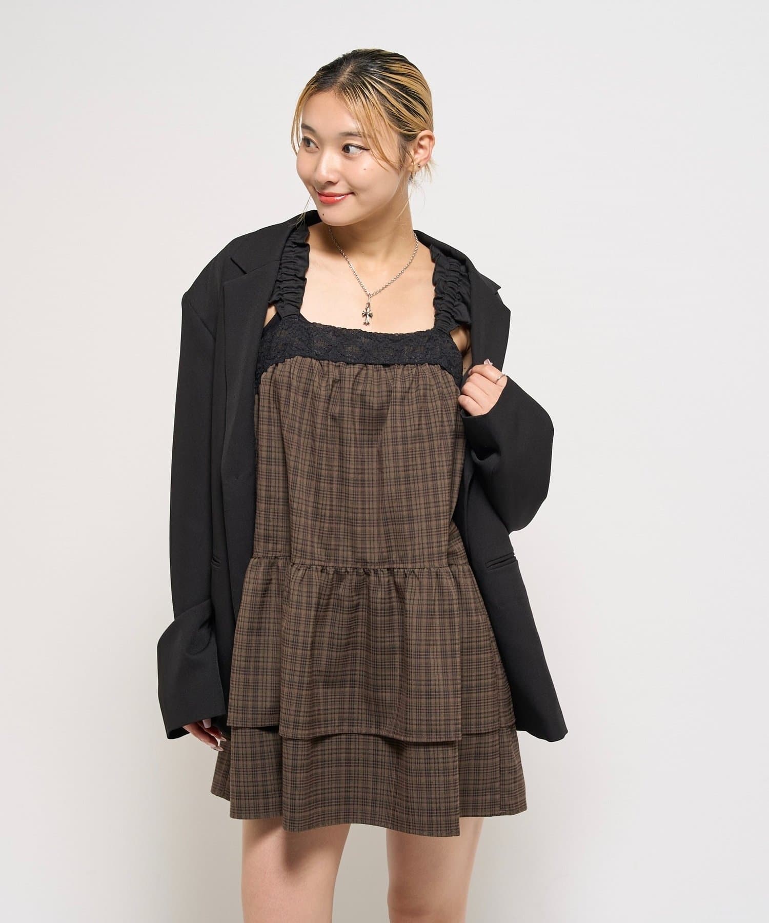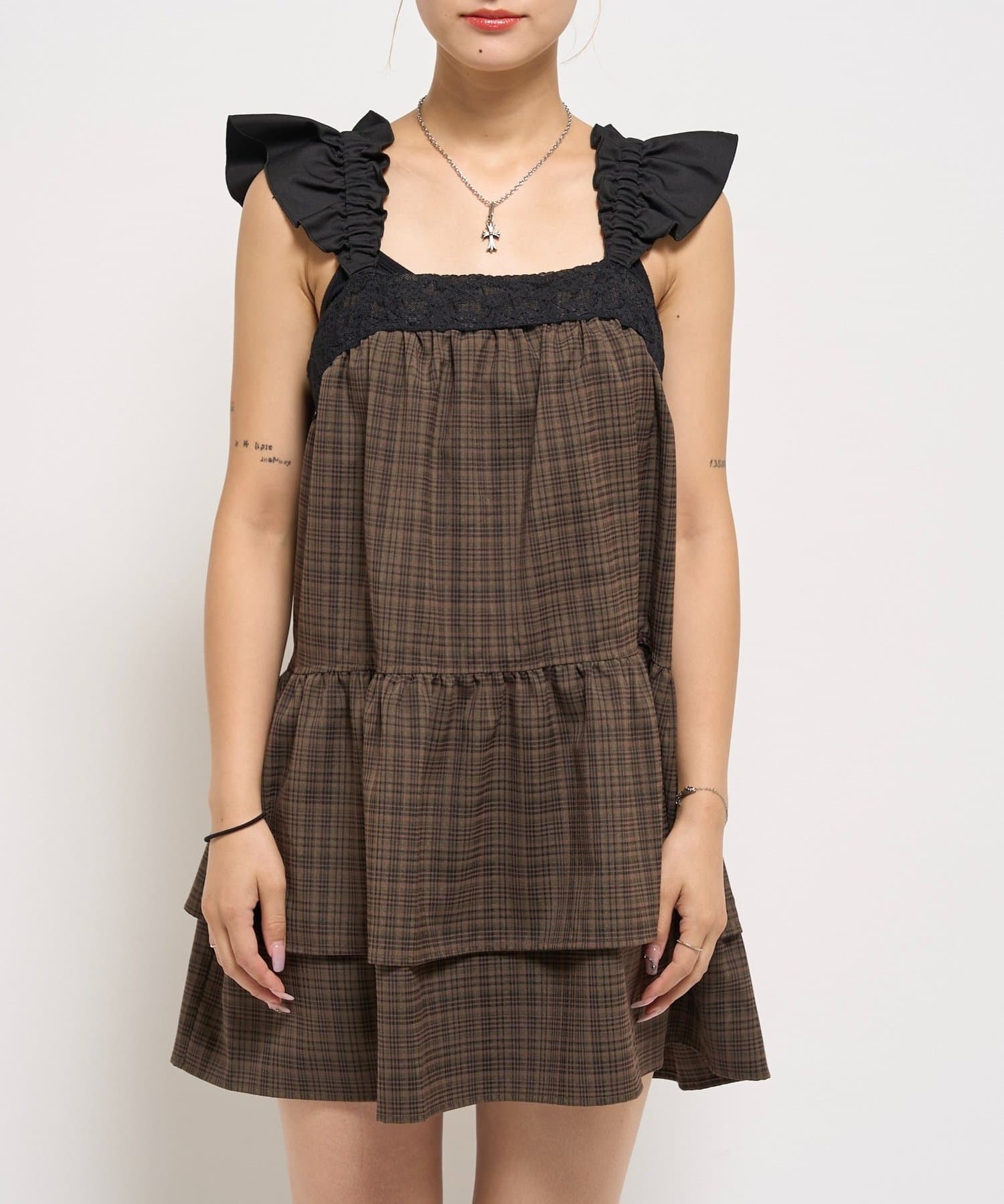 ガーリーなチェック柄に大人かわいいブラックのレースが目を引く、ティアードデザインのミニワンピース