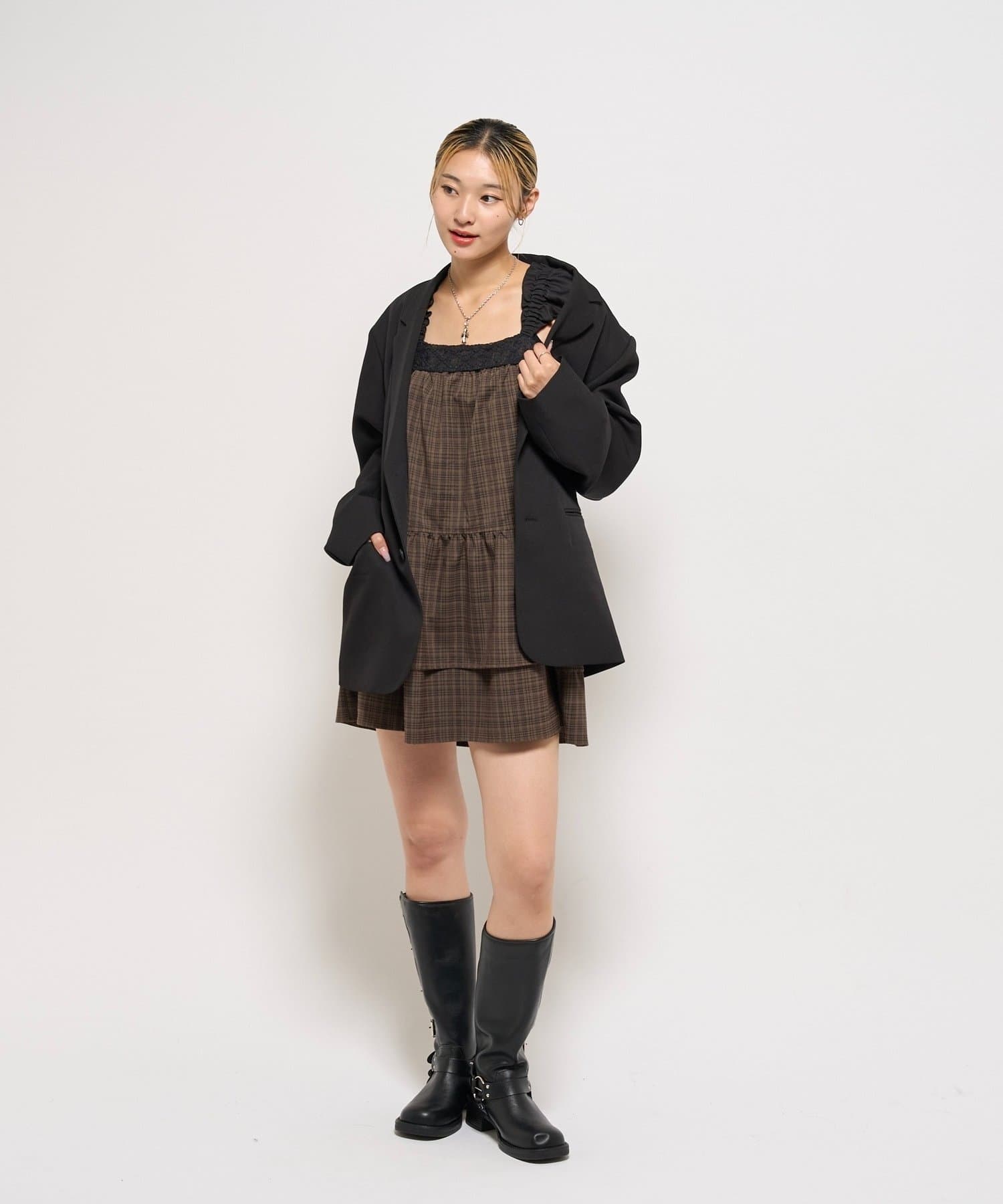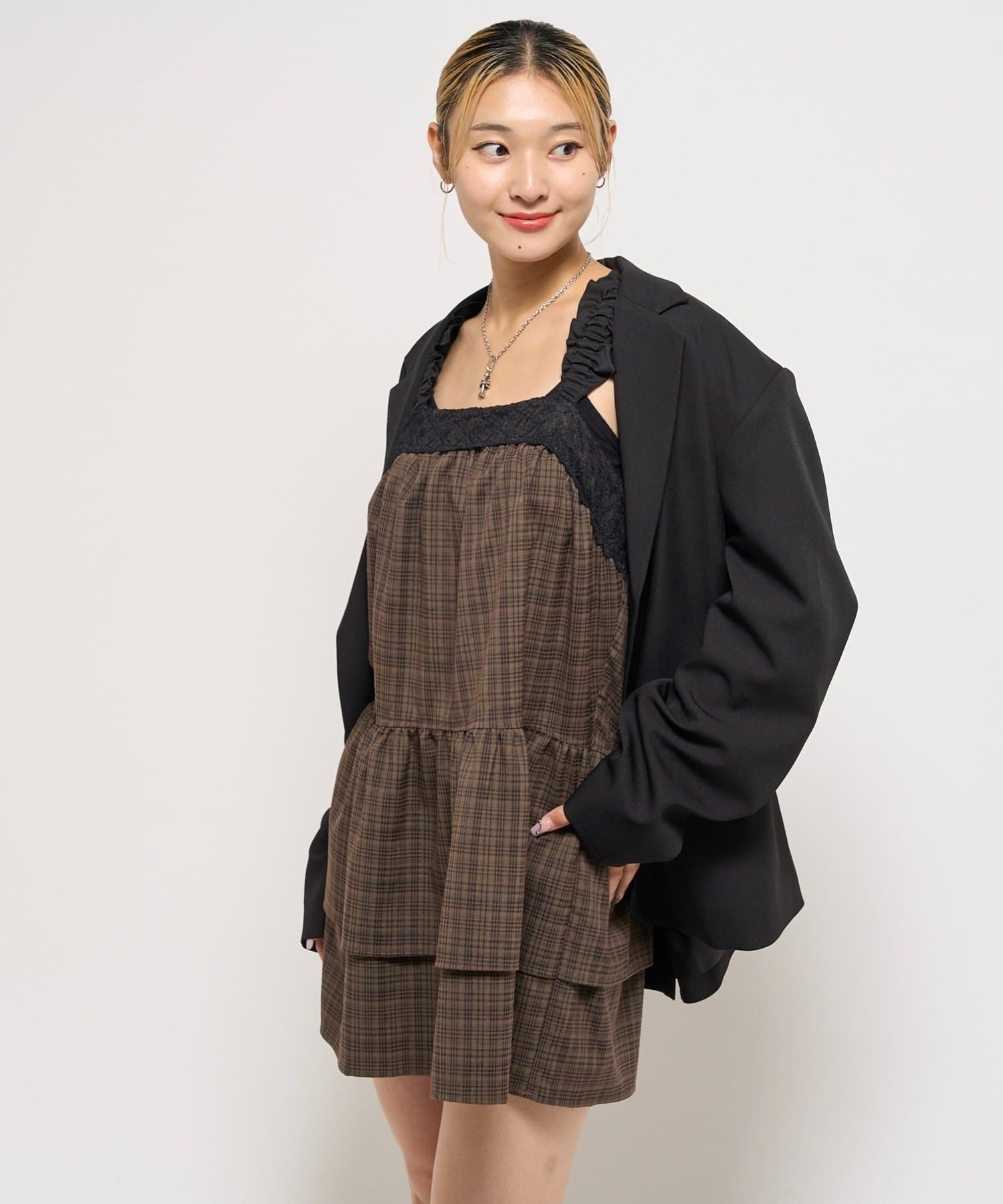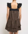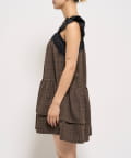 ガーリーなチェック柄に大人かわいいブラックのレースが目を引く、ティアードデザインのミニワンピース