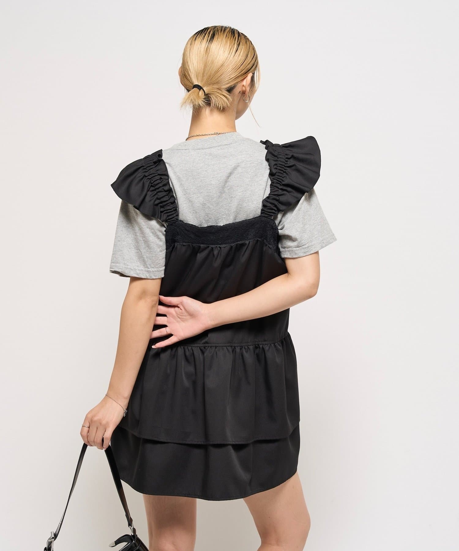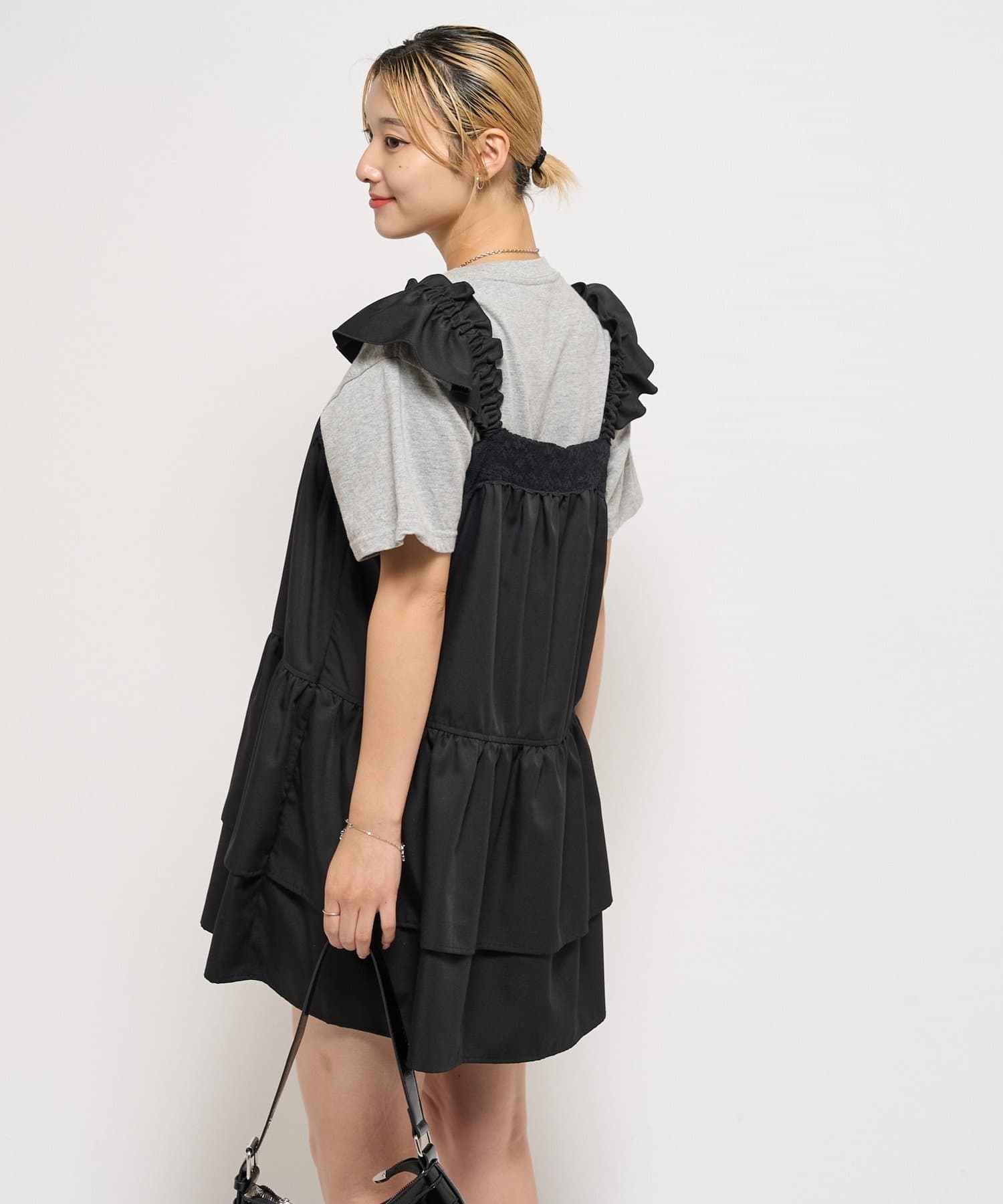 ・トレンドのティアードデザインのミニワンピース。