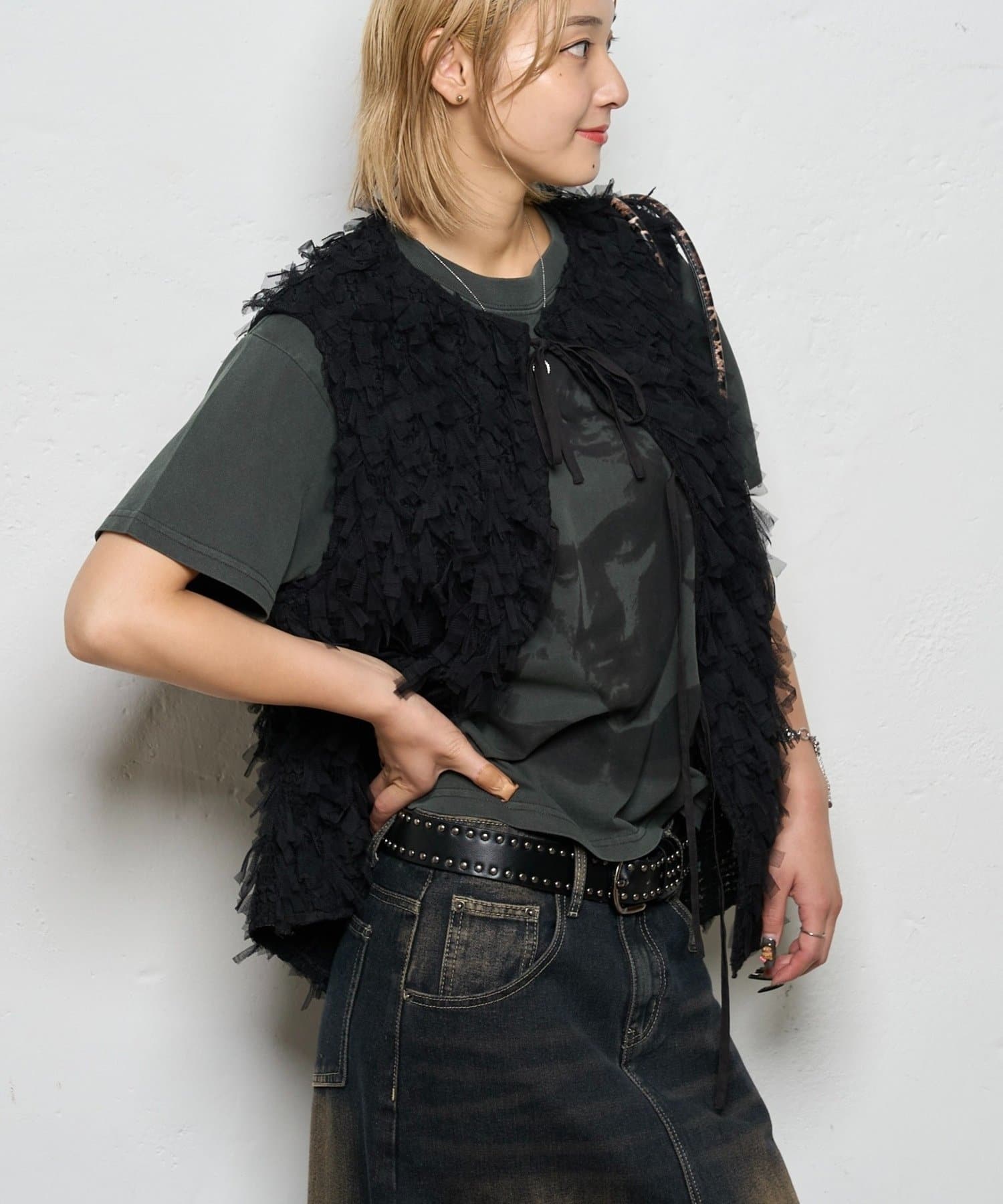 モードでも大人カジュアルにも着れる!コーデのポイントになるチュールベスト。
