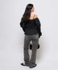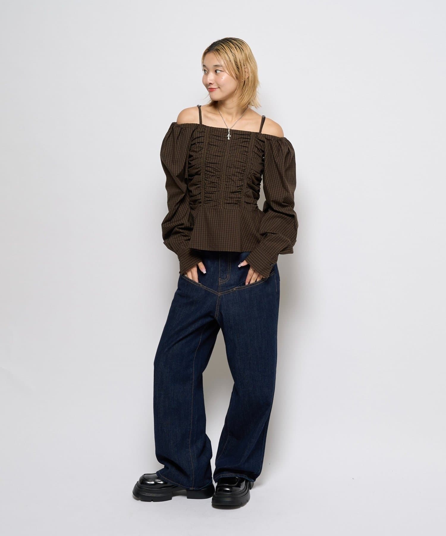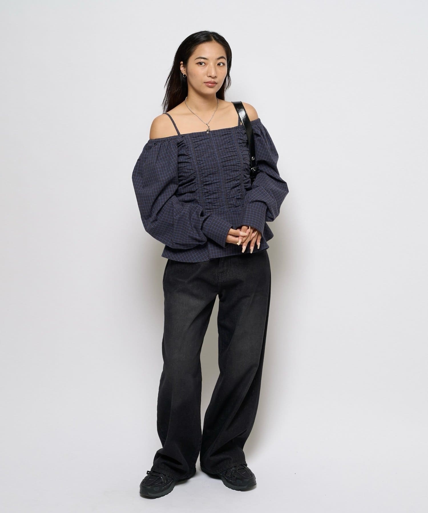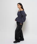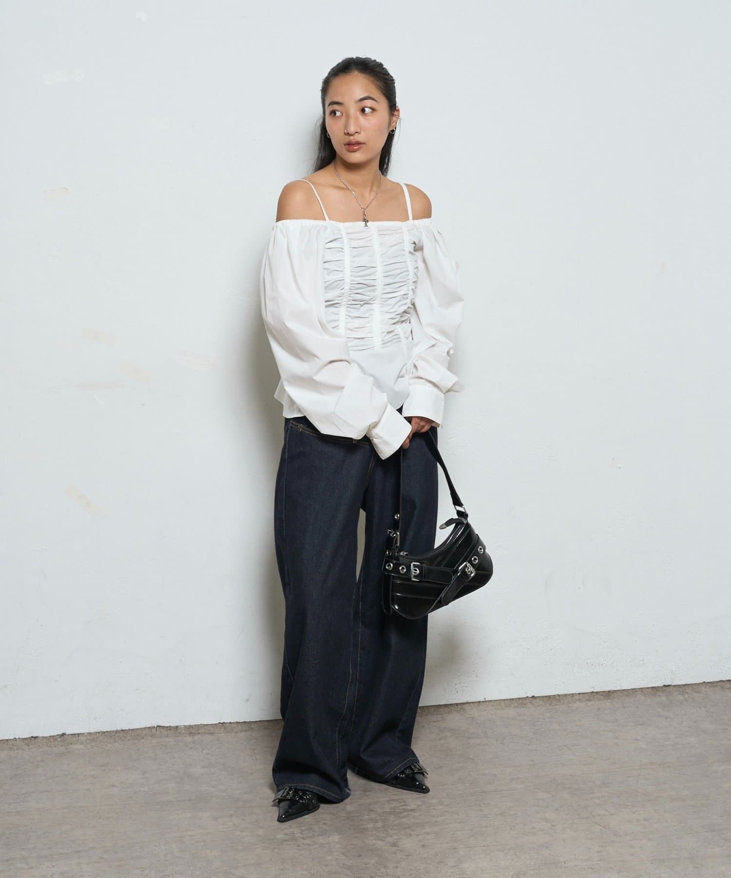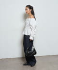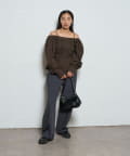 ・オフショルダーで着るとより女性らしく抜け感のある着こなしに。