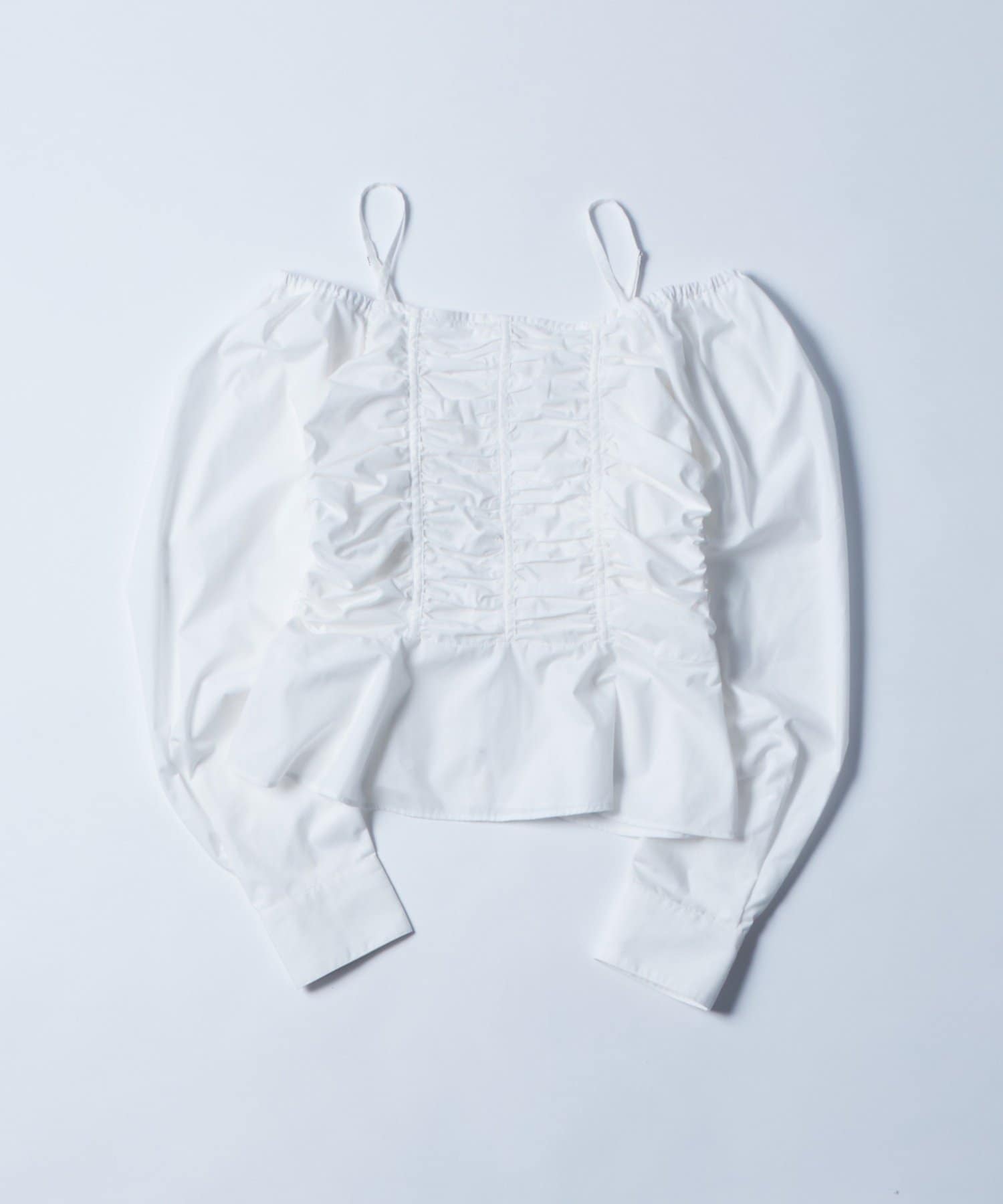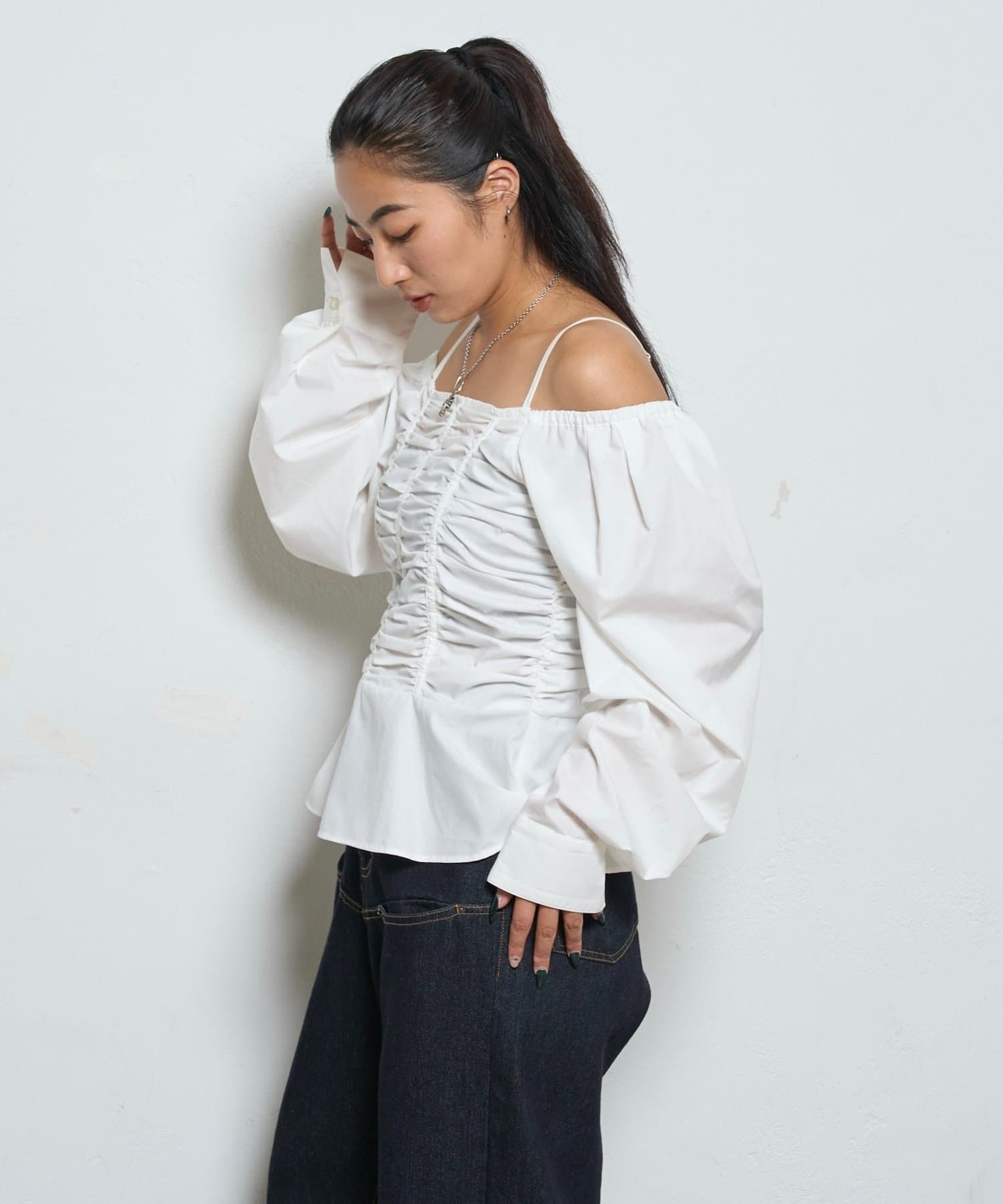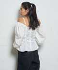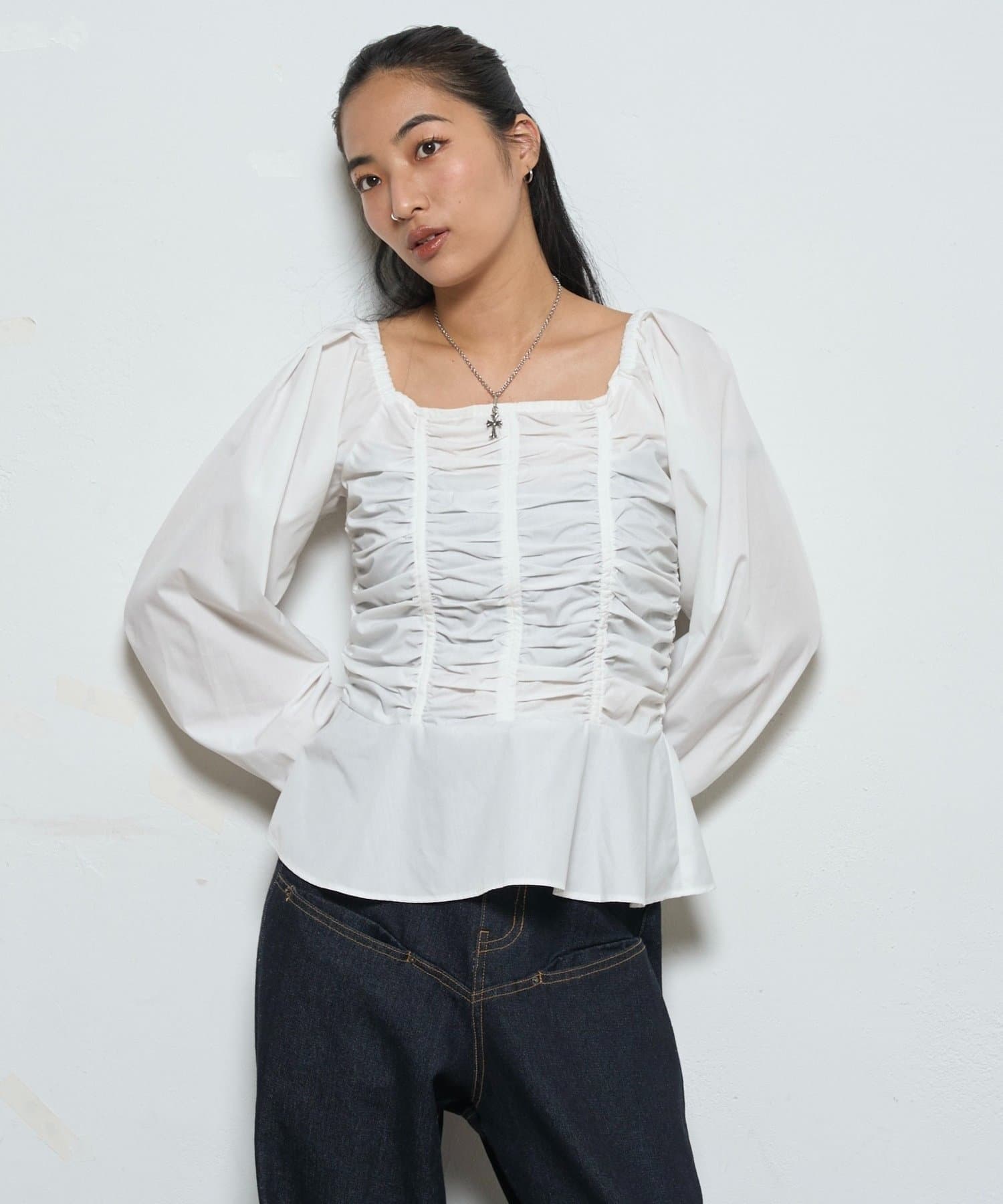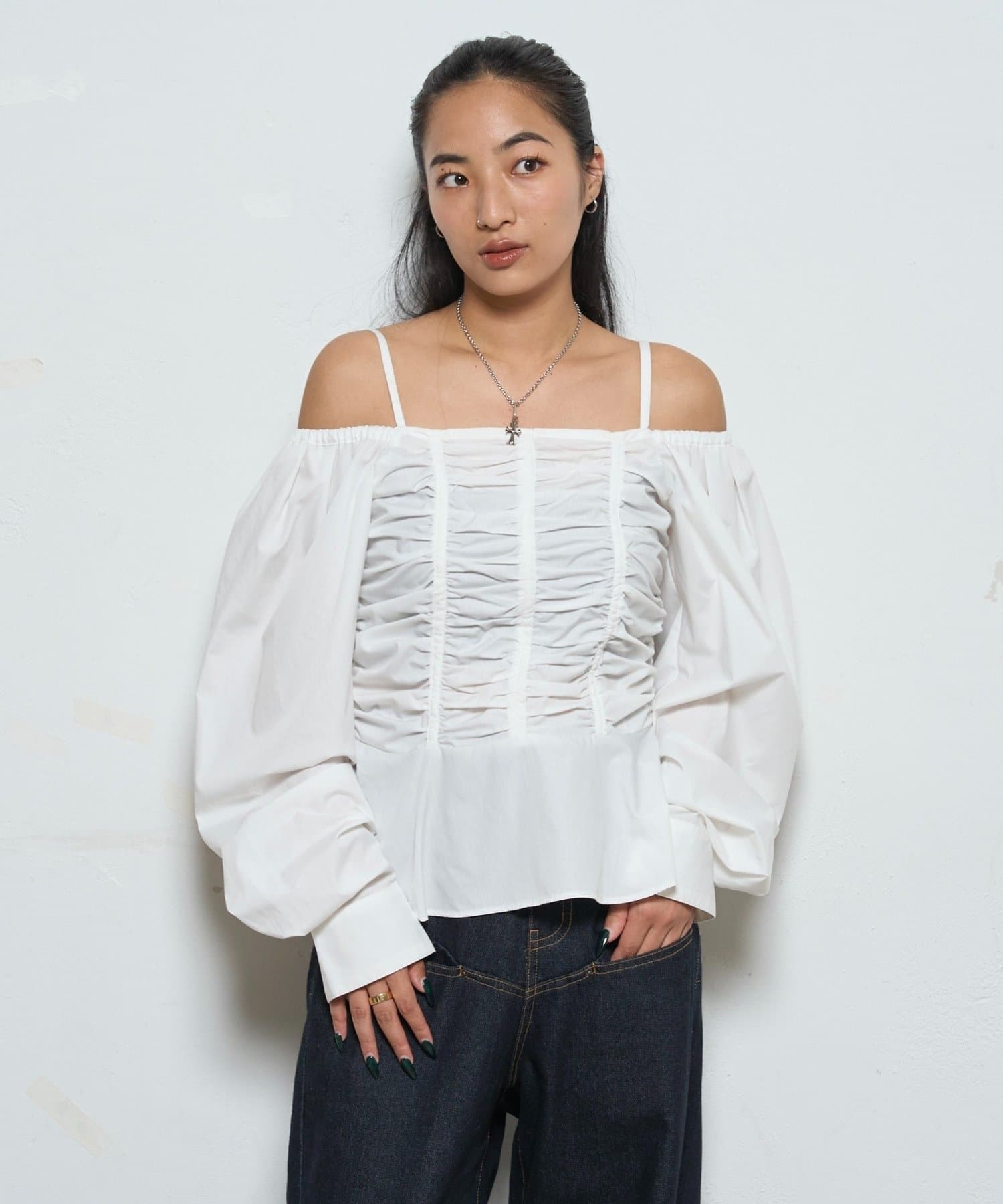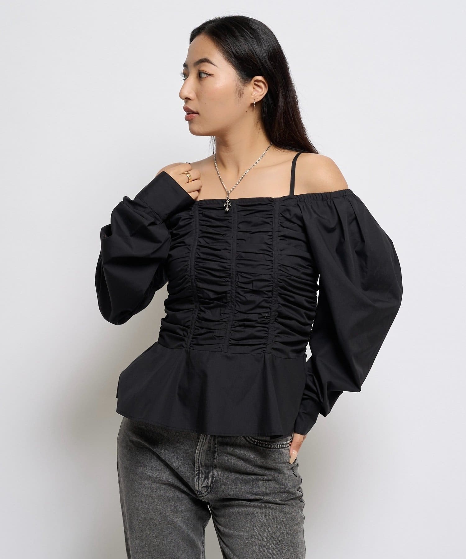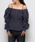 ・ 胸元のシャーリングデザインと、ドロップショルダーが特徴的なブラウス。