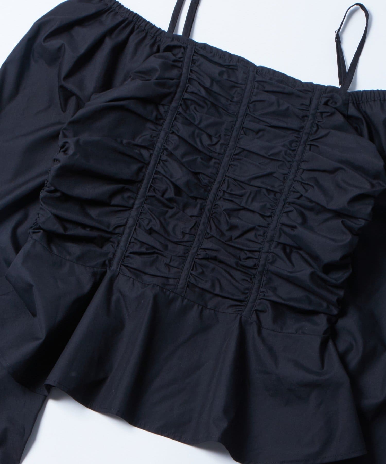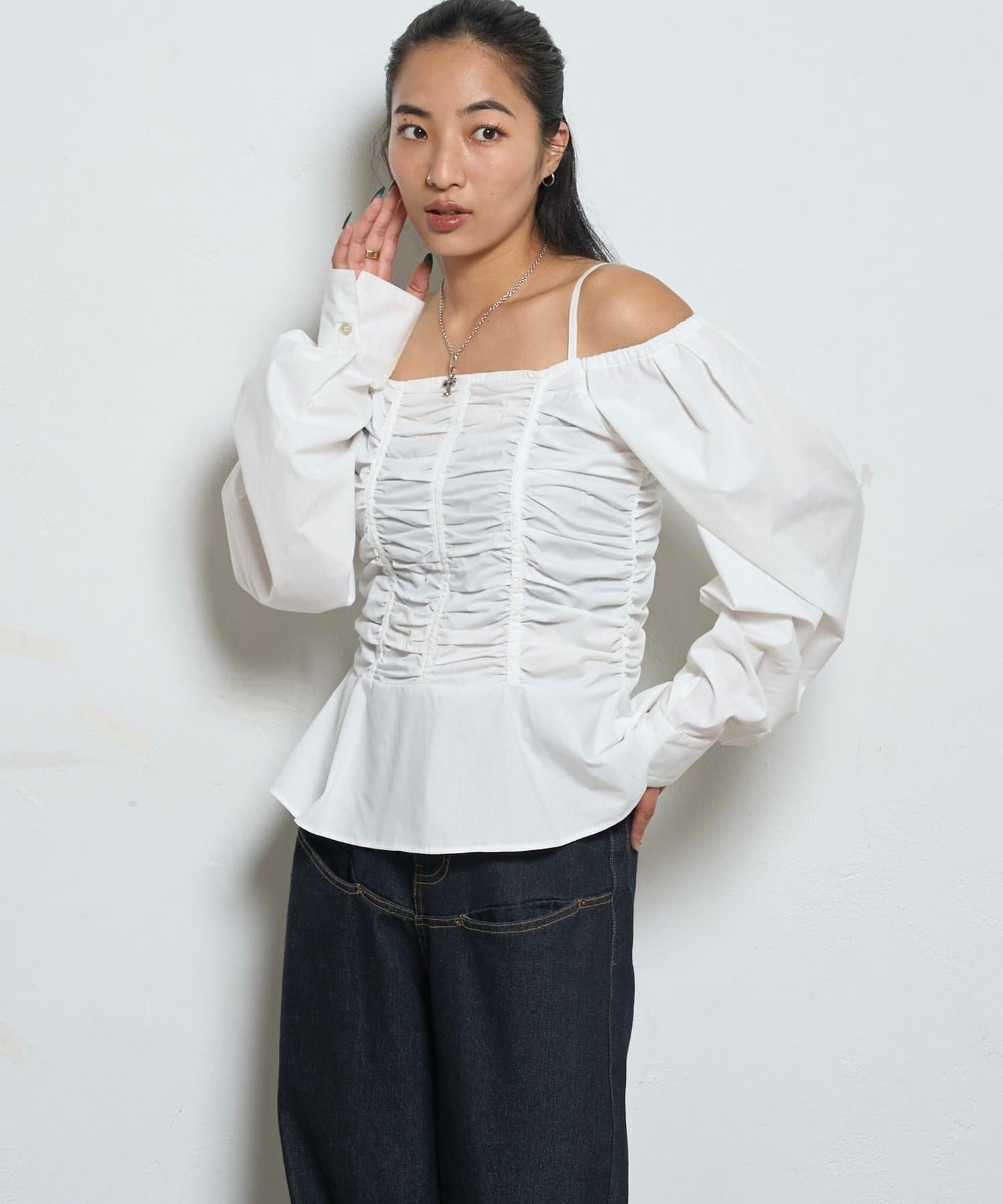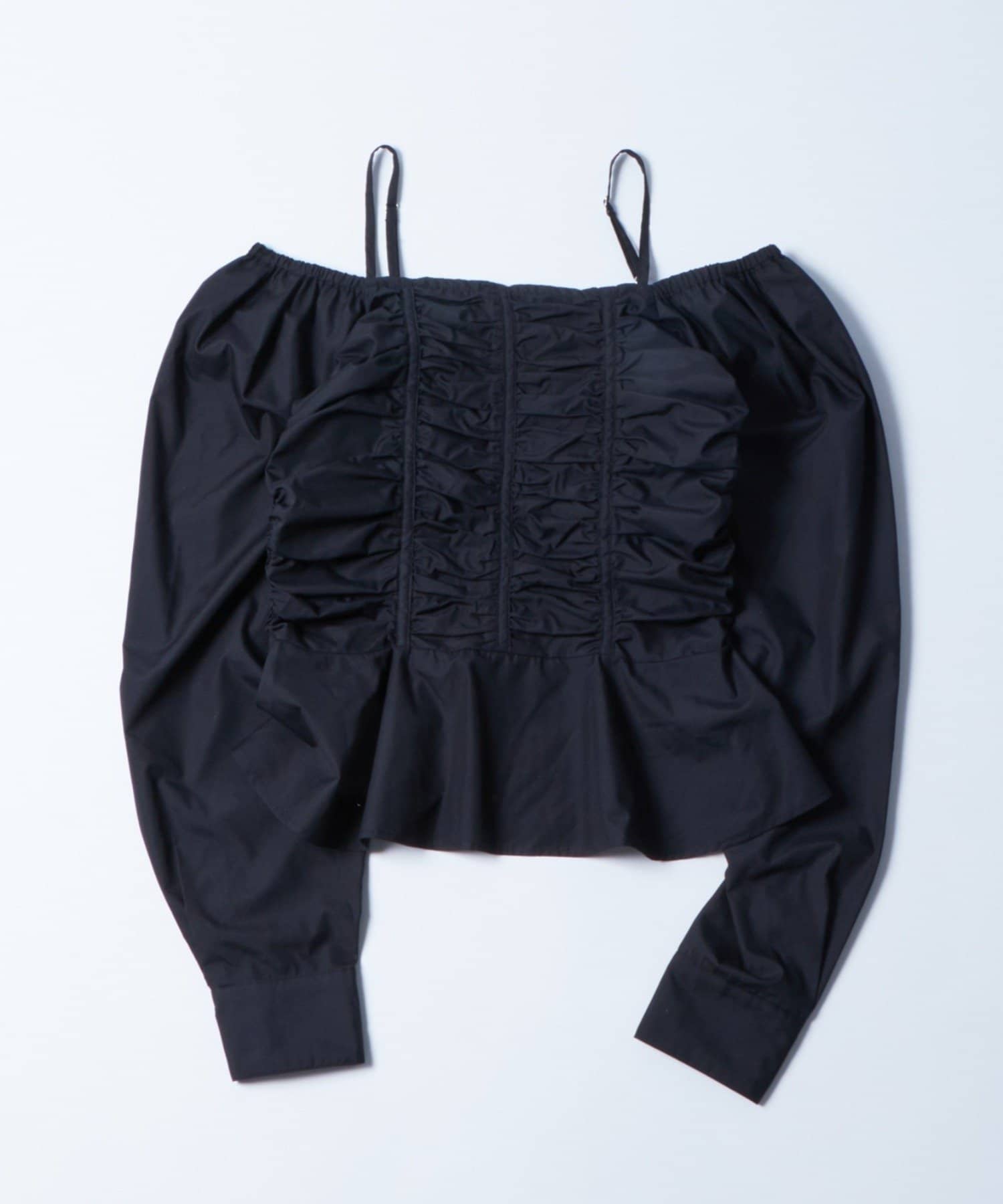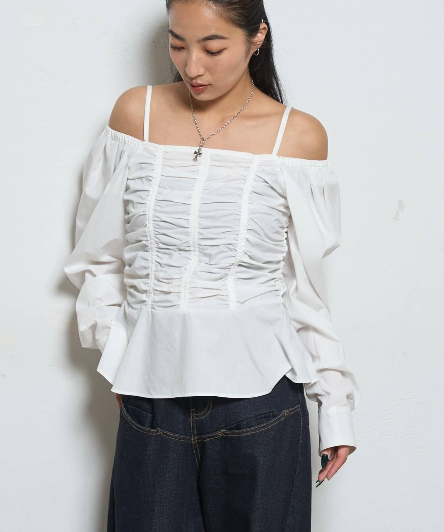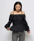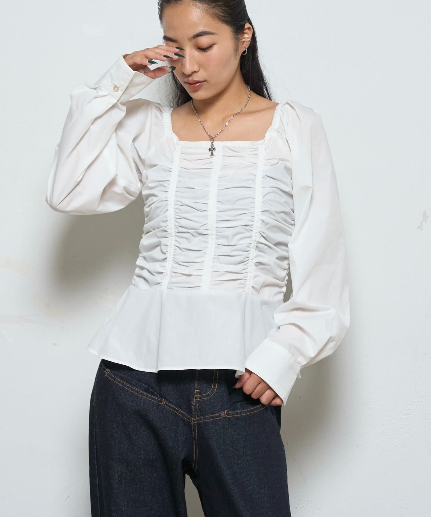 ・ 胸元のシャーリングデザインと、ドロップショルダーが特徴的なブラウス。