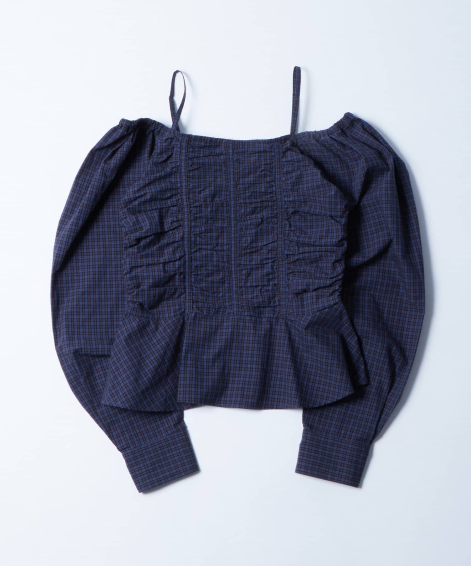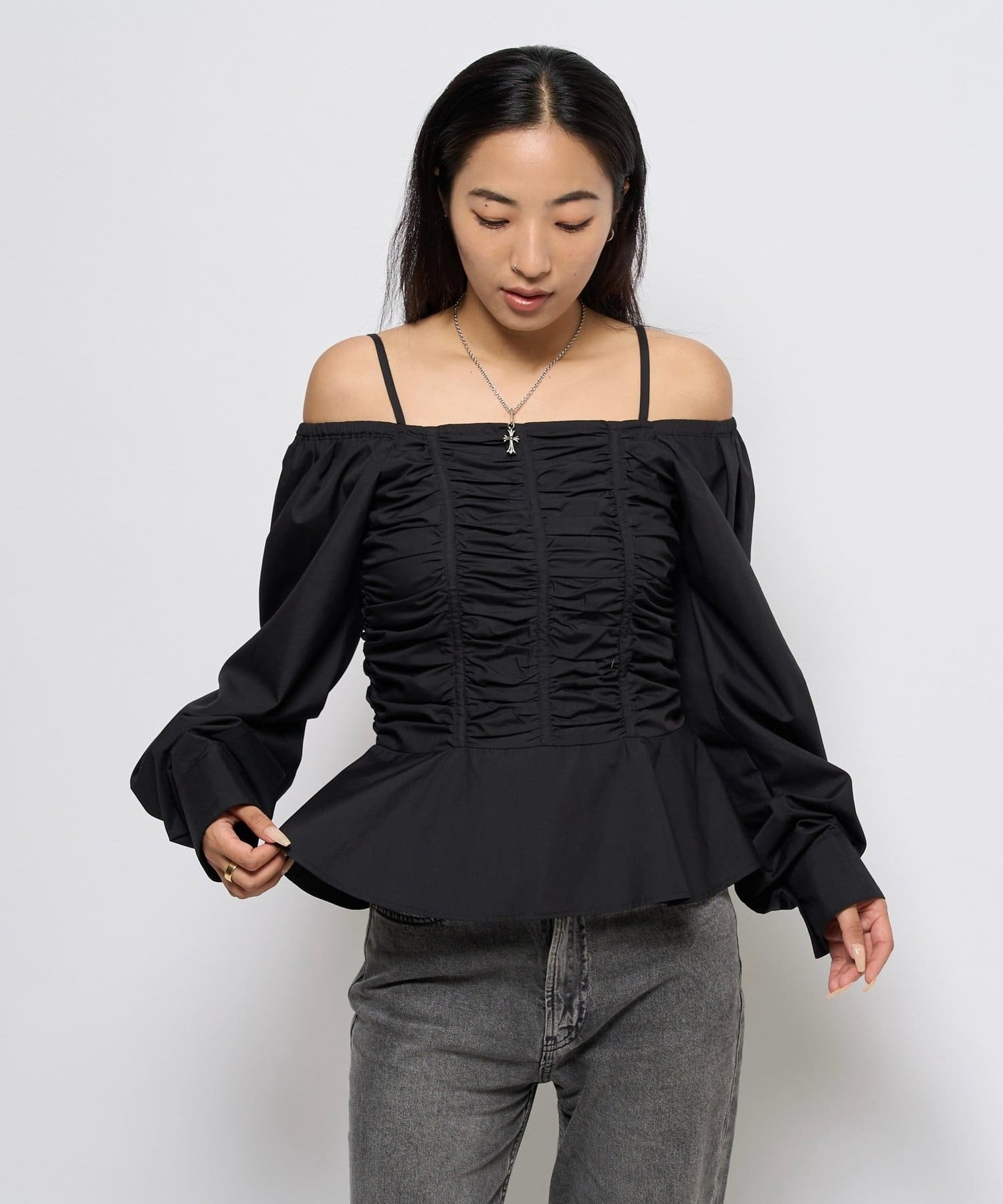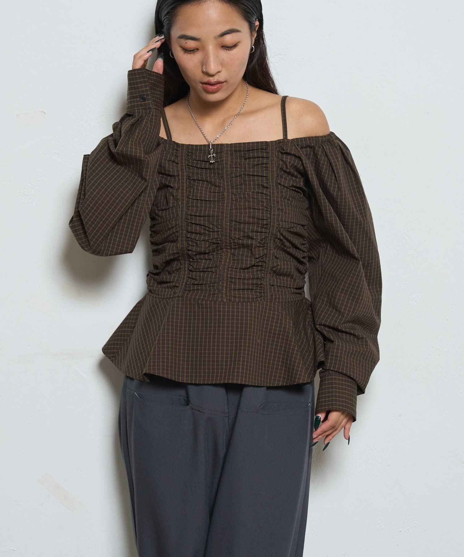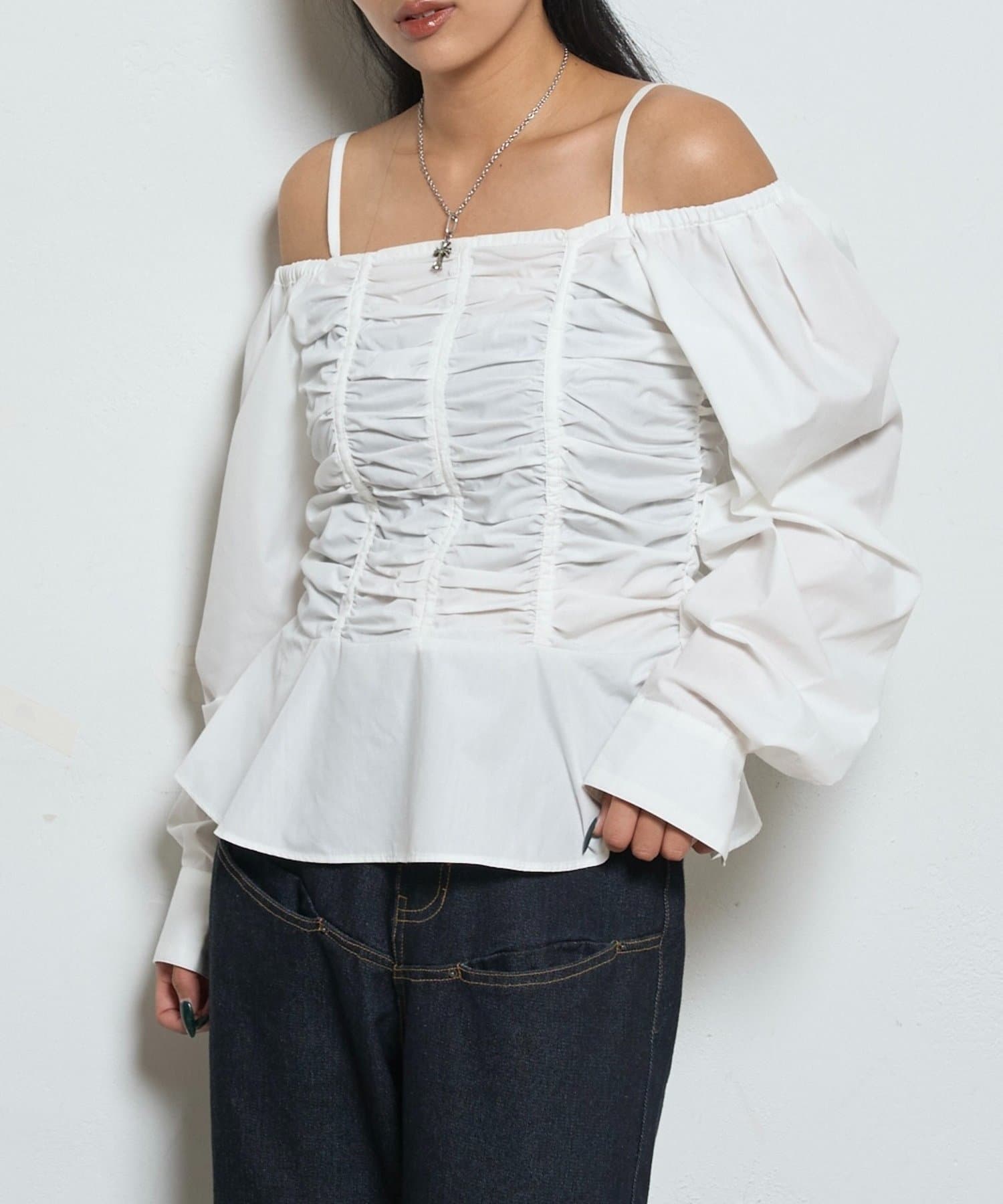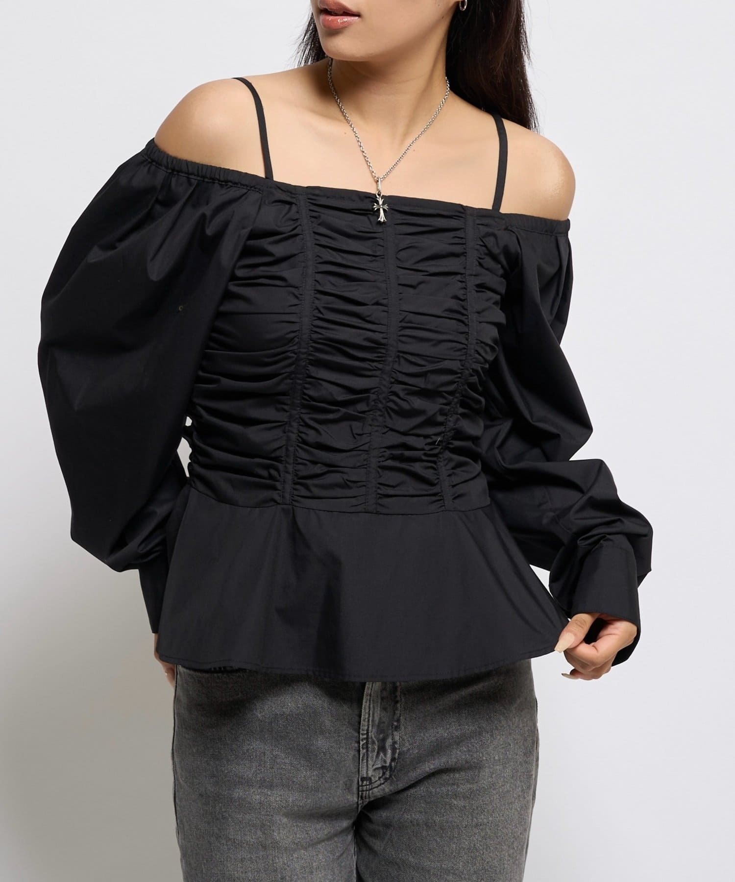 ・ 胸元のシャーリングデザインと、ドロップショルダーが特徴的なブラウス。