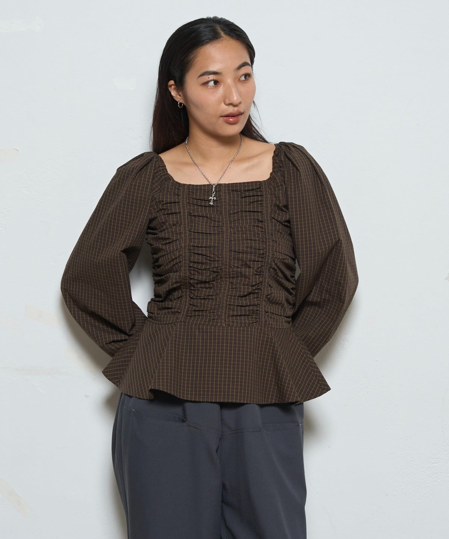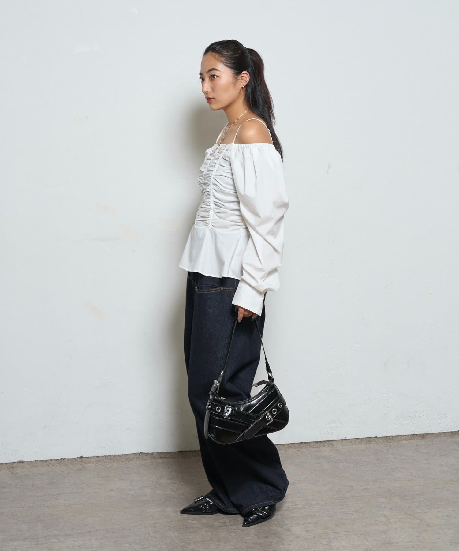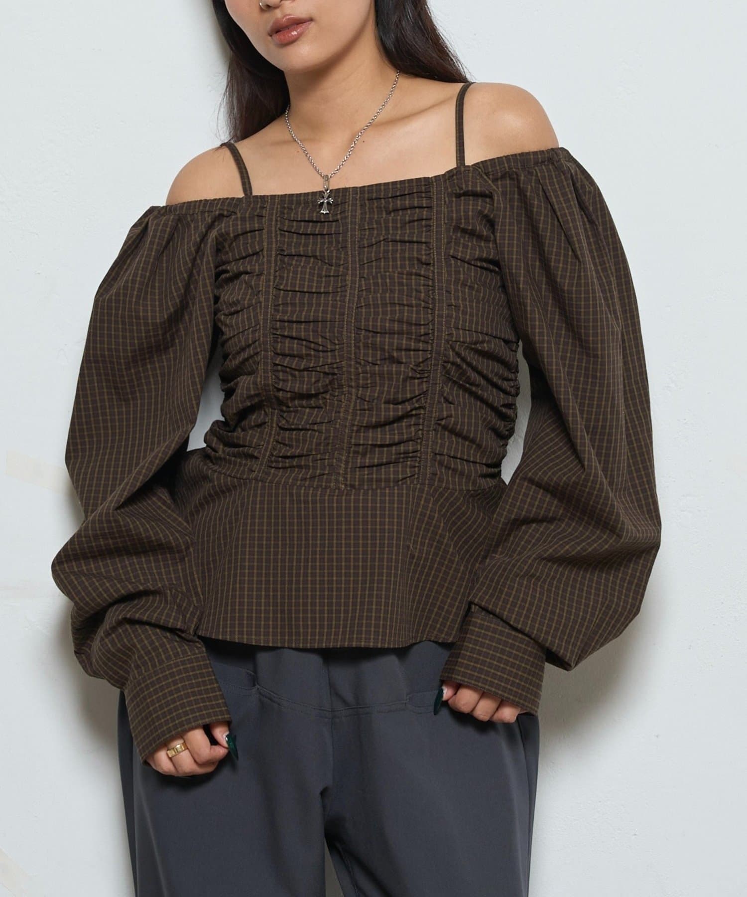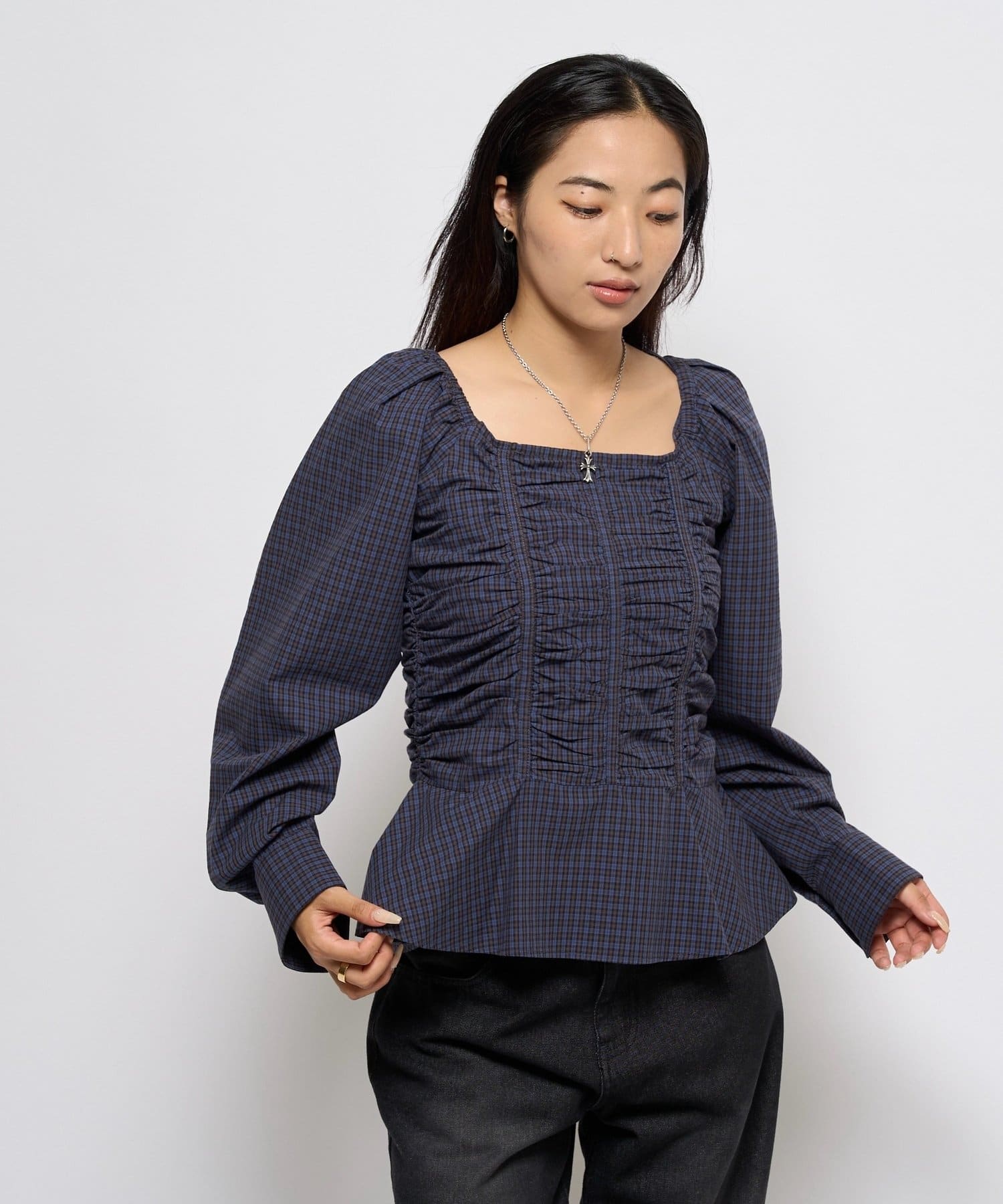 ・ 胸元のシャーリングデザインと、ドロップショルダーが特徴的なブラウス。