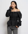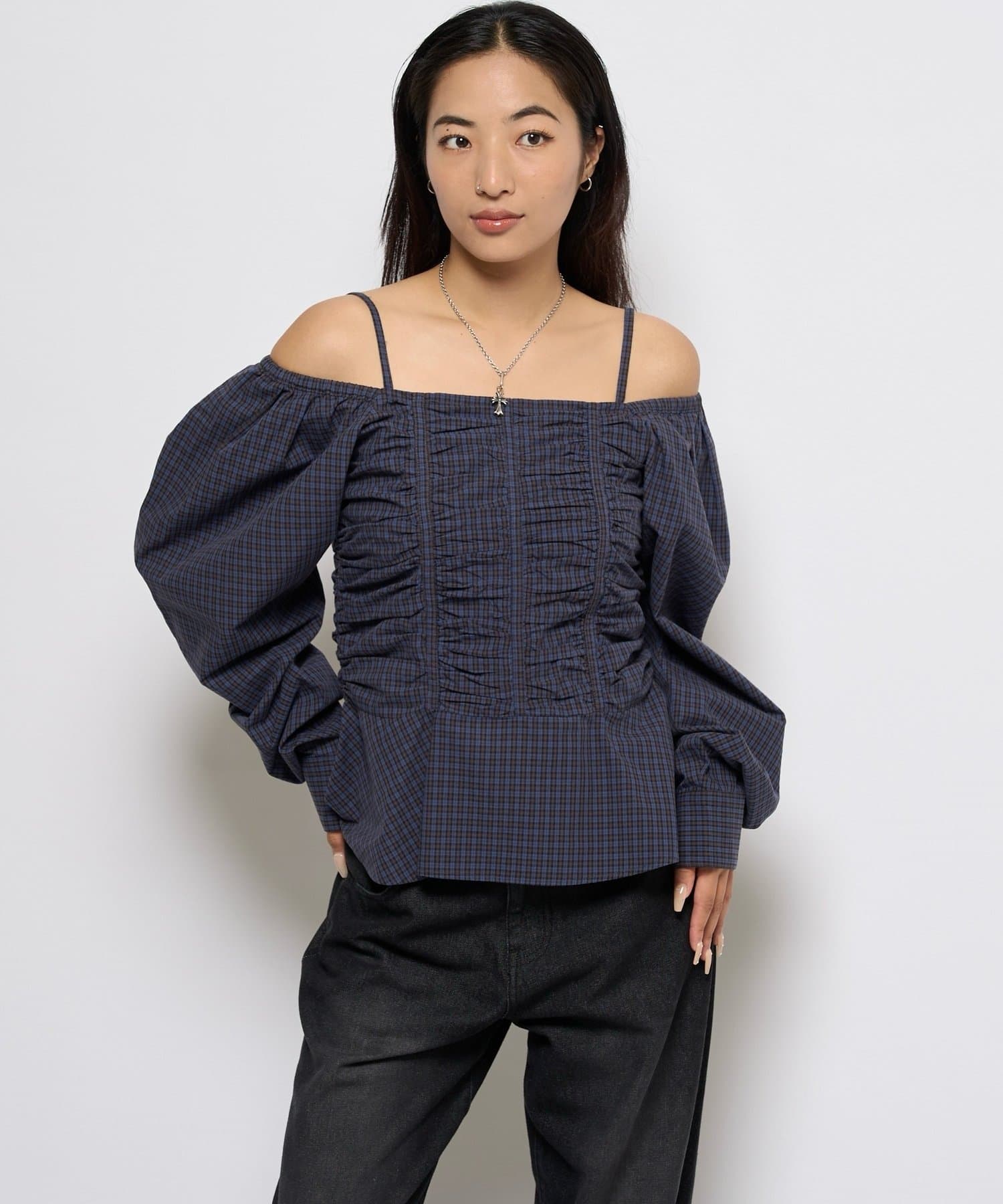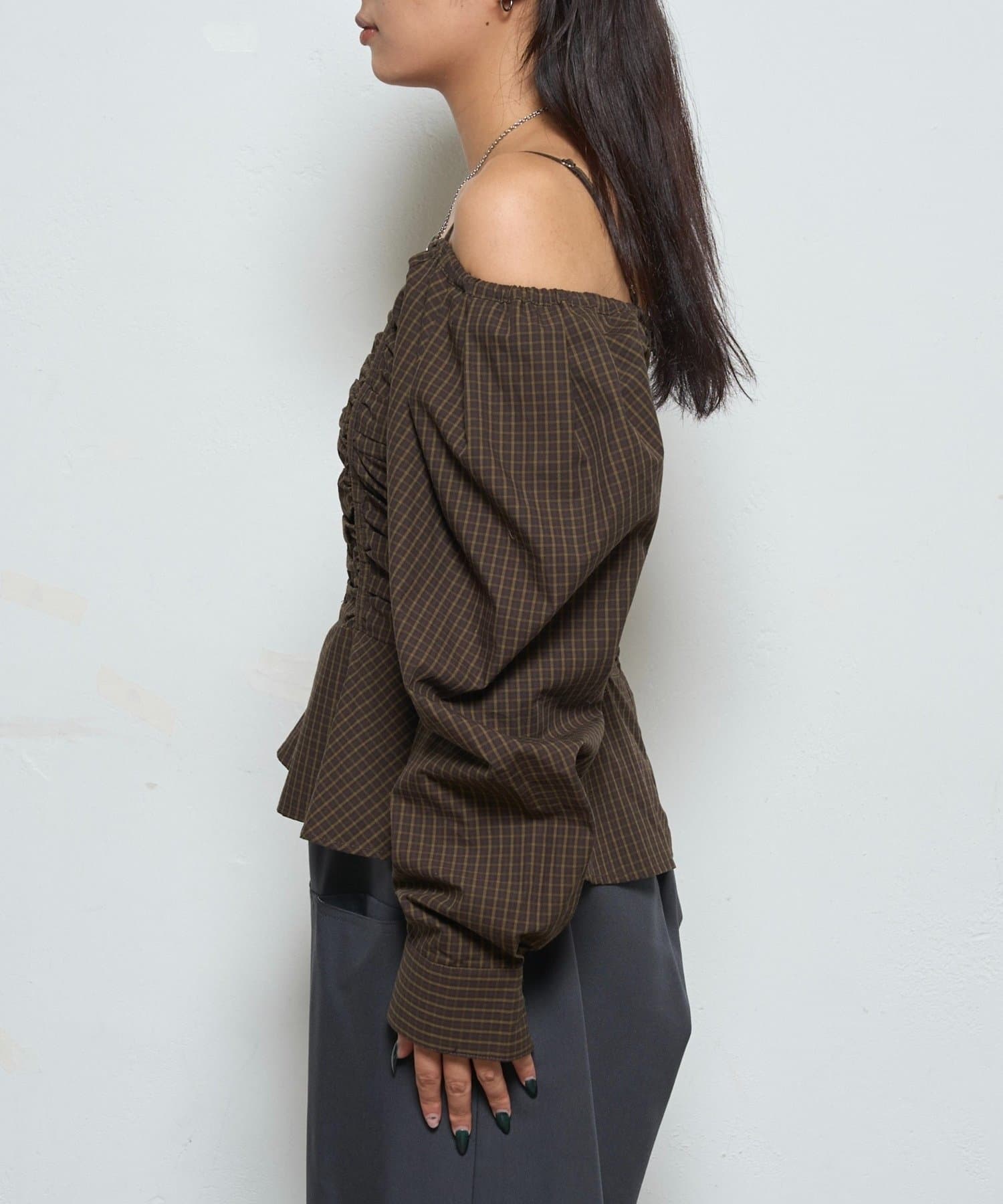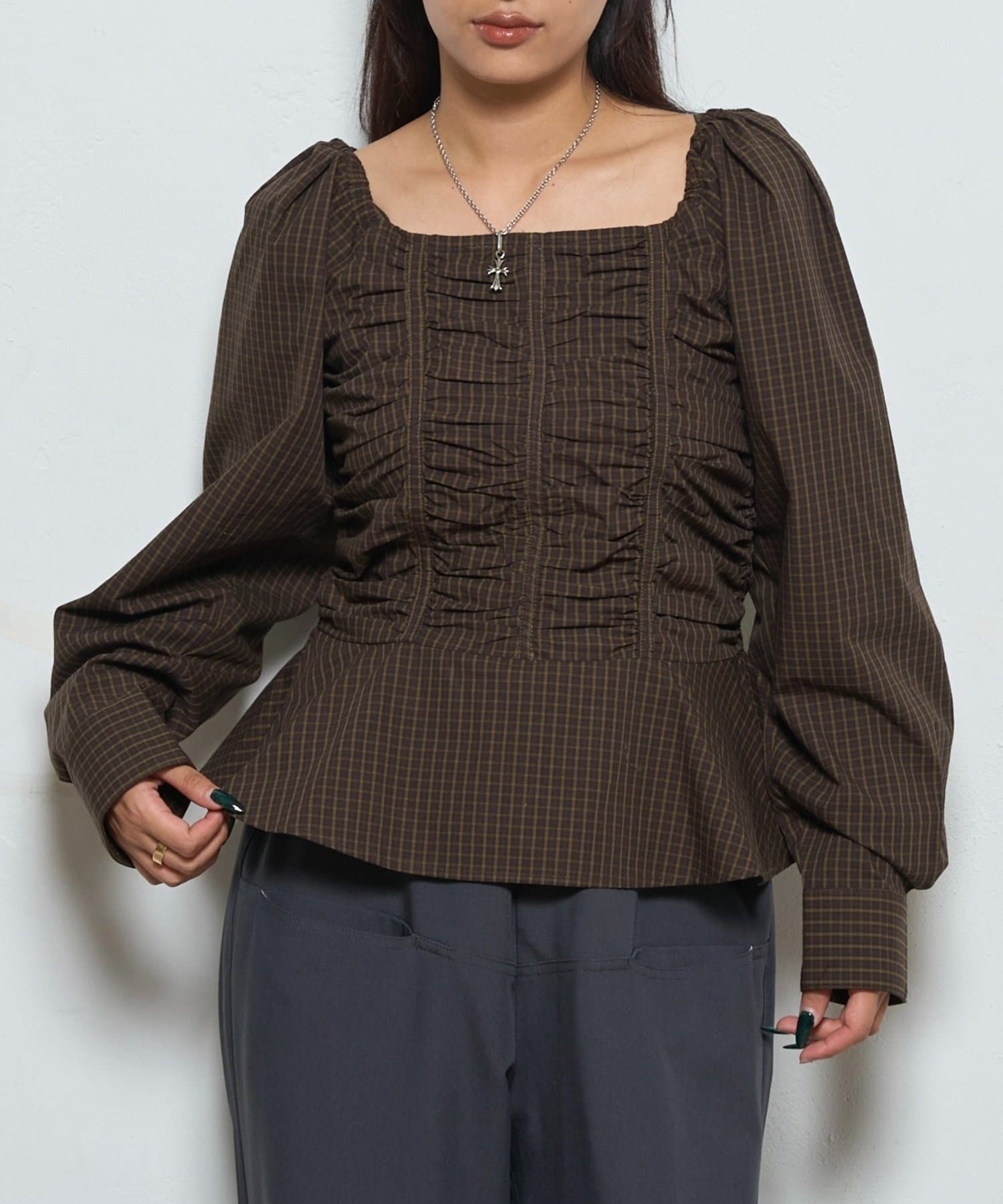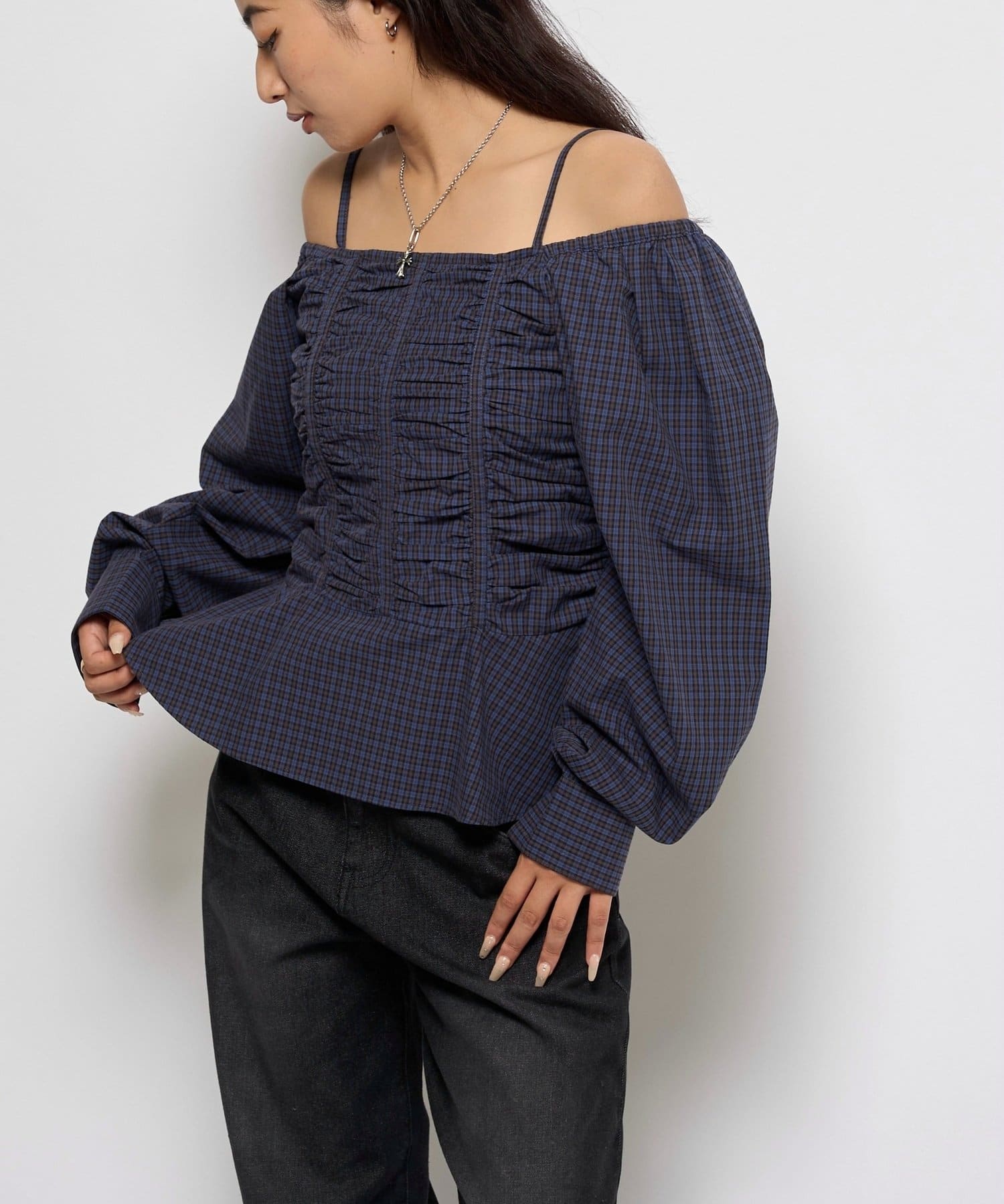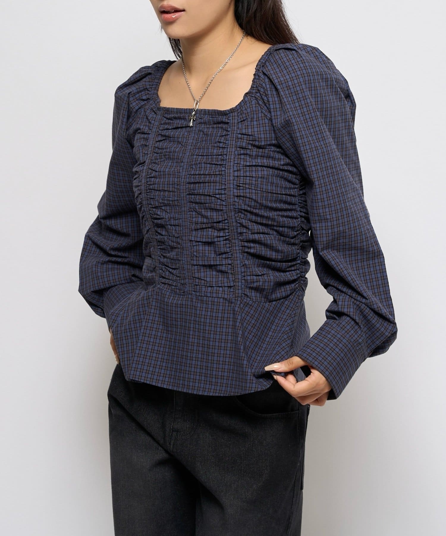 ・ 胸元のシャーリングデザインと、ドロップショルダーが特徴的なブラウス。