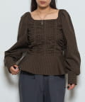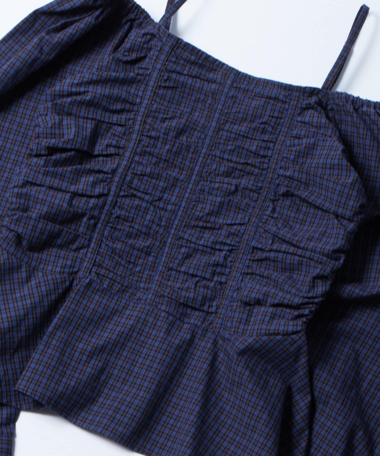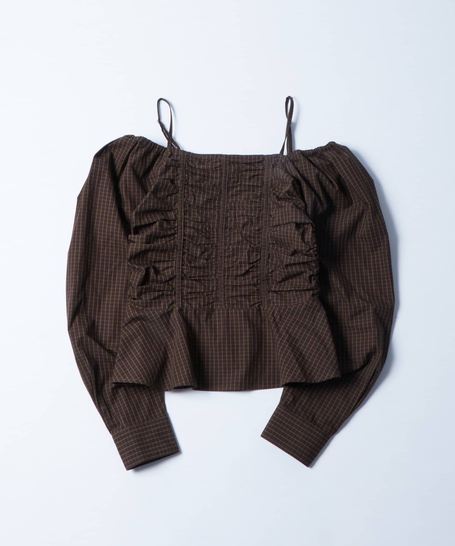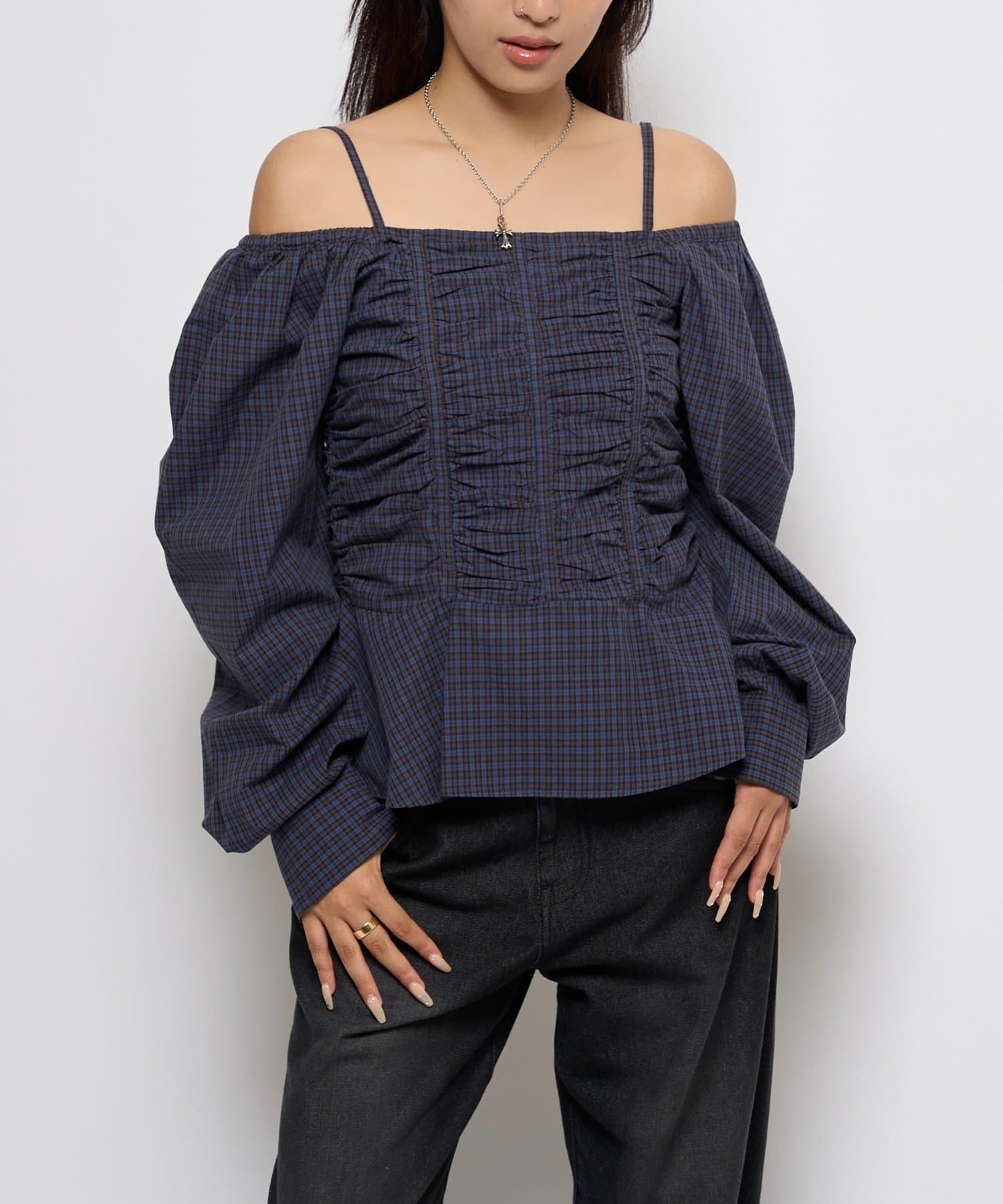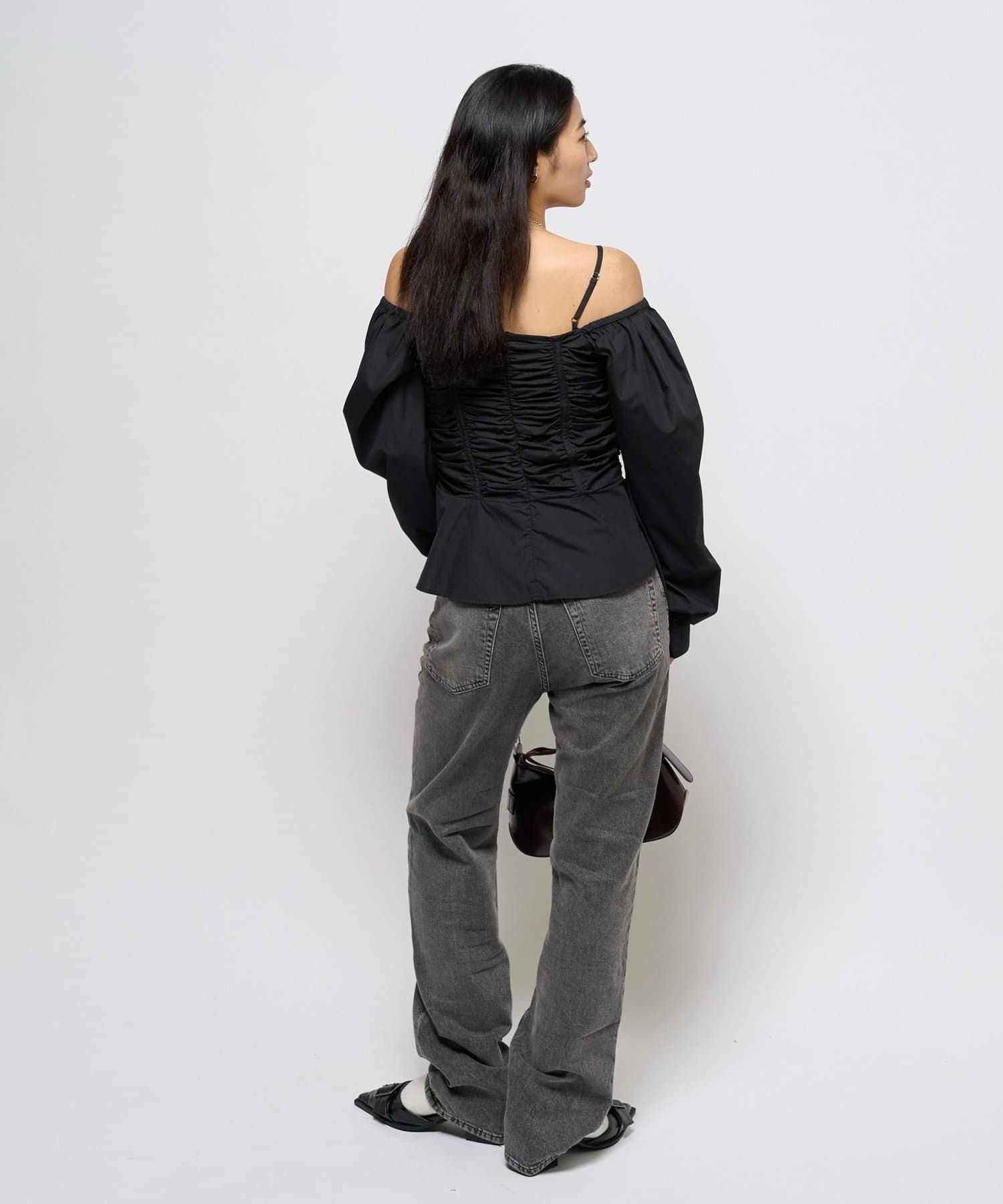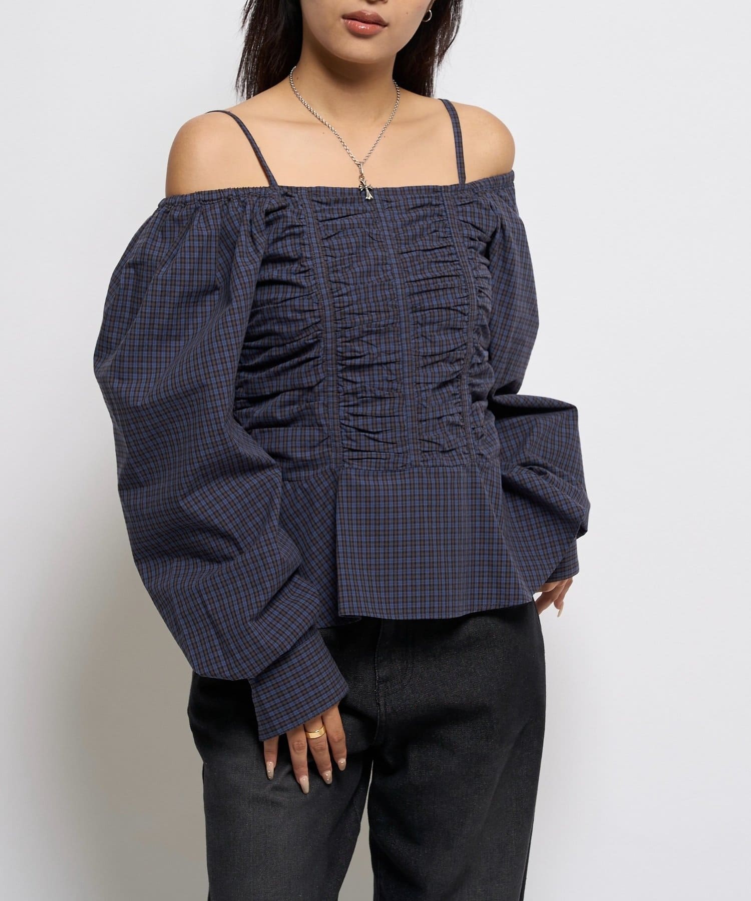 ・ 胸元のシャーリングデザインと、ドロップショルダーが特徴的なブラウス。