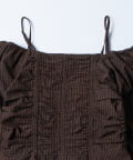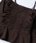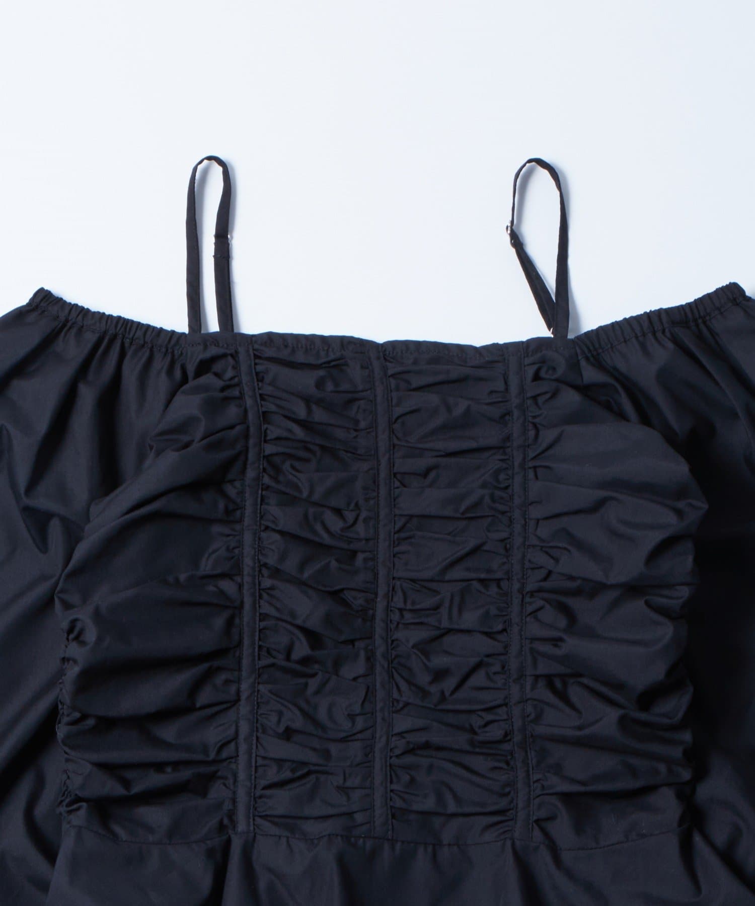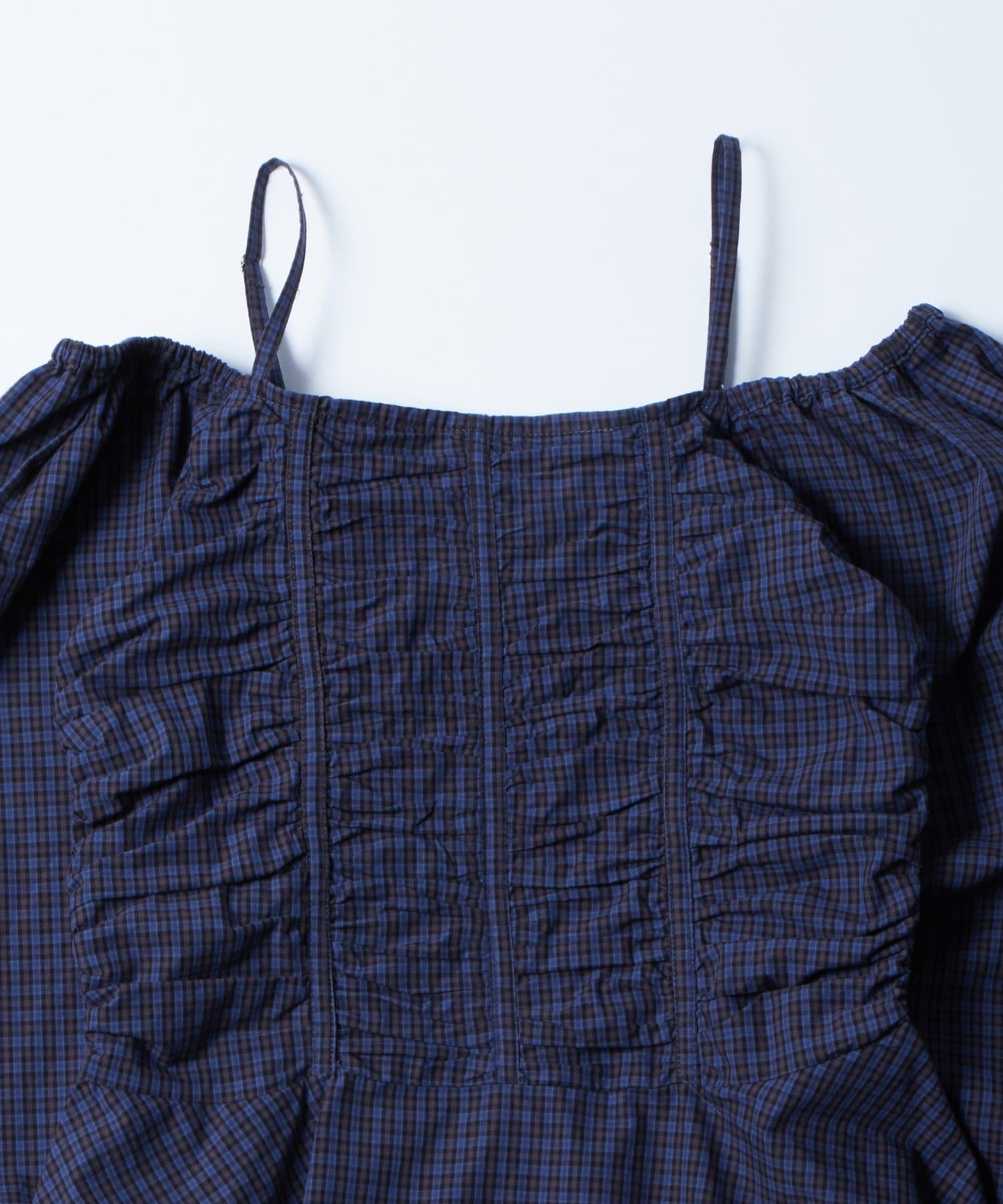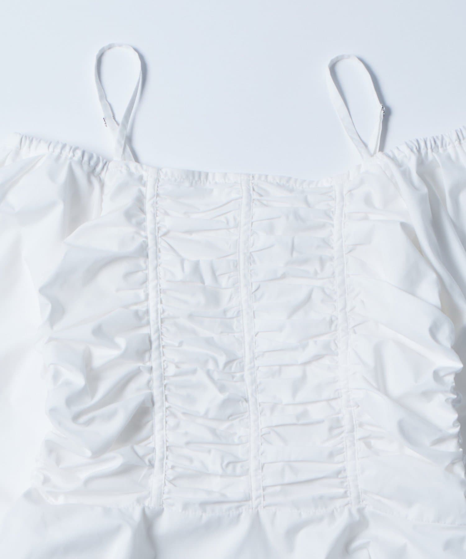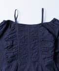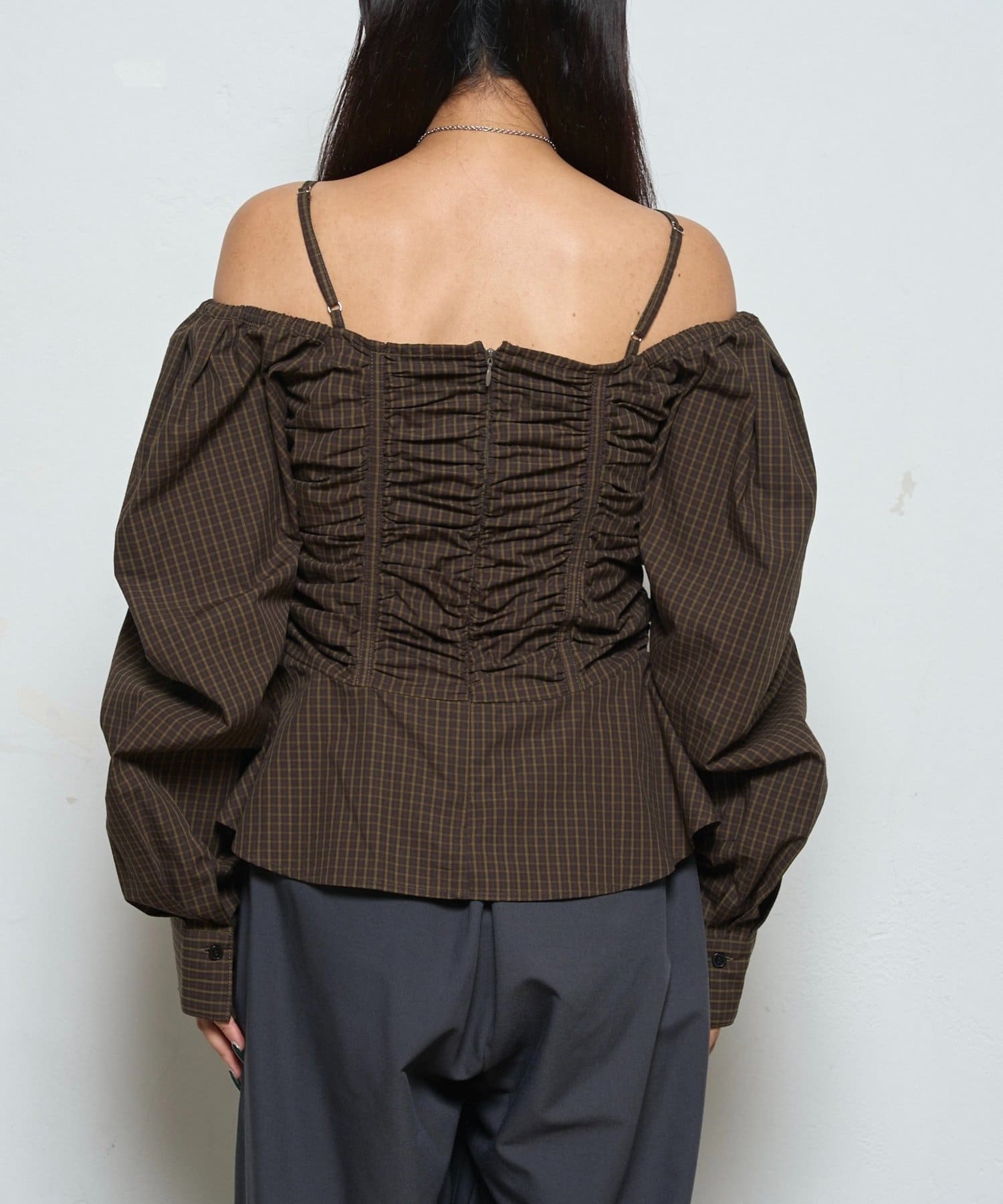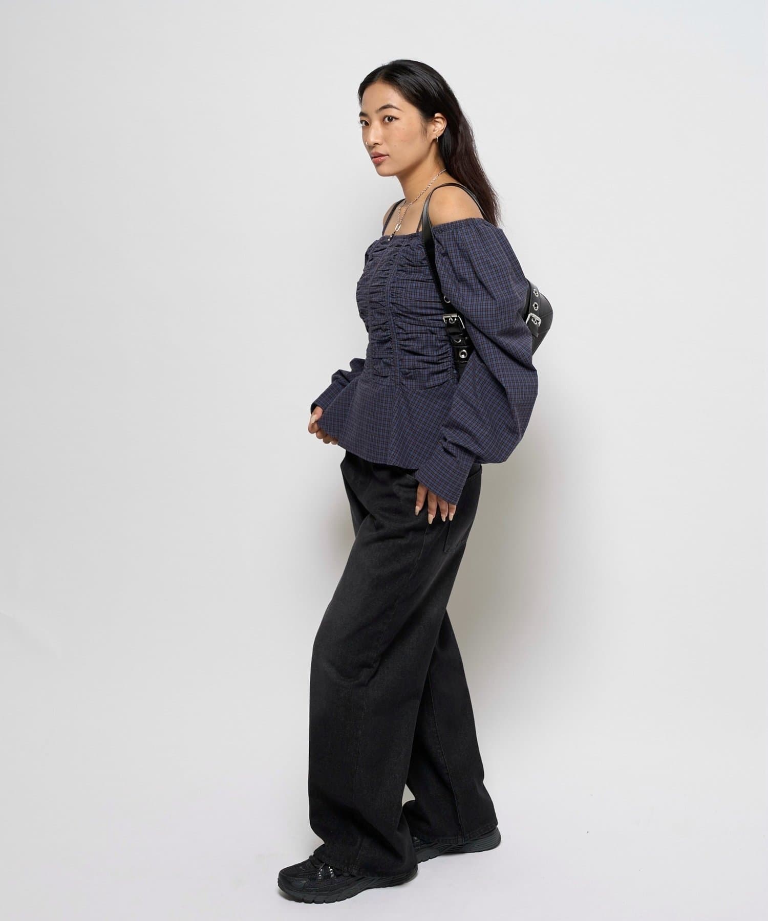 ・ 胸元のシャーリングデザインと、ドロップショルダーが特徴的なブラウス。