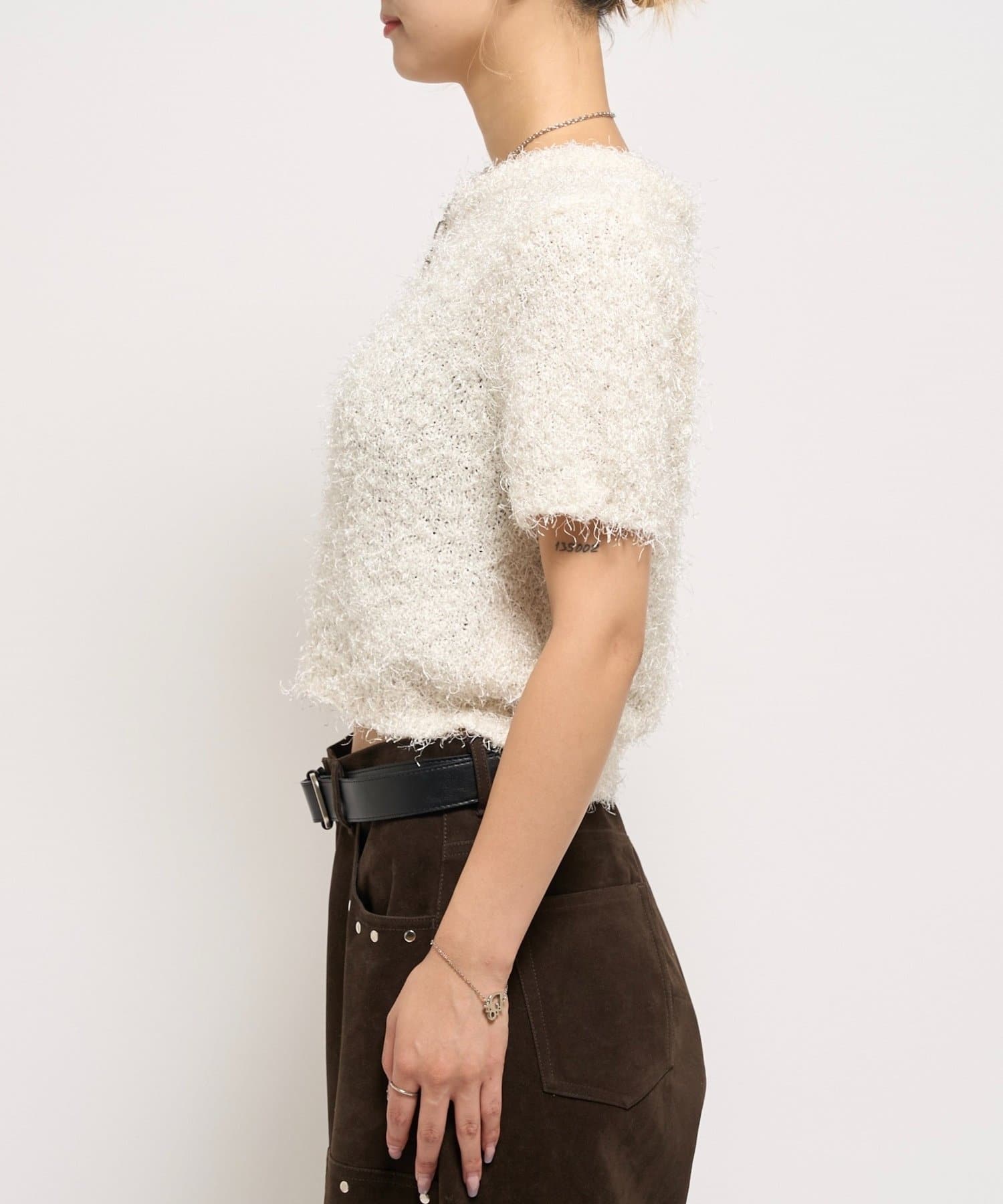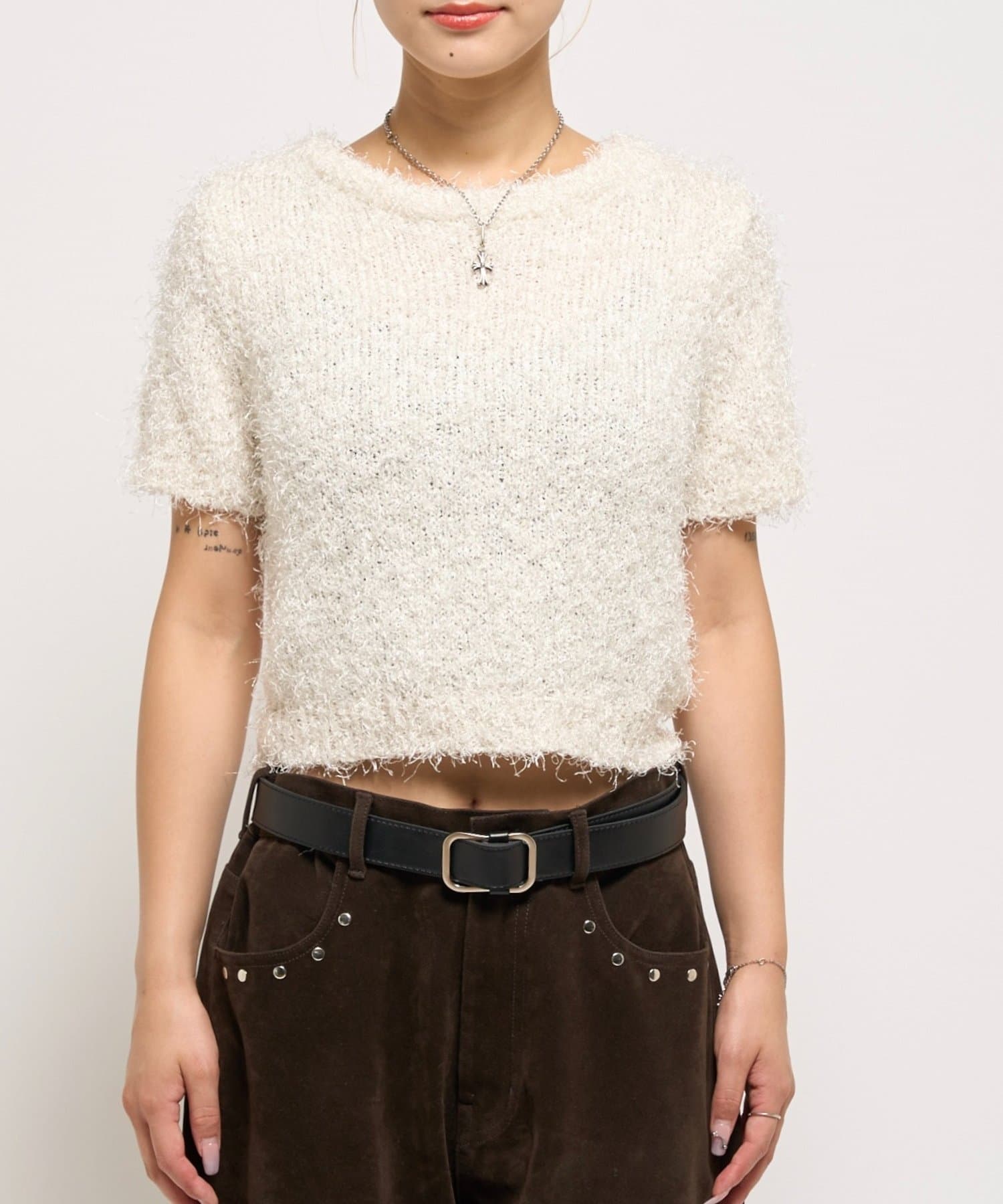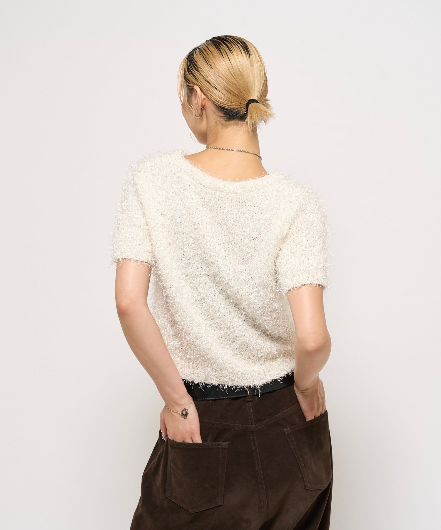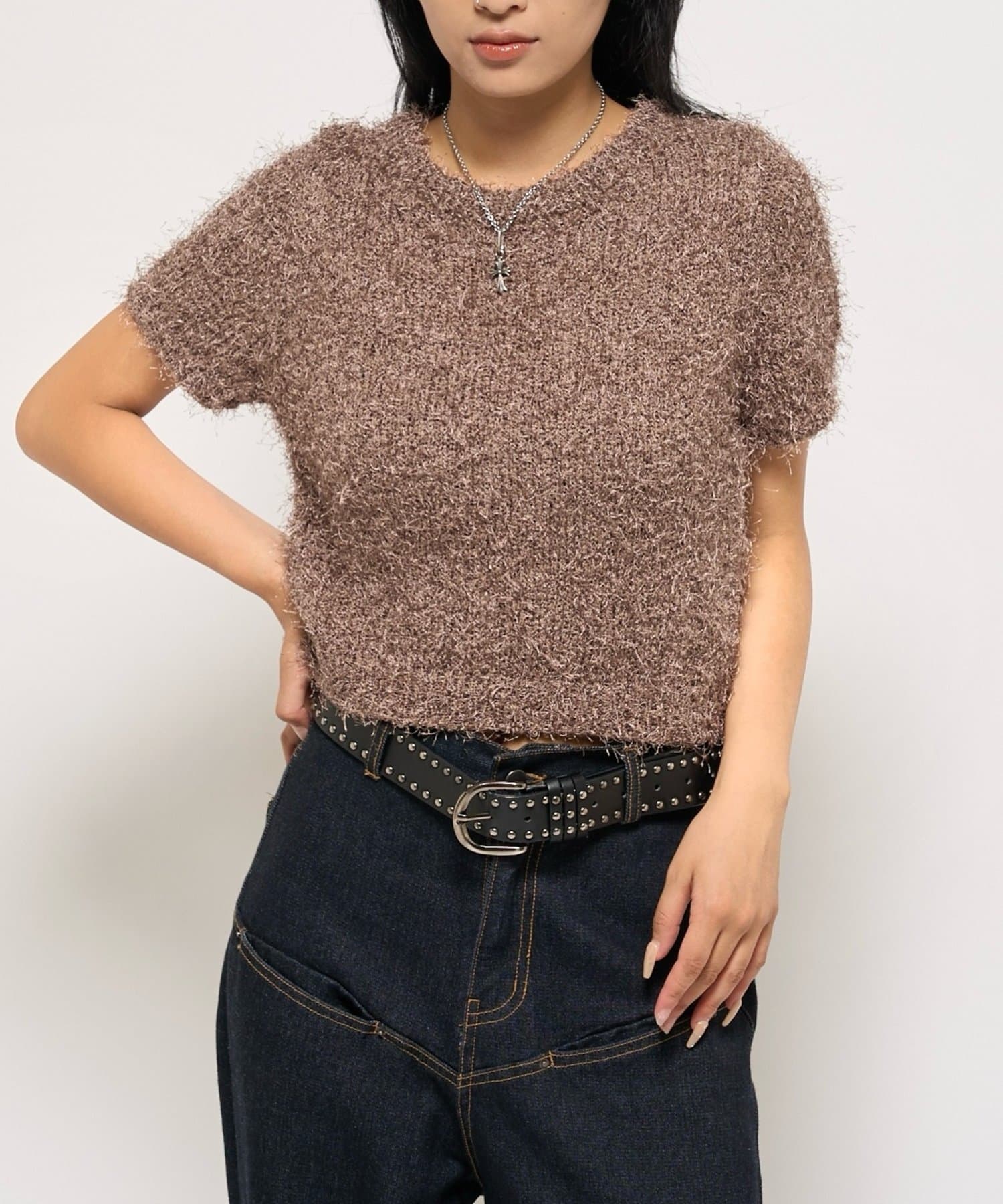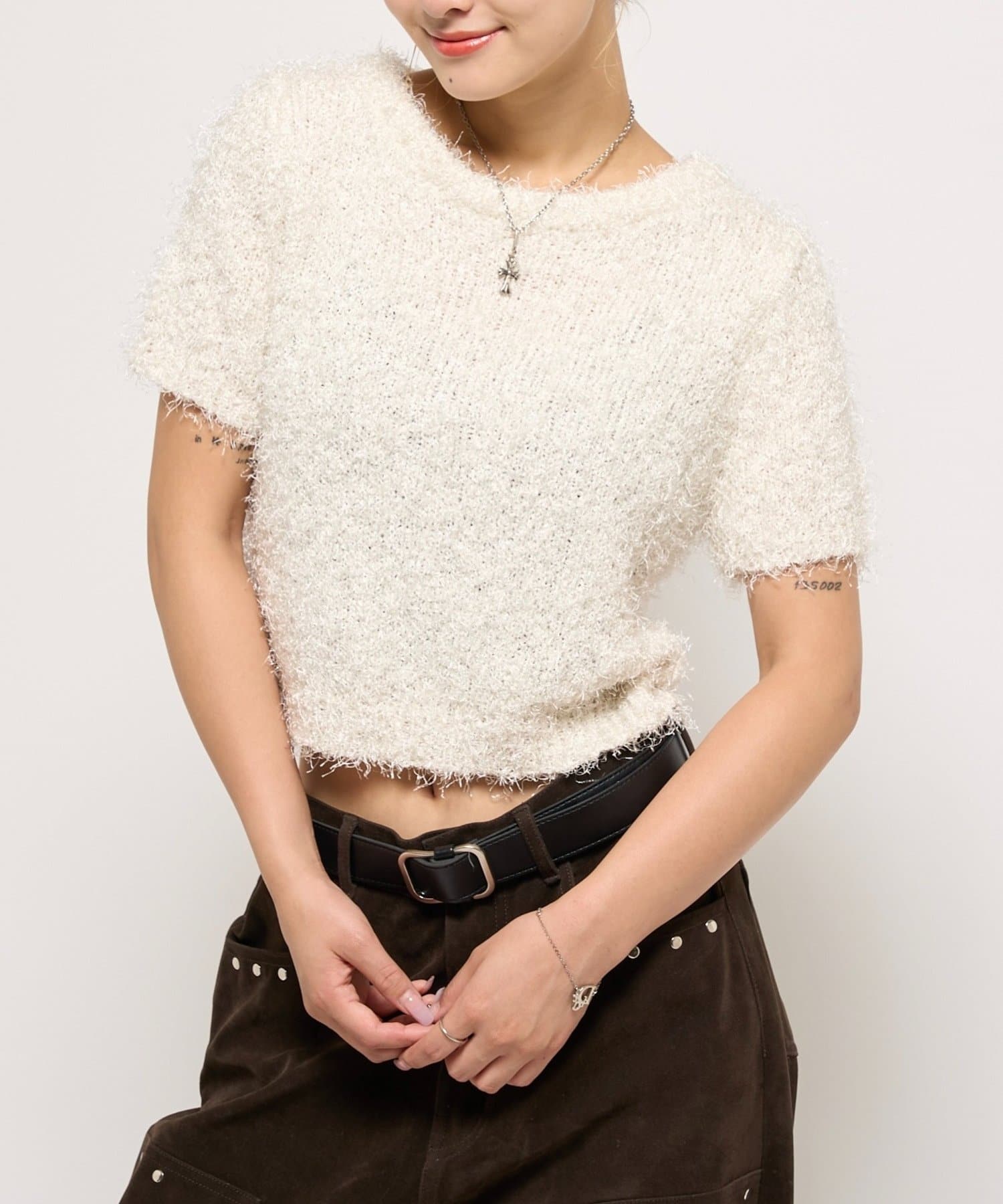 ふわふわのシャギー素材が可愛らしいニットトップス。