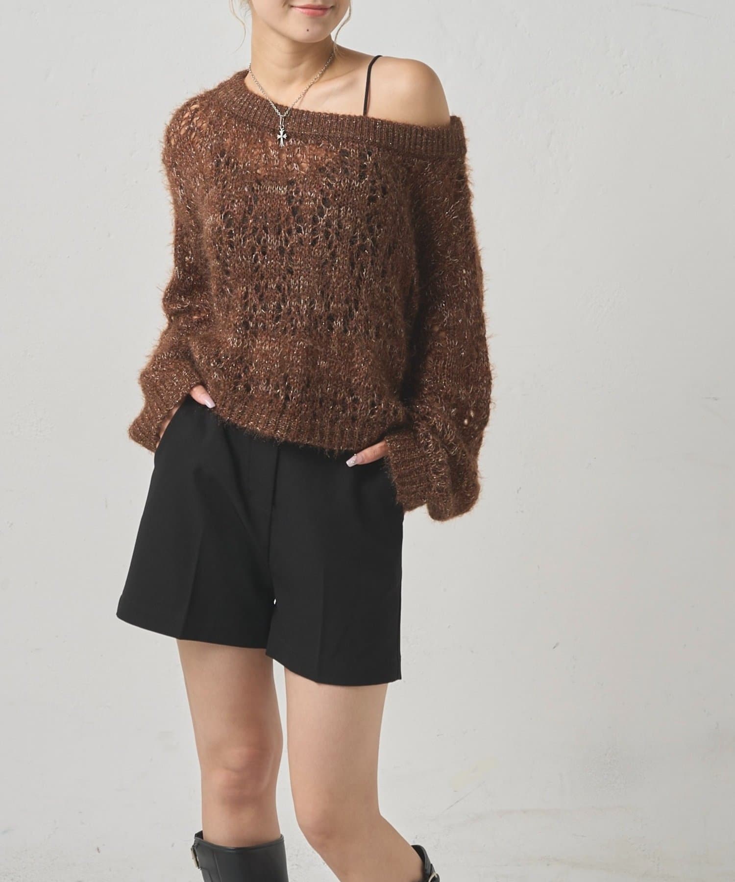 ・繊細なラメが上品な輝きを放つ、WEB限定のオフショルニット。
