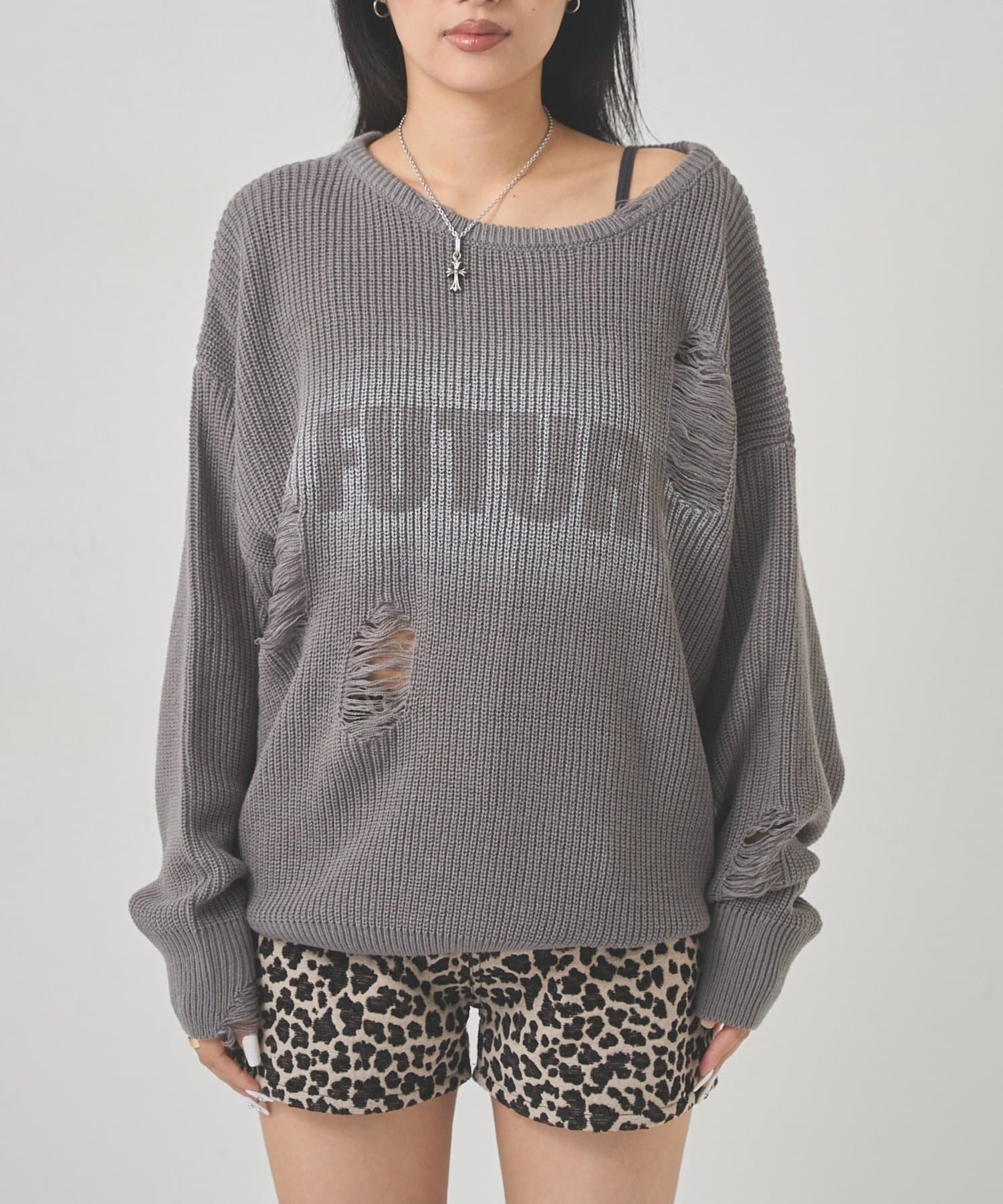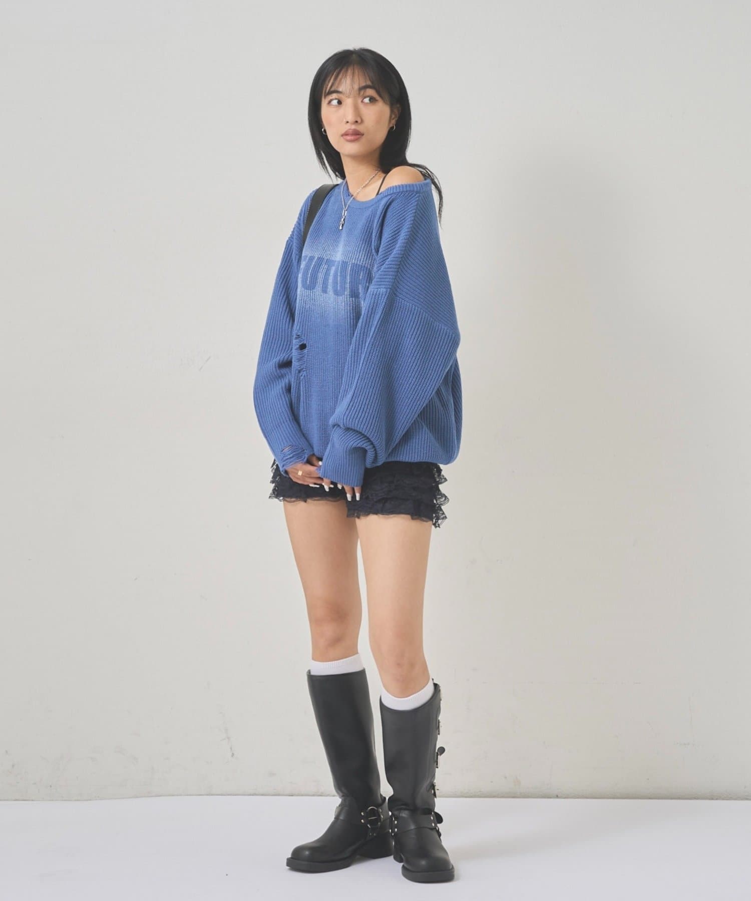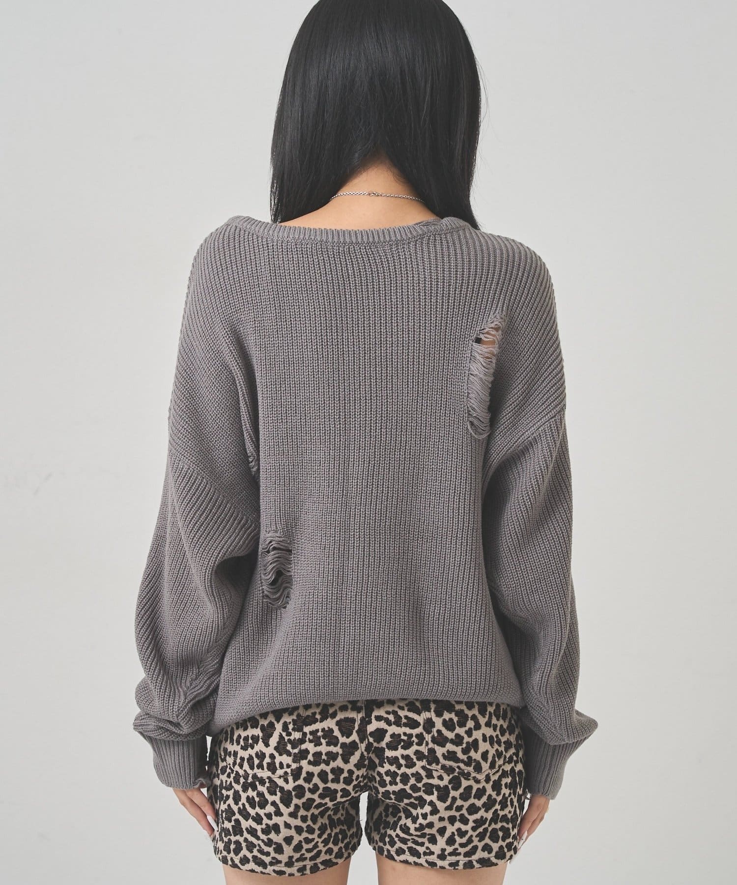こなれ感たっぷりのダメージ加工が目を引くニットトップス