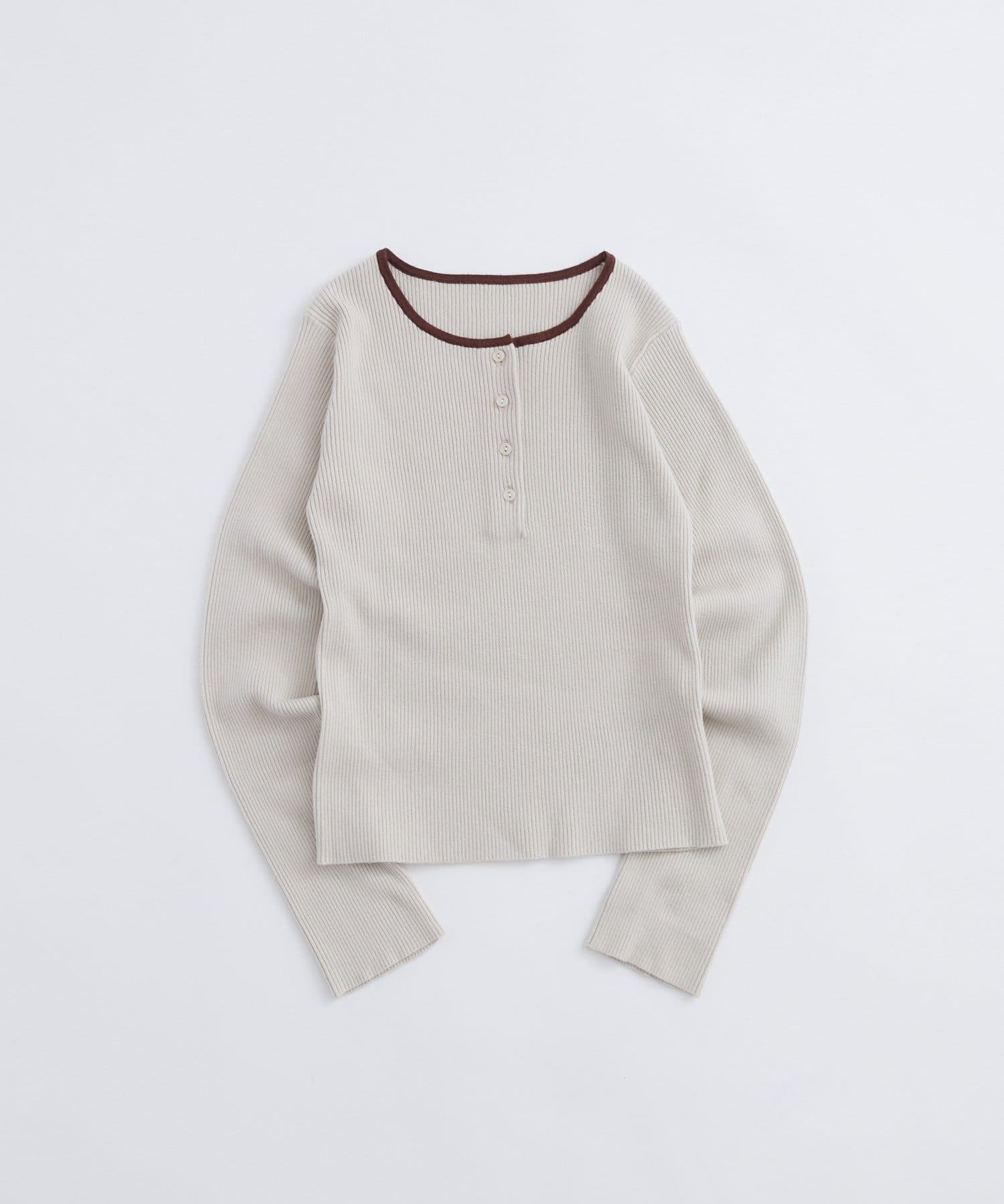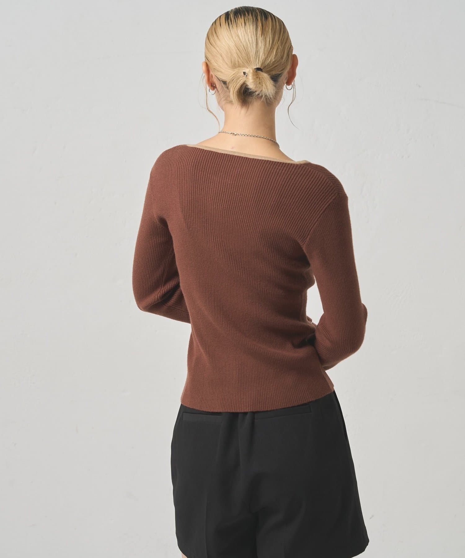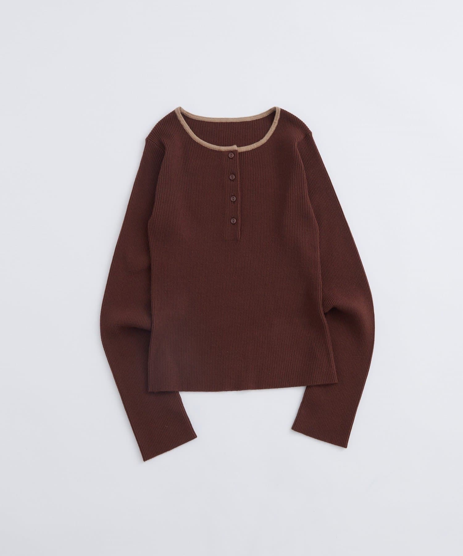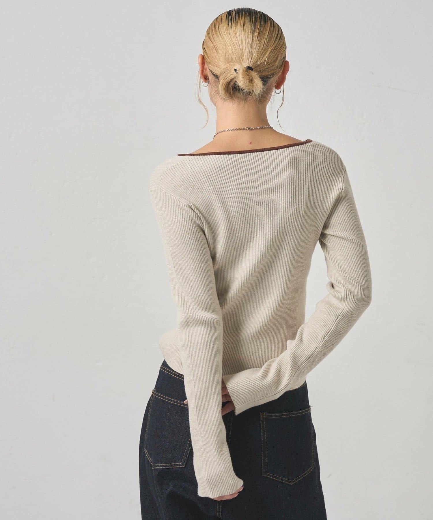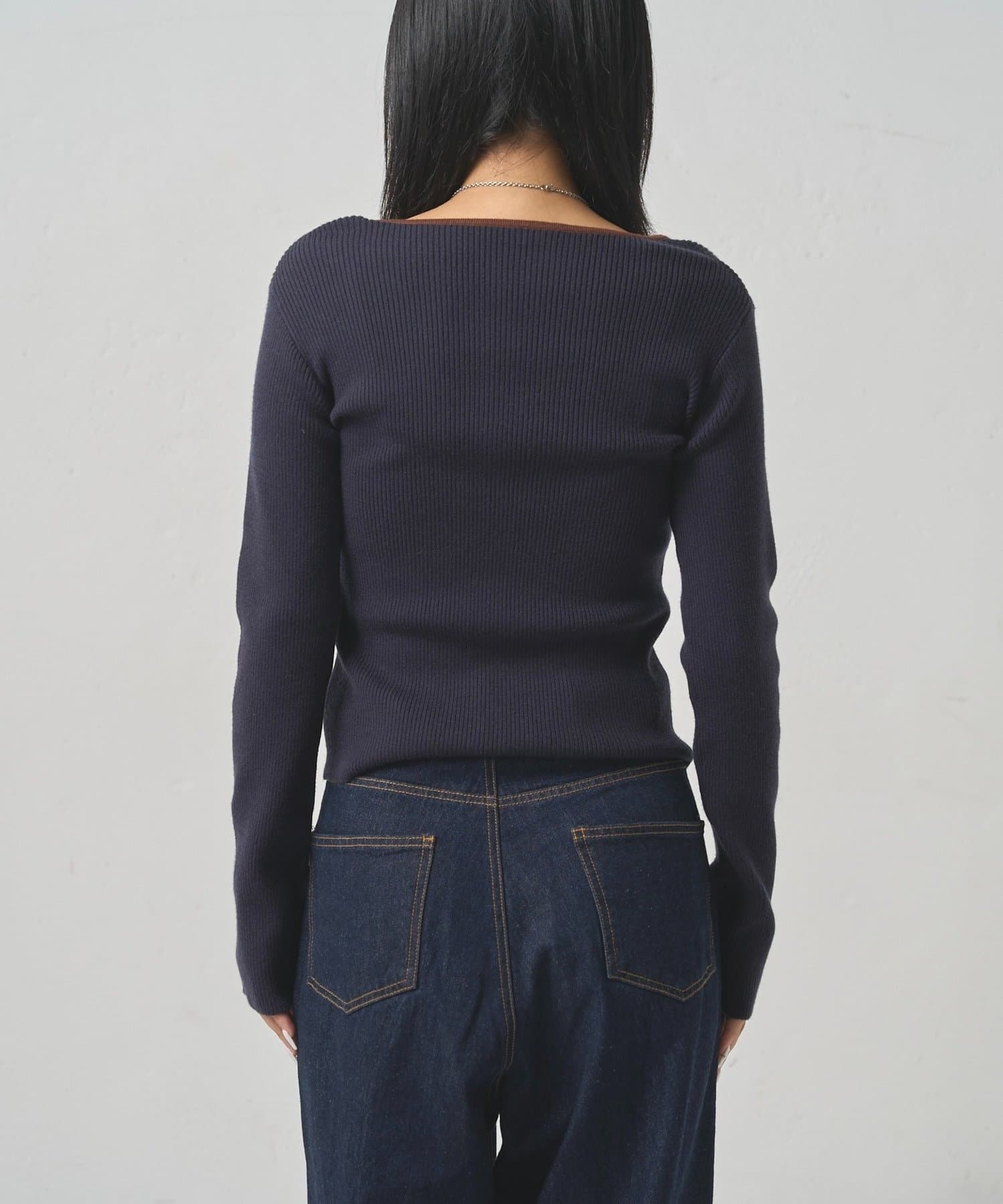 ・ネックラインと、前立ての配色がアクセントになるニット。