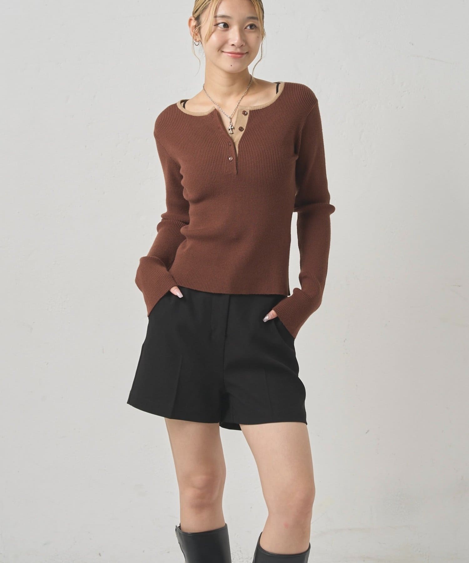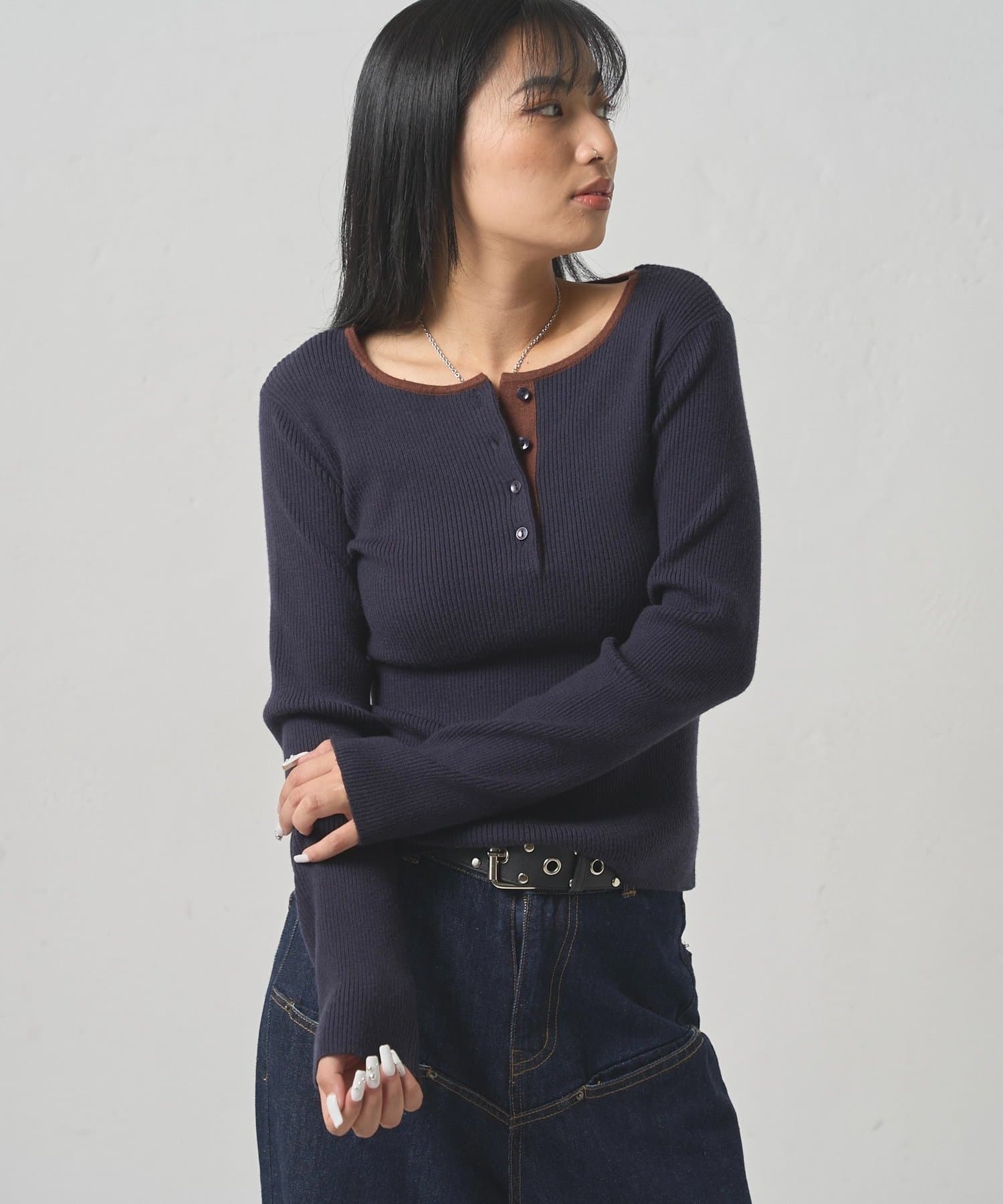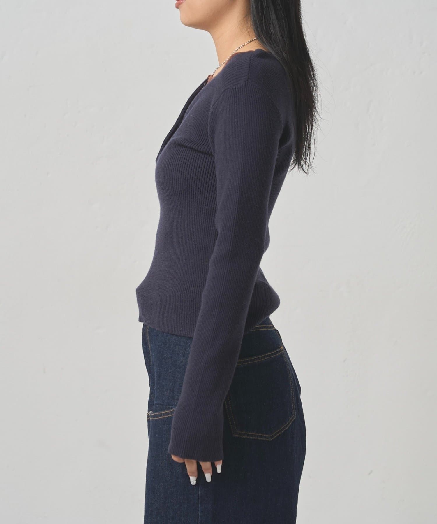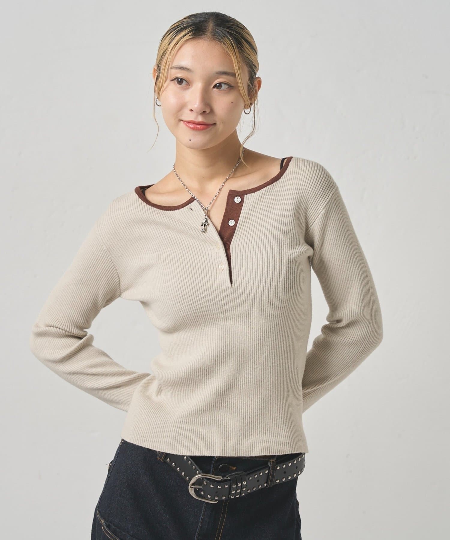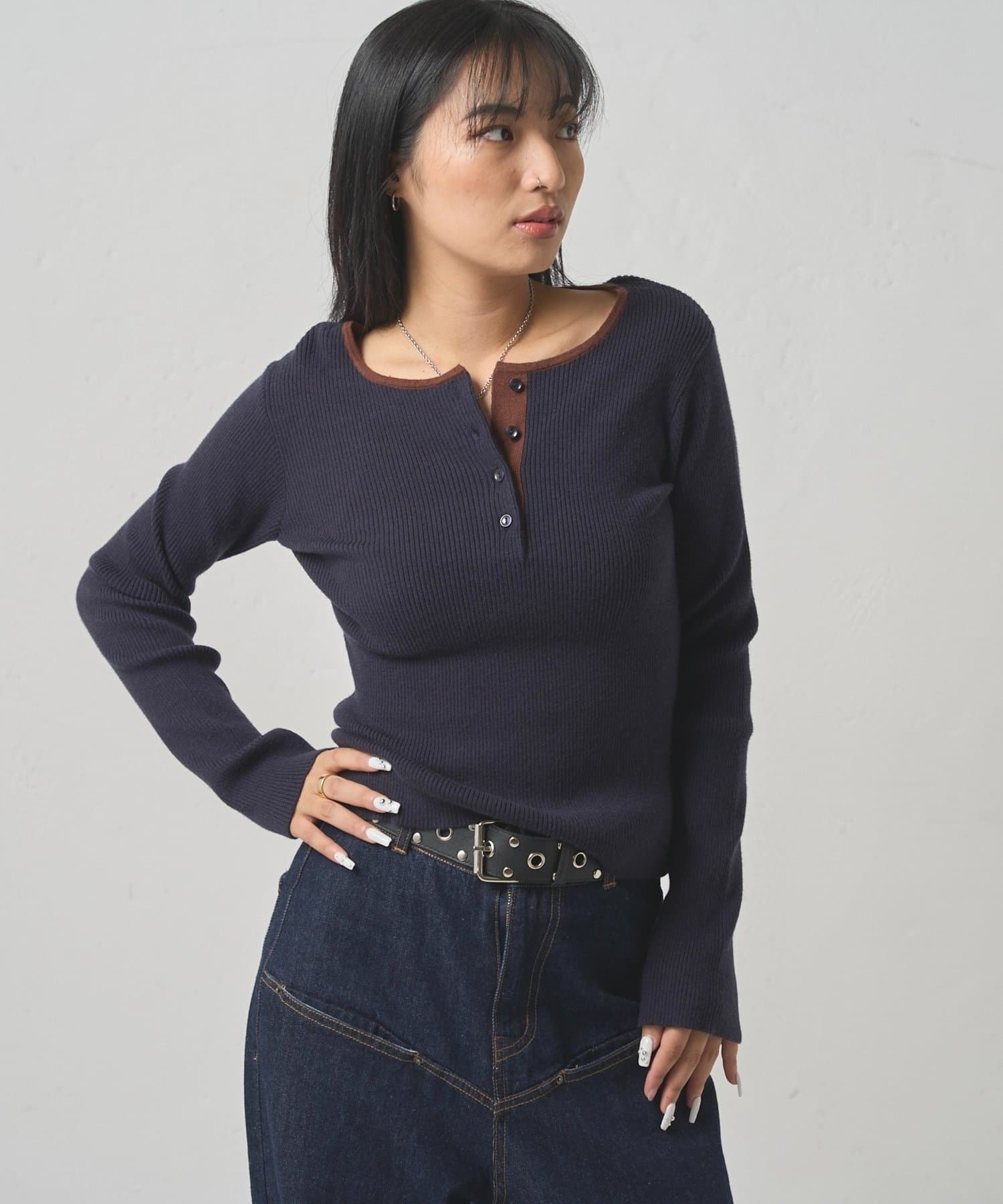 ・ネックラインと、前立ての配色がアクセントになるニット。