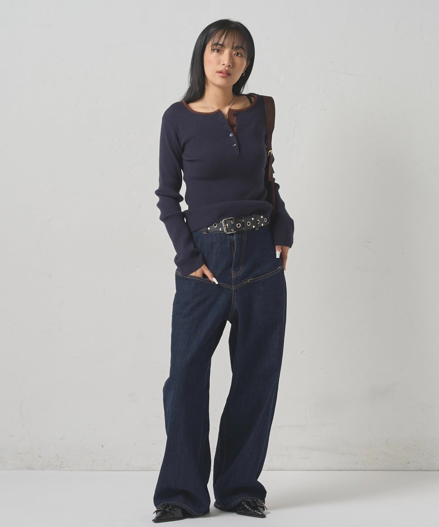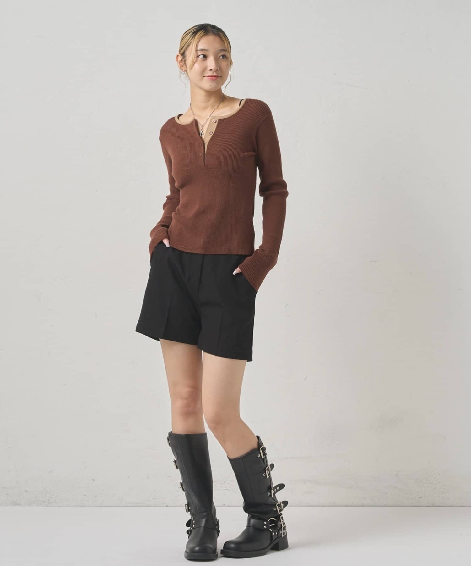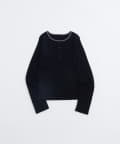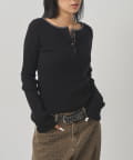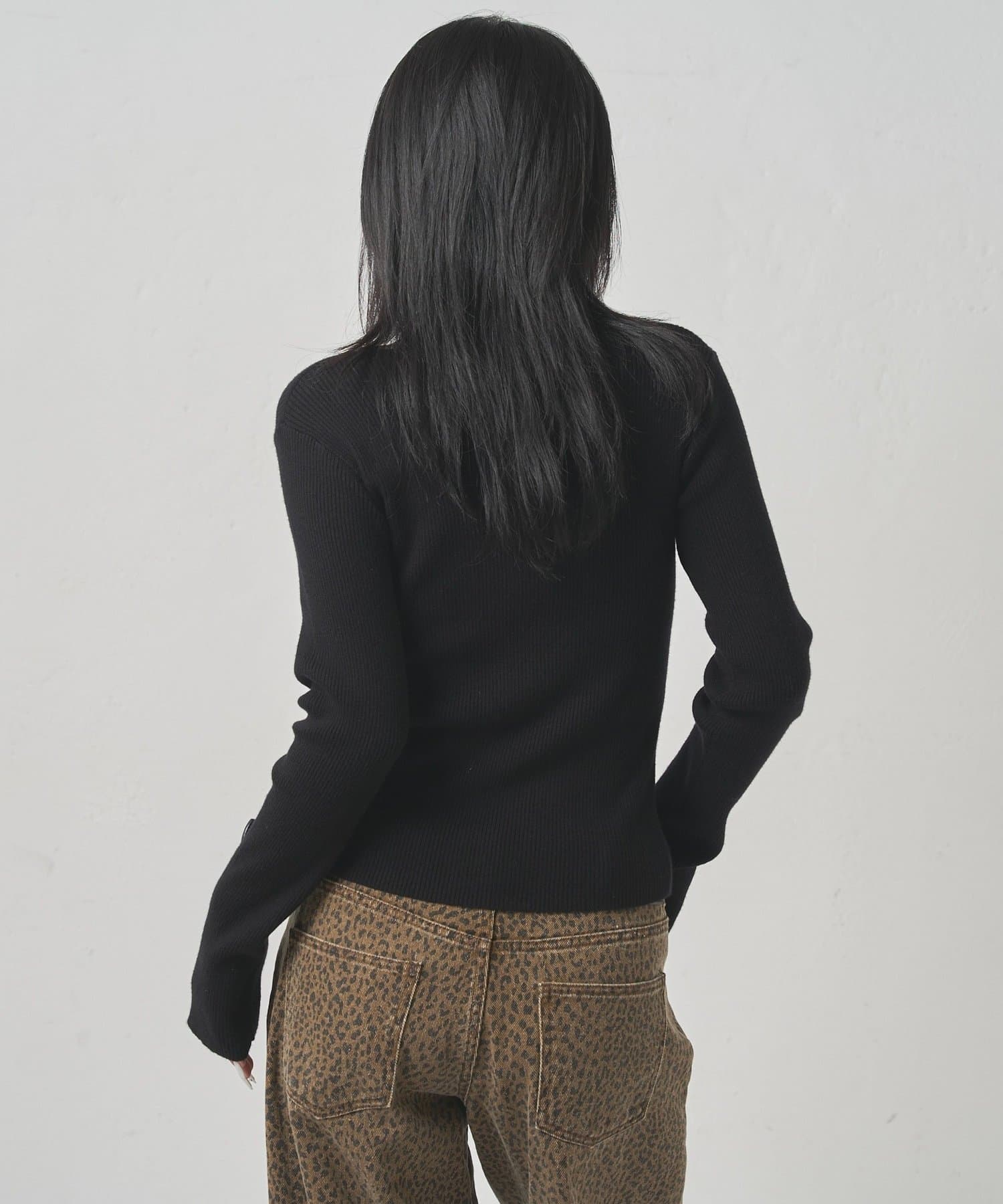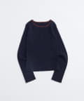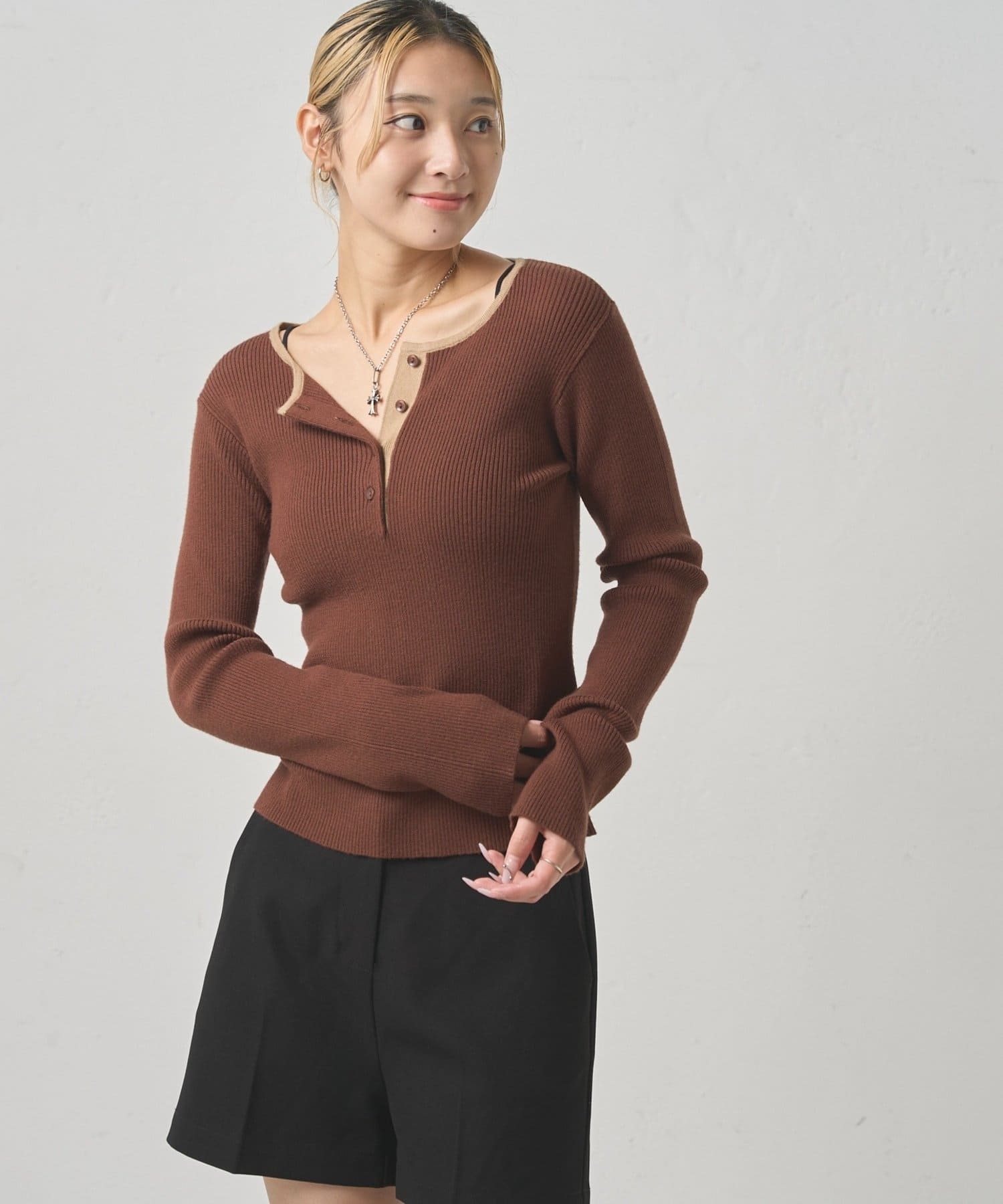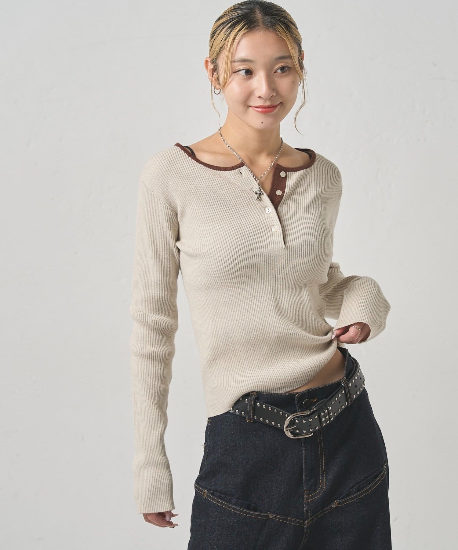 ・ネックラインと、前立ての配色がアクセントになるニット。
