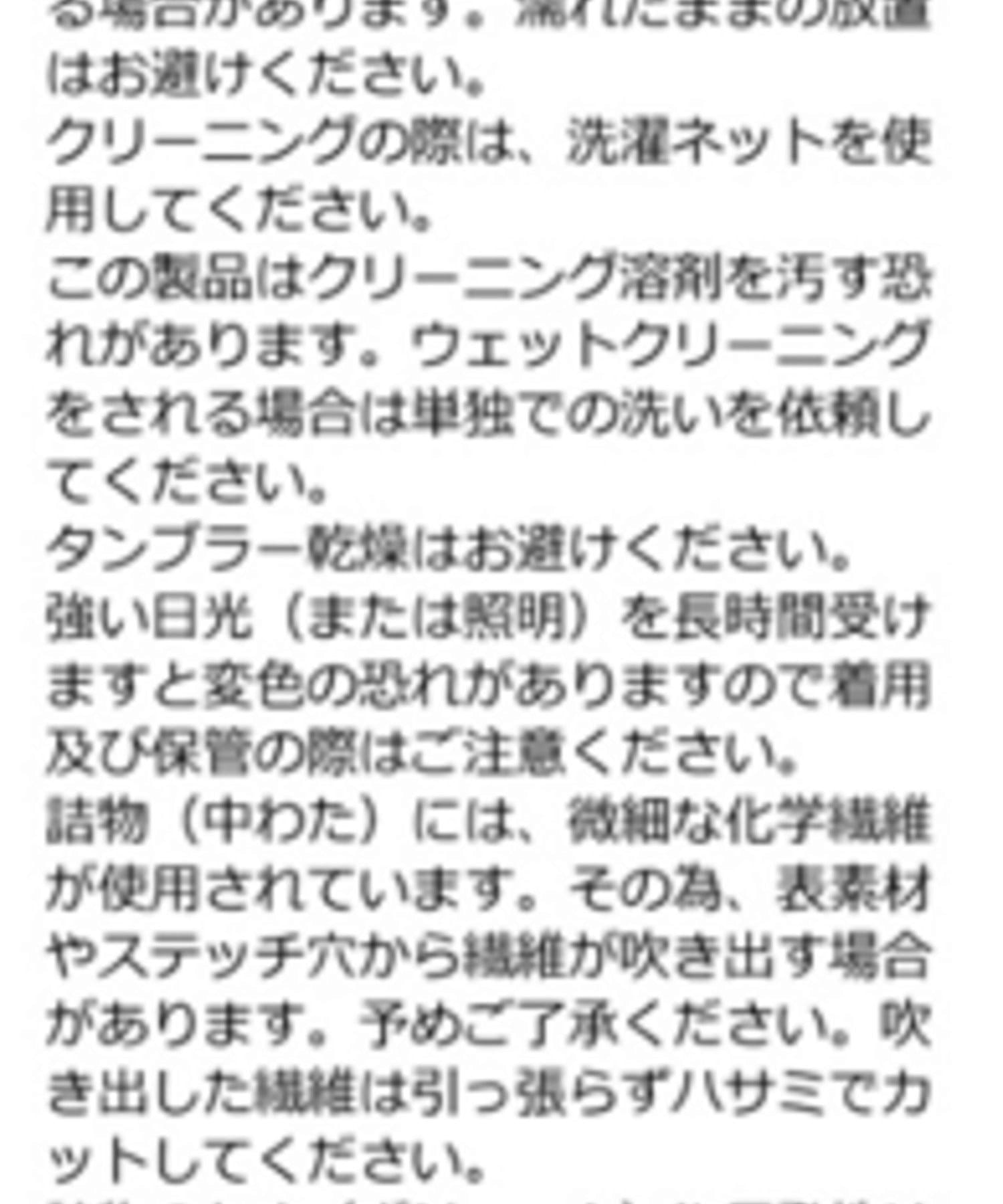 ・クリーニングの際は、洗濯ネットを使用してください。この製品はクリーニング溶剤を汚す恐れがあります。ウェットクリーニングをされる場合は単独での洗いを依頼してください。